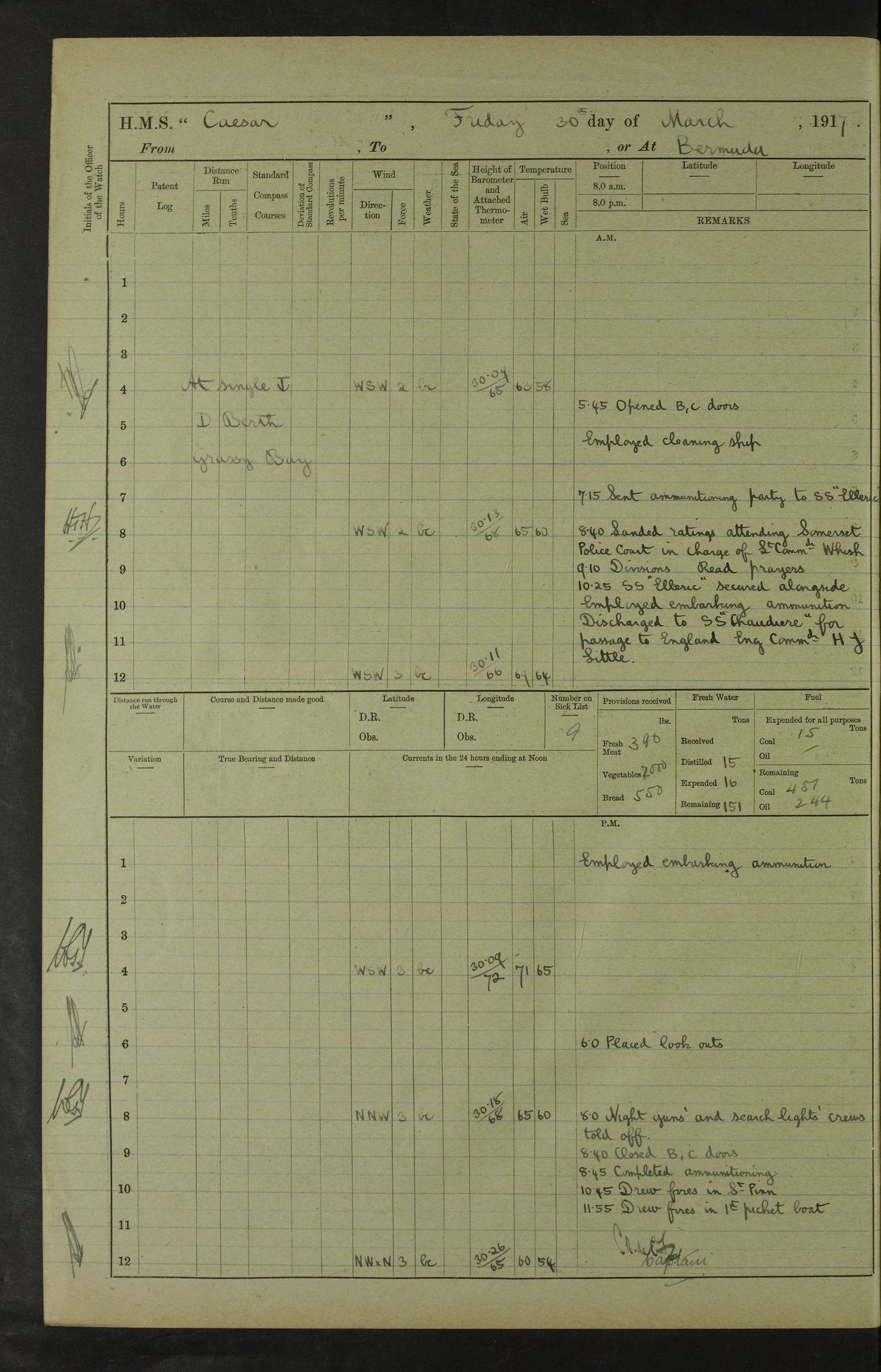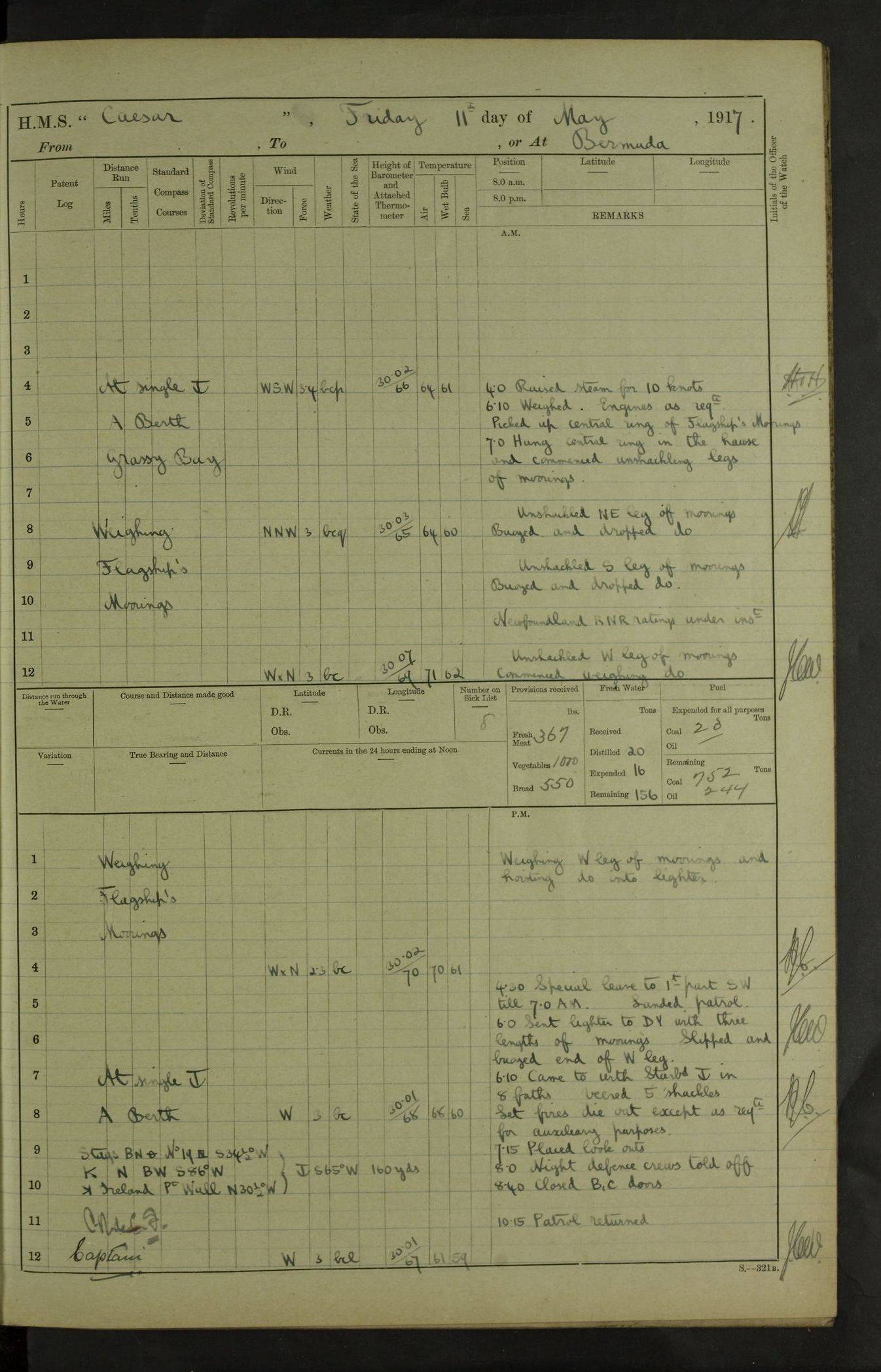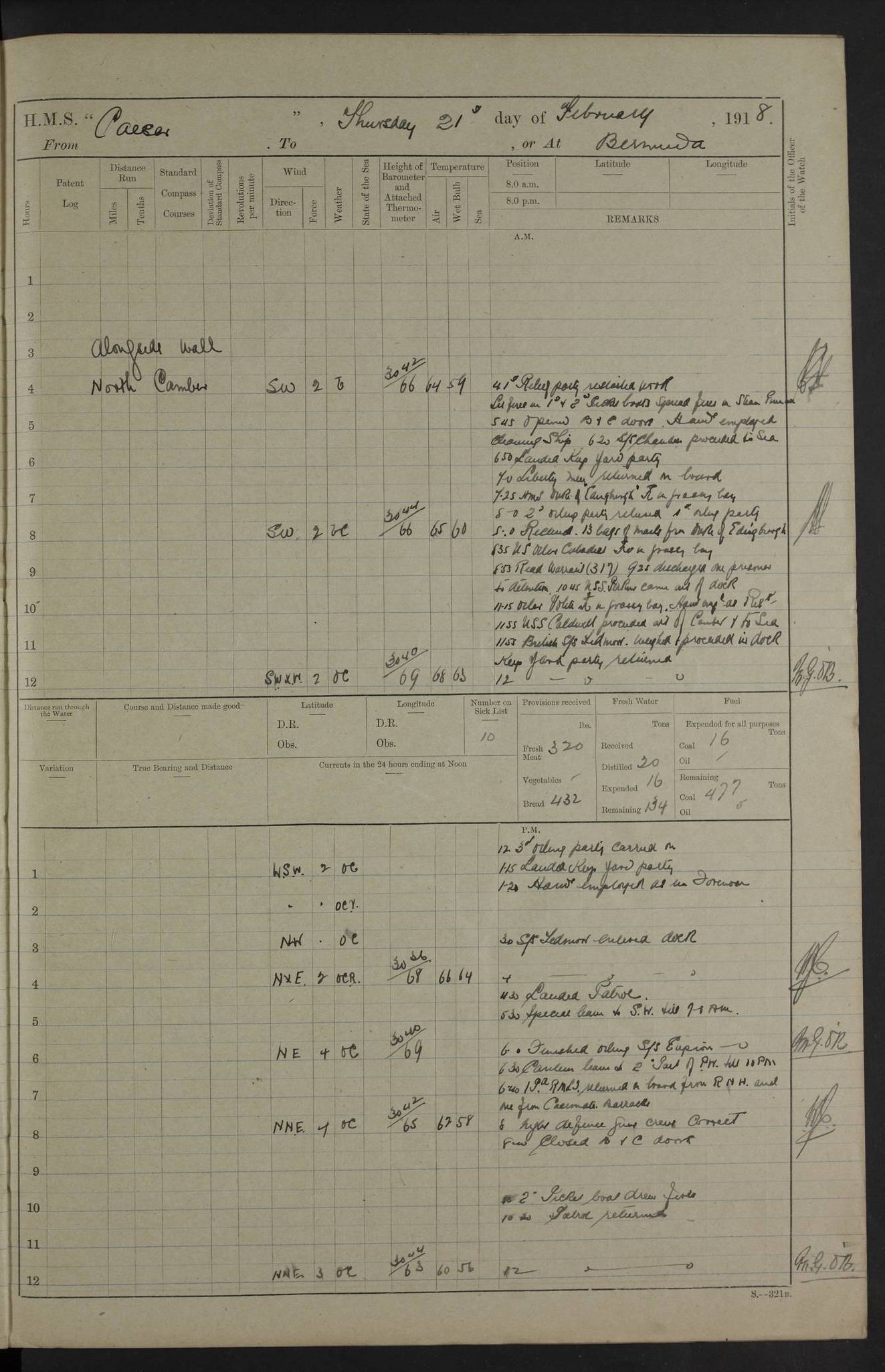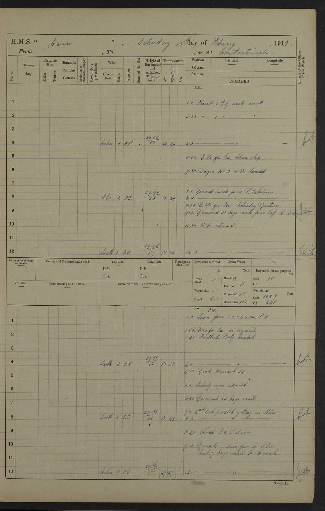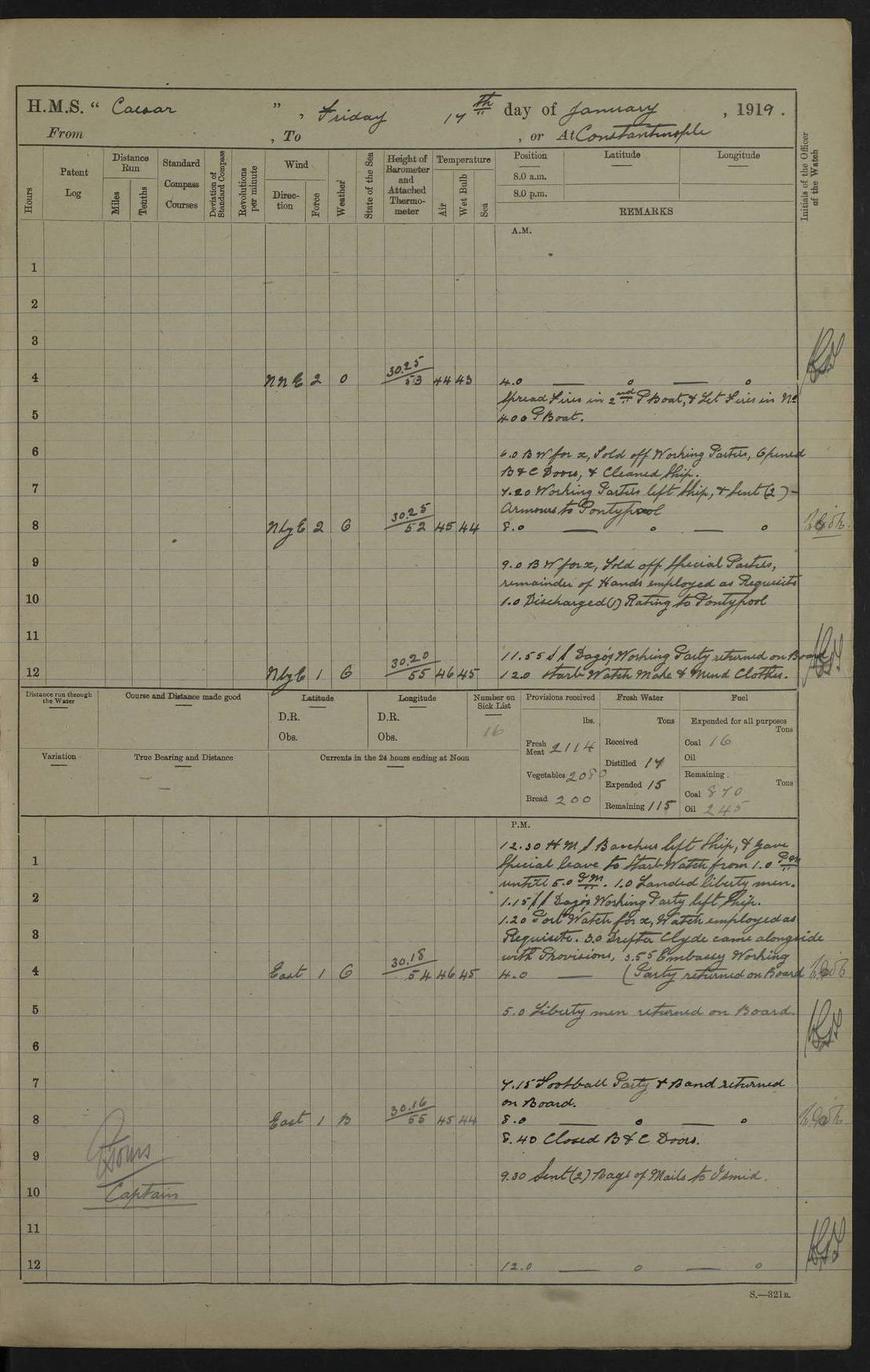 4caf84b6cadfd34197009939: (http://oldweather.s3.amazonaws.com/ADM53-36574/ADM 53-36574-145_1.jpg) 1 January 1917 At Bermuda Lat 32.32, Long -64.83 [Alongside Outer Camber Wall] 4.0am: Raised steam in first Picket boat. 6.0am: Employed cleaning ship. 7.0am: Landed Dockyard parties. Opened B, C doors. am: Employed drawing ammunition and stores, refitting and as requisite. 0.45pm: Paid monthly advance. pm: Employed as in forenoon. 4.30pm: Special leave to Starboard Watch till 7.0am. Landed patrol. 5.0pm: Dockyard parties returned. 6.30pm: Canteen leave to second part Port Watch till 10.0pm. 8.0pm: Night guns’ and search lights’ crews told off. 8.40pm: Closed B, C doors. 10.15pm: Patrol returned. 11.35pm: Drew fires in picket boats. [Number on sick list: 8] [Provisions received: Fresh Meat 340 lbs, Vegetables 2000 lbs, Bread 464 lbs] [Weather fine, though squally in early am. Noon temperature 63F] 4caf84b6cadfd3419700993a: (http://oldweather.s3.amazonaws.com/ADM53-36574/ADM 53-36574-146_0.jpg) 2 January 1917 [Year incorrectly shown as 1916] At Bermuda Lat 32.32, Long -64.83 [Alongside Outer Camber Wall] 4.30am: Raised steam in first picket boat. 6.30am: Landed working party to assist in repair of fenders in Inner Camber. 7.0am: Opened B, C doors. am: Employed embarking ammunition, refitting and as requisite. 11.45am: Working party returned. pm: Employed as in forenoon. 4.0pm: Quarters. 4.30pm: Special leave to Port Watch till 7.0am. Landed patrol. 6.30pm: Canteen leave to second part Starboard Watch till 10.0pm. 10.0pm: Patrol returned. 11.45pm: Drew fires in first picket boat. [Number on sick list: 8] [Provisions received: Fresh Meat 690 lbs, Bread 524 lbs] 4caf84b6cadfd3419700993b: (http://oldweather.s3.amazonaws.com/ADM53-36574/ADM 53-36574-146_1.jpg) 3 January 1917 [Year incorrectly shown as 1916] At Bermuda Lat 32.32, Long -64.83 [Alongside Outer Camber Wall] 7.0am: Opened B, C doors. Landed Dockyard parties. Sailed HMS “Antrim”. Landed Sanitary working party. am: Employed dismounting guns, drawing and returning stores, refitting and as requisite. Training class under instruction. 4.0pm: Quarters. Read Warrants No 268, 269. 4.30pm: Special leave to Starboard Watch till 7.0am. Landed patrol. 5.0pm: Dockyard and Working parties returned. 6.30pm: Canteen leave to first part Port Watch till 10.0pm. 8.5pm: Night guns’ and search lights’ crews told off. 10.0pm: Patrol returned. [Number on sick list: 8] [Provisions received: Fresh Meat 351 lbs, Vegetables 1000 lbs, Bread 512 lbs] 4caf84b6cadfd3419700993c: (http://oldweather.s3.amazonaws.com/ADM53-36574/ADM 53-36574-147_0.jpg) 4 January 1917 At Bermuda Lat 32.32, Long -64.83 [Alongside Outer Camber Wall] 7.0am: Landed Dockyard and Sanitary Working parties. am: Employed dismounting guns, sending up foretopmast, refitting and as requisite. Gunnery training class under instruction. 9.0am: Landed Working party to assist in repairs of fenders in Inner Camber. Discharged to SS “Kiakora” [probably Kaikoura] two ratings to form gun’s crew. 3.30pm: Working parties returned. 4.30pm: Special leave to Port Watch till 7.0am. Landed patrol. 6.30pm: Canteen leave to first part Starboard Watch till 10.0pm; 10.15pm: Patrol returned. [Number on sick list: 9] [Provisions received: Fresh Meat 353 lbs, Vegetables 1000 lbs, Bread 498 lbs] 4caf84b6cadfd3419700993d: (http://oldweather.s3.amazonaws.com/ADM53-36574/ADM 53-36574-147_1.jpg) 5 January 1917 At Bermuda Lat 32.32, Long -64.83 [Alongside Outer Camber Wall] 7.0am: Landed Dockyard and Sanitary Working parties. am: Employed refitting, dismounting guns and as requisite. Gunnery Training class under instruction. pm: Employed as in forenoon. 2.55pm: Arrived HMS “Antrim”. 4.30pm: Special leave to Starboard Watch till 7.0am. Landed patrol. 5.40pm: Drew fires in second picket boat. 6.30pm: Canteen leave to second part Port Watch till 10.0pm. 11.0pm: Patrol returned. 11.40pm: Drew fires in first picket boat. [Number on sick list: 9] [Provisions received: Fresh Meat 350 lbs, Vegetables 400 lbs, Bread 514 lbs] 4caf84b6cadfd3419700993e: (http://oldweather.s3.amazonaws.com/ADM53-36574/ADM 53-36574-148_0.jpg) 6 January 1917 At Bermuda Lat 32.32, Long -64.83 [Alongside Outer Camber Wall] 7.0am: Landed Dockyard parties. am: Employed cleaning ship, refitting, discharging ammunition from SS “Goodwood”, assisting in repairs to fenders of Inner Camber and as requisite. Training class under instruction. 11.45am: Dockyard parties returned. 0.30pm: Observed SS “Prophet” aground in Stag Channel. pm: Make and mend clothes. 1.30pm: Special leave to Port Watch till 7.0am and boys till 5.0pm. 3.0pm: SS “Prophet” refloated and proceeded to anchor. 4.0pm: Quarters. Read Warrant No 270. 4.30pm: Landed patrol. 5.0pm: Party employed discharging SS “Goodwood”. 6.30pm: Canteen leave to second part Starboard Watch till 10.0pm. 8.0pm: Night guns’ and search lights’ crews told off. 8.40pm: Closed B, C doors. 10.15pm: Patrol returned. [Number on sick list: 7] [Provisions received: Fresh Meat 361 lbs, Vegetables 2000 lbs, Bread 928 lbs] 4caf84b6cadfd3419700993f: (http://oldweather.s3.amazonaws.com/ADM53-36574/ADM 53-36574-148_1.jpg) 7 January 1917 At Bermuda Lat 32.32, Long -64.83 [Alongside Outer Camber Wall] 5.55am: Opened B, C doors. Employed cleaning ship. 8.30am: Landed Church parties, Presbyterians 18, Wesleyans 43, RCs 41. 9.30am: Divisions. 10.15am: Ship’s Company attended Divine Service at Dockyard Church. 11.20am: Church parties returned. 1.0pm: Special leave to Starboard Watch till 7.0am and boys will 5.0pm. 6.30pm: Canteen leave to first part Port Watch till 10.0pm. [Number on sick list: 8] [Weather fine, noon temperature 70F] 4caf84b6cadfd34197009940: (http://oldweather.s3.amazonaws.com/ADM53-36574/ADM 53-36574-149_0.jpg) 8 January 1917 At Bermuda Lat 32.32, Long -64.83 [Alongside Outer Camber Wall] 4.0am: Raised steam in first picket boat. 7.0am: Landed Dockyard parties. am: Employed dischargi