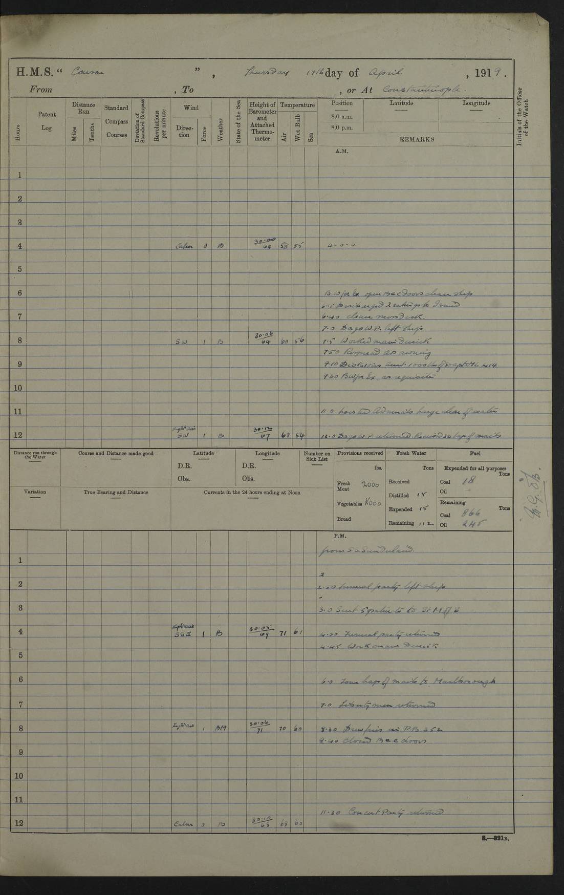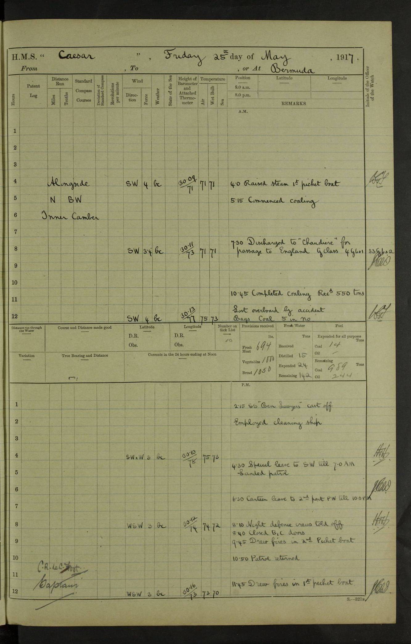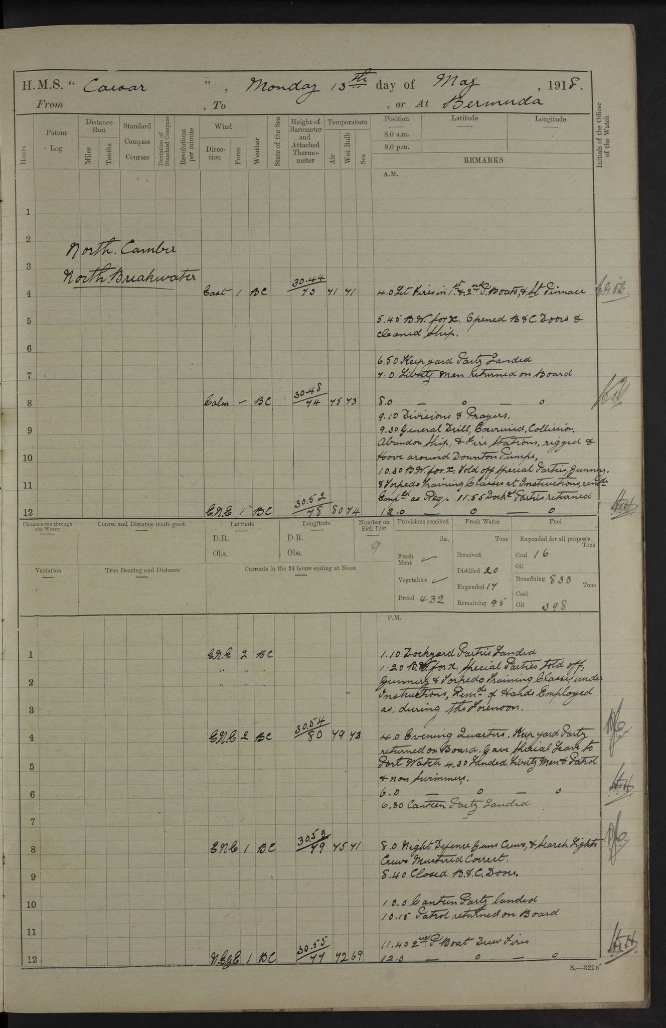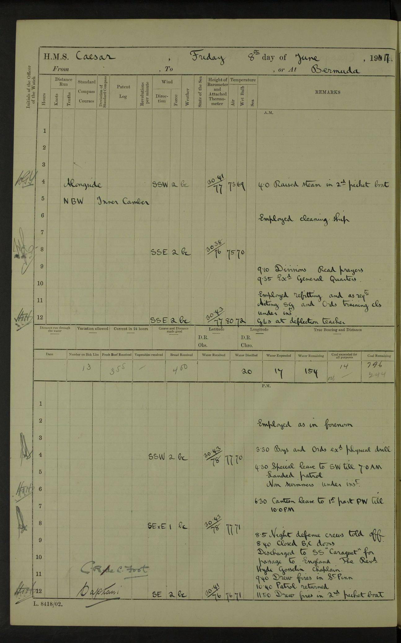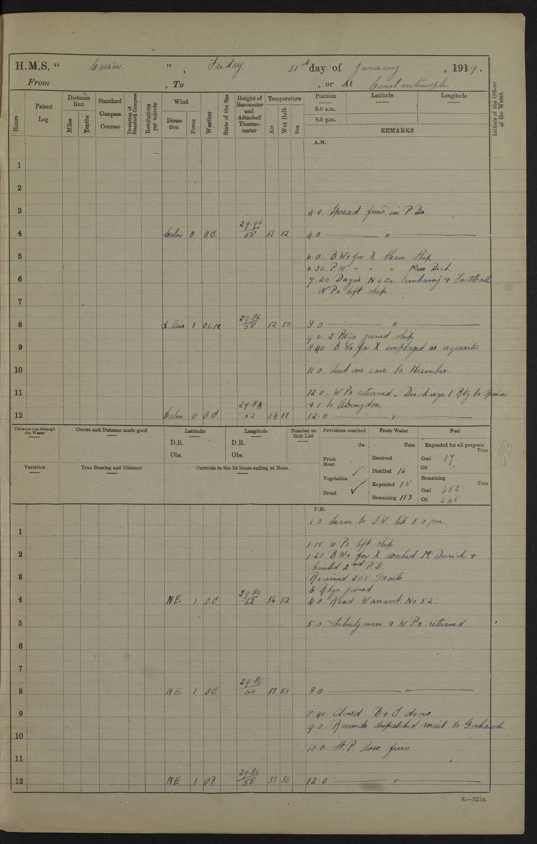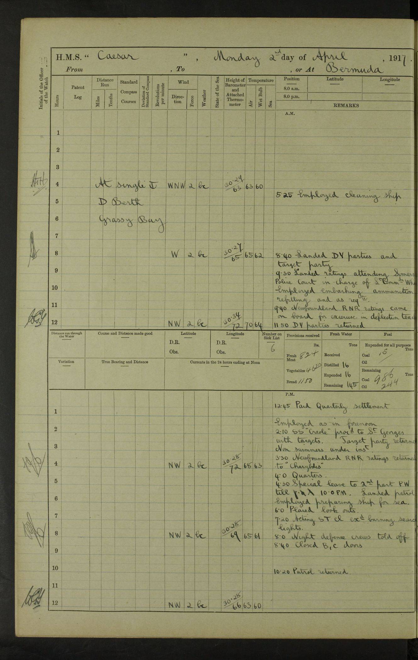 4caf84b6cadfd34197009939: (http://oldweather.s3.amazonaws.com/ADM53-36574/ADM 53-36574-145_1.jpg) 1 January 1917 At Bermuda Lat 32.32, Long -64.83 [Alongside Outer Camber Wall] 4.0am: Raised steam in first Picket boat. 6.0am: Employed cleaning ship. 7.0am: Landed Dockyard parties. Opened B, C doors. am: Employed drawing ammunition and stores, refitting and as requisite. 0.45pm: Paid monthly advance. pm: Employed as in forenoon. 4.30pm: Special leave to Starboard Watch till 7.0am. Landed patrol. 5.0pm: Dockyard parties returned. 6.30pm: Canteen leave to second part Port Watch till 10.0pm. 8.0pm: Night guns’ and search lights’ crews told off. 8.40pm: Closed B, C doors. 10.15pm: Patrol returned. 11.35pm: Drew fires in picket boats. [Number on sick list: 8] [Provisions received: Fresh Meat 340 lbs, Vegetables 2000 lbs, Bread 464 lbs] [Weather fine, though squally in early am. Noon temperature 63F] 4caf84b6cadfd3419700993a: (http://oldweather.s3.amazonaws.com/ADM53-36574/ADM 53-36574-146_0.jpg) 2 January 1917 [Year incorrectly shown as 1916] At Bermuda Lat 32.32, Long -64.83 [Alongside Outer Camber Wall] 4.30am: Raised steam in first picket boat. 6.30am: Landed working party to assist in repair of fenders in Inner Camber. 7.0am: Opened B, C doors. am: Employed embarking ammunition, refitting and as requisite. 11.45am: Working party returned. pm: Employed as in forenoon. 4.0pm: Quarters. 4.30pm: Special leave to Port Watch till 7.0am. Landed patrol. 6.30pm: Canteen leave to second part Starboard Watch till 10.0pm. 10.0pm: Patrol returned. 11.45pm: Drew fires in first picket boat. [Number on sick list: 8] [Provisions received: Fresh Meat 690 lbs, Bread 524 lbs] 4caf84b6cadfd3419700993b: (http://oldweather.s3.amazonaws.com/ADM53-36574/ADM 53-36574-146_1.jpg) 3 January 1917 [Year incorrectly shown as 1916] At Bermuda Lat 32.32, Long -64.83 [Alongside Outer Camber Wall] 7.0am: Opened B, C doors. Landed Dockyard parties. Sailed HMS “Antrim”. Landed Sanitary working party. am: Employed dismounting guns, drawing and returning stores, refitting and as requisite. Training class under instruction. 4.0pm: Quarters. Read Warrants No 268, 269. 4.30pm: Special leave to Starboard Watch till 7.0am. Landed patrol. 5.0pm: Dockyard and Working parties returned. 6.30pm: Canteen leave to first part Port Watch till 10.0pm. 8.5pm: Night guns’ and search lights’ crews told off. 10.0pm: Patrol returned. [Number on sick list: 8] [Provisions received: Fresh Meat 351 lbs, Vegetables 1000 lbs, Bread 512 lbs] 4caf84b6cadfd3419700993c: (http://oldweather.s3.amazonaws.com/ADM53-36574/ADM 53-36574-147_0.jpg) 4 January 1917 At Bermuda Lat 32.32, Long -64.83 [Alongside Outer Camber Wall] 7.0am: Landed Dockyard and Sanitary Working parties. am: Employed dismounting guns, sending up foretopmast, refitting and as requisite. Gunnery training class under instruction. 9.0am: Landed Working party to assist in repairs of fenders in Inner Camber. Discharged to SS “Kiakora” [probably Kaikoura] two ratings to form gun’s crew. 3.30pm: Working parties returned. 4.30pm: Special leave to Port Watch till 7.0am. Landed patrol. 6.30pm: Canteen leave to first part Starboard Watch till 10.0pm; 10.15pm: Patrol returned. [Number on sick list: 9] [Provisions received: Fresh Meat 353 lbs, Vegetables 1000 lbs, Bread 498 lbs] 4caf84b6cadfd3419700993d: (http://oldweather.s3.amazonaws.com/ADM53-36574/ADM 53-36574-147_1.jpg) 5 January 1917 At Bermuda Lat 32.32, Long -64.83 [Alongside Outer Camber Wall] 7.0am: Landed Dockyard and Sanitary Working parties. am: Employed refitting, dismounting guns and as requisite. Gunnery Training class under instruction. pm: Employed as in forenoon. 2.55pm: Arrived HMS “Antrim”. 4.30pm: Special leave to Starboard Watch till 7.0am. Landed patrol. 5.40pm: Drew fires in second picket boat. 6.30pm: Canteen leave to second part Port Watch till 10.0pm. 11.0pm: Patrol returned. 11.40pm: Drew fires in first picket boat. [Number on sick list: 9] [Provisions received: Fresh Meat 350 lbs, Vegetables 400 lbs, Bread 514 lbs] 4caf84b6cadfd3419700993e: (http://oldweather.s3.amazonaws.com/ADM53-36574/ADM 53-36574-148_0.jpg) 6 January 1917 At Bermuda Lat 32.32, Long -64.83 [Alongside Outer Camber Wall] 7.0am: Landed Dockyard parties. am: Employed cleaning ship, refitting, discharging ammunition from SS “Goodwood”, assisting in repairs to fenders of Inner Camber and as requisite. Training class under instruction. 11.45am: Dockyard parties returned. 0.30pm: Observed SS “Prophet” aground in Stag Channel. pm: Make and mend clothes. 1.30pm: Special leave to Port Watch till 7.0am and boys till 5.0pm. 3.0pm: SS “Prophet” refloated and proceeded to anchor. 4.0pm: Quarters. Read Warrant No 270. 4.30pm: Landed patrol. 5.0pm: Party employed discharging SS “Goodwood”. 6.30pm: Canteen leave to second part Starboard Watch till 10.0pm. 8.0pm: Night guns’ and search lights’ crews told off. 8.40pm: Closed B, C doors. 10.15pm: Patrol returned. [Number on sick list: 7] [Provisions received: Fresh Meat 361 lbs, Vegetables 2000 lbs, Bread 928 lbs] 4caf84b6cadfd3419700993f: (http://oldweather.s3.amazonaws.com/ADM53-36574/ADM 53-36574-148_1.jpg) 7 January 1917 At Bermuda Lat 32.32, Long -64.83 [Alongside Outer Camber Wall] 5.55am: Opened B, C doors. Employed cleaning ship. 8.30am: Landed Church parties, Presbyterians 18, Wesleyans 43, RCs 41. 9.30am: Divisions. 10.15am: Ship’s Company attended Divine Service at Dockyard Church. 11.20am: Church parties returned. 1.0pm: Special leave to Starboard Watch till 7.0am and boys will 5.0pm. 6.30pm: Canteen leave to first part Port Watch till 10.0pm. [Number on sick list: 8] [Weather fine, noon temperature 70F] 4caf84b6cadfd34197009940: (http://oldweather.s3.amazonaws.com/ADM53-36574/ADM 53-36574-149_0.jpg) 8 January 1917 At Bermuda Lat 32.32, Long -64.83 [Alongside Outer Camber Wall] 4.0am: Raised steam in first picket boat. 7.0am: Landed Dockyard parties. am: Employed dischargi