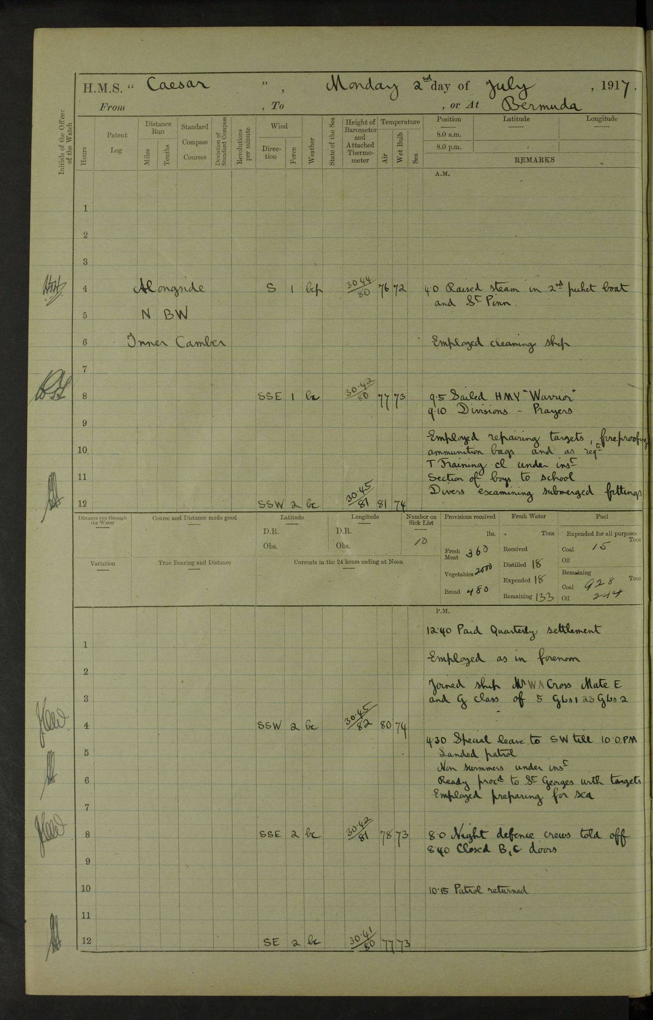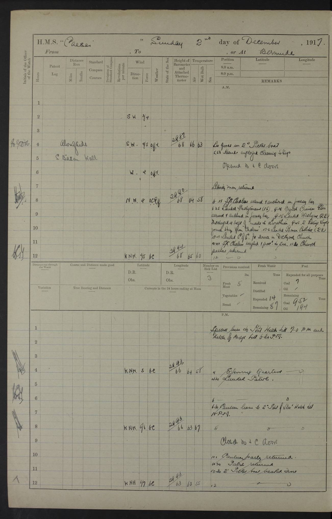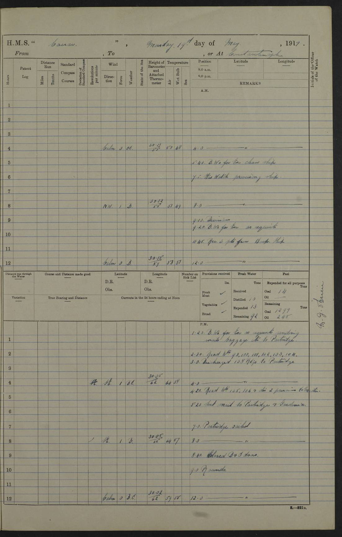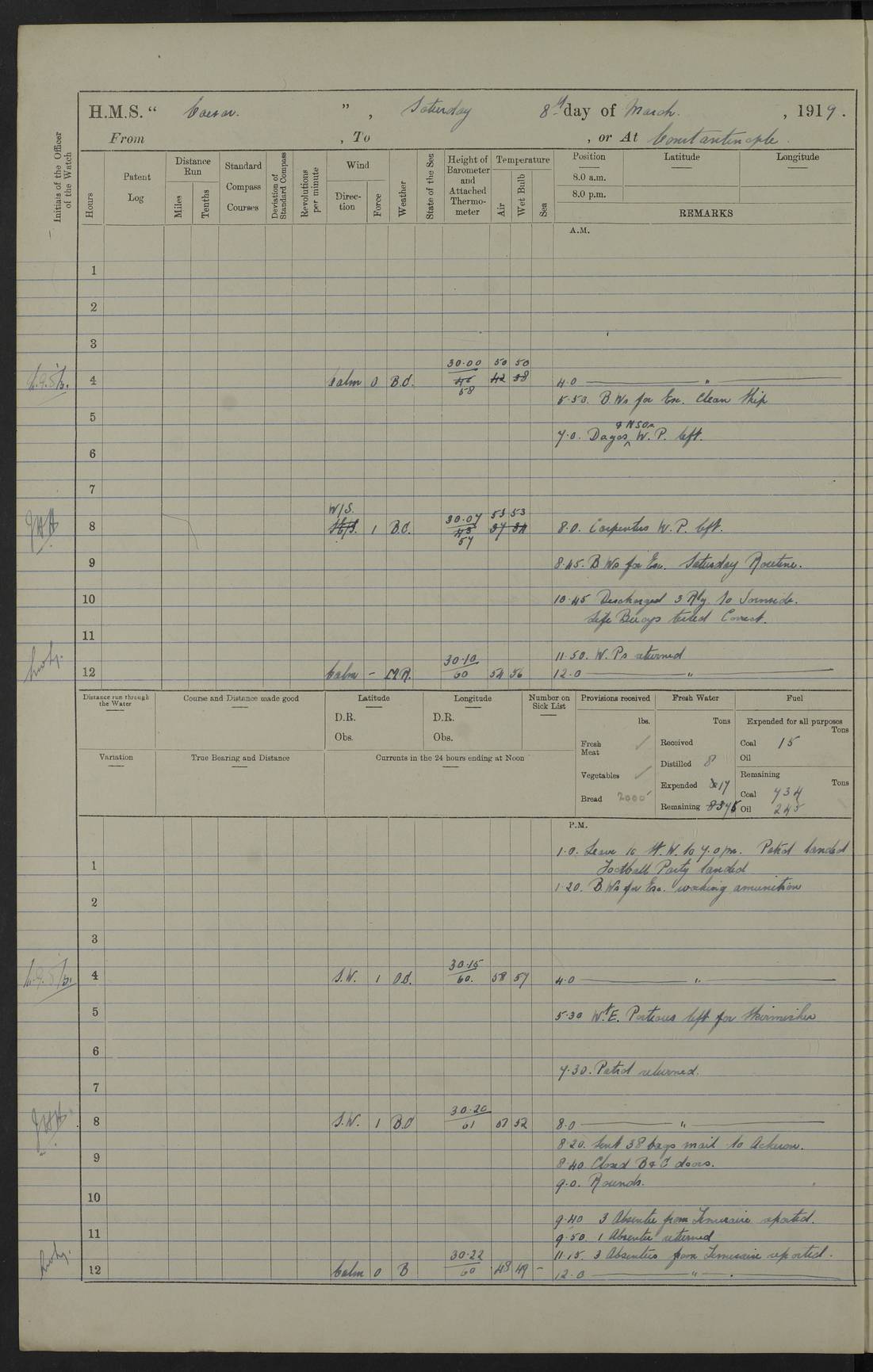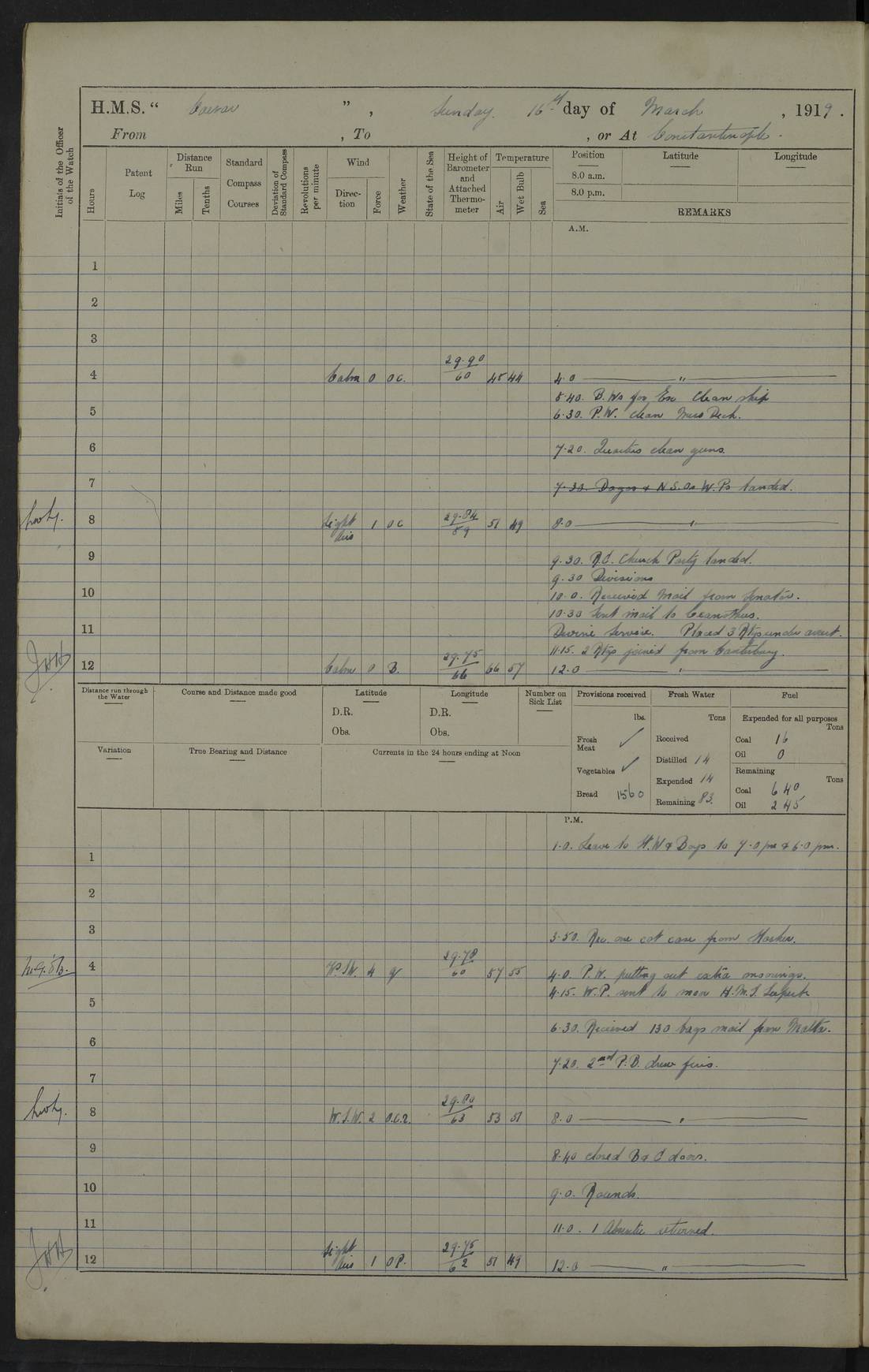 4caf84b6cadfd34197009939: (http://oldweather.s3.amazonaws.com/ADM53-36574/ADM 53-36574-145_1.jpg) 1 January 1917 At Bermuda Lat 32.32, Long -64.83 [Alongside Outer Camber Wall] 4.0am: Raised steam in first Picket boat. 6.0am: Employed cleaning ship. 7.0am: Landed Dockyard parties. Opened B, C doors. am: Employed drawing ammunition and stores, refitting and as requisite. 0.45pm: Paid monthly advance. pm: Employed as in forenoon. 4.30pm: Special leave to Starboard Watch till 7.0am. Landed patrol. 5.0pm: Dockyard parties returned. 6.30pm: Canteen leave to second part Port Watch till 10.0pm. 8.0pm: Night guns’ and search lights’ crews told off. 8.40pm: Closed B, C doors. 10.15pm: Patrol returned. 11.35pm: Drew fires in picket boats. [Number on sick list: 8] [Provisions received: Fresh Meat 340 lbs, Vegetables 2000 lbs, Bread 464 lbs] [Weather fine, though squally in early am. Noon temperature 63F] 4caf84b6cadfd3419700993a: (http://oldweather.s3.amazonaws.com/ADM53-36574/ADM 53-36574-146_0.jpg) 2 January 1917 [Year incorrectly shown as 1916] At Bermuda Lat 32.32, Long -64.83 [Alongside Outer Camber Wall] 4.30am: Raised steam in first picket boat. 6.30am: Landed working party to assist in repair of fenders in Inner Camber. 7.0am: Opened B, C doors. am: Employed embarking ammunition, refitting and as requisite. 11.45am: Working party returned. pm: Employed as in forenoon. 4.0pm: Quarters. 4.30pm: Special leave to Port Watch till 7.0am. Landed patrol. 6.30pm: Canteen leave to second part Starboard Watch till 10.0pm. 10.0pm: Patrol returned. 11.45pm: Drew fires in first picket boat. [Number on sick list: 8] [Provisions received: Fresh Meat 690 lbs, Bread 524 lbs] 4caf84b6cadfd3419700993b: (http://oldweather.s3.amazonaws.com/ADM53-36574/ADM 53-36574-146_1.jpg) 3 January 1917 [Year incorrectly shown as 1916] At Bermuda Lat 32.32, Long -64.83 [Alongside Outer Camber Wall] 7.0am: Opened B, C doors. Landed Dockyard parties. Sailed HMS “Antrim”. Landed Sanitary working party. am: Employed dismounting guns, drawing and returning stores, refitting and as requisite. Training class under instruction. 4.0pm: Quarters. Read Warrants No 268, 269. 4.30pm: Special leave to Starboard Watch till 7.0am. Landed patrol. 5.0pm: Dockyard and Working parties returned. 6.30pm: Canteen leave to first part Port Watch till 10.0pm. 8.5pm: Night guns’ and search lights’ crews told off. 10.0pm: Patrol returned. [Number on sick list: 8] [Provisions received: Fresh Meat 351 lbs, Vegetables 1000 lbs, Bread 512 lbs] 4caf84b6cadfd3419700993c: (http://oldweather.s3.amazonaws.com/ADM53-36574/ADM 53-36574-147_0.jpg) 4 January 1917 At Bermuda Lat 32.32, Long -64.83 [Alongside Outer Camber Wall] 7.0am: Landed Dockyard and Sanitary Working parties. am: Employed dismounting guns, sending up foretopmast, refitting and as requisite. Gunnery training class under instruction. 9.0am: Landed Working party to assist in repairs of fenders in Inner Camber. Discharged to SS “Kiakora” [probably Kaikoura] two ratings to form gun’s crew. 3.30pm: Working parties returned. 4.30pm: Special leave to Port Watch till 7.0am. Landed patrol. 6.30pm: Canteen leave to first part Starboard Watch till 10.0pm; 10.15pm: Patrol returned. [Number on sick list: 9] [Provisions received: Fresh Meat 353 lbs, Vegetables 1000 lbs, Bread 498 lbs] 4caf84b6cadfd3419700993d: (http://oldweather.s3.amazonaws.com/ADM53-36574/ADM 53-36574-147_1.jpg) 5 January 1917 At Bermuda Lat 32.32, Long -64.83 [Alongside Outer Camber Wall] 7.0am: Landed Dockyard and Sanitary Working parties. am: Employed refitting, dismounting guns and as requisite. Gunnery Training class under instruction. pm: Employed as in forenoon. 2.55pm: Arrived HMS “Antrim”. 4.30pm: Special leave to Starboard Watch till 7.0am. Landed patrol. 5.40pm: Drew fires in second picket boat. 6.30pm: Canteen leave to second part Port Watch till 10.0pm. 11.0pm: Patrol returned. 11.40pm: Drew fires in first picket boat. [Number on sick list: 9] [Provisions received: Fresh Meat 350 lbs, Vegetables 400 lbs, Bread 514 lbs] 4caf84b6cadfd3419700993e: (http://oldweather.s3.amazonaws.com/ADM53-36574/ADM 53-36574-148_0.jpg) 6 January 1917 At Bermuda Lat 32.32, Long -64.83 [Alongside Outer Camber Wall] 7.0am: Landed Dockyard parties. am: Employed cleaning ship, refitting, discharging ammunition from SS “Goodwood”, assisting in repairs to fenders of Inner Camber and as requisite. Training class under instruction. 11.45am: Dockyard parties returned. 0.30pm: Observed SS “Prophet” aground in Stag Channel. pm: Make and mend clothes. 1.30pm: Special leave to Port Watch till 7.0am and boys till 5.0pm. 3.0pm: SS “Prophet” refloated and proceeded to anchor. 4.0pm: Quarters. Read Warrant No 270. 4.30pm: Landed patrol. 5.0pm: Party employed discharging SS “Goodwood”. 6.30pm: Canteen leave to second part Starboard Watch till 10.0pm. 8.0pm: Night guns’ and search lights’ crews told off. 8.40pm: Closed B, C doors. 10.15pm: Patrol returned. [Number on sick list: 7] [Provisions received: Fresh Meat 361 lbs, Vegetables 2000 lbs, Bread 928 lbs] 4caf84b6cadfd3419700993f: (http://oldweather.s3.amazonaws.com/ADM53-36574/ADM 53-36574-148_1.jpg) 7 January 1917 At Bermuda Lat 32.32, Long -64.83 [Alongside Outer Camber Wall] 5.55am: Opened B, C doors. Employed cleaning ship. 8.30am: Landed Church parties, Presbyterians 18, Wesleyans 43, RCs 41. 9.30am: Divisions. 10.15am: Ship’s Company attended Divine Service at Dockyard Church. 11.20am: Church parties returned. 1.0pm: Special leave to Starboard Watch till 7.0am and boys will 5.0pm. 6.30pm: Canteen leave to first part Port Watch till 10.0pm. [Number on sick list: 8] [Weather fine, noon temperature 70F] 4caf84b6cadfd34197009940: (http://oldweather.s3.amazonaws.com/ADM53-36574/ADM 53-36574-149_0.jpg) 8 January 1917 At Bermuda Lat 32.32, Long -64.83 [Alongside Outer Camber Wall] 4.0am: Raised steam in first picket boat. 7.0am: Landed Dockyard parties. am: Employed dischargi