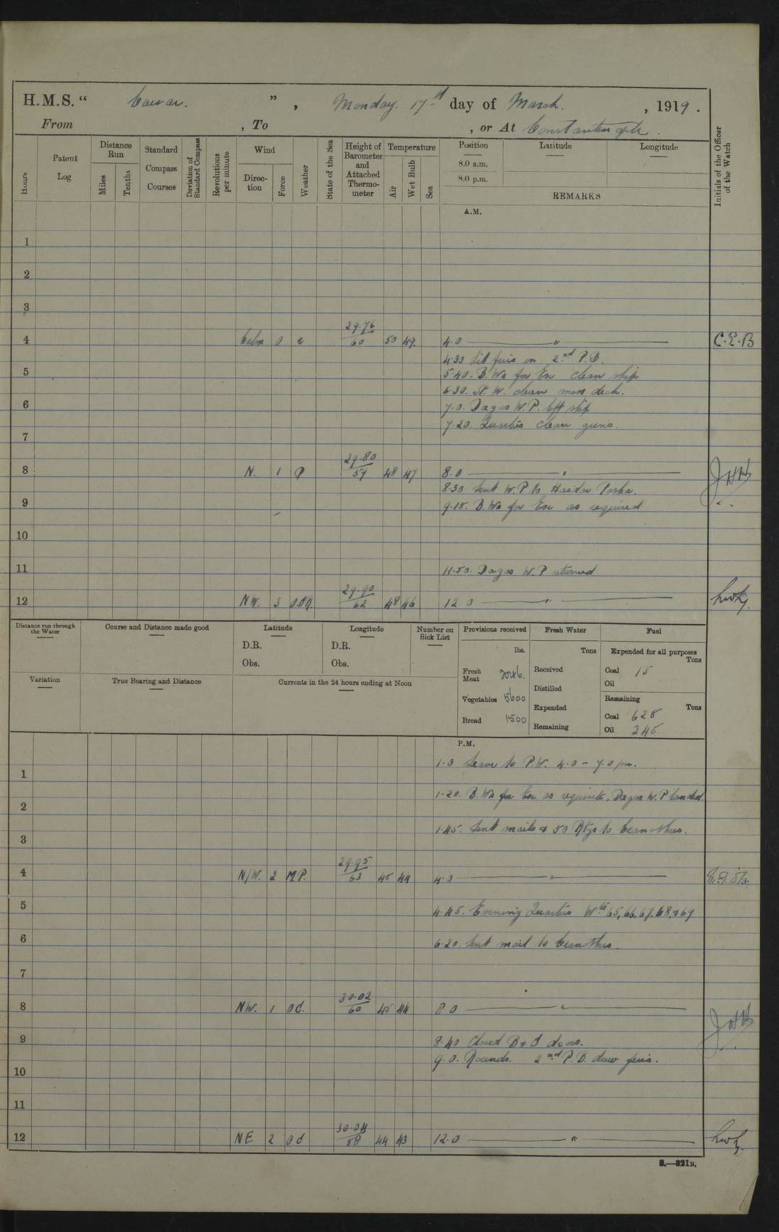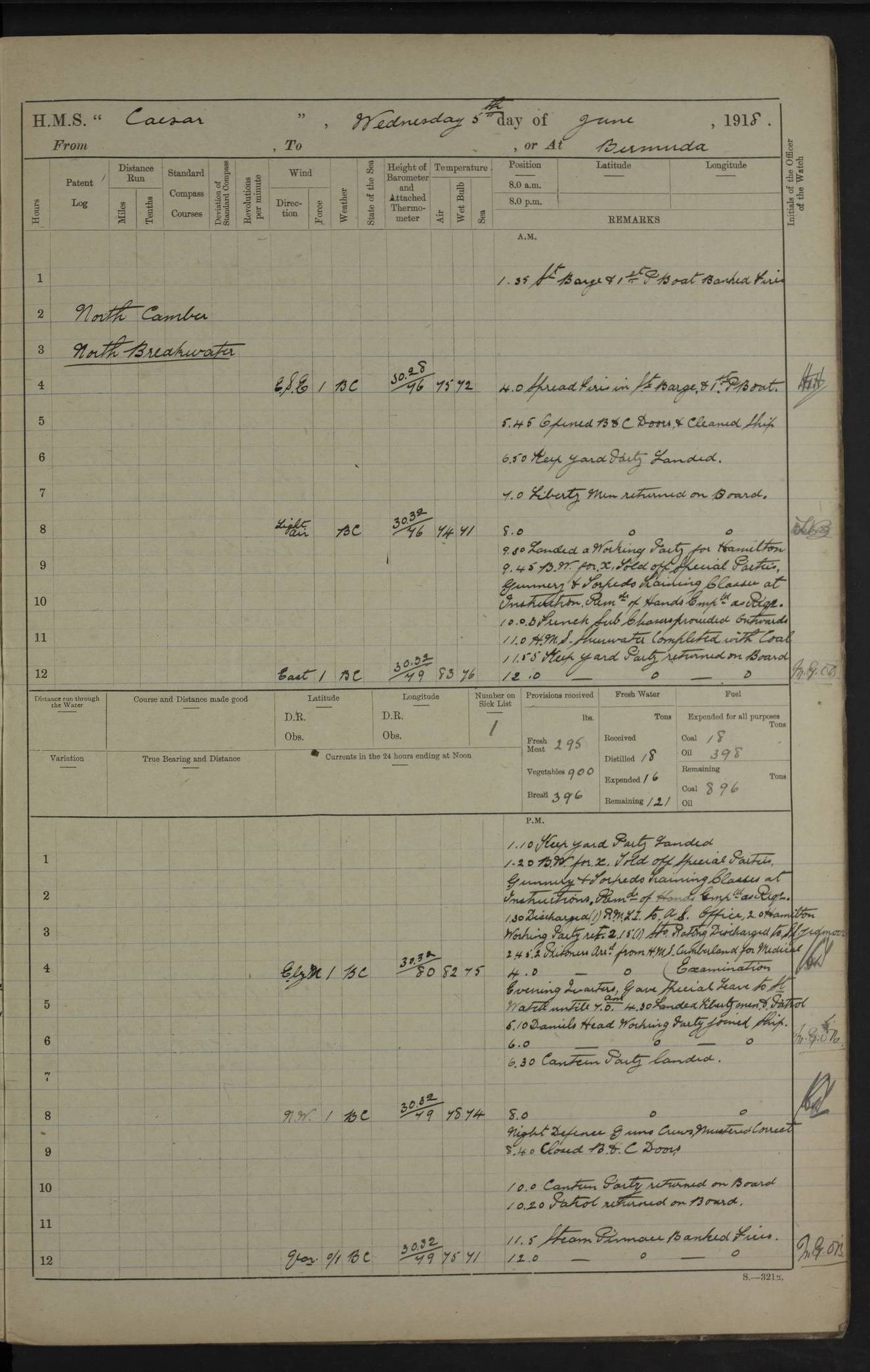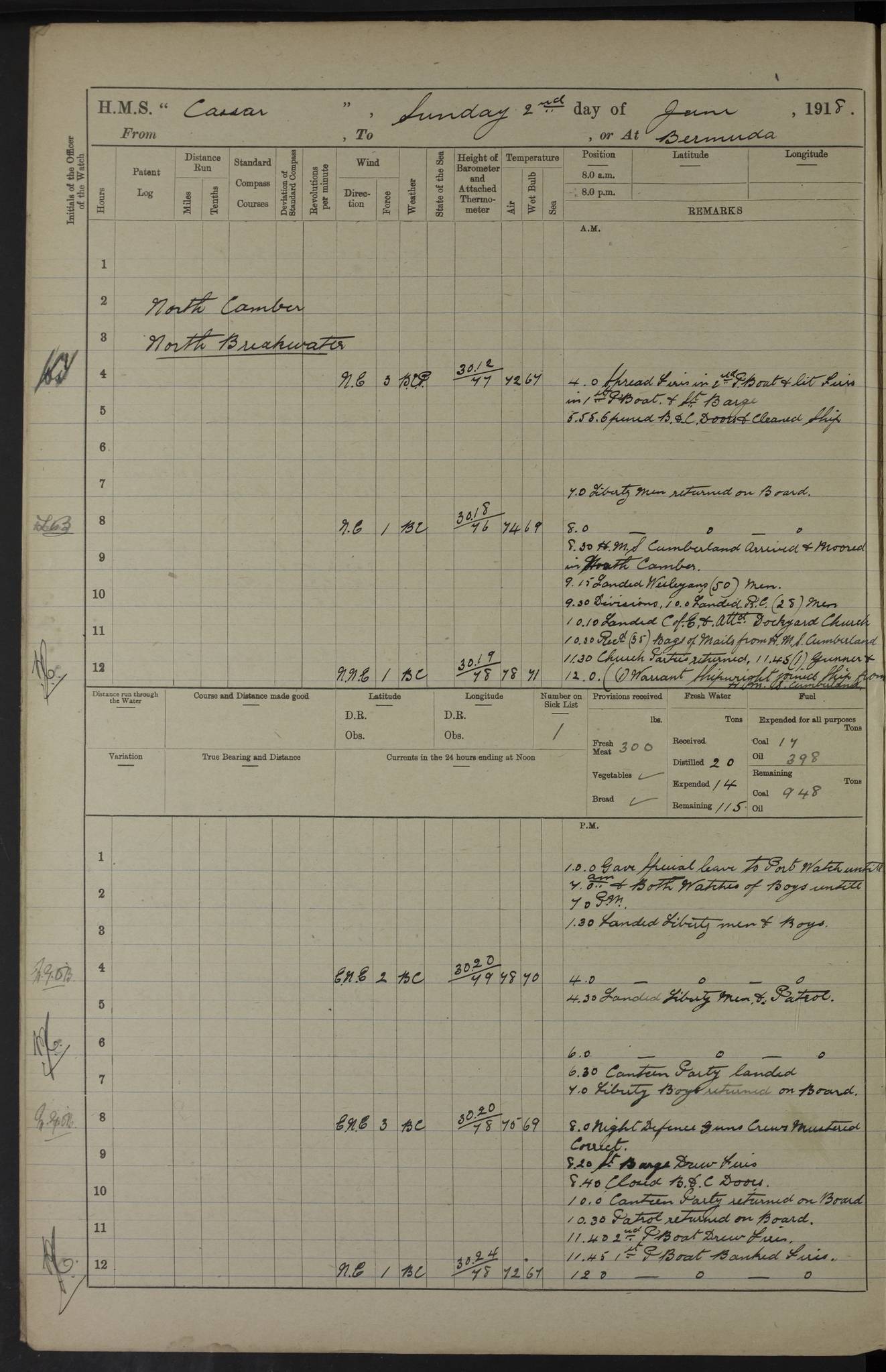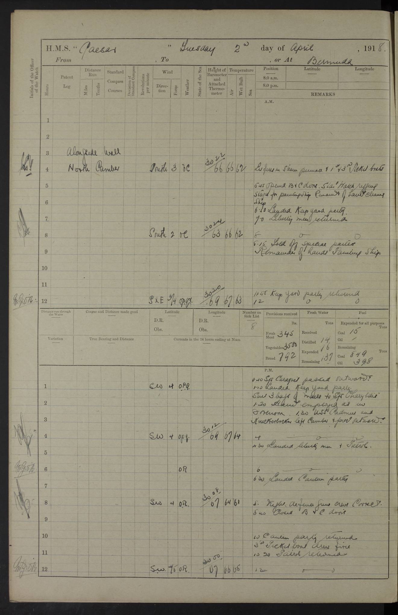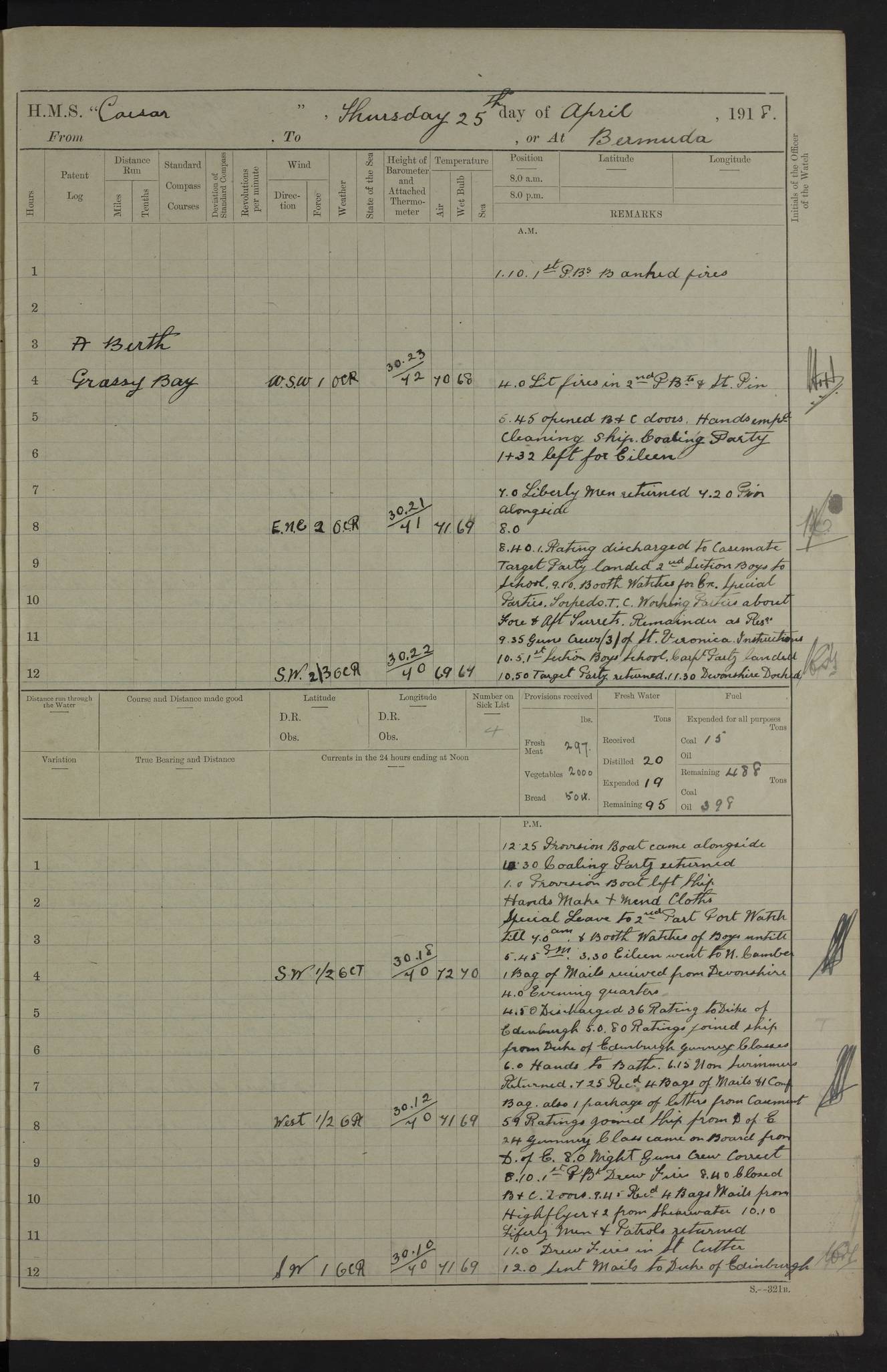 4caf84b6cadfd34197009939: (http://oldweather.s3.amazonaws.com/ADM53-36574/ADM 53-36574-145_1.jpg) 1 January 1917 At Bermuda Lat 32.32, Long -64.83 [Alongside Outer Camber Wall] 4.0am: Raised steam in first Picket boat. 6.0am: Employed cleaning ship. 7.0am: Landed Dockyard parties. Opened B, C doors. am: Employed drawing ammunition and stores, refitting and as requisite. 0.45pm: Paid monthly advance. pm: Employed as in forenoon. 4.30pm: Special leave to Starboard Watch till 7.0am. Landed patrol. 5.0pm: Dockyard parties returned. 6.30pm: Canteen leave to second part Port Watch till 10.0pm. 8.0pm: Night guns’ and search lights’ crews told off. 8.40pm: Closed B, C doors. 10.15pm: Patrol returned. 11.35pm: Drew fires in picket boats. [Number on sick list: 8] [Provisions received: Fresh Meat 340 lbs, Vegetables 2000 lbs, Bread 464 lbs] [Weather fine, though squally in early am. Noon temperature 63F] 4caf84b6cadfd3419700993a: (http://oldweather.s3.amazonaws.com/ADM53-36574/ADM 53-36574-146_0.jpg) 2 January 1917 [Year incorrectly shown as 1916] At Bermuda Lat 32.32, Long -64.83 [Alongside Outer Camber Wall] 4.30am: Raised steam in first picket boat. 6.30am: Landed working party to assist in repair of fenders in Inner Camber. 7.0am: Opened B, C doors. am: Employed embarking ammunition, refitting and as requisite. 11.45am: Working party returned. pm: Employed as in forenoon. 4.0pm: Quarters. 4.30pm: Special leave to Port Watch till 7.0am. Landed patrol. 6.30pm: Canteen leave to second part Starboard Watch till 10.0pm. 10.0pm: Patrol returned. 11.45pm: Drew fires in first picket boat. [Number on sick list: 8] [Provisions received: Fresh Meat 690 lbs, Bread 524 lbs] 4caf84b6cadfd3419700993b: (http://oldweather.s3.amazonaws.com/ADM53-36574/ADM 53-36574-146_1.jpg) 3 January 1917 [Year incorrectly shown as 1916] At Bermuda Lat 32.32, Long -64.83 [Alongside Outer Camber Wall] 7.0am: Opened B, C doors. Landed Dockyard parties. Sailed HMS “Antrim”. Landed Sanitary working party. am: Employed dismounting guns, drawing and returning stores, refitting and as requisite. Training class under instruction. 4.0pm: Quarters. Read Warrants No 268, 269. 4.30pm: Special leave to Starboard Watch till 7.0am. Landed patrol. 5.0pm: Dockyard and Working parties returned. 6.30pm: Canteen leave to first part Port Watch till 10.0pm. 8.5pm: Night guns’ and search lights’ crews told off. 10.0pm: Patrol returned. [Number on sick list: 8] [Provisions received: Fresh Meat 351 lbs, Vegetables 1000 lbs, Bread 512 lbs] 4caf84b6cadfd3419700993c: (http://oldweather.s3.amazonaws.com/ADM53-36574/ADM 53-36574-147_0.jpg) 4 January 1917 At Bermuda Lat 32.32, Long -64.83 [Alongside Outer Camber Wall] 7.0am: Landed Dockyard and Sanitary Working parties. am: Employed dismounting guns, sending up foretopmast, refitting and as requisite. Gunnery training class under instruction. 9.0am: Landed Working party to assist in repairs of fenders in Inner Camber. Discharged to SS “Kiakora” [probably Kaikoura] two ratings to form gun’s crew. 3.30pm: Working parties returned. 4.30pm: Special leave to Port Watch till 7.0am. Landed patrol. 6.30pm: Canteen leave to first part Starboard Watch till 10.0pm; 10.15pm: Patrol returned. [Number on sick list: 9] [Provisions received: Fresh Meat 353 lbs, Vegetables 1000 lbs, Bread 498 lbs] 4caf84b6cadfd3419700993d: (http://oldweather.s3.amazonaws.com/ADM53-36574/ADM 53-36574-147_1.jpg) 5 January 1917 At Bermuda Lat 32.32, Long -64.83 [Alongside Outer Camber Wall] 7.0am: Landed Dockyard and Sanitary Working parties. am: Employed refitting, dismounting guns and as requisite. Gunnery Training class under instruction. pm: Employed as in forenoon. 2.55pm: Arrived HMS “Antrim”. 4.30pm: Special leave to Starboard Watch till 7.0am. Landed patrol. 5.40pm: Drew fires in second picket boat. 6.30pm: Canteen leave to second part Port Watch till 10.0pm. 11.0pm: Patrol returned. 11.40pm: Drew fires in first picket boat. [Number on sick list: 9] [Provisions received: Fresh Meat 350 lbs, Vegetables 400 lbs, Bread 514 lbs] 4caf84b6cadfd3419700993e: (http://oldweather.s3.amazonaws.com/ADM53-36574/ADM 53-36574-148_0.jpg) 6 January 1917 At Bermuda Lat 32.32, Long -64.83 [Alongside Outer Camber Wall] 7.0am: Landed Dockyard parties. am: Employed cleaning ship, refitting, discharging ammunition from SS “Goodwood”, assisting in repairs to fenders of Inner Camber and as requisite. Training class under instruction. 11.45am: Dockyard parties returned. 0.30pm: Observed SS “Prophet” aground in Stag Channel. pm: Make and mend clothes. 1.30pm: Special leave to Port Watch till 7.0am and boys till 5.0pm. 3.0pm: SS “Prophet” refloated and proceeded to anchor. 4.0pm: Quarters. Read Warrant No 270. 4.30pm: Landed patrol. 5.0pm: Party employed discharging SS “Goodwood”. 6.30pm: Canteen leave to second part Starboard Watch till 10.0pm. 8.0pm: Night guns’ and search lights’ crews told off. 8.40pm: Closed B, C doors. 10.15pm: Patrol returned. [Number on sick list: 7] [Provisions received: Fresh Meat 361 lbs, Vegetables 2000 lbs, Bread 928 lbs] 4caf84b6cadfd3419700993f: (http://oldweather.s3.amazonaws.com/ADM53-36574/ADM 53-36574-148_1.jpg) 7 January 1917 At Bermuda Lat 32.32, Long -64.83 [Alongside Outer Camber Wall] 5.55am: Opened B, C doors. Employed cleaning ship. 8.30am: Landed Church parties, Presbyterians 18, Wesleyans 43, RCs 41. 9.30am: Divisions. 10.15am: Ship’s Company attended Divine Service at Dockyard Church. 11.20am: Church parties returned. 1.0pm: Special leave to Starboard Watch till 7.0am and boys will 5.0pm. 6.30pm: Canteen leave to first part Port Watch till 10.0pm. [Number on sick list: 8] [Weather fine, noon temperature 70F] 4caf84b6cadfd34197009940: (http://oldweather.s3.amazonaws.com/ADM53-36574/ADM 53-36574-149_0.jpg) 8 January 1917 At Bermuda Lat 32.32, Long -64.83 [Alongside Outer Camber Wall] 4.0am: Raised steam in first picket boat. 7.0am: Landed Dockyard parties. am: Employed dischargi