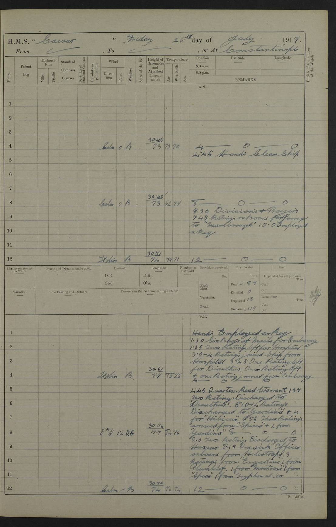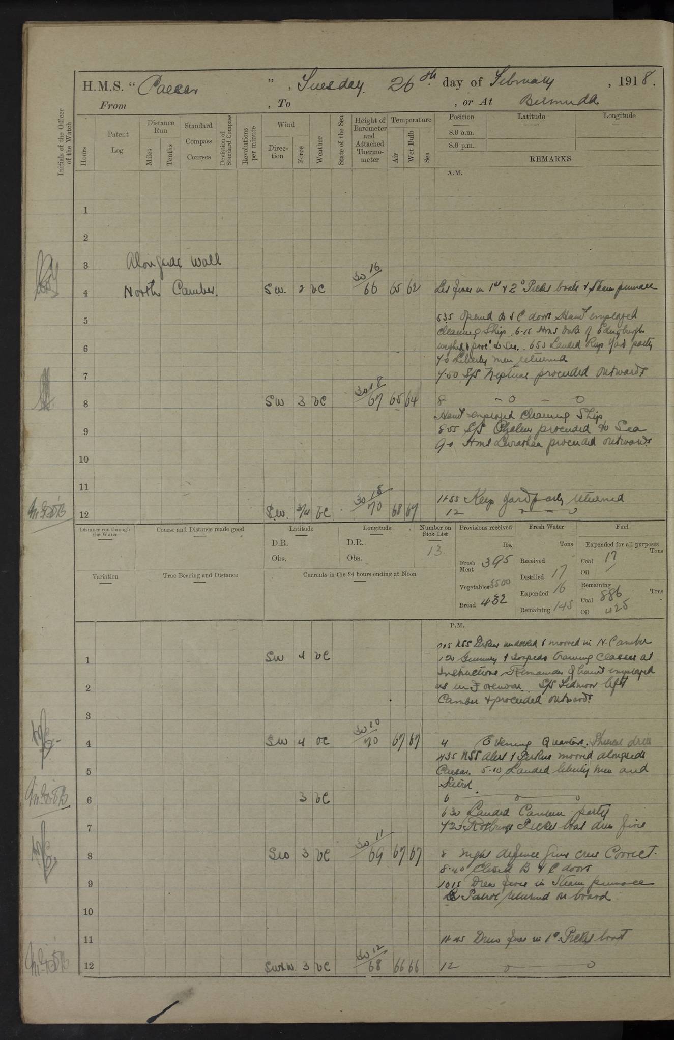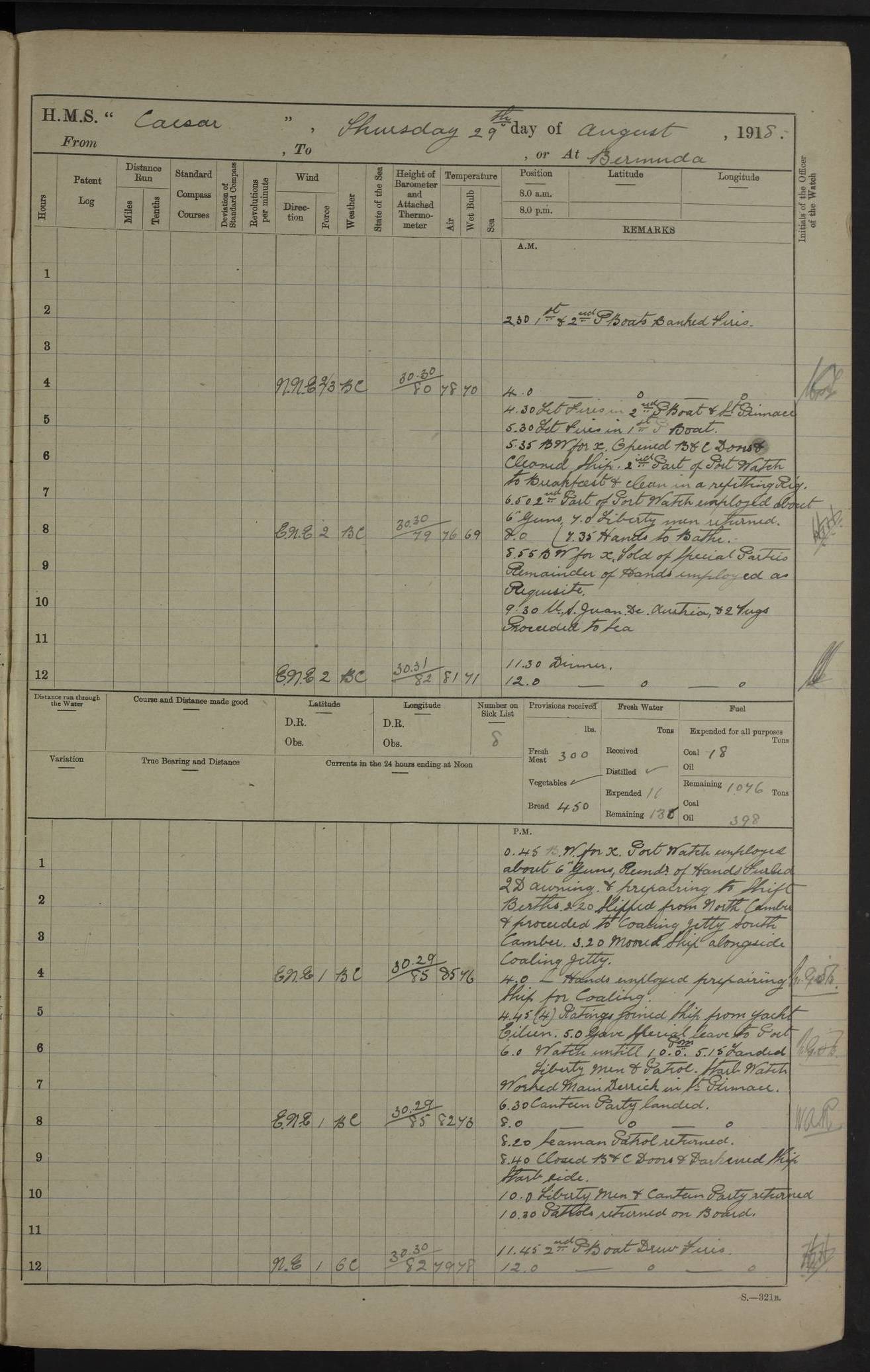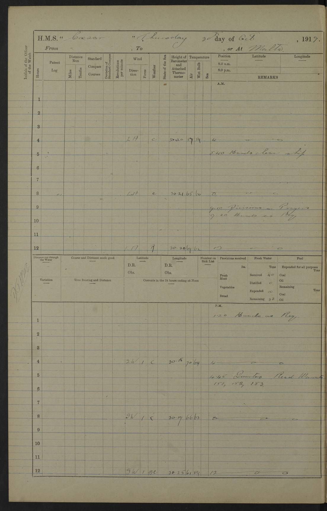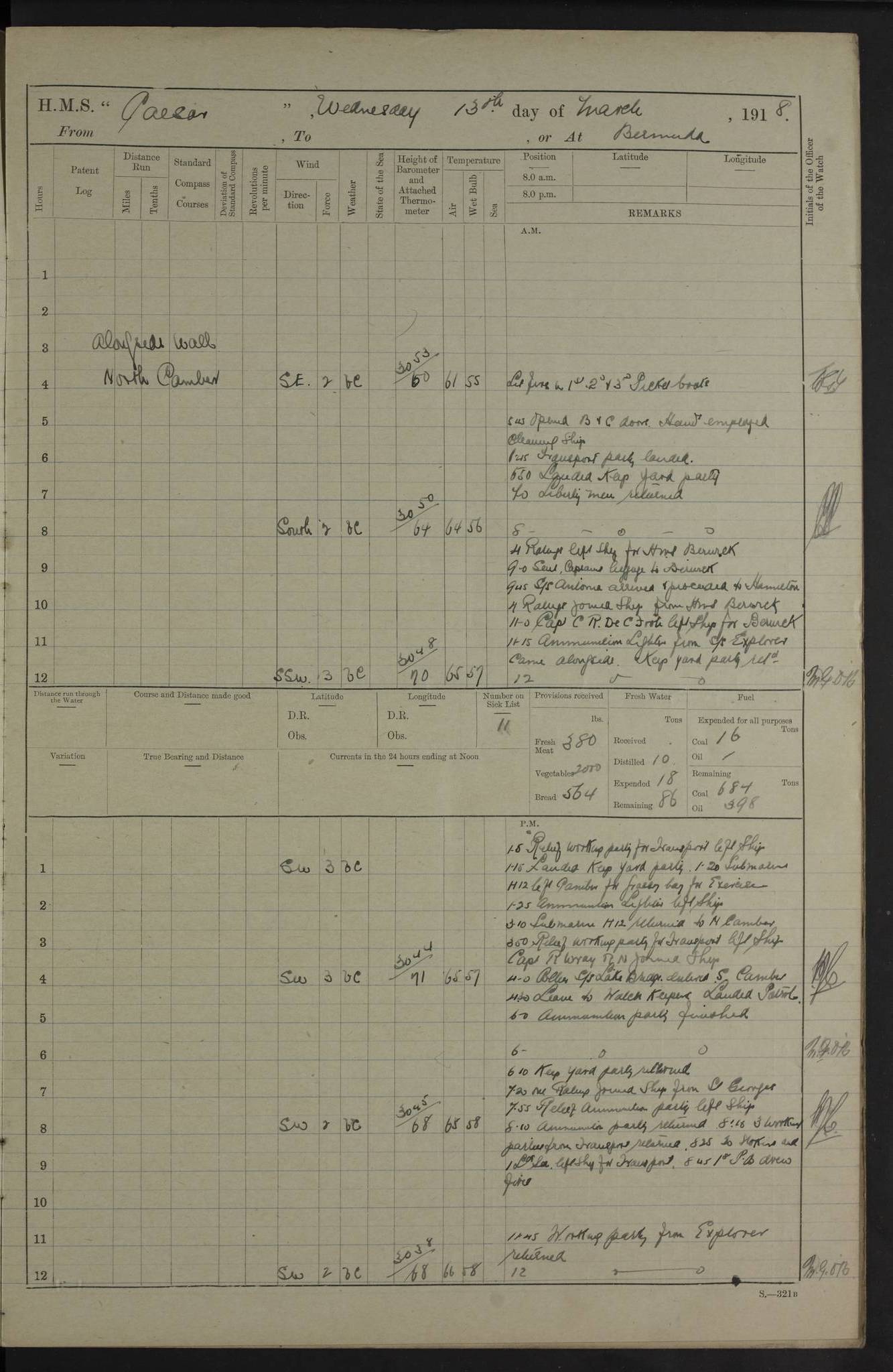 4caf84b6cadfd34197009939: (http://oldweather.s3.amazonaws.com/ADM53-36574/ADM 53-36574-145_1.jpg) 1 January 1917 At Bermuda Lat 32.32, Long -64.83 [Alongside Outer Camber Wall] 4.0am: Raised steam in first Picket boat. 6.0am: Employed cleaning ship. 7.0am: Landed Dockyard parties. Opened B, C doors. am: Employed drawing ammunition and stores, refitting and as requisite. 0.45pm: Paid monthly advance. pm: Employed as in forenoon. 4.30pm: Special leave to Starboard Watch till 7.0am. Landed patrol. 5.0pm: Dockyard parties returned. 6.30pm: Canteen leave to second part Port Watch till 10.0pm. 8.0pm: Night guns’ and search lights’ crews told off. 8.40pm: Closed B, C doors. 10.15pm: Patrol returned. 11.35pm: Drew fires in picket boats. [Number on sick list: 8] [Provisions received: Fresh Meat 340 lbs, Vegetables 2000 lbs, Bread 464 lbs] [Weather fine, though squally in early am. Noon temperature 63F] 4caf84b6cadfd3419700993a: (http://oldweather.s3.amazonaws.com/ADM53-36574/ADM 53-36574-146_0.jpg) 2 January 1917 [Year incorrectly shown as 1916] At Bermuda Lat 32.32, Long -64.83 [Alongside Outer Camber Wall] 4.30am: Raised steam in first picket boat. 6.30am: Landed working party to assist in repair of fenders in Inner Camber. 7.0am: Opened B, C doors. am: Employed embarking ammunition, refitting and as requisite. 11.45am: Working party returned. pm: Employed as in forenoon. 4.0pm: Quarters. 4.30pm: Special leave to Port Watch till 7.0am. Landed patrol. 6.30pm: Canteen leave to second part Starboard Watch till 10.0pm. 10.0pm: Patrol returned. 11.45pm: Drew fires in first picket boat. [Number on sick list: 8] [Provisions received: Fresh Meat 690 lbs, Bread 524 lbs] 4caf84b6cadfd3419700993b: (http://oldweather.s3.amazonaws.com/ADM53-36574/ADM 53-36574-146_1.jpg) 3 January 1917 [Year incorrectly shown as 1916] At Bermuda Lat 32.32, Long -64.83 [Alongside Outer Camber Wall] 7.0am: Opened B, C doors. Landed Dockyard parties. Sailed HMS “Antrim”. Landed Sanitary working party. am: Employed dismounting guns, drawing and returning stores, refitting and as requisite. Training class under instruction. 4.0pm: Quarters. Read Warrants No 268, 269. 4.30pm: Special leave to Starboard Watch till 7.0am. Landed patrol. 5.0pm: Dockyard and Working parties returned. 6.30pm: Canteen leave to first part Port Watch till 10.0pm. 8.5pm: Night guns’ and search lights’ crews told off. 10.0pm: Patrol returned. [Number on sick list: 8] [Provisions received: Fresh Meat 351 lbs, Vegetables 1000 lbs, Bread 512 lbs] 4caf84b6cadfd3419700993c: (http://oldweather.s3.amazonaws.com/ADM53-36574/ADM 53-36574-147_0.jpg) 4 January 1917 At Bermuda Lat 32.32, Long -64.83 [Alongside Outer Camber Wall] 7.0am: Landed Dockyard and Sanitary Working parties. am: Employed dismounting guns, sending up foretopmast, refitting and as requisite. Gunnery training class under instruction. 9.0am: Landed Working party to assist in repairs of fenders in Inner Camber. Discharged to SS “Kiakora” [probably Kaikoura] two ratings to form gun’s crew. 3.30pm: Working parties returned. 4.30pm: Special leave to Port Watch till 7.0am. Landed patrol. 6.30pm: Canteen leave to first part Starboard Watch till 10.0pm; 10.15pm: Patrol returned. [Number on sick list: 9] [Provisions received: Fresh Meat 353 lbs, Vegetables 1000 lbs, Bread 498 lbs] 4caf84b6cadfd3419700993d: (http://oldweather.s3.amazonaws.com/ADM53-36574/ADM 53-36574-147_1.jpg) 5 January 1917 At Bermuda Lat 32.32, Long -64.83 [Alongside Outer Camber Wall] 7.0am: Landed Dockyard and Sanitary Working parties. am: Employed refitting, dismounting guns and as requisite. Gunnery Training class under instruction. pm: Employed as in forenoon. 2.55pm: Arrived HMS “Antrim”. 4.30pm: Special leave to Starboard Watch till 7.0am. Landed patrol. 5.40pm: Drew fires in second picket boat. 6.30pm: Canteen leave to second part Port Watch till 10.0pm. 11.0pm: Patrol returned. 11.40pm: Drew fires in first picket boat. [Number on sick list: 9] [Provisions received: Fresh Meat 350 lbs, Vegetables 400 lbs, Bread 514 lbs] 4caf84b6cadfd3419700993e: (http://oldweather.s3.amazonaws.com/ADM53-36574/ADM 53-36574-148_0.jpg) 6 January 1917 At Bermuda Lat 32.32, Long -64.83 [Alongside Outer Camber Wall] 7.0am: Landed Dockyard parties. am: Employed cleaning ship, refitting, discharging ammunition from SS “Goodwood”, assisting in repairs to fenders of Inner Camber and as requisite. Training class under instruction. 11.45am: Dockyard parties returned. 0.30pm: Observed SS “Prophet” aground in Stag Channel. pm: Make and mend clothes. 1.30pm: Special leave to Port Watch till 7.0am and boys till 5.0pm. 3.0pm: SS “Prophet” refloated and proceeded to anchor. 4.0pm: Quarters. Read Warrant No 270. 4.30pm: Landed patrol. 5.0pm: Party employed discharging SS “Goodwood”. 6.30pm: Canteen leave to second part Starboard Watch till 10.0pm. 8.0pm: Night guns’ and search lights’ crews told off. 8.40pm: Closed B, C doors. 10.15pm: Patrol returned. [Number on sick list: 7] [Provisions received: Fresh Meat 361 lbs, Vegetables 2000 lbs, Bread 928 lbs] 4caf84b6cadfd3419700993f: (http://oldweather.s3.amazonaws.com/ADM53-36574/ADM 53-36574-148_1.jpg) 7 January 1917 At Bermuda Lat 32.32, Long -64.83 [Alongside Outer Camber Wall] 5.55am: Opened B, C doors. Employed cleaning ship. 8.30am: Landed Church parties, Presbyterians 18, Wesleyans 43, RCs 41. 9.30am: Divisions. 10.15am: Ship’s Company attended Divine Service at Dockyard Church. 11.20am: Church parties returned. 1.0pm: Special leave to Starboard Watch till 7.0am and boys will 5.0pm. 6.30pm: Canteen leave to first part Port Watch till 10.0pm. [Number on sick list: 8] [Weather fine, noon temperature 70F] 4caf84b6cadfd34197009940: (http://oldweather.s3.amazonaws.com/ADM53-36574/ADM 53-36574-149_0.jpg) 8 January 1917 At Bermuda Lat 32.32, Long -64.83 [Alongside Outer Camber Wall] 4.0am: Raised steam in first picket boat. 7.0am: Landed Dockyard parties. am: Employed dischargi