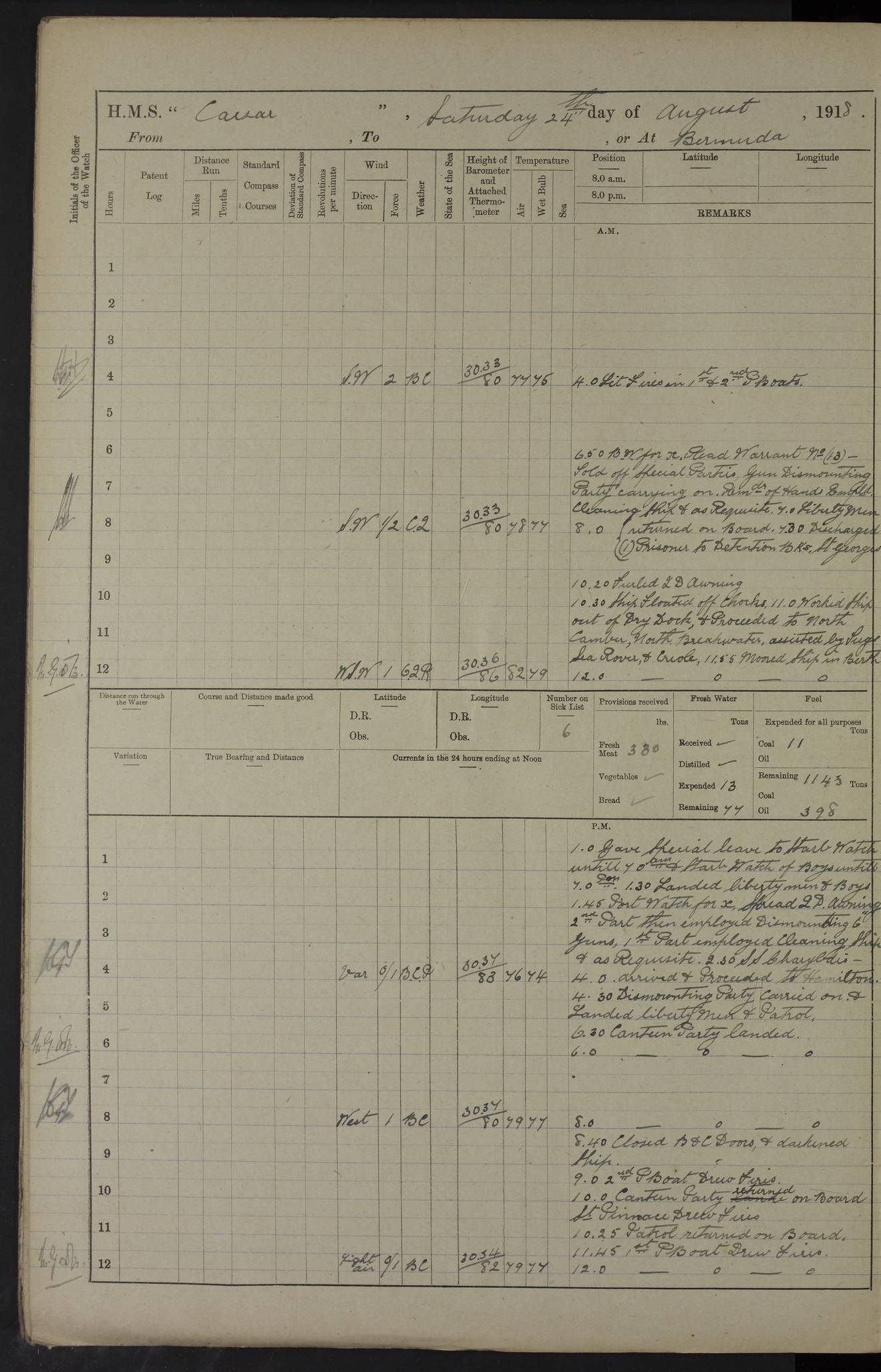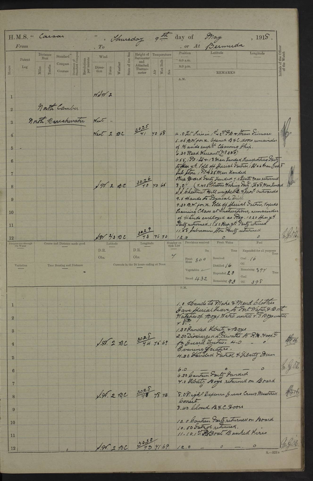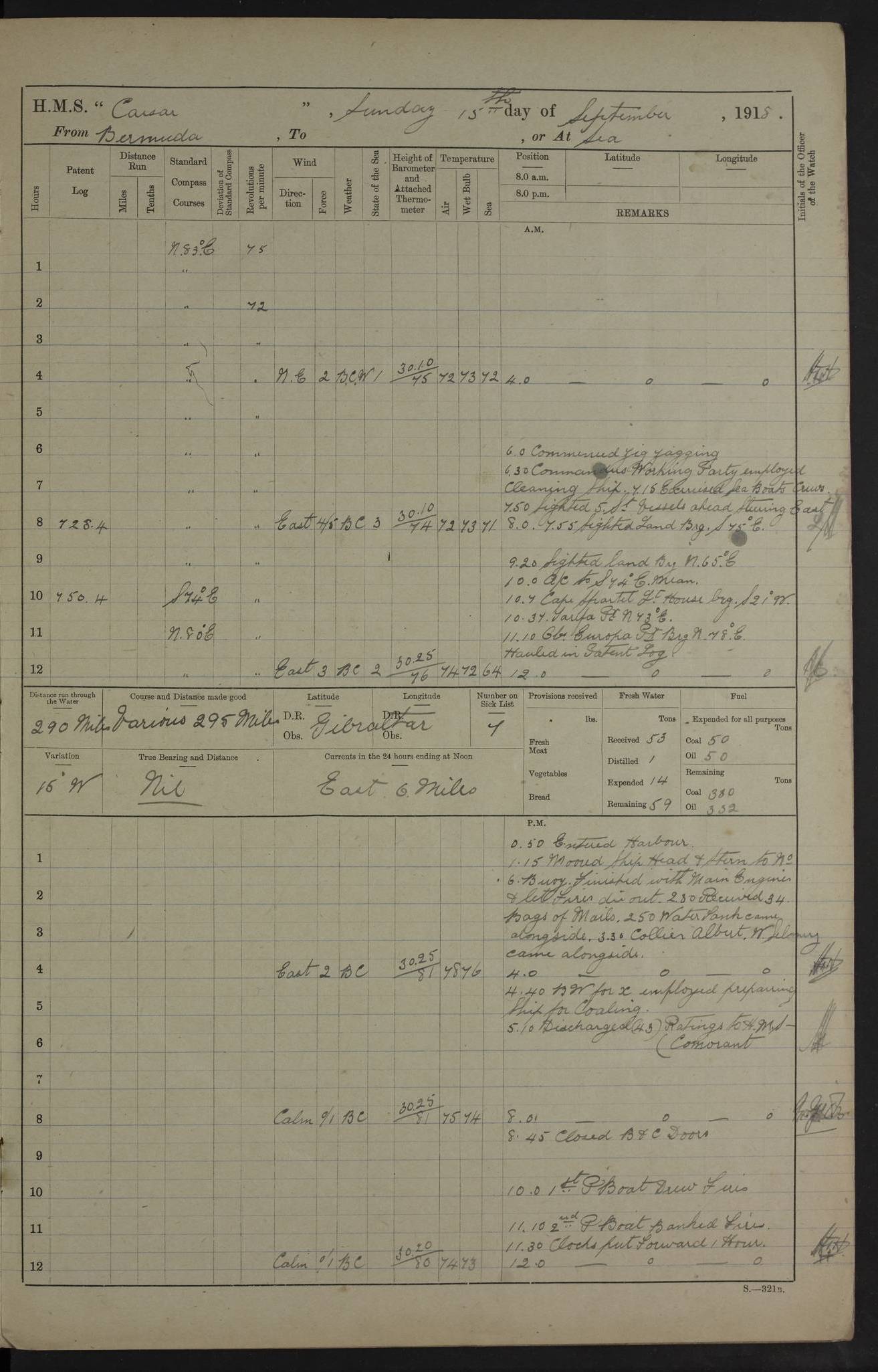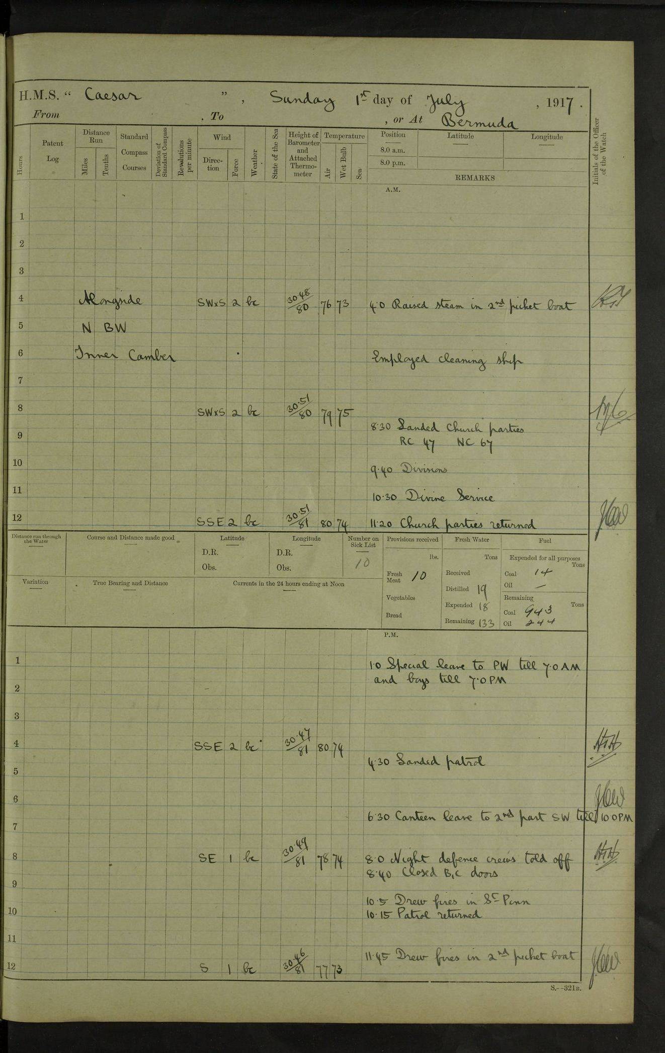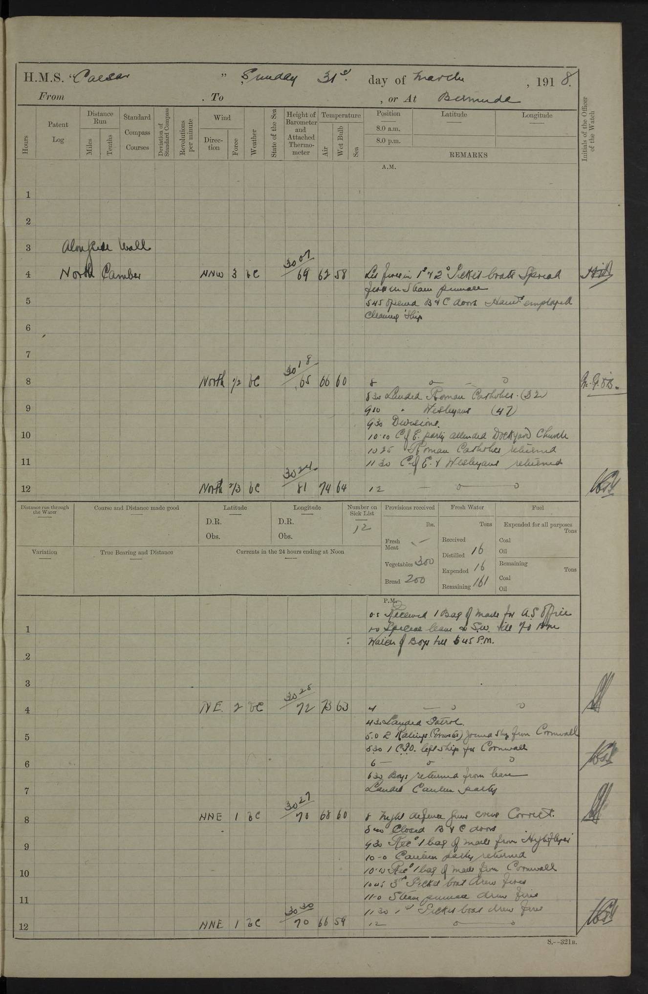 4caf84b6cadfd34197009939: (http://oldweather.s3.amazonaws.com/ADM53-36574/ADM 53-36574-145_1.jpg) 1 January 1917 At Bermuda Lat 32.32, Long -64.83 [Alongside Outer Camber Wall] 4.0am: Raised steam in first Picket boat. 6.0am: Employed cleaning ship. 7.0am: Landed Dockyard parties. Opened B, C doors. am: Employed drawing ammunition and stores, refitting and as requisite. 0.45pm: Paid monthly advance. pm: Employed as in forenoon. 4.30pm: Special leave to Starboard Watch till 7.0am. Landed patrol. 5.0pm: Dockyard parties returned. 6.30pm: Canteen leave to second part Port Watch till 10.0pm. 8.0pm: Night guns’ and search lights’ crews told off. 8.40pm: Closed B, C doors. 10.15pm: Patrol returned. 11.35pm: Drew fires in picket boats. [Number on sick list: 8] [Provisions received: Fresh Meat 340 lbs, Vegetables 2000 lbs, Bread 464 lbs] [Weather fine, though squally in early am. Noon temperature 63F] 4caf84b6cadfd3419700993a: (http://oldweather.s3.amazonaws.com/ADM53-36574/ADM 53-36574-146_0.jpg) 2 January 1917 [Year incorrectly shown as 1916] At Bermuda Lat 32.32, Long -64.83 [Alongside Outer Camber Wall] 4.30am: Raised steam in first picket boat. 6.30am: Landed working party to assist in repair of fenders in Inner Camber. 7.0am: Opened B, C doors. am: Employed embarking ammunition, refitting and as requisite. 11.45am: Working party returned. pm: Employed as in forenoon. 4.0pm: Quarters. 4.30pm: Special leave to Port Watch till 7.0am. Landed patrol. 6.30pm: Canteen leave to second part Starboard Watch till 10.0pm. 10.0pm: Patrol returned. 11.45pm: Drew fires in first picket boat. [Number on sick list: 8] [Provisions received: Fresh Meat 690 lbs, Bread 524 lbs] 4caf84b6cadfd3419700993b: (http://oldweather.s3.amazonaws.com/ADM53-36574/ADM 53-36574-146_1.jpg) 3 January 1917 [Year incorrectly shown as 1916] At Bermuda Lat 32.32, Long -64.83 [Alongside Outer Camber Wall] 7.0am: Opened B, C doors. Landed Dockyard parties. Sailed HMS “Antrim”. Landed Sanitary working party. am: Employed dismounting guns, drawing and returning stores, refitting and as requisite. Training class under instruction. 4.0pm: Quarters. Read Warrants No 268, 269. 4.30pm: Special leave to Starboard Watch till 7.0am. Landed patrol. 5.0pm: Dockyard and Working parties returned. 6.30pm: Canteen leave to first part Port Watch till 10.0pm. 8.5pm: Night guns’ and search lights’ crews told off. 10.0pm: Patrol returned. [Number on sick list: 8] [Provisions received: Fresh Meat 351 lbs, Vegetables 1000 lbs, Bread 512 lbs] 4caf84b6cadfd3419700993c: (http://oldweather.s3.amazonaws.com/ADM53-36574/ADM 53-36574-147_0.jpg) 4 January 1917 At Bermuda Lat 32.32, Long -64.83 [Alongside Outer Camber Wall] 7.0am: Landed Dockyard and Sanitary Working parties. am: Employed dismounting guns, sending up foretopmast, refitting and as requisite. Gunnery training class under instruction. 9.0am: Landed Working party to assist in repairs of fenders in Inner Camber. Discharged to SS “Kiakora” [probably Kaikoura] two ratings to form gun’s crew. 3.30pm: Working parties returned. 4.30pm: Special leave to Port Watch till 7.0am. Landed patrol. 6.30pm: Canteen leave to first part Starboard Watch till 10.0pm; 10.15pm: Patrol returned. [Number on sick list: 9] [Provisions received: Fresh Meat 353 lbs, Vegetables 1000 lbs, Bread 498 lbs] 4caf84b6cadfd3419700993d: (http://oldweather.s3.amazonaws.com/ADM53-36574/ADM 53-36574-147_1.jpg) 5 January 1917 At Bermuda Lat 32.32, Long -64.83 [Alongside Outer Camber Wall] 7.0am: Landed Dockyard and Sanitary Working parties. am: Employed refitting, dismounting guns and as requisite. Gunnery Training class under instruction. pm: Employed as in forenoon. 2.55pm: Arrived HMS “Antrim”. 4.30pm: Special leave to Starboard Watch till 7.0am. Landed patrol. 5.40pm: Drew fires in second picket boat. 6.30pm: Canteen leave to second part Port Watch till 10.0pm. 11.0pm: Patrol returned. 11.40pm: Drew fires in first picket boat. [Number on sick list: 9] [Provisions received: Fresh Meat 350 lbs, Vegetables 400 lbs, Bread 514 lbs] 4caf84b6cadfd3419700993e: (http://oldweather.s3.amazonaws.com/ADM53-36574/ADM 53-36574-148_0.jpg) 6 January 1917 At Bermuda Lat 32.32, Long -64.83 [Alongside Outer Camber Wall] 7.0am: Landed Dockyard parties. am: Employed cleaning ship, refitting, discharging ammunition from SS “Goodwood”, assisting in repairs to fenders of Inner Camber and as requisite. Training class under instruction. 11.45am: Dockyard parties returned. 0.30pm: Observed SS “Prophet” aground in Stag Channel. pm: Make and mend clothes. 1.30pm: Special leave to Port Watch till 7.0am and boys till 5.0pm. 3.0pm: SS “Prophet” refloated and proceeded to anchor. 4.0pm: Quarters. Read Warrant No 270. 4.30pm: Landed patrol. 5.0pm: Party employed discharging SS “Goodwood”. 6.30pm: Canteen leave to second part Starboard Watch till 10.0pm. 8.0pm: Night guns’ and search lights’ crews told off. 8.40pm: Closed B, C doors. 10.15pm: Patrol returned. [Number on sick list: 7] [Provisions received: Fresh Meat 361 lbs, Vegetables 2000 lbs, Bread 928 lbs] 4caf84b6cadfd3419700993f: (http://oldweather.s3.amazonaws.com/ADM53-36574/ADM 53-36574-148_1.jpg) 7 January 1917 At Bermuda Lat 32.32, Long -64.83 [Alongside Outer Camber Wall] 5.55am: Opened B, C doors. Employed cleaning ship. 8.30am: Landed Church parties, Presbyterians 18, Wesleyans 43, RCs 41. 9.30am: Divisions. 10.15am: Ship’s Company attended Divine Service at Dockyard Church. 11.20am: Church parties returned. 1.0pm: Special leave to Starboard Watch till 7.0am and boys will 5.0pm. 6.30pm: Canteen leave to first part Port Watch till 10.0pm. [Number on sick list: 8] [Weather fine, noon temperature 70F] 4caf84b6cadfd34197009940: (http://oldweather.s3.amazonaws.com/ADM53-36574/ADM 53-36574-149_0.jpg) 8 January 1917 At Bermuda Lat 32.32, Long -64.83 [Alongside Outer Camber Wall] 4.0am: Raised steam in first picket boat. 7.0am: Landed Dockyard parties. am: Employed dischargi
