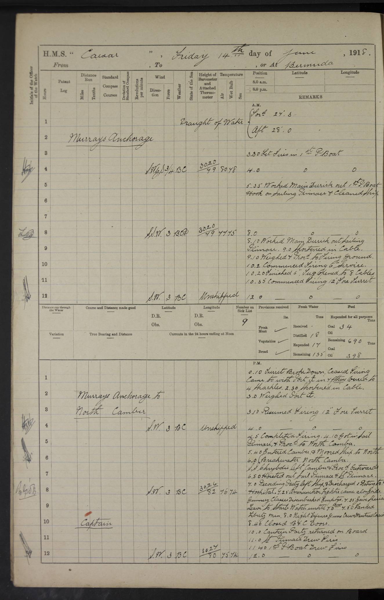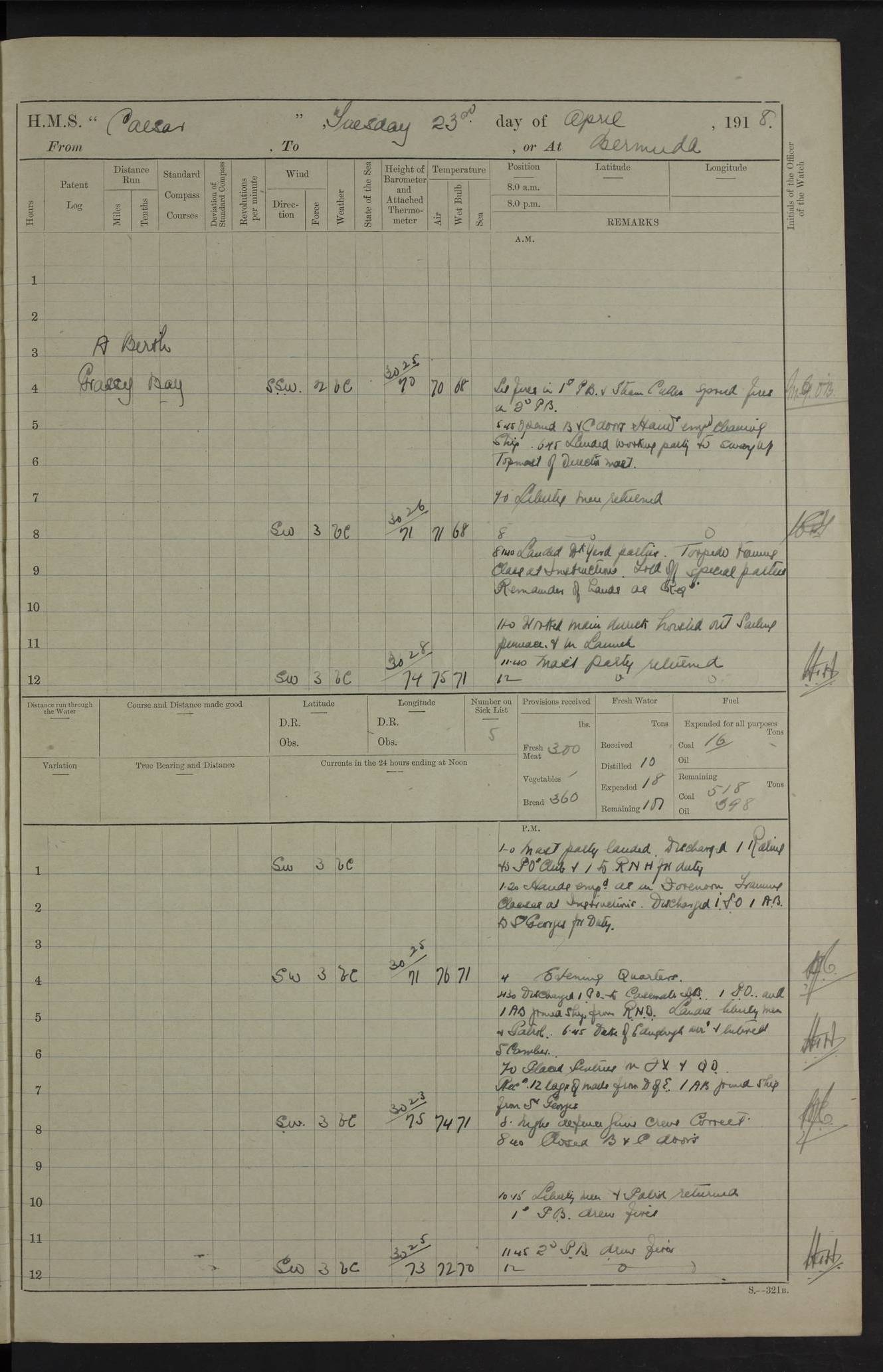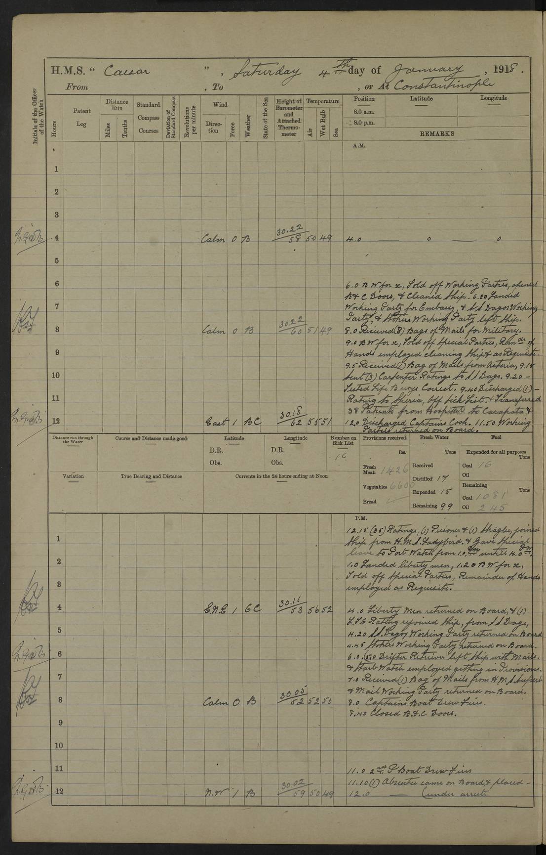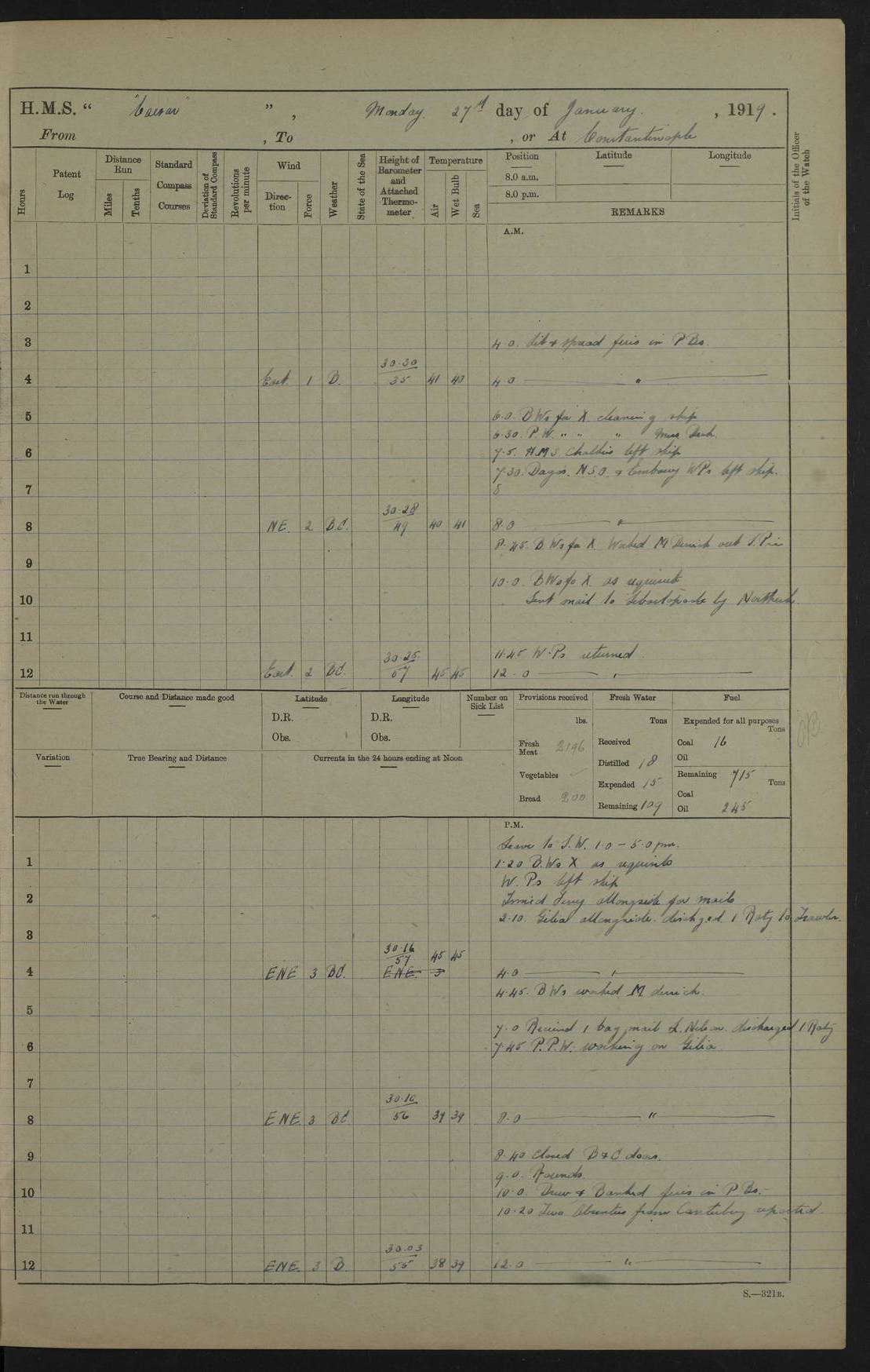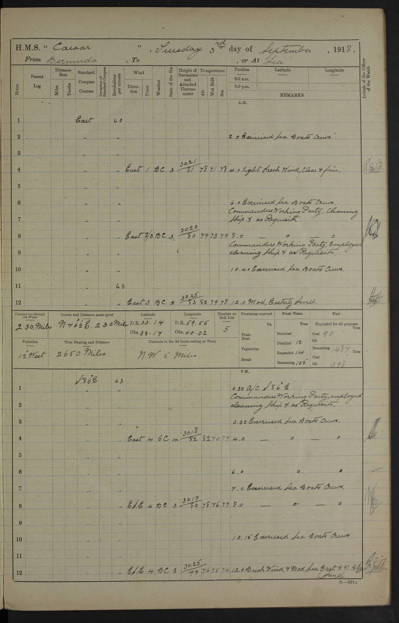 4caf84b6cadfd34197009939: (http://oldweather.s3.amazonaws.com/ADM53-36574/ADM 53-36574-145_1.jpg) 1 January 1917 At Bermuda Lat 32.32, Long -64.83 [Alongside Outer Camber Wall] 4.0am: Raised steam in first Picket boat. 6.0am: Employed cleaning ship. 7.0am: Landed Dockyard parties. Opened B, C doors. am: Employed drawing ammunition and stores, refitting and as requisite. 0.45pm: Paid monthly advance. pm: Employed as in forenoon. 4.30pm: Special leave to Starboard Watch till 7.0am. Landed patrol. 5.0pm: Dockyard parties returned. 6.30pm: Canteen leave to second part Port Watch till 10.0pm. 8.0pm: Night guns’ and search lights’ crews told off. 8.40pm: Closed B, C doors. 10.15pm: Patrol returned. 11.35pm: Drew fires in picket boats. [Number on sick list: 8] [Provisions received: Fresh Meat 340 lbs, Vegetables 2000 lbs, Bread 464 lbs] [Weather fine, though squally in early am. Noon temperature 63F] 4caf84b6cadfd3419700993a: (http://oldweather.s3.amazonaws.com/ADM53-36574/ADM 53-36574-146_0.jpg) 2 January 1917 [Year incorrectly shown as 1916] At Bermuda Lat 32.32, Long -64.83 [Alongside Outer Camber Wall] 4.30am: Raised steam in first picket boat. 6.30am: Landed working party to assist in repair of fenders in Inner Camber. 7.0am: Opened B, C doors. am: Employed embarking ammunition, refitting and as requisite. 11.45am: Working party returned. pm: Employed as in forenoon. 4.0pm: Quarters. 4.30pm: Special leave to Port Watch till 7.0am. Landed patrol. 6.30pm: Canteen leave to second part Starboard Watch till 10.0pm. 10.0pm: Patrol returned. 11.45pm: Drew fires in first picket boat. [Number on sick list: 8] [Provisions received: Fresh Meat 690 lbs, Bread 524 lbs] 4caf84b6cadfd3419700993b: (http://oldweather.s3.amazonaws.com/ADM53-36574/ADM 53-36574-146_1.jpg) 3 January 1917 [Year incorrectly shown as 1916] At Bermuda Lat 32.32, Long -64.83 [Alongside Outer Camber Wall] 7.0am: Opened B, C doors. Landed Dockyard parties. Sailed HMS “Antrim”. Landed Sanitary working party. am: Employed dismounting guns, drawing and returning stores, refitting and as requisite. Training class under instruction. 4.0pm: Quarters. Read Warrants No 268, 269. 4.30pm: Special leave to Starboard Watch till 7.0am. Landed patrol. 5.0pm: Dockyard and Working parties returned. 6.30pm: Canteen leave to first part Port Watch till 10.0pm. 8.5pm: Night guns’ and search lights’ crews told off. 10.0pm: Patrol returned. [Number on sick list: 8] [Provisions received: Fresh Meat 351 lbs, Vegetables 1000 lbs, Bread 512 lbs] 4caf84b6cadfd3419700993c: (http://oldweather.s3.amazonaws.com/ADM53-36574/ADM 53-36574-147_0.jpg) 4 January 1917 At Bermuda Lat 32.32, Long -64.83 [Alongside Outer Camber Wall] 7.0am: Landed Dockyard and Sanitary Working parties. am: Employed dismounting guns, sending up foretopmast, refitting and as requisite. Gunnery training class under instruction. 9.0am: Landed Working party to assist in repairs of fenders in Inner Camber. Discharged to SS “Kiakora” [probably Kaikoura] two ratings to form gun’s crew. 3.30pm: Working parties returned. 4.30pm: Special leave to Port Watch till 7.0am. Landed patrol. 6.30pm: Canteen leave to first part Starboard Watch till 10.0pm; 10.15pm: Patrol returned. [Number on sick list: 9] [Provisions received: Fresh Meat 353 lbs, Vegetables 1000 lbs, Bread 498 lbs] 4caf84b6cadfd3419700993d: (http://oldweather.s3.amazonaws.com/ADM53-36574/ADM 53-36574-147_1.jpg) 5 January 1917 At Bermuda Lat 32.32, Long -64.83 [Alongside Outer Camber Wall] 7.0am: Landed Dockyard and Sanitary Working parties. am: Employed refitting, dismounting guns and as requisite. Gunnery Training class under instruction. pm: Employed as in forenoon. 2.55pm: Arrived HMS “Antrim”. 4.30pm: Special leave to Starboard Watch till 7.0am. Landed patrol. 5.40pm: Drew fires in second picket boat. 6.30pm: Canteen leave to second part Port Watch till 10.0pm. 11.0pm: Patrol returned. 11.40pm: Drew fires in first picket boat. [Number on sick list: 9] [Provisions received: Fresh Meat 350 lbs, Vegetables 400 lbs, Bread 514 lbs] 4caf84b6cadfd3419700993e: (http://oldweather.s3.amazonaws.com/ADM53-36574/ADM 53-36574-148_0.jpg) 6 January 1917 At Bermuda Lat 32.32, Long -64.83 [Alongside Outer Camber Wall] 7.0am: Landed Dockyard parties. am: Employed cleaning ship, refitting, discharging ammunition from SS “Goodwood”, assisting in repairs to fenders of Inner Camber and as requisite. Training class under instruction. 11.45am: Dockyard parties returned. 0.30pm: Observed SS “Prophet” aground in Stag Channel. pm: Make and mend clothes. 1.30pm: Special leave to Port Watch till 7.0am and boys till 5.0pm. 3.0pm: SS “Prophet” refloated and proceeded to anchor. 4.0pm: Quarters. Read Warrant No 270. 4.30pm: Landed patrol. 5.0pm: Party employed discharging SS “Goodwood”. 6.30pm: Canteen leave to second part Starboard Watch till 10.0pm. 8.0pm: Night guns’ and search lights’ crews told off. 8.40pm: Closed B, C doors. 10.15pm: Patrol returned. [Number on sick list: 7] [Provisions received: Fresh Meat 361 lbs, Vegetables 2000 lbs, Bread 928 lbs] 4caf84b6cadfd3419700993f: (http://oldweather.s3.amazonaws.com/ADM53-36574/ADM 53-36574-148_1.jpg) 7 January 1917 At Bermuda Lat 32.32, Long -64.83 [Alongside Outer Camber Wall] 5.55am: Opened B, C doors. Employed cleaning ship. 8.30am: Landed Church parties, Presbyterians 18, Wesleyans 43, RCs 41. 9.30am: Divisions. 10.15am: Ship’s Company attended Divine Service at Dockyard Church. 11.20am: Church parties returned. 1.0pm: Special leave to Starboard Watch till 7.0am and boys will 5.0pm. 6.30pm: Canteen leave to first part Port Watch till 10.0pm. [Number on sick list: 8] [Weather fine, noon temperature 70F] 4caf84b6cadfd34197009940: (http://oldweather.s3.amazonaws.com/ADM53-36574/ADM 53-36574-149_0.jpg) 8 January 1917 At Bermuda Lat 32.32, Long -64.83 [Alongside Outer Camber Wall] 4.0am: Raised steam in first picket boat. 7.0am: Landed Dockyard parties. am: Employed dischargi