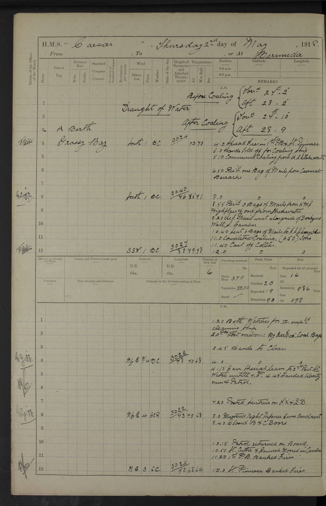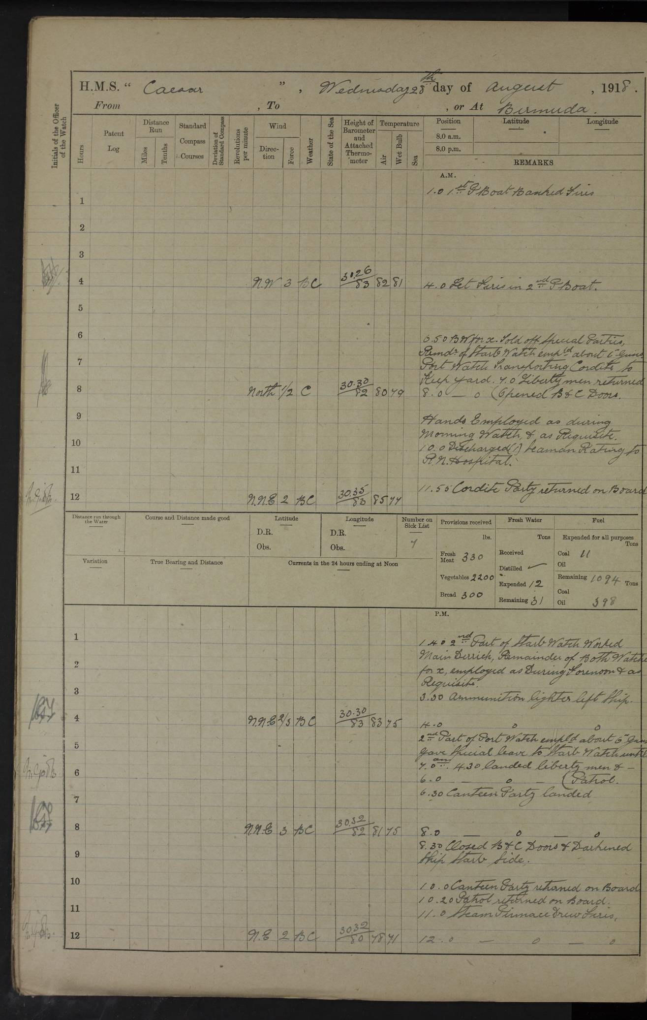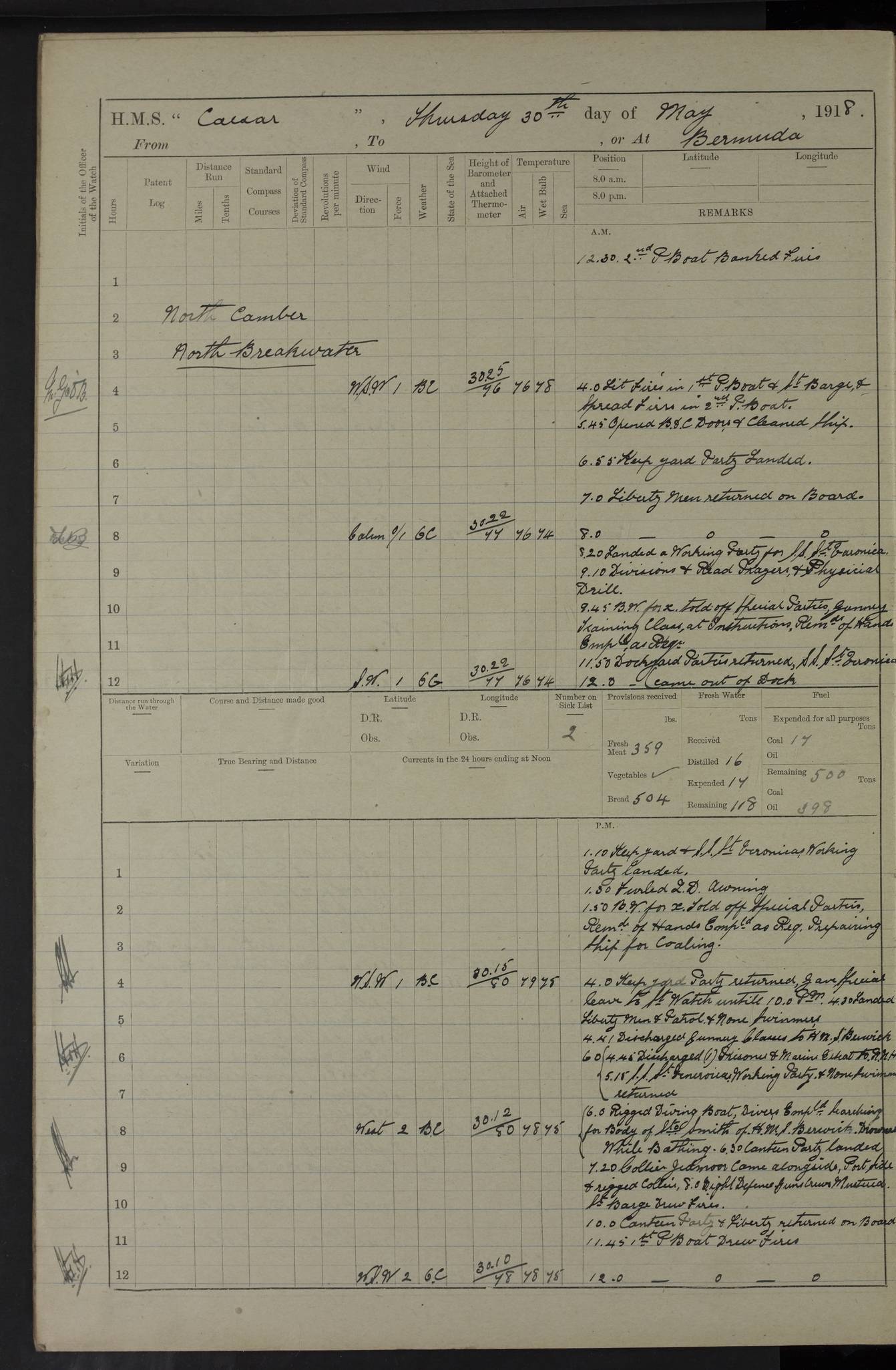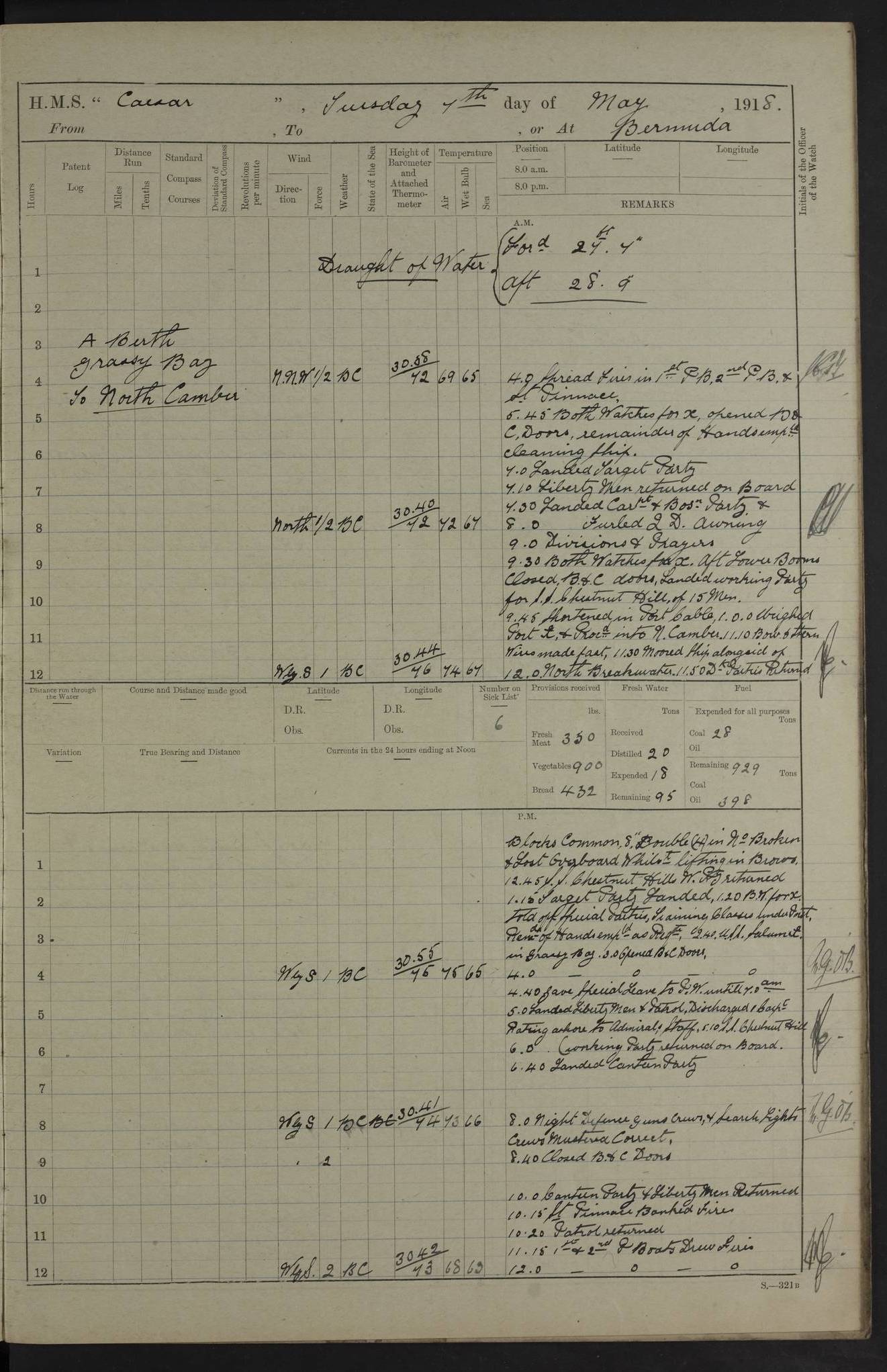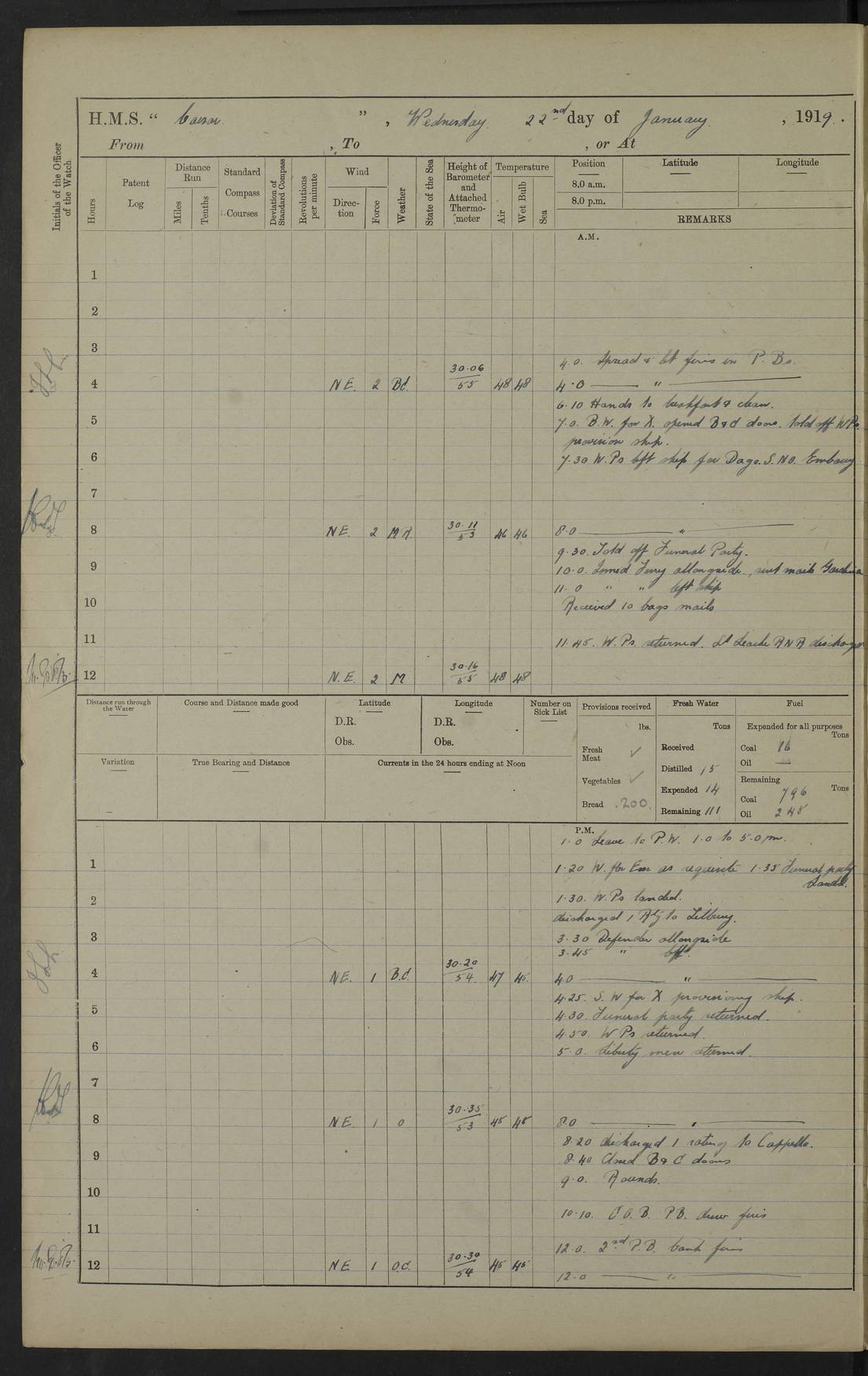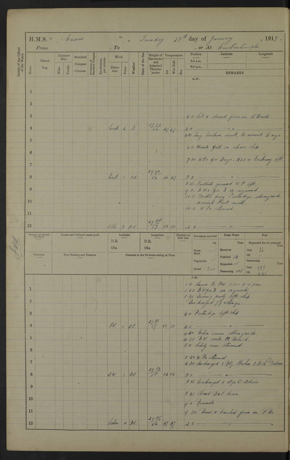 4caf84b6cadfd34197009939: (http://oldweather.s3.amazonaws.com/ADM53-36574/ADM 53-36574-145_1.jpg) 1 January 1917 At Bermuda Lat 32.32, Long -64.83 [Alongside Outer Camber Wall] 4.0am: Raised steam in first Picket boat. 6.0am: Employed cleaning ship. 7.0am: Landed Dockyard parties. Opened B, C doors. am: Employed drawing ammunition and stores, refitting and as requisite. 0.45pm: Paid monthly advance. pm: Employed as in forenoon. 4.30pm: Special leave to Starboard Watch till 7.0am. Landed patrol. 5.0pm: Dockyard parties returned. 6.30pm: Canteen leave to second part Port Watch till 10.0pm. 8.0pm: Night guns’ and search lights’ crews told off. 8.40pm: Closed B, C doors. 10.15pm: Patrol returned. 11.35pm: Drew fires in picket boats. [Number on sick list: 8] [Provisions received: Fresh Meat 340 lbs, Vegetables 2000 lbs, Bread 464 lbs] [Weather fine, though squally in early am. Noon temperature 63F] 4caf84b6cadfd3419700993a: (http://oldweather.s3.amazonaws.com/ADM53-36574/ADM 53-36574-146_0.jpg) 2 January 1917 [Year incorrectly shown as 1916] At Bermuda Lat 32.32, Long -64.83 [Alongside Outer Camber Wall] 4.30am: Raised steam in first picket boat. 6.30am: Landed working party to assist in repair of fenders in Inner Camber. 7.0am: Opened B, C doors. am: Employed embarking ammunition, refitting and as requisite. 11.45am: Working party returned. pm: Employed as in forenoon. 4.0pm: Quarters. 4.30pm: Special leave to Port Watch till 7.0am. Landed patrol. 6.30pm: Canteen leave to second part Starboard Watch till 10.0pm. 10.0pm: Patrol returned. 11.45pm: Drew fires in first picket boat. [Number on sick list: 8] [Provisions received: Fresh Meat 690 lbs, Bread 524 lbs] 4caf84b6cadfd3419700993b: (http://oldweather.s3.amazonaws.com/ADM53-36574/ADM 53-36574-146_1.jpg) 3 January 1917 [Year incorrectly shown as 1916] At Bermuda Lat 32.32, Long -64.83 [Alongside Outer Camber Wall] 7.0am: Opened B, C doors. Landed Dockyard parties. Sailed HMS “Antrim”. Landed Sanitary working party. am: Employed dismounting guns, drawing and returning stores, refitting and as requisite. Training class under instruction. 4.0pm: Quarters. Read Warrants No 268, 269. 4.30pm: Special leave to Starboard Watch till 7.0am. Landed patrol. 5.0pm: Dockyard and Working parties returned. 6.30pm: Canteen leave to first part Port Watch till 10.0pm. 8.5pm: Night guns’ and search lights’ crews told off. 10.0pm: Patrol returned. [Number on sick list: 8] [Provisions received: Fresh Meat 351 lbs, Vegetables 1000 lbs, Bread 512 lbs] 4caf84b6cadfd3419700993c: (http://oldweather.s3.amazonaws.com/ADM53-36574/ADM 53-36574-147_0.jpg) 4 January 1917 At Bermuda Lat 32.32, Long -64.83 [Alongside Outer Camber Wall] 7.0am: Landed Dockyard and Sanitary Working parties. am: Employed dismounting guns, sending up foretopmast, refitting and as requisite. Gunnery training class under instruction. 9.0am: Landed Working party to assist in repairs of fenders in Inner Camber. Discharged to SS “Kiakora” [probably Kaikoura] two ratings to form gun’s crew. 3.30pm: Working parties returned. 4.30pm: Special leave to Port Watch till 7.0am. Landed patrol. 6.30pm: Canteen leave to first part Starboard Watch till 10.0pm; 10.15pm: Patrol returned. [Number on sick list: 9] [Provisions received: Fresh Meat 353 lbs, Vegetables 1000 lbs, Bread 498 lbs] 4caf84b6cadfd3419700993d: (http://oldweather.s3.amazonaws.com/ADM53-36574/ADM 53-36574-147_1.jpg) 5 January 1917 At Bermuda Lat 32.32, Long -64.83 [Alongside Outer Camber Wall] 7.0am: Landed Dockyard and Sanitary Working parties. am: Employed refitting, dismounting guns and as requisite. Gunnery Training class under instruction. pm: Employed as in forenoon. 2.55pm: Arrived HMS “Antrim”. 4.30pm: Special leave to Starboard Watch till 7.0am. Landed patrol. 5.40pm: Drew fires in second picket boat. 6.30pm: Canteen leave to second part Port Watch till 10.0pm. 11.0pm: Patrol returned. 11.40pm: Drew fires in first picket boat. [Number on sick list: 9] [Provisions received: Fresh Meat 350 lbs, Vegetables 400 lbs, Bread 514 lbs] 4caf84b6cadfd3419700993e: (http://oldweather.s3.amazonaws.com/ADM53-36574/ADM 53-36574-148_0.jpg) 6 January 1917 At Bermuda Lat 32.32, Long -64.83 [Alongside Outer Camber Wall] 7.0am: Landed Dockyard parties. am: Employed cleaning ship, refitting, discharging ammunition from SS “Goodwood”, assisting in repairs to fenders of Inner Camber and as requisite. Training class under instruction. 11.45am: Dockyard parties returned. 0.30pm: Observed SS “Prophet” aground in Stag Channel. pm: Make and mend clothes. 1.30pm: Special leave to Port Watch till 7.0am and boys till 5.0pm. 3.0pm: SS “Prophet” refloated and proceeded to anchor. 4.0pm: Quarters. Read Warrant No 270. 4.30pm: Landed patrol. 5.0pm: Party employed discharging SS “Goodwood”. 6.30pm: Canteen leave to second part Starboard Watch till 10.0pm. 8.0pm: Night guns’ and search lights’ crews told off. 8.40pm: Closed B, C doors. 10.15pm: Patrol returned. [Number on sick list: 7] [Provisions received: Fresh Meat 361 lbs, Vegetables 2000 lbs, Bread 928 lbs] 4caf84b6cadfd3419700993f: (http://oldweather.s3.amazonaws.com/ADM53-36574/ADM 53-36574-148_1.jpg) 7 January 1917 At Bermuda Lat 32.32, Long -64.83 [Alongside Outer Camber Wall] 5.55am: Opened B, C doors. Employed cleaning ship. 8.30am: Landed Church parties, Presbyterians 18, Wesleyans 43, RCs 41. 9.30am: Divisions. 10.15am: Ship’s Company attended Divine Service at Dockyard Church. 11.20am: Church parties returned. 1.0pm: Special leave to Starboard Watch till 7.0am and boys will 5.0pm. 6.30pm: Canteen leave to first part Port Watch till 10.0pm. [Number on sick list: 8] [Weather fine, noon temperature 70F] 4caf84b6cadfd34197009940: (http://oldweather.s3.amazonaws.com/ADM53-36574/ADM 53-36574-149_0.jpg) 8 January 1917 At Bermuda Lat 32.32, Long -64.83 [Alongside Outer Camber Wall] 4.0am: Raised steam in first picket boat. 7.0am: Landed Dockyard parties. am: Employed dischargi