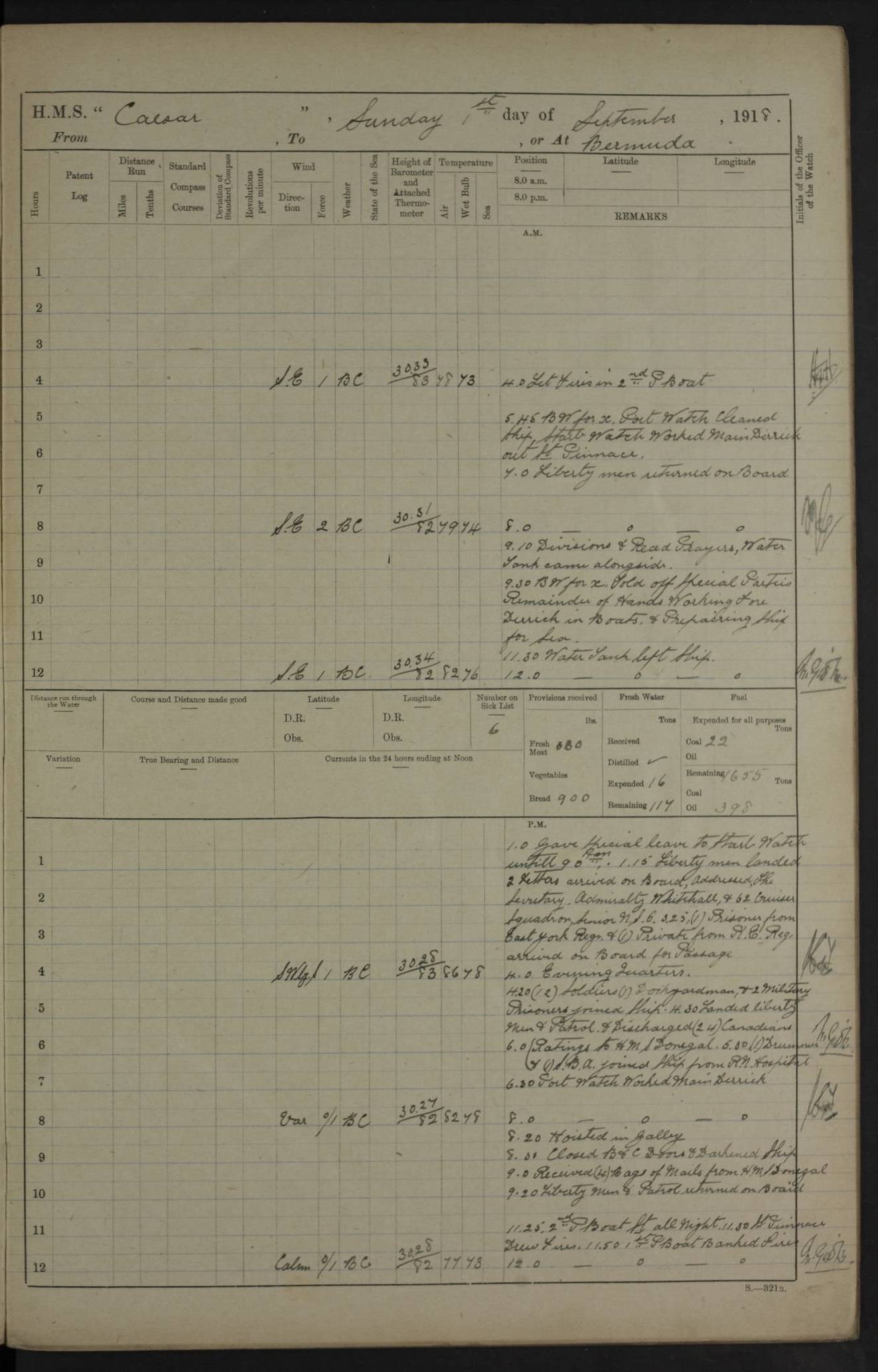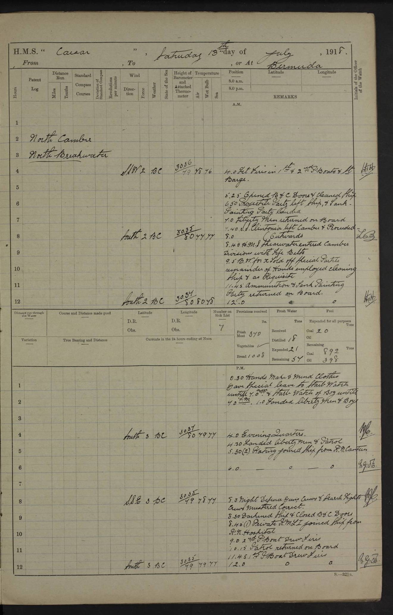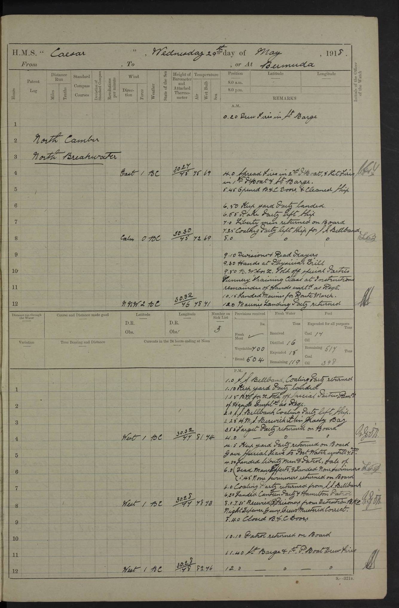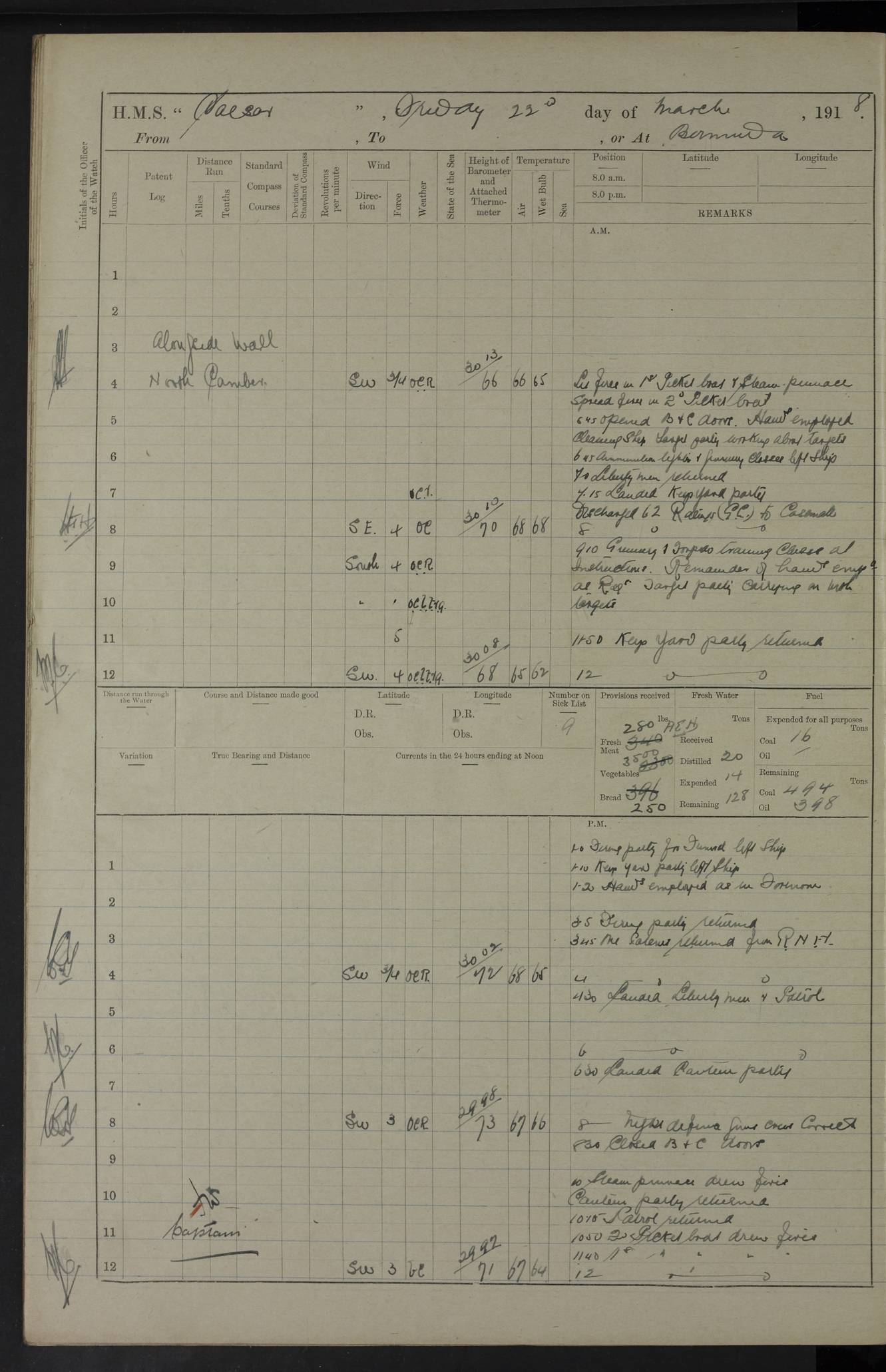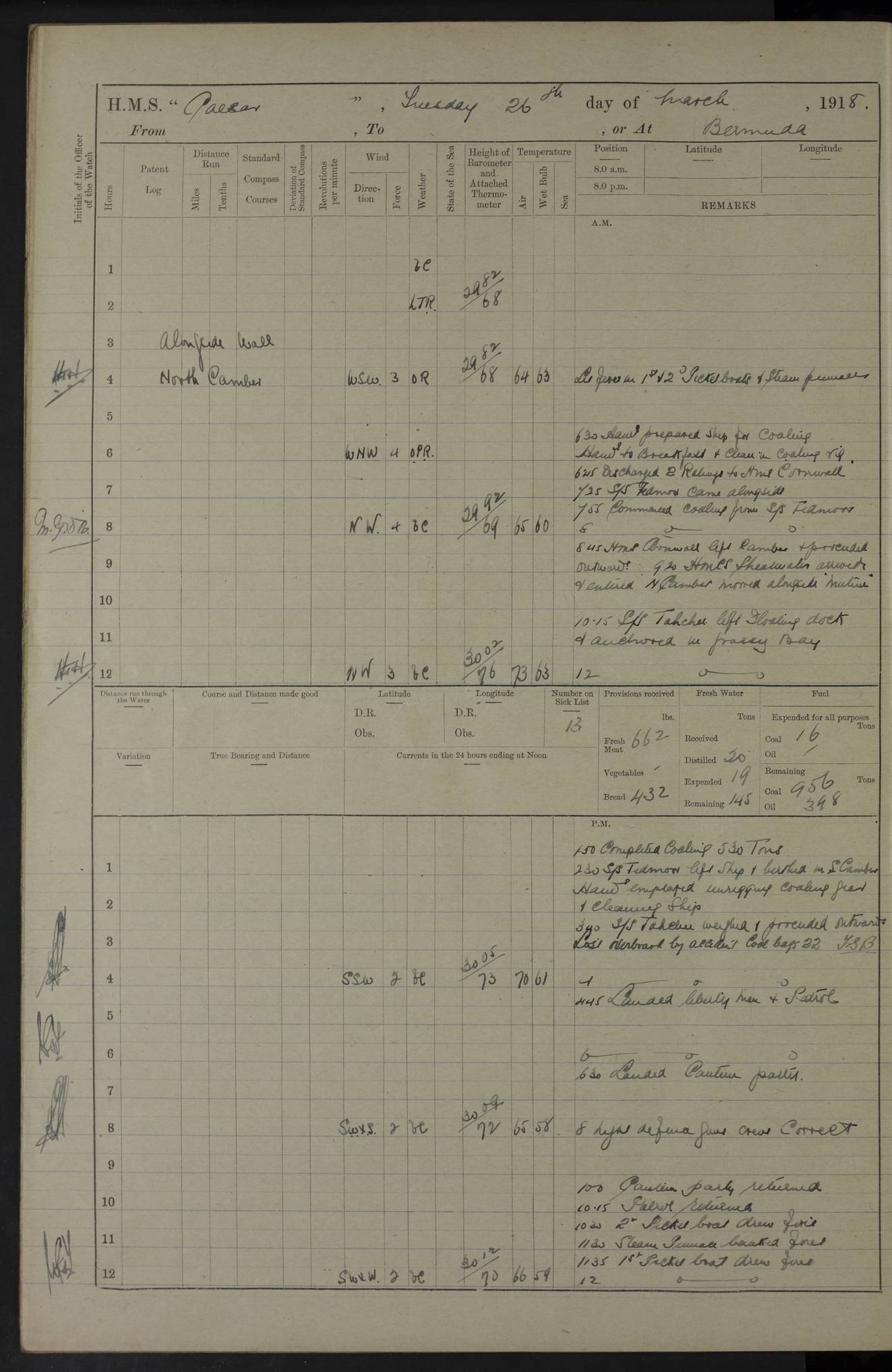 4caf84b6cadfd34197009939: (http://oldweather.s3.amazonaws.com/ADM53-36574/ADM 53-36574-145_1.jpg) 1 January 1917 At Bermuda Lat 32.32, Long -64.83 [Alongside Outer Camber Wall] 4.0am: Raised steam in first Picket boat. 6.0am: Employed cleaning ship. 7.0am: Landed Dockyard parties. Opened B, C doors. am: Employed drawing ammunition and stores, refitting and as requisite. 0.45pm: Paid monthly advance. pm: Employed as in forenoon. 4.30pm: Special leave to Starboard Watch till 7.0am. Landed patrol. 5.0pm: Dockyard parties returned. 6.30pm: Canteen leave to second part Port Watch till 10.0pm. 8.0pm: Night guns’ and search lights’ crews told off. 8.40pm: Closed B, C doors. 10.15pm: Patrol returned. 11.35pm: Drew fires in picket boats. [Number on sick list: 8] [Provisions received: Fresh Meat 340 lbs, Vegetables 2000 lbs, Bread 464 lbs] [Weather fine, though squally in early am. Noon temperature 63F] 4caf84b6cadfd3419700993a: (http://oldweather.s3.amazonaws.com/ADM53-36574/ADM 53-36574-146_0.jpg) 2 January 1917 [Year incorrectly shown as 1916] At Bermuda Lat 32.32, Long -64.83 [Alongside Outer Camber Wall] 4.30am: Raised steam in first picket boat. 6.30am: Landed working party to assist in repair of fenders in Inner Camber. 7.0am: Opened B, C doors. am: Employed embarking ammunition, refitting and as requisite. 11.45am: Working party returned. pm: Employed as in forenoon. 4.0pm: Quarters. 4.30pm: Special leave to Port Watch till 7.0am. Landed patrol. 6.30pm: Canteen leave to second part Starboard Watch till 10.0pm. 10.0pm: Patrol returned. 11.45pm: Drew fires in first picket boat. [Number on sick list: 8] [Provisions received: Fresh Meat 690 lbs, Bread 524 lbs] 4caf84b6cadfd3419700993b: (http://oldweather.s3.amazonaws.com/ADM53-36574/ADM 53-36574-146_1.jpg) 3 January 1917 [Year incorrectly shown as 1916] At Bermuda Lat 32.32, Long -64.83 [Alongside Outer Camber Wall] 7.0am: Opened B, C doors. Landed Dockyard parties. Sailed HMS “Antrim”. Landed Sanitary working party. am: Employed dismounting guns, drawing and returning stores, refitting and as requisite. Training class under instruction. 4.0pm: Quarters. Read Warrants No 268, 269. 4.30pm: Special leave to Starboard Watch till 7.0am. Landed patrol. 5.0pm: Dockyard and Working parties returned. 6.30pm: Canteen leave to first part Port Watch till 10.0pm. 8.5pm: Night guns’ and search lights’ crews told off. 10.0pm: Patrol returned. [Number on sick list: 8] [Provisions received: Fresh Meat 351 lbs, Vegetables 1000 lbs, Bread 512 lbs] 4caf84b6cadfd3419700993c: (http://oldweather.s3.amazonaws.com/ADM53-36574/ADM 53-36574-147_0.jpg) 4 January 1917 At Bermuda Lat 32.32, Long -64.83 [Alongside Outer Camber Wall] 7.0am: Landed Dockyard and Sanitary Working parties. am: Employed dismounting guns, sending up foretopmast, refitting and as requisite. Gunnery training class under instruction. 9.0am: Landed Working party to assist in repairs of fenders in Inner Camber. Discharged to SS “Kiakora” [probably Kaikoura] two ratings to form gun’s crew. 3.30pm: Working parties returned. 4.30pm: Special leave to Port Watch till 7.0am. Landed patrol. 6.30pm: Canteen leave to first part Starboard Watch till 10.0pm; 10.15pm: Patrol returned. [Number on sick list: 9] [Provisions received: Fresh Meat 353 lbs, Vegetables 1000 lbs, Bread 498 lbs] 4caf84b6cadfd3419700993d: (http://oldweather.s3.amazonaws.com/ADM53-36574/ADM 53-36574-147_1.jpg) 5 January 1917 At Bermuda Lat 32.32, Long -64.83 [Alongside Outer Camber Wall] 7.0am: Landed Dockyard and Sanitary Working parties. am: Employed refitting, dismounting guns and as requisite. Gunnery Training class under instruction. pm: Employed as in forenoon. 2.55pm: Arrived HMS “Antrim”. 4.30pm: Special leave to Starboard Watch till 7.0am. Landed patrol. 5.40pm: Drew fires in second picket boat. 6.30pm: Canteen leave to second part Port Watch till 10.0pm. 11.0pm: Patrol returned. 11.40pm: Drew fires in first picket boat. [Number on sick list: 9] [Provisions received: Fresh Meat 350 lbs, Vegetables 400 lbs, Bread 514 lbs] 4caf84b6cadfd3419700993e: (http://oldweather.s3.amazonaws.com/ADM53-36574/ADM 53-36574-148_0.jpg) 6 January 1917 At Bermuda Lat 32.32, Long -64.83 [Alongside Outer Camber Wall] 7.0am: Landed Dockyard parties. am: Employed cleaning ship, refitting, discharging ammunition from SS “Goodwood”, assisting in repairs to fenders of Inner Camber and as requisite. Training class under instruction. 11.45am: Dockyard parties returned. 0.30pm: Observed SS “Prophet” aground in Stag Channel. pm: Make and mend clothes. 1.30pm: Special leave to Port Watch till 7.0am and boys till 5.0pm. 3.0pm: SS “Prophet” refloated and proceeded to anchor. 4.0pm: Quarters. Read Warrant No 270. 4.30pm: Landed patrol. 5.0pm: Party employed discharging SS “Goodwood”. 6.30pm: Canteen leave to second part Starboard Watch till 10.0pm. 8.0pm: Night guns’ and search lights’ crews told off. 8.40pm: Closed B, C doors. 10.15pm: Patrol returned. [Number on sick list: 7] [Provisions received: Fresh Meat 361 lbs, Vegetables 2000 lbs, Bread 928 lbs] 4caf84b6cadfd3419700993f: (http://oldweather.s3.amazonaws.com/ADM53-36574/ADM 53-36574-148_1.jpg) 7 January 1917 At Bermuda Lat 32.32, Long -64.83 [Alongside Outer Camber Wall] 5.55am: Opened B, C doors. Employed cleaning ship. 8.30am: Landed Church parties, Presbyterians 18, Wesleyans 43, RCs 41. 9.30am: Divisions. 10.15am: Ship’s Company attended Divine Service at Dockyard Church. 11.20am: Church parties returned. 1.0pm: Special leave to Starboard Watch till 7.0am and boys will 5.0pm. 6.30pm: Canteen leave to first part Port Watch till 10.0pm. [Number on sick list: 8] [Weather fine, noon temperature 70F] 4caf84b6cadfd34197009940: (http://oldweather.s3.amazonaws.com/ADM53-36574/ADM 53-36574-149_0.jpg) 8 January 1917 At Bermuda Lat 32.32, Long -64.83 [Alongside Outer Camber Wall] 4.0am: Raised steam in first picket boat. 7.0am: Landed Dockyard parties. am: Employed dischargi