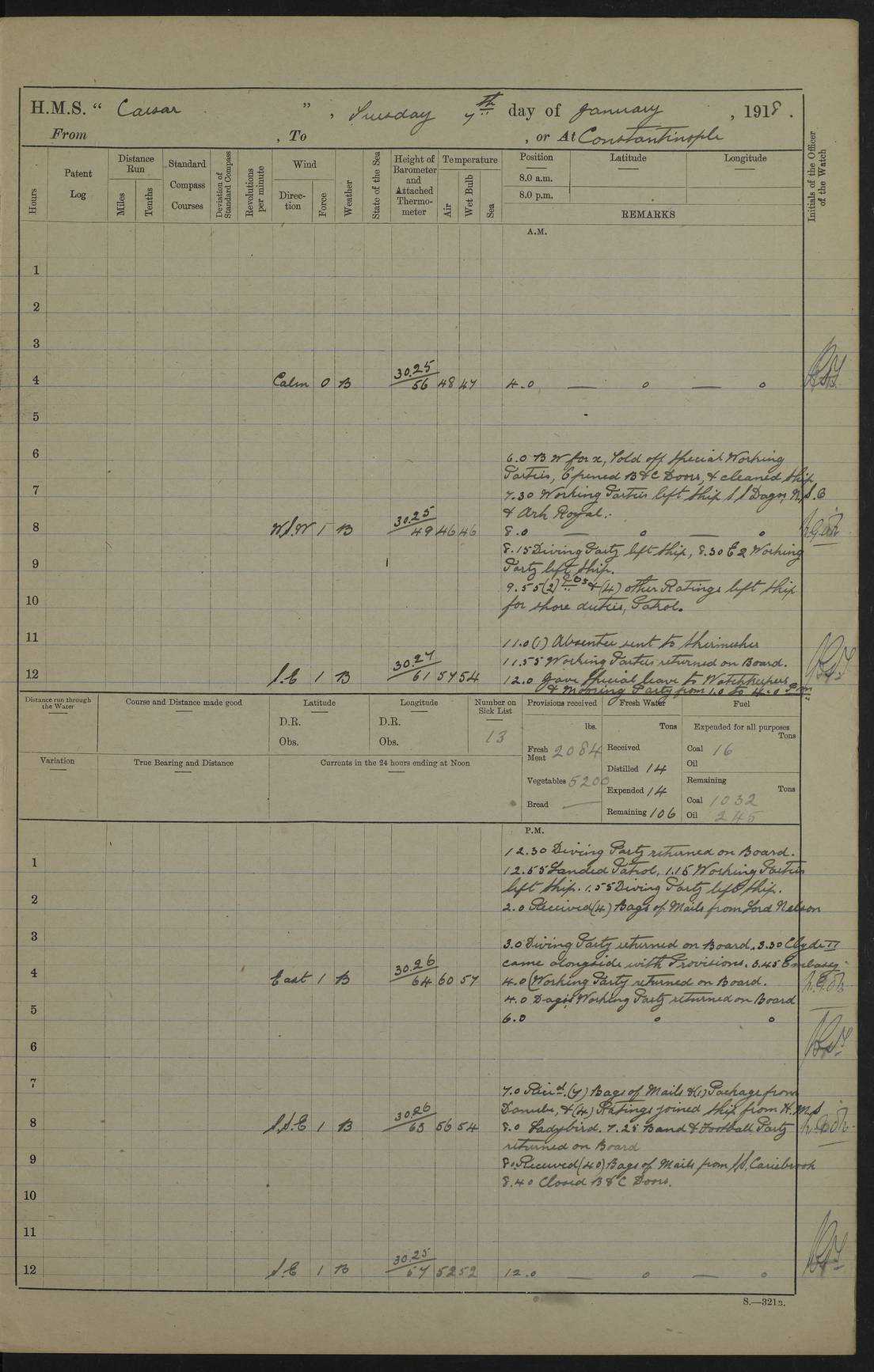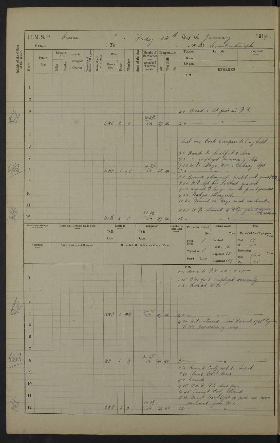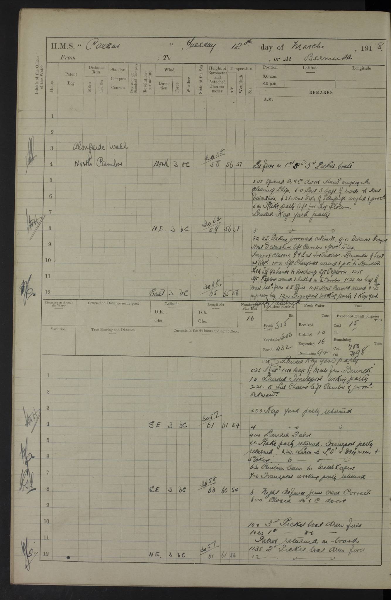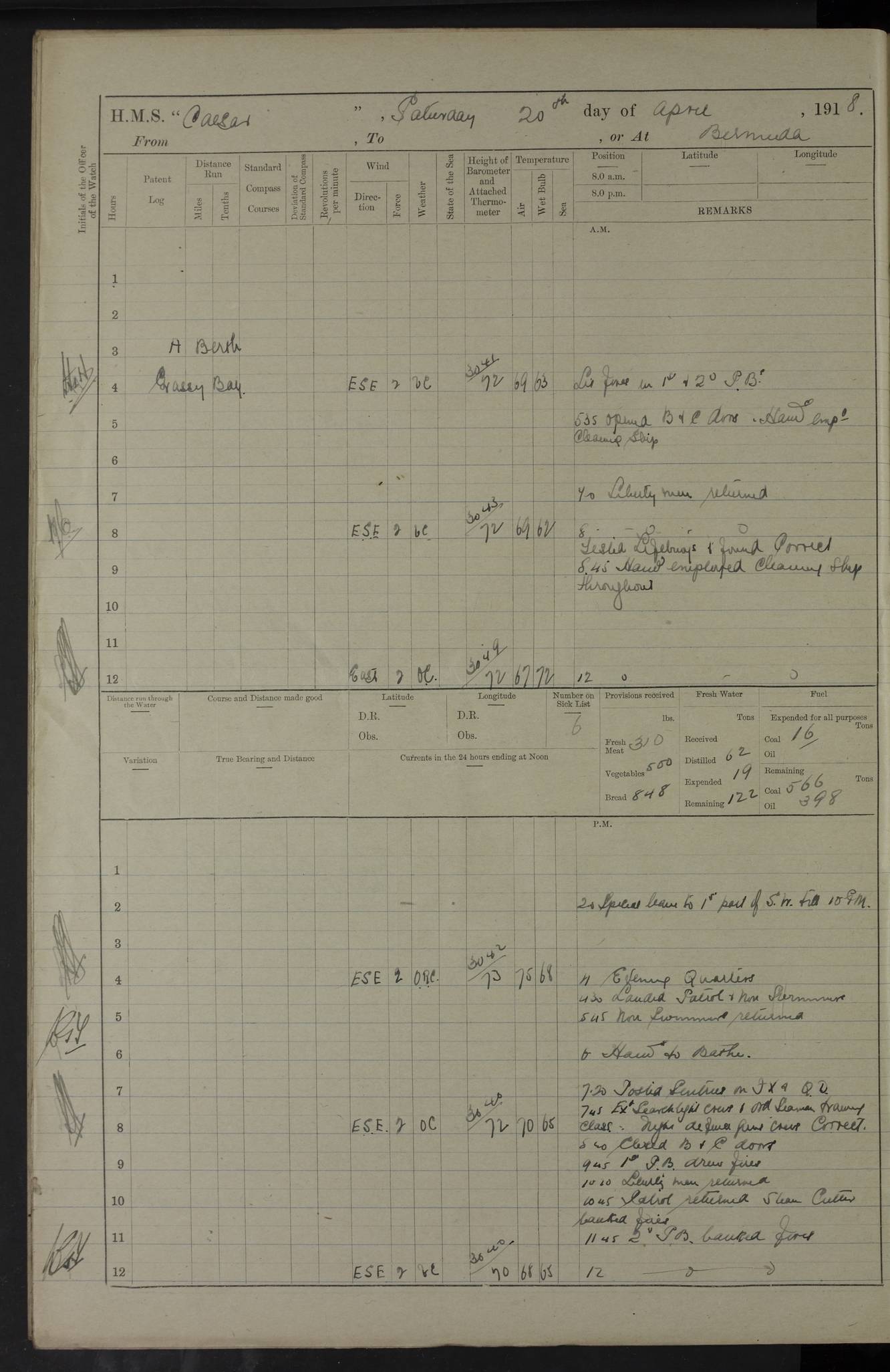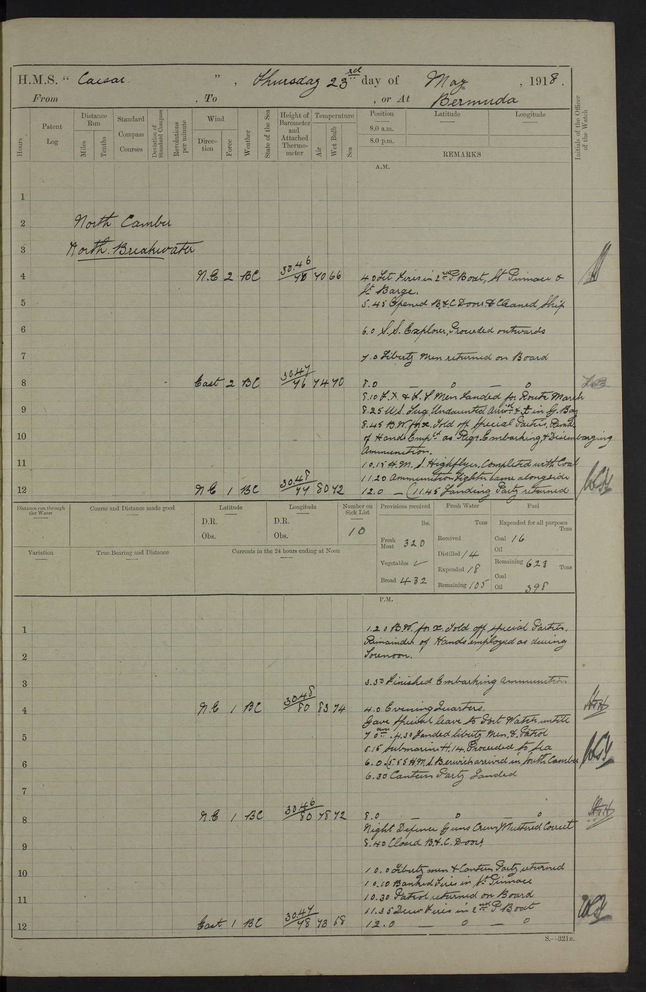 4caf84b6cadfd34197009939: (http://oldweather.s3.amazonaws.com/ADM53-36574/ADM 53-36574-145_1.jpg) 1 January 1917 At Bermuda Lat 32.32, Long -64.83 [Alongside Outer Camber Wall] 4.0am: Raised steam in first Picket boat. 6.0am: Employed cleaning ship. 7.0am: Landed Dockyard parties. Opened B, C doors. am: Employed drawing ammunition and stores, refitting and as requisite. 0.45pm: Paid monthly advance. pm: Employed as in forenoon. 4.30pm: Special leave to Starboard Watch till 7.0am. Landed patrol. 5.0pm: Dockyard parties returned. 6.30pm: Canteen leave to second part Port Watch till 10.0pm. 8.0pm: Night guns’ and search lights’ crews told off. 8.40pm: Closed B, C doors. 10.15pm: Patrol returned. 11.35pm: Drew fires in picket boats. [Number on sick list: 8] [Provisions received: Fresh Meat 340 lbs, Vegetables 2000 lbs, Bread 464 lbs] [Weather fine, though squally in early am. Noon temperature 63F] 4caf84b6cadfd3419700993a: (http://oldweather.s3.amazonaws.com/ADM53-36574/ADM 53-36574-146_0.jpg) 2 January 1917 [Year incorrectly shown as 1916] At Bermuda Lat 32.32, Long -64.83 [Alongside Outer Camber Wall] 4.30am: Raised steam in first picket boat. 6.30am: Landed working party to assist in repair of fenders in Inner Camber. 7.0am: Opened B, C doors. am: Employed embarking ammunition, refitting and as requisite. 11.45am: Working party returned. pm: Employed as in forenoon. 4.0pm: Quarters. 4.30pm: Special leave to Port Watch till 7.0am. Landed patrol. 6.30pm: Canteen leave to second part Starboard Watch till 10.0pm. 10.0pm: Patrol returned. 11.45pm: Drew fires in first picket boat. [Number on sick list: 8] [Provisions received: Fresh Meat 690 lbs, Bread 524 lbs] 4caf84b6cadfd3419700993b: (http://oldweather.s3.amazonaws.com/ADM53-36574/ADM 53-36574-146_1.jpg) 3 January 1917 [Year incorrectly shown as 1916] At Bermuda Lat 32.32, Long -64.83 [Alongside Outer Camber Wall] 7.0am: Opened B, C doors. Landed Dockyard parties. Sailed HMS “Antrim”. Landed Sanitary working party. am: Employed dismounting guns, drawing and returning stores, refitting and as requisite. Training class under instruction. 4.0pm: Quarters. Read Warrants No 268, 269. 4.30pm: Special leave to Starboard Watch till 7.0am. Landed patrol. 5.0pm: Dockyard and Working parties returned. 6.30pm: Canteen leave to first part Port Watch till 10.0pm. 8.5pm: Night guns’ and search lights’ crews told off. 10.0pm: Patrol returned. [Number on sick list: 8] [Provisions received: Fresh Meat 351 lbs, Vegetables 1000 lbs, Bread 512 lbs] 4caf84b6cadfd3419700993c: (http://oldweather.s3.amazonaws.com/ADM53-36574/ADM 53-36574-147_0.jpg) 4 January 1917 At Bermuda Lat 32.32, Long -64.83 [Alongside Outer Camber Wall] 7.0am: Landed Dockyard and Sanitary Working parties. am: Employed dismounting guns, sending up foretopmast, refitting and as requisite. Gunnery training class under instruction. 9.0am: Landed Working party to assist in repairs of fenders in Inner Camber. Discharged to SS “Kiakora” [probably Kaikoura] two ratings to form gun’s crew. 3.30pm: Working parties returned. 4.30pm: Special leave to Port Watch till 7.0am. Landed patrol. 6.30pm: Canteen leave to first part Starboard Watch till 10.0pm; 10.15pm: Patrol returned. [Number on sick list: 9] [Provisions received: Fresh Meat 353 lbs, Vegetables 1000 lbs, Bread 498 lbs] 4caf84b6cadfd3419700993d: (http://oldweather.s3.amazonaws.com/ADM53-36574/ADM 53-36574-147_1.jpg) 5 January 1917 At Bermuda Lat 32.32, Long -64.83 [Alongside Outer Camber Wall] 7.0am: Landed Dockyard and Sanitary Working parties. am: Employed refitting, dismounting guns and as requisite. Gunnery Training class under instruction. pm: Employed as in forenoon. 2.55pm: Arrived HMS “Antrim”. 4.30pm: Special leave to Starboard Watch till 7.0am. Landed patrol. 5.40pm: Drew fires in second picket boat. 6.30pm: Canteen leave to second part Port Watch till 10.0pm. 11.0pm: Patrol returned. 11.40pm: Drew fires in first picket boat. [Number on sick list: 9] [Provisions received: Fresh Meat 350 lbs, Vegetables 400 lbs, Bread 514 lbs] 4caf84b6cadfd3419700993e: (http://oldweather.s3.amazonaws.com/ADM53-36574/ADM 53-36574-148_0.jpg) 6 January 1917 At Bermuda Lat 32.32, Long -64.83 [Alongside Outer Camber Wall] 7.0am: Landed Dockyard parties. am: Employed cleaning ship, refitting, discharging ammunition from SS “Goodwood”, assisting in repairs to fenders of Inner Camber and as requisite. Training class under instruction. 11.45am: Dockyard parties returned. 0.30pm: Observed SS “Prophet” aground in Stag Channel. pm: Make and mend clothes. 1.30pm: Special leave to Port Watch till 7.0am and boys till 5.0pm. 3.0pm: SS “Prophet” refloated and proceeded to anchor. 4.0pm: Quarters. Read Warrant No 270. 4.30pm: Landed patrol. 5.0pm: Party employed discharging SS “Goodwood”. 6.30pm: Canteen leave to second part Starboard Watch till 10.0pm. 8.0pm: Night guns’ and search lights’ crews told off. 8.40pm: Closed B, C doors. 10.15pm: Patrol returned. [Number on sick list: 7] [Provisions received: Fresh Meat 361 lbs, Vegetables 2000 lbs, Bread 928 lbs] 4caf84b6cadfd3419700993f: (http://oldweather.s3.amazonaws.com/ADM53-36574/ADM 53-36574-148_1.jpg) 7 January 1917 At Bermuda Lat 32.32, Long -64.83 [Alongside Outer Camber Wall] 5.55am: Opened B, C doors. Employed cleaning ship. 8.30am: Landed Church parties, Presbyterians 18, Wesleyans 43, RCs 41. 9.30am: Divisions. 10.15am: Ship’s Company attended Divine Service at Dockyard Church. 11.20am: Church parties returned. 1.0pm: Special leave to Starboard Watch till 7.0am and boys will 5.0pm. 6.30pm: Canteen leave to first part Port Watch till 10.0pm. [Number on sick list: 8] [Weather fine, noon temperature 70F] 4caf84b6cadfd34197009940: (http://oldweather.s3.amazonaws.com/ADM53-36574/ADM 53-36574-149_0.jpg) 8 January 1917 At Bermuda Lat 32.32, Long -64.83 [Alongside Outer Camber Wall] 4.0am: Raised steam in first picket boat. 7.0am: Landed Dockyard parties. am: Employed dischargi