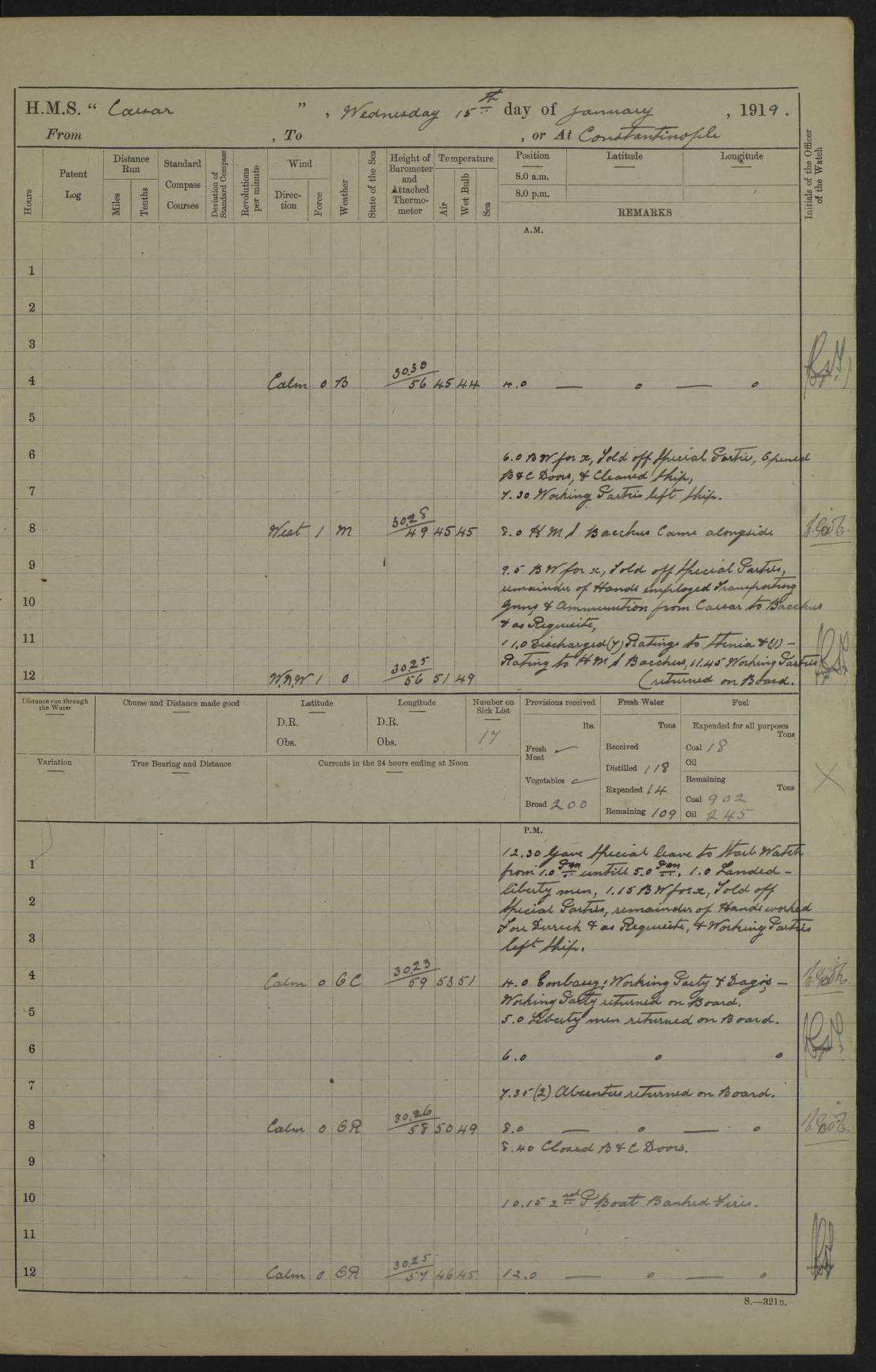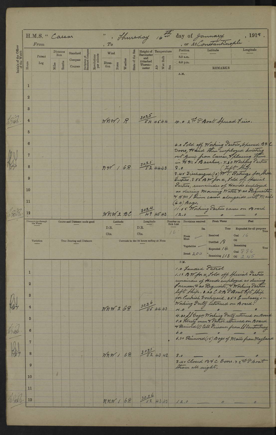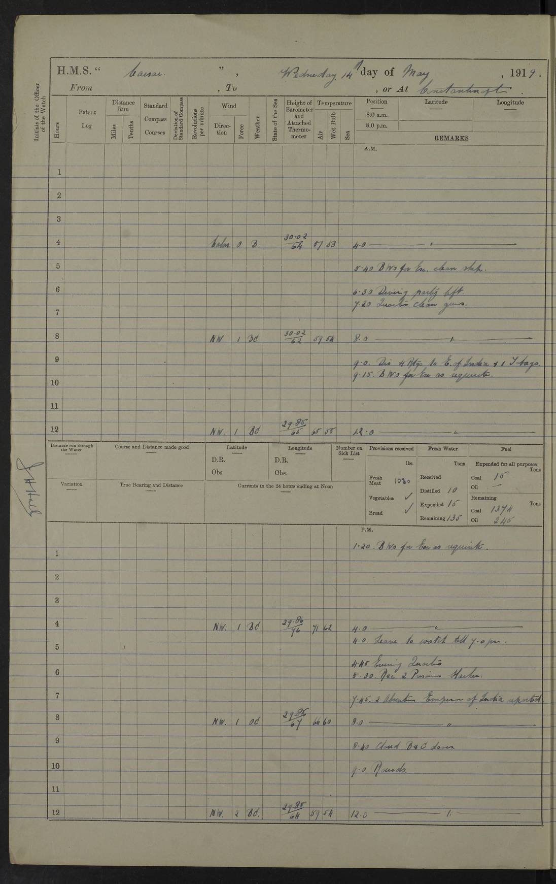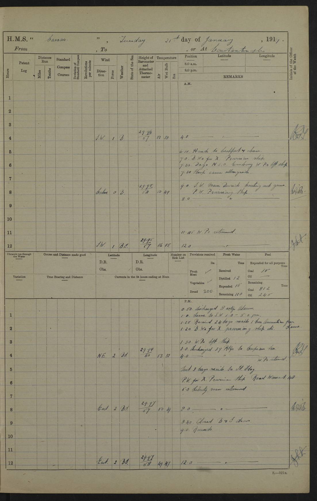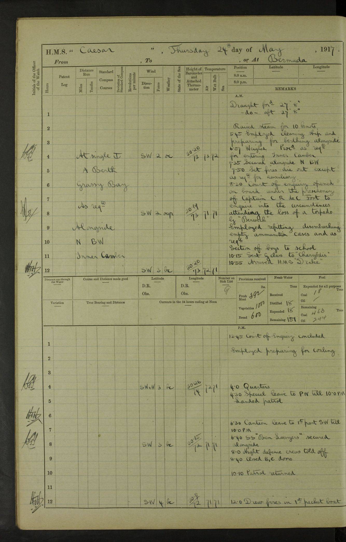 4caf84b6cadfd34197009939: (http://oldweather.s3.amazonaws.com/ADM53-36574/ADM 53-36574-145_1.jpg) 1 January 1917 At Bermuda Lat 32.32, Long -64.83 [Alongside Outer Camber Wall] 4.0am: Raised steam in first Picket boat. 6.0am: Employed cleaning ship. 7.0am: Landed Dockyard parties. Opened B, C doors. am: Employed drawing ammunition and stores, refitting and as requisite. 0.45pm: Paid monthly advance. pm: Employed as in forenoon. 4.30pm: Special leave to Starboard Watch till 7.0am. Landed patrol. 5.0pm: Dockyard parties returned. 6.30pm: Canteen leave to second part Port Watch till 10.0pm. 8.0pm: Night guns’ and search lights’ crews told off. 8.40pm: Closed B, C doors. 10.15pm: Patrol returned. 11.35pm: Drew fires in picket boats. [Number on sick list: 8] [Provisions received: Fresh Meat 340 lbs, Vegetables 2000 lbs, Bread 464 lbs] [Weather fine, though squally in early am. Noon temperature 63F] 4caf84b6cadfd3419700993a: (http://oldweather.s3.amazonaws.com/ADM53-36574/ADM 53-36574-146_0.jpg) 2 January 1917 [Year incorrectly shown as 1916] At Bermuda Lat 32.32, Long -64.83 [Alongside Outer Camber Wall] 4.30am: Raised steam in first picket boat. 6.30am: Landed working party to assist in repair of fenders in Inner Camber. 7.0am: Opened B, C doors. am: Employed embarking ammunition, refitting and as requisite. 11.45am: Working party returned. pm: Employed as in forenoon. 4.0pm: Quarters. 4.30pm: Special leave to Port Watch till 7.0am. Landed patrol. 6.30pm: Canteen leave to second part Starboard Watch till 10.0pm. 10.0pm: Patrol returned. 11.45pm: Drew fires in first picket boat. [Number on sick list: 8] [Provisions received: Fresh Meat 690 lbs, Bread 524 lbs] 4caf84b6cadfd3419700993b: (http://oldweather.s3.amazonaws.com/ADM53-36574/ADM 53-36574-146_1.jpg) 3 January 1917 [Year incorrectly shown as 1916] At Bermuda Lat 32.32, Long -64.83 [Alongside Outer Camber Wall] 7.0am: Opened B, C doors. Landed Dockyard parties. Sailed HMS “Antrim”. Landed Sanitary working party. am: Employed dismounting guns, drawing and returning stores, refitting and as requisite. Training class under instruction. 4.0pm: Quarters. Read Warrants No 268, 269. 4.30pm: Special leave to Starboard Watch till 7.0am. Landed patrol. 5.0pm: Dockyard and Working parties returned. 6.30pm: Canteen leave to first part Port Watch till 10.0pm. 8.5pm: Night guns’ and search lights’ crews told off. 10.0pm: Patrol returned. [Number on sick list: 8] [Provisions received: Fresh Meat 351 lbs, Vegetables 1000 lbs, Bread 512 lbs] 4caf84b6cadfd3419700993c: (http://oldweather.s3.amazonaws.com/ADM53-36574/ADM 53-36574-147_0.jpg) 4 January 1917 At Bermuda Lat 32.32, Long -64.83 [Alongside Outer Camber Wall] 7.0am: Landed Dockyard and Sanitary Working parties. am: Employed dismounting guns, sending up foretopmast, refitting and as requisite. Gunnery training class under instruction. 9.0am: Landed Working party to assist in repairs of fenders in Inner Camber. Discharged to SS “Kiakora” [probably Kaikoura] two ratings to form gun’s crew. 3.30pm: Working parties returned. 4.30pm: Special leave to Port Watch till 7.0am. Landed patrol. 6.30pm: Canteen leave to first part Starboard Watch till 10.0pm; 10.15pm: Patrol returned. [Number on sick list: 9] [Provisions received: Fresh Meat 353 lbs, Vegetables 1000 lbs, Bread 498 lbs] 4caf84b6cadfd3419700993d: (http://oldweather.s3.amazonaws.com/ADM53-36574/ADM 53-36574-147_1.jpg) 5 January 1917 At Bermuda Lat 32.32, Long -64.83 [Alongside Outer Camber Wall] 7.0am: Landed Dockyard and Sanitary Working parties. am: Employed refitting, dismounting guns and as requisite. Gunnery Training class under instruction. pm: Employed as in forenoon. 2.55pm: Arrived HMS “Antrim”. 4.30pm: Special leave to Starboard Watch till 7.0am. Landed patrol. 5.40pm: Drew fires in second picket boat. 6.30pm: Canteen leave to second part Port Watch till 10.0pm. 11.0pm: Patrol returned. 11.40pm: Drew fires in first picket boat. [Number on sick list: 9] [Provisions received: Fresh Meat 350 lbs, Vegetables 400 lbs, Bread 514 lbs] 4caf84b6cadfd3419700993e: (http://oldweather.s3.amazonaws.com/ADM53-36574/ADM 53-36574-148_0.jpg) 6 January 1917 At Bermuda Lat 32.32, Long -64.83 [Alongside Outer Camber Wall] 7.0am: Landed Dockyard parties. am: Employed cleaning ship, refitting, discharging ammunition from SS “Goodwood”, assisting in repairs to fenders of Inner Camber and as requisite. Training class under instruction. 11.45am: Dockyard parties returned. 0.30pm: Observed SS “Prophet” aground in Stag Channel. pm: Make and mend clothes. 1.30pm: Special leave to Port Watch till 7.0am and boys till 5.0pm. 3.0pm: SS “Prophet” refloated and proceeded to anchor. 4.0pm: Quarters. Read Warrant No 270. 4.30pm: Landed patrol. 5.0pm: Party employed discharging SS “Goodwood”. 6.30pm: Canteen leave to second part Starboard Watch till 10.0pm. 8.0pm: Night guns’ and search lights’ crews told off. 8.40pm: Closed B, C doors. 10.15pm: Patrol returned. [Number on sick list: 7] [Provisions received: Fresh Meat 361 lbs, Vegetables 2000 lbs, Bread 928 lbs] 4caf84b6cadfd3419700993f: (http://oldweather.s3.amazonaws.com/ADM53-36574/ADM 53-36574-148_1.jpg) 7 January 1917 At Bermuda Lat 32.32, Long -64.83 [Alongside Outer Camber Wall] 5.55am: Opened B, C doors. Employed cleaning ship. 8.30am: Landed Church parties, Presbyterians 18, Wesleyans 43, RCs 41. 9.30am: Divisions. 10.15am: Ship’s Company attended Divine Service at Dockyard Church. 11.20am: Church parties returned. 1.0pm: Special leave to Starboard Watch till 7.0am and boys will 5.0pm. 6.30pm: Canteen leave to first part Port Watch till 10.0pm. [Number on sick list: 8] [Weather fine, noon temperature 70F] 4caf84b6cadfd34197009940: (http://oldweather.s3.amazonaws.com/ADM53-36574/ADM 53-36574-149_0.jpg) 8 January 1917 At Bermuda Lat 32.32, Long -64.83 [Alongside Outer Camber Wall] 4.0am: Raised steam in first picket boat. 7.0am: Landed Dockyard parties. am: Employed dischargi