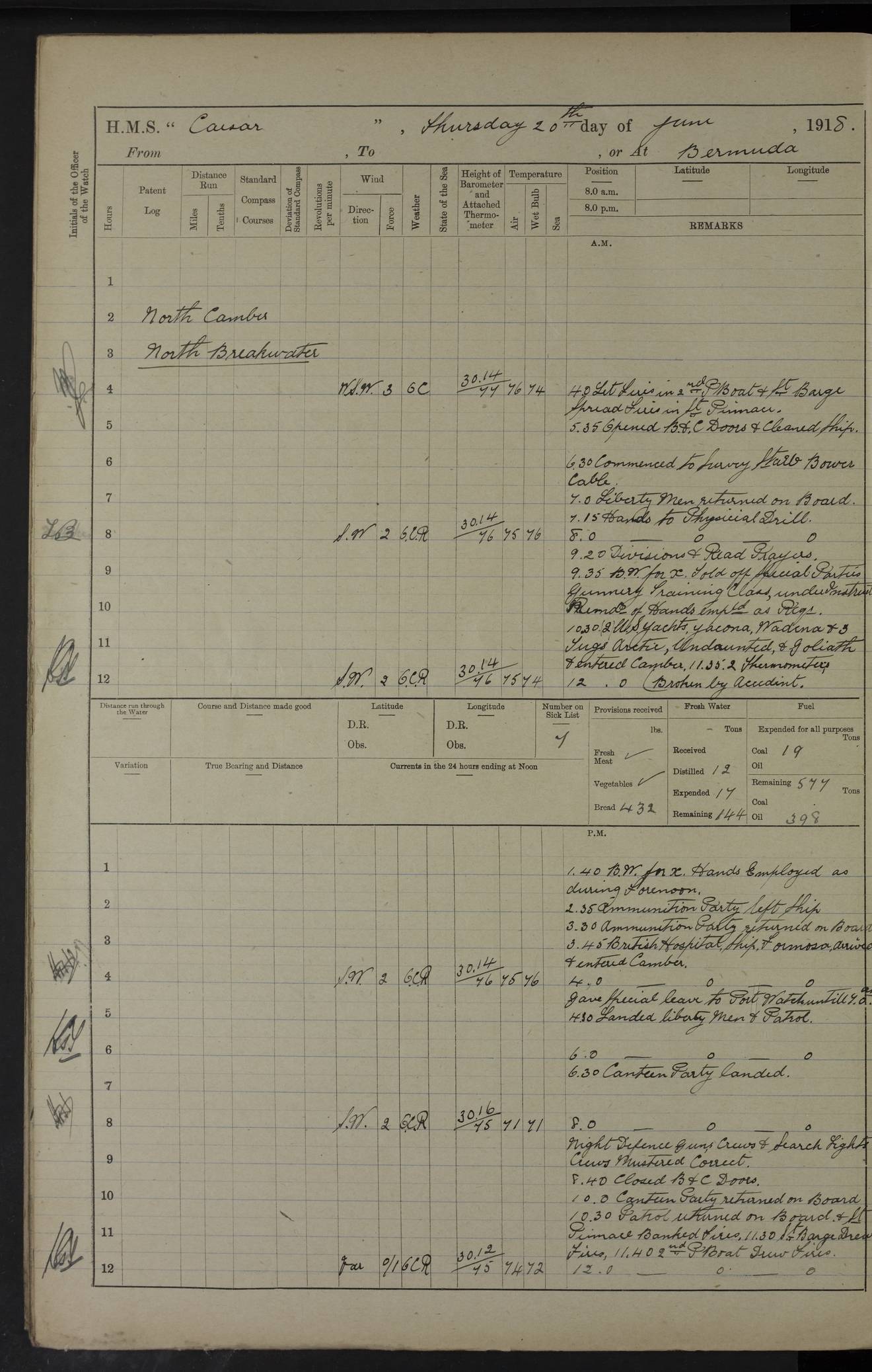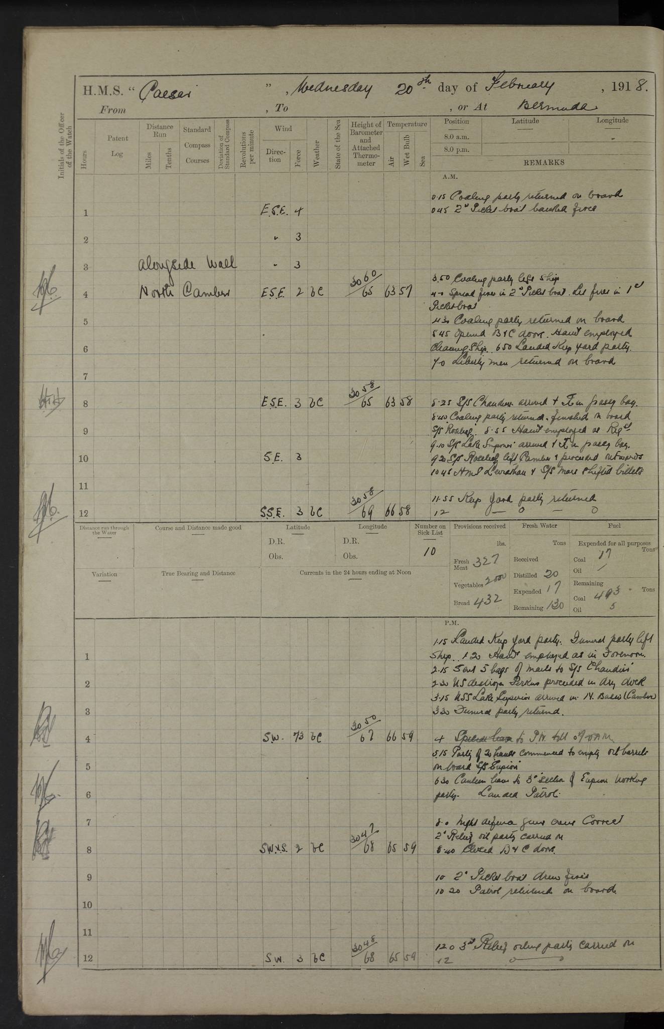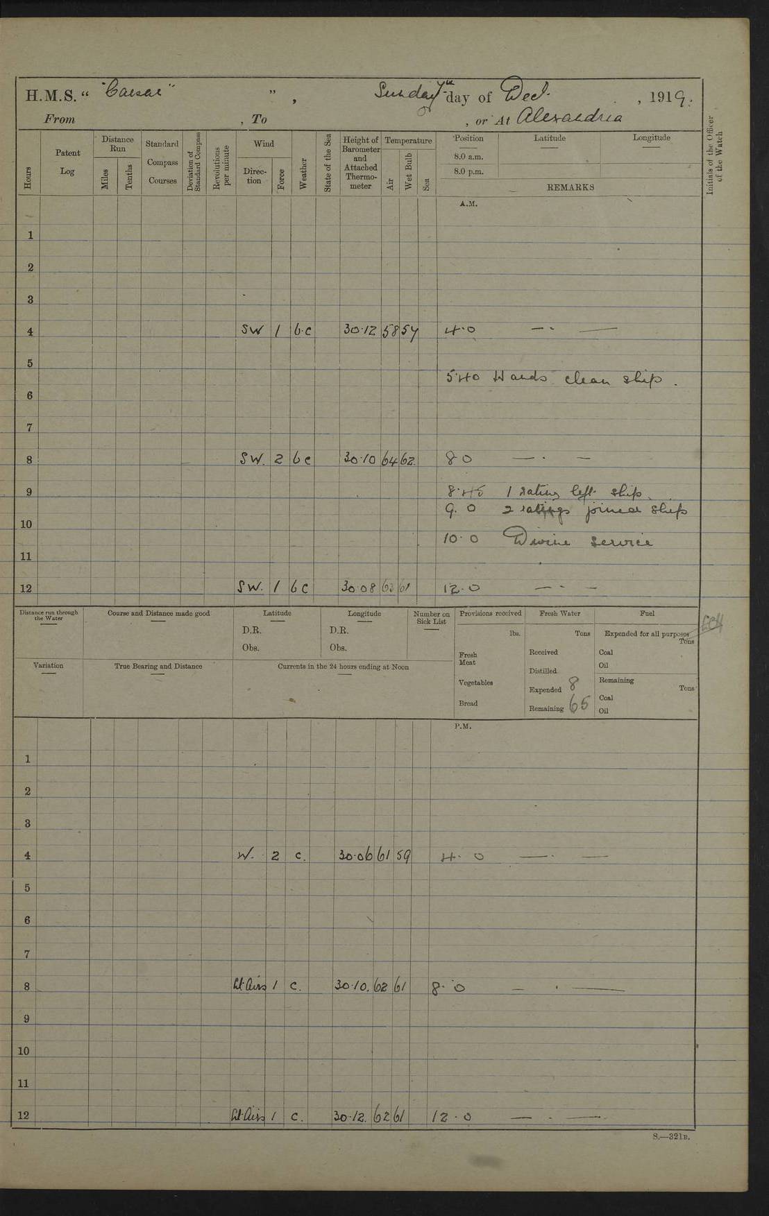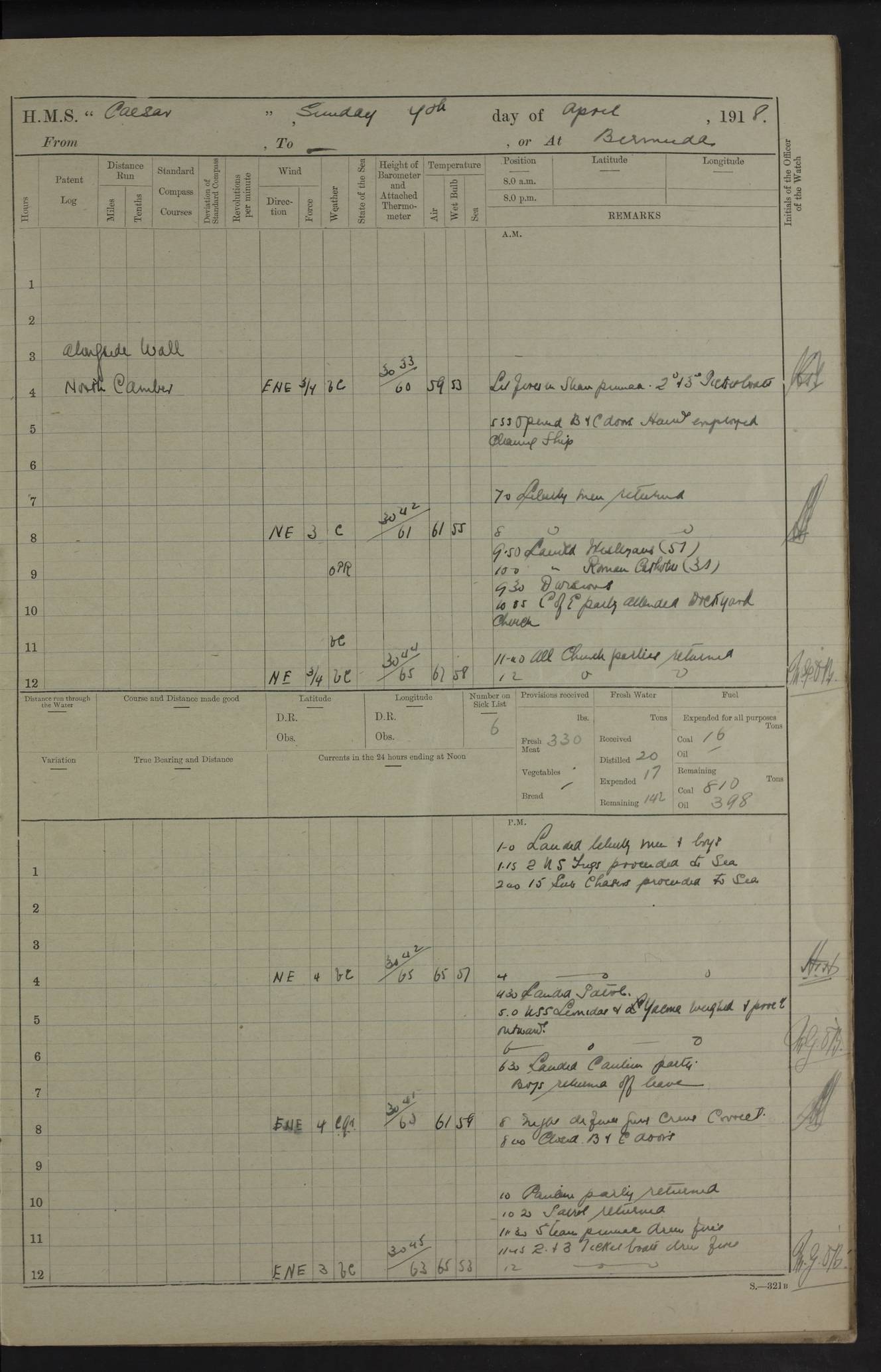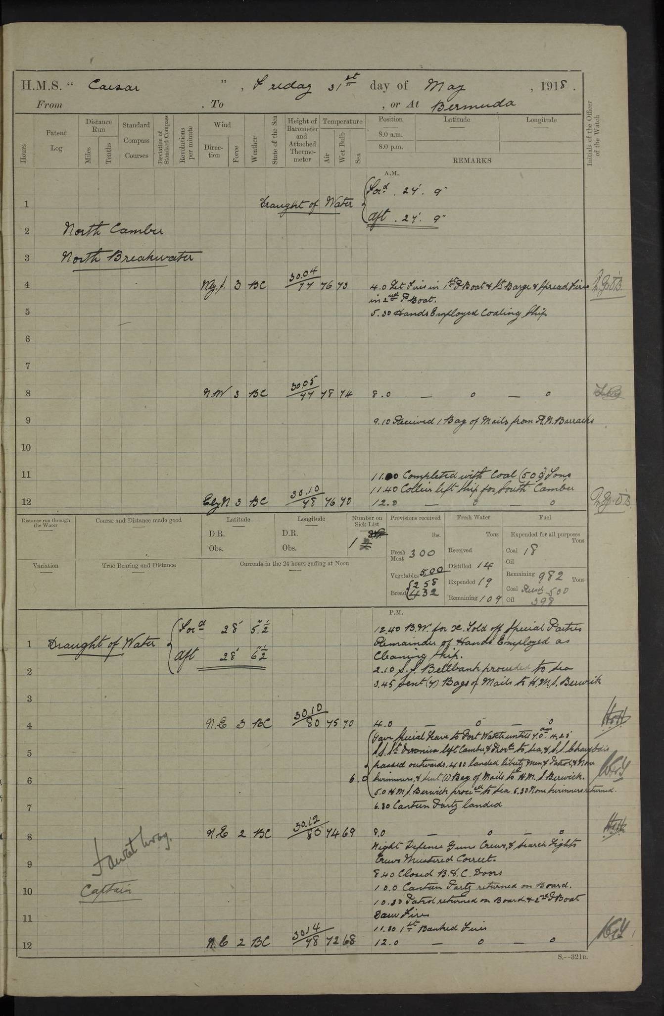 4caf84b6cadfd34197009939: (http://oldweather.s3.amazonaws.com/ADM53-36574/ADM 53-36574-145_1.jpg) 1 January 1917 At Bermuda Lat 32.32, Long -64.83 [Alongside Outer Camber Wall] 4.0am: Raised steam in first Picket boat. 6.0am: Employed cleaning ship. 7.0am: Landed Dockyard parties. Opened B, C doors. am: Employed drawing ammunition and stores, refitting and as requisite. 0.45pm: Paid monthly advance. pm: Employed as in forenoon. 4.30pm: Special leave to Starboard Watch till 7.0am. Landed patrol. 5.0pm: Dockyard parties returned. 6.30pm: Canteen leave to second part Port Watch till 10.0pm. 8.0pm: Night guns’ and search lights’ crews told off. 8.40pm: Closed B, C doors. 10.15pm: Patrol returned. 11.35pm: Drew fires in picket boats. [Number on sick list: 8] [Provisions received: Fresh Meat 340 lbs, Vegetables 2000 lbs, Bread 464 lbs] [Weather fine, though squally in early am. Noon temperature 63F] 4caf84b6cadfd3419700993a: (http://oldweather.s3.amazonaws.com/ADM53-36574/ADM 53-36574-146_0.jpg) 2 January 1917 [Year incorrectly shown as 1916] At Bermuda Lat 32.32, Long -64.83 [Alongside Outer Camber Wall] 4.30am: Raised steam in first picket boat. 6.30am: Landed working party to assist in repair of fenders in Inner Camber. 7.0am: Opened B, C doors. am: Employed embarking ammunition, refitting and as requisite. 11.45am: Working party returned. pm: Employed as in forenoon. 4.0pm: Quarters. 4.30pm: Special leave to Port Watch till 7.0am. Landed patrol. 6.30pm: Canteen leave to second part Starboard Watch till 10.0pm. 10.0pm: Patrol returned. 11.45pm: Drew fires in first picket boat. [Number on sick list: 8] [Provisions received: Fresh Meat 690 lbs, Bread 524 lbs] 4caf84b6cadfd3419700993b: (http://oldweather.s3.amazonaws.com/ADM53-36574/ADM 53-36574-146_1.jpg) 3 January 1917 [Year incorrectly shown as 1916] At Bermuda Lat 32.32, Long -64.83 [Alongside Outer Camber Wall] 7.0am: Opened B, C doors. Landed Dockyard parties. Sailed HMS “Antrim”. Landed Sanitary working party. am: Employed dismounting guns, drawing and returning stores, refitting and as requisite. Training class under instruction. 4.0pm: Quarters. Read Warrants No 268, 269. 4.30pm: Special leave to Starboard Watch till 7.0am. Landed patrol. 5.0pm: Dockyard and Working parties returned. 6.30pm: Canteen leave to first part Port Watch till 10.0pm. 8.5pm: Night guns’ and search lights’ crews told off. 10.0pm: Patrol returned. [Number on sick list: 8] [Provisions received: Fresh Meat 351 lbs, Vegetables 1000 lbs, Bread 512 lbs] 4caf84b6cadfd3419700993c: (http://oldweather.s3.amazonaws.com/ADM53-36574/ADM 53-36574-147_0.jpg) 4 January 1917 At Bermuda Lat 32.32, Long -64.83 [Alongside Outer Camber Wall] 7.0am: Landed Dockyard and Sanitary Working parties. am: Employed dismounting guns, sending up foretopmast, refitting and as requisite. Gunnery training class under instruction. 9.0am: Landed Working party to assist in repairs of fenders in Inner Camber. Discharged to SS “Kiakora” [probably Kaikoura] two ratings to form gun’s crew. 3.30pm: Working parties returned. 4.30pm: Special leave to Port Watch till 7.0am. Landed patrol. 6.30pm: Canteen leave to first part Starboard Watch till 10.0pm; 10.15pm: Patrol returned. [Number on sick list: 9] [Provisions received: Fresh Meat 353 lbs, Vegetables 1000 lbs, Bread 498 lbs] 4caf84b6cadfd3419700993d: (http://oldweather.s3.amazonaws.com/ADM53-36574/ADM 53-36574-147_1.jpg) 5 January 1917 At Bermuda Lat 32.32, Long -64.83 [Alongside Outer Camber Wall] 7.0am: Landed Dockyard and Sanitary Working parties. am: Employed refitting, dismounting guns and as requisite. Gunnery Training class under instruction. pm: Employed as in forenoon. 2.55pm: Arrived HMS “Antrim”. 4.30pm: Special leave to Starboard Watch till 7.0am. Landed patrol. 5.40pm: Drew fires in second picket boat. 6.30pm: Canteen leave to second part Port Watch till 10.0pm. 11.0pm: Patrol returned. 11.40pm: Drew fires in first picket boat. [Number on sick list: 9] [Provisions received: Fresh Meat 350 lbs, Vegetables 400 lbs, Bread 514 lbs] 4caf84b6cadfd3419700993e: (http://oldweather.s3.amazonaws.com/ADM53-36574/ADM 53-36574-148_0.jpg) 6 January 1917 At Bermuda Lat 32.32, Long -64.83 [Alongside Outer Camber Wall] 7.0am: Landed Dockyard parties. am: Employed cleaning ship, refitting, discharging ammunition from SS “Goodwood”, assisting in repairs to fenders of Inner Camber and as requisite. Training class under instruction. 11.45am: Dockyard parties returned. 0.30pm: Observed SS “Prophet” aground in Stag Channel. pm: Make and mend clothes. 1.30pm: Special leave to Port Watch till 7.0am and boys till 5.0pm. 3.0pm: SS “Prophet” refloated and proceeded to anchor. 4.0pm: Quarters. Read Warrant No 270. 4.30pm: Landed patrol. 5.0pm: Party employed discharging SS “Goodwood”. 6.30pm: Canteen leave to second part Starboard Watch till 10.0pm. 8.0pm: Night guns’ and search lights’ crews told off. 8.40pm: Closed B, C doors. 10.15pm: Patrol returned. [Number on sick list: 7] [Provisions received: Fresh Meat 361 lbs, Vegetables 2000 lbs, Bread 928 lbs] 4caf84b6cadfd3419700993f: (http://oldweather.s3.amazonaws.com/ADM53-36574/ADM 53-36574-148_1.jpg) 7 January 1917 At Bermuda Lat 32.32, Long -64.83 [Alongside Outer Camber Wall] 5.55am: Opened B, C doors. Employed cleaning ship. 8.30am: Landed Church parties, Presbyterians 18, Wesleyans 43, RCs 41. 9.30am: Divisions. 10.15am: Ship’s Company attended Divine Service at Dockyard Church. 11.20am: Church parties returned. 1.0pm: Special leave to Starboard Watch till 7.0am and boys will 5.0pm. 6.30pm: Canteen leave to first part Port Watch till 10.0pm. [Number on sick list: 8] [Weather fine, noon temperature 70F] 4caf84b6cadfd34197009940: (http://oldweather.s3.amazonaws.com/ADM53-36574/ADM 53-36574-149_0.jpg) 8 January 1917 At Bermuda Lat 32.32, Long -64.83 [Alongside Outer Camber Wall] 4.0am: Raised steam in first picket boat. 7.0am: Landed Dockyard parties. am: Employed dischargi
