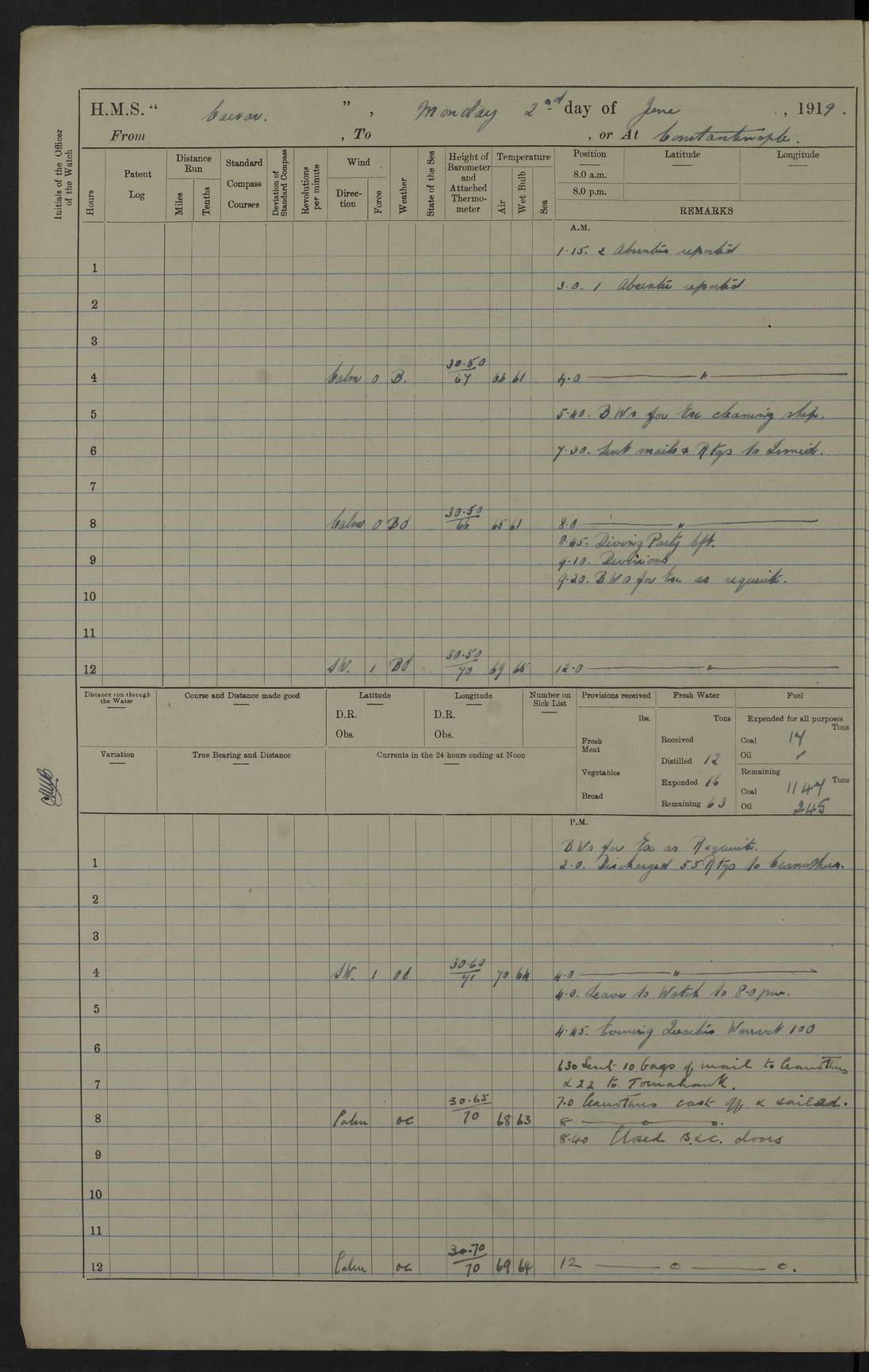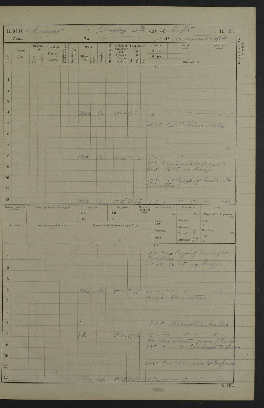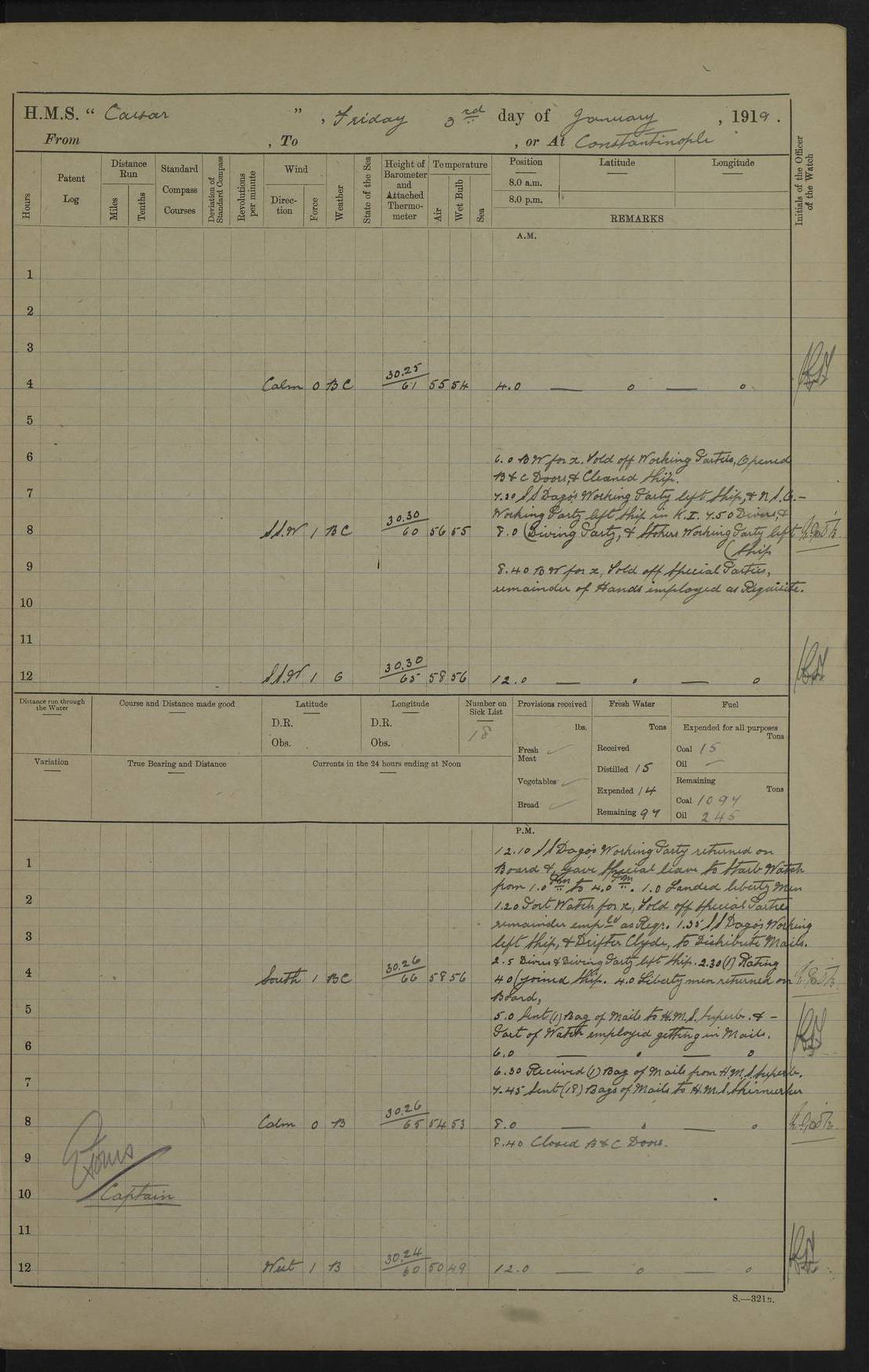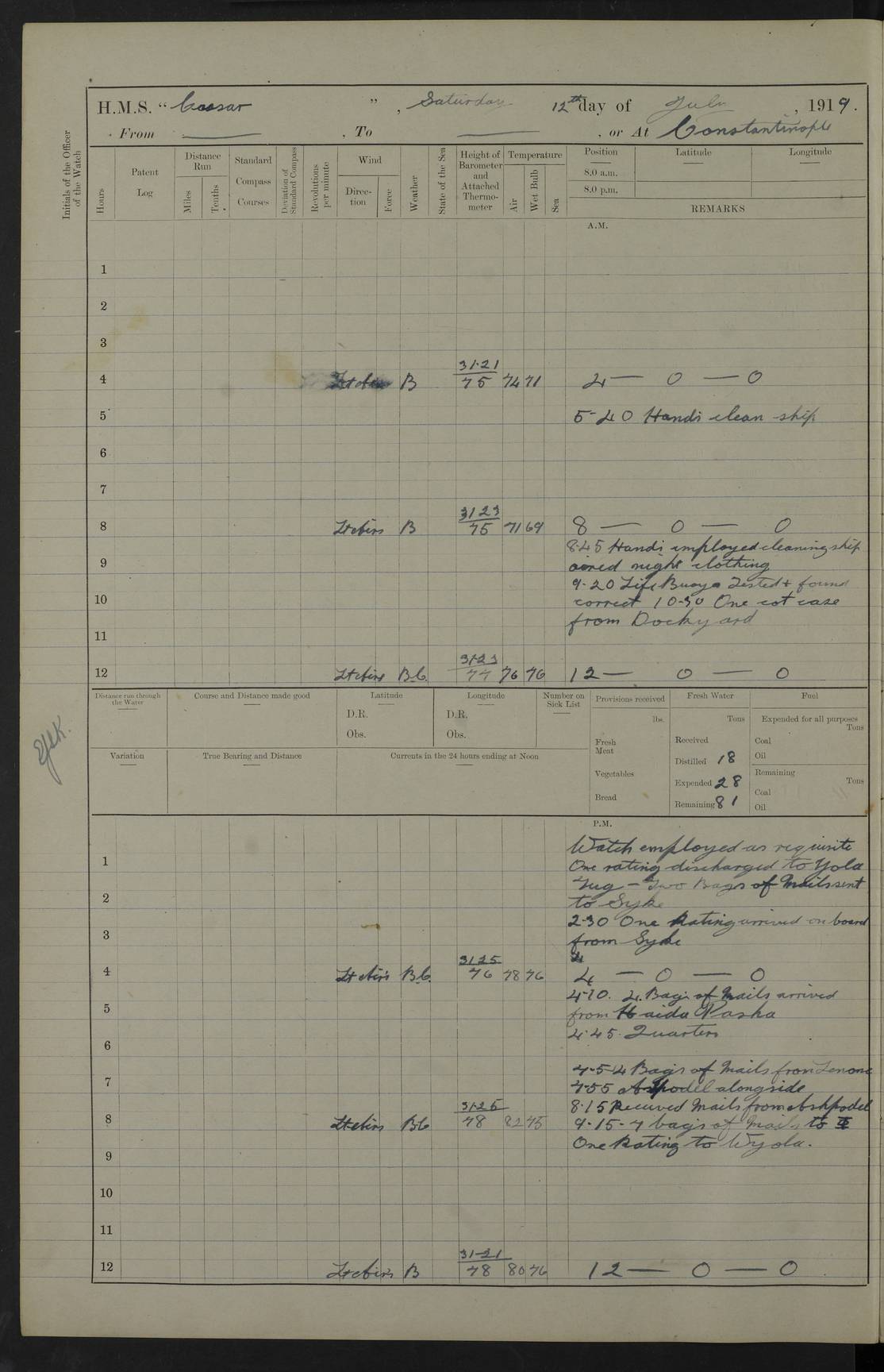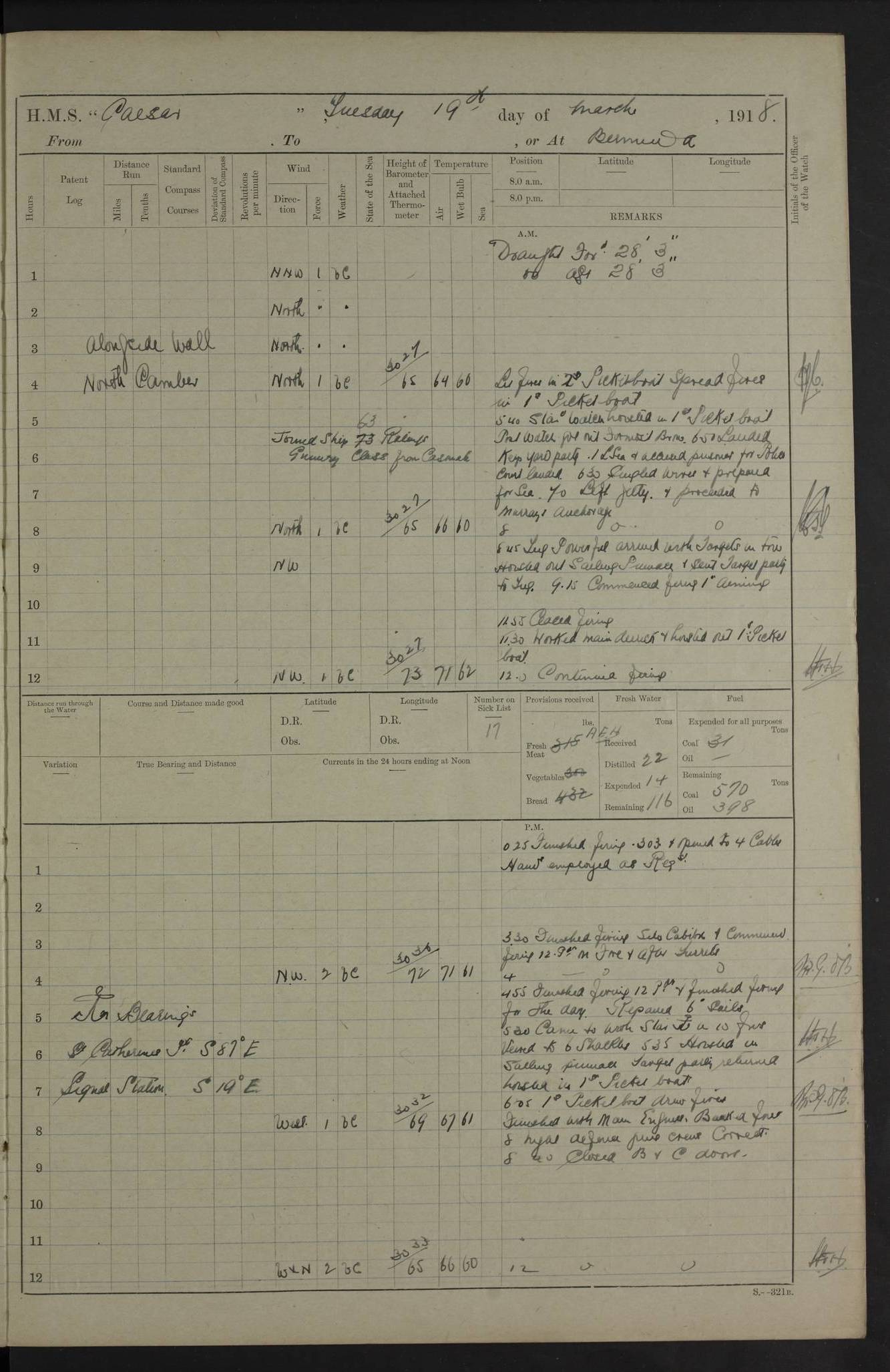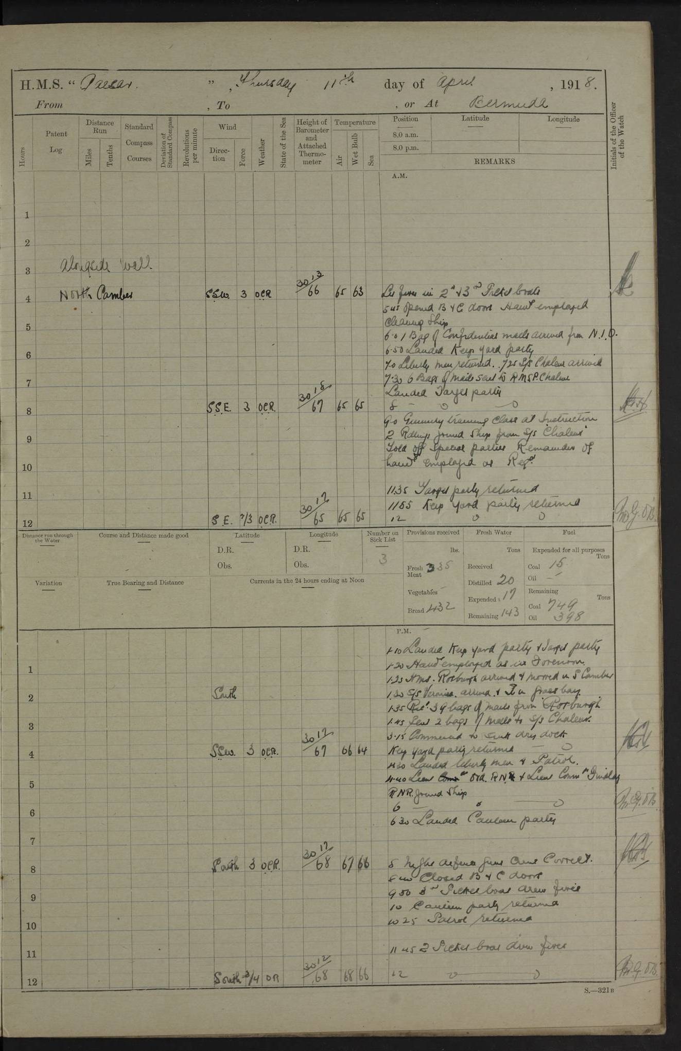 4caf84b6cadfd34197009939: (http://oldweather.s3.amazonaws.com/ADM53-36574/ADM 53-36574-145_1.jpg) 1 January 1917 At Bermuda Lat 32.32, Long -64.83 [Alongside Outer Camber Wall] 4.0am: Raised steam in first Picket boat. 6.0am: Employed cleaning ship. 7.0am: Landed Dockyard parties. Opened B, C doors. am: Employed drawing ammunition and stores, refitting and as requisite. 0.45pm: Paid monthly advance. pm: Employed as in forenoon. 4.30pm: Special leave to Starboard Watch till 7.0am. Landed patrol. 5.0pm: Dockyard parties returned. 6.30pm: Canteen leave to second part Port Watch till 10.0pm. 8.0pm: Night guns’ and search lights’ crews told off. 8.40pm: Closed B, C doors. 10.15pm: Patrol returned. 11.35pm: Drew fires in picket boats. [Number on sick list: 8] [Provisions received: Fresh Meat 340 lbs, Vegetables 2000 lbs, Bread 464 lbs] [Weather fine, though squally in early am. Noon temperature 63F] 4caf84b6cadfd3419700993a: (http://oldweather.s3.amazonaws.com/ADM53-36574/ADM 53-36574-146_0.jpg) 2 January 1917 [Year incorrectly shown as 1916] At Bermuda Lat 32.32, Long -64.83 [Alongside Outer Camber Wall] 4.30am: Raised steam in first picket boat. 6.30am: Landed working party to assist in repair of fenders in Inner Camber. 7.0am: Opened B, C doors. am: Employed embarking ammunition, refitting and as requisite. 11.45am: Working party returned. pm: Employed as in forenoon. 4.0pm: Quarters. 4.30pm: Special leave to Port Watch till 7.0am. Landed patrol. 6.30pm: Canteen leave to second part Starboard Watch till 10.0pm. 10.0pm: Patrol returned. 11.45pm: Drew fires in first picket boat. [Number on sick list: 8] [Provisions received: Fresh Meat 690 lbs, Bread 524 lbs] 4caf84b6cadfd3419700993b: (http://oldweather.s3.amazonaws.com/ADM53-36574/ADM 53-36574-146_1.jpg) 3 January 1917 [Year incorrectly shown as 1916] At Bermuda Lat 32.32, Long -64.83 [Alongside Outer Camber Wall] 7.0am: Opened B, C doors. Landed Dockyard parties. Sailed HMS “Antrim”. Landed Sanitary working party. am: Employed dismounting guns, drawing and returning stores, refitting and as requisite. Training class under instruction. 4.0pm: Quarters. Read Warrants No 268, 269. 4.30pm: Special leave to Starboard Watch till 7.0am. Landed patrol. 5.0pm: Dockyard and Working parties returned. 6.30pm: Canteen leave to first part Port Watch till 10.0pm. 8.5pm: Night guns’ and search lights’ crews told off. 10.0pm: Patrol returned. [Number on sick list: 8] [Provisions received: Fresh Meat 351 lbs, Vegetables 1000 lbs, Bread 512 lbs] 4caf84b6cadfd3419700993c: (http://oldweather.s3.amazonaws.com/ADM53-36574/ADM 53-36574-147_0.jpg) 4 January 1917 At Bermuda Lat 32.32, Long -64.83 [Alongside Outer Camber Wall] 7.0am: Landed Dockyard and Sanitary Working parties. am: Employed dismounting guns, sending up foretopmast, refitting and as requisite. Gunnery training class under instruction. 9.0am: Landed Working party to assist in repairs of fenders in Inner Camber. Discharged to SS “Kiakora” [probably Kaikoura] two ratings to form gun’s crew. 3.30pm: Working parties returned. 4.30pm: Special leave to Port Watch till 7.0am. Landed patrol. 6.30pm: Canteen leave to first part Starboard Watch till 10.0pm; 10.15pm: Patrol returned. [Number on sick list: 9] [Provisions received: Fresh Meat 353 lbs, Vegetables 1000 lbs, Bread 498 lbs] 4caf84b6cadfd3419700993d: (http://oldweather.s3.amazonaws.com/ADM53-36574/ADM 53-36574-147_1.jpg) 5 January 1917 At Bermuda Lat 32.32, Long -64.83 [Alongside Outer Camber Wall] 7.0am: Landed Dockyard and Sanitary Working parties. am: Employed refitting, dismounting guns and as requisite. Gunnery Training class under instruction. pm: Employed as in forenoon. 2.55pm: Arrived HMS “Antrim”. 4.30pm: Special leave to Starboard Watch till 7.0am. Landed patrol. 5.40pm: Drew fires in second picket boat. 6.30pm: Canteen leave to second part Port Watch till 10.0pm. 11.0pm: Patrol returned. 11.40pm: Drew fires in first picket boat. [Number on sick list: 9] [Provisions received: Fresh Meat 350 lbs, Vegetables 400 lbs, Bread 514 lbs] 4caf84b6cadfd3419700993e: (http://oldweather.s3.amazonaws.com/ADM53-36574/ADM 53-36574-148_0.jpg) 6 January 1917 At Bermuda Lat 32.32, Long -64.83 [Alongside Outer Camber Wall] 7.0am: Landed Dockyard parties. am: Employed cleaning ship, refitting, discharging ammunition from SS “Goodwood”, assisting in repairs to fenders of Inner Camber and as requisite. Training class under instruction. 11.45am: Dockyard parties returned. 0.30pm: Observed SS “Prophet” aground in Stag Channel. pm: Make and mend clothes. 1.30pm: Special leave to Port Watch till 7.0am and boys till 5.0pm. 3.0pm: SS “Prophet” refloated and proceeded to anchor. 4.0pm: Quarters. Read Warrant No 270. 4.30pm: Landed patrol. 5.0pm: Party employed discharging SS “Goodwood”. 6.30pm: Canteen leave to second part Starboard Watch till 10.0pm. 8.0pm: Night guns’ and search lights’ crews told off. 8.40pm: Closed B, C doors. 10.15pm: Patrol returned. [Number on sick list: 7] [Provisions received: Fresh Meat 361 lbs, Vegetables 2000 lbs, Bread 928 lbs] 4caf84b6cadfd3419700993f: (http://oldweather.s3.amazonaws.com/ADM53-36574/ADM 53-36574-148_1.jpg) 7 January 1917 At Bermuda Lat 32.32, Long -64.83 [Alongside Outer Camber Wall] 5.55am: Opened B, C doors. Employed cleaning ship. 8.30am: Landed Church parties, Presbyterians 18, Wesleyans 43, RCs 41. 9.30am: Divisions. 10.15am: Ship’s Company attended Divine Service at Dockyard Church. 11.20am: Church parties returned. 1.0pm: Special leave to Starboard Watch till 7.0am and boys will 5.0pm. 6.30pm: Canteen leave to first part Port Watch till 10.0pm. [Number on sick list: 8] [Weather fine, noon temperature 70F] 4caf84b6cadfd34197009940: (http://oldweather.s3.amazonaws.com/ADM53-36574/ADM 53-36574-149_0.jpg) 8 January 1917 At Bermuda Lat 32.32, Long -64.83 [Alongside Outer Camber Wall] 4.0am: Raised steam in first picket boat. 7.0am: Landed Dockyard parties. am: Employed dischargi