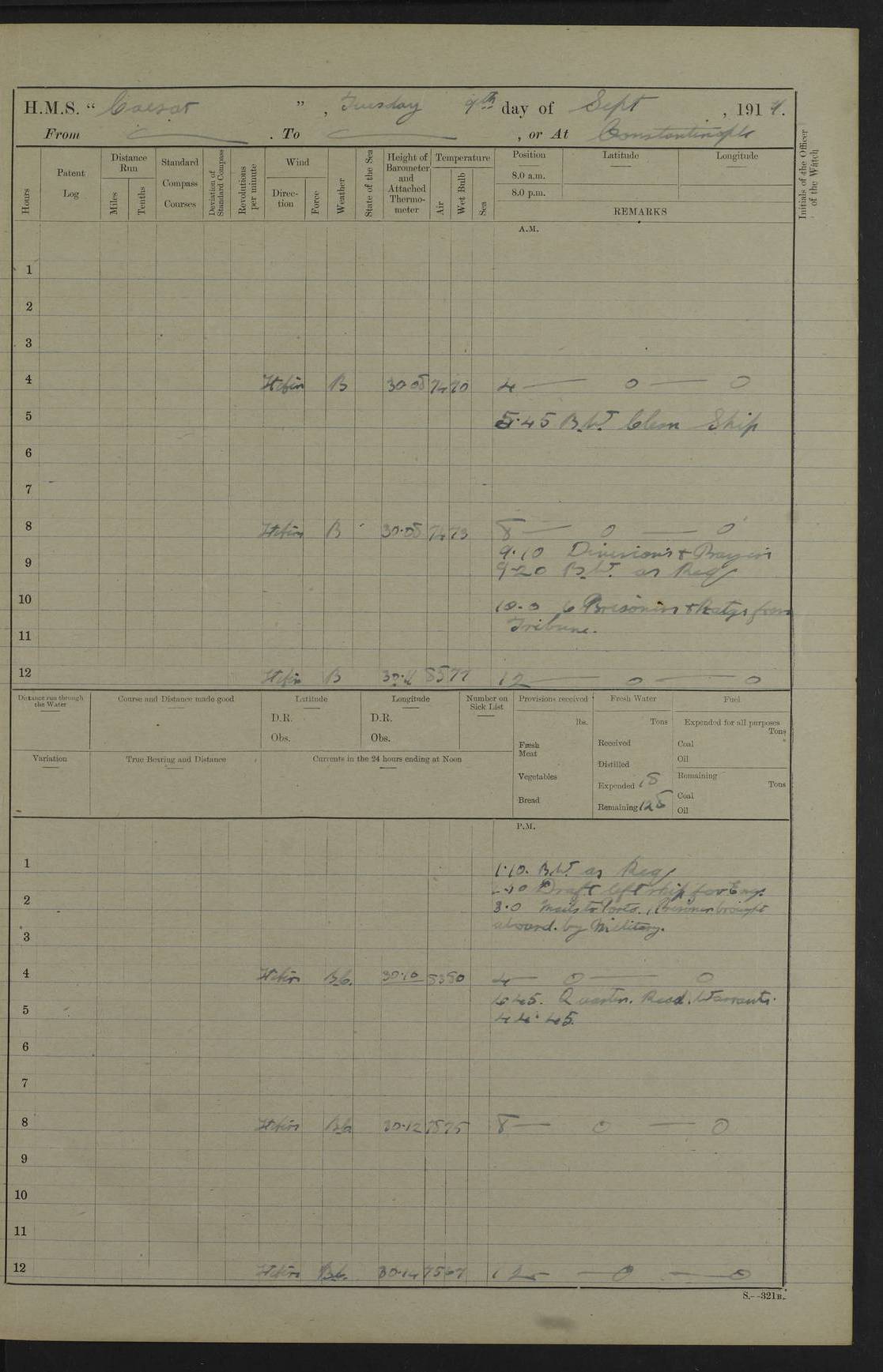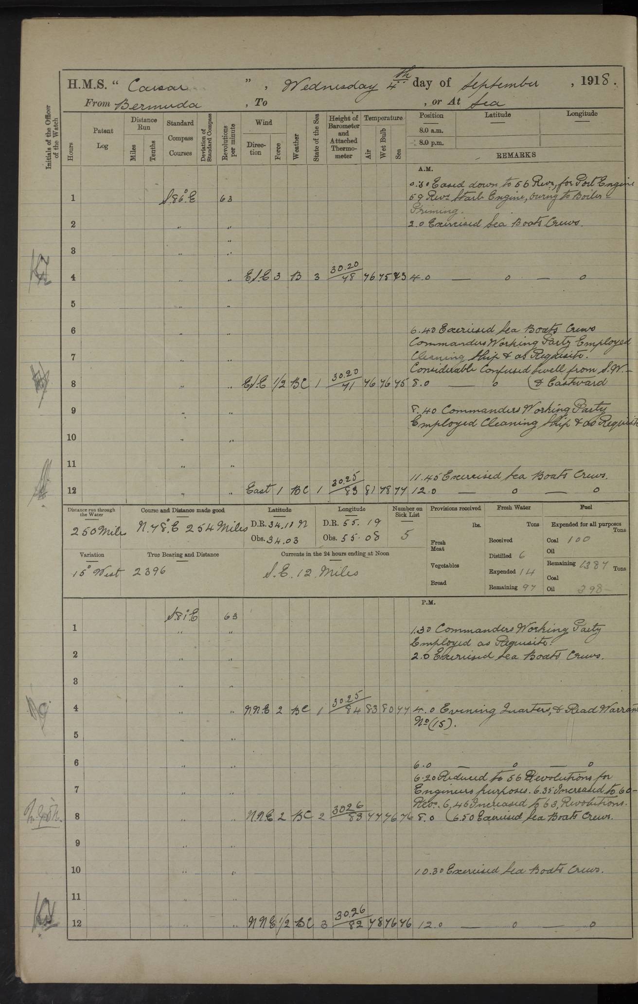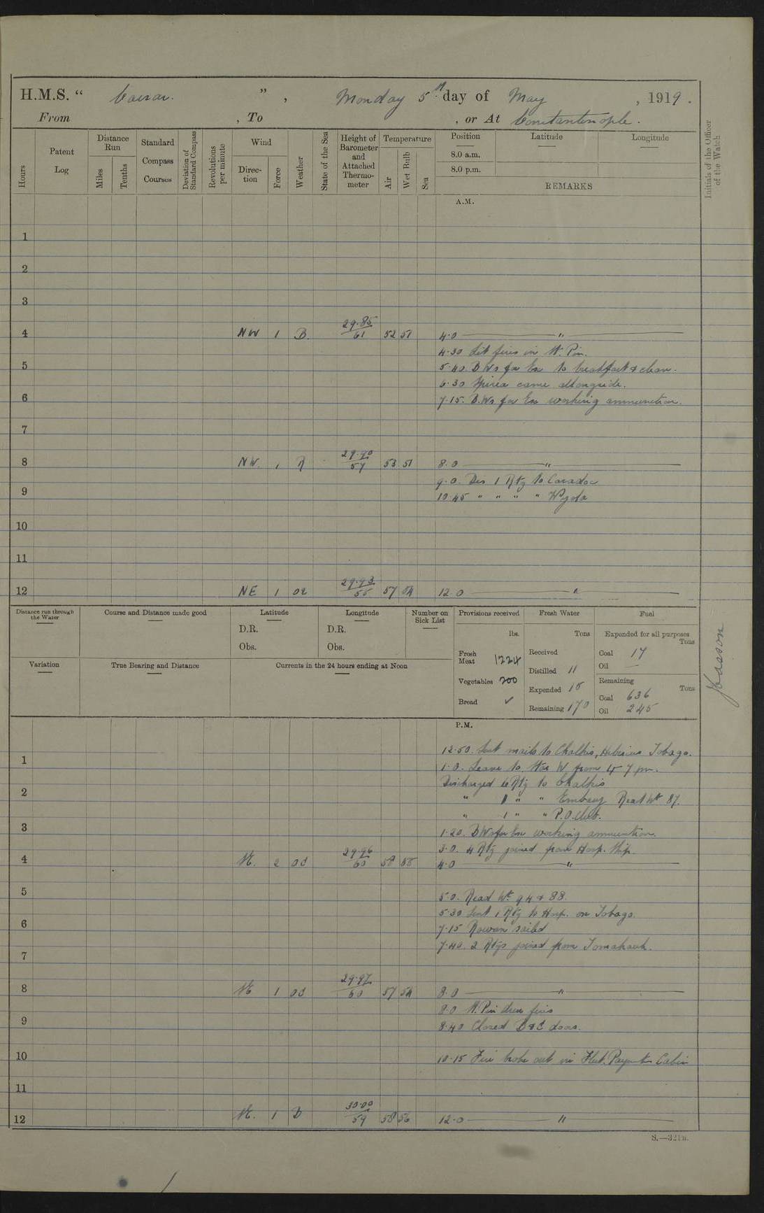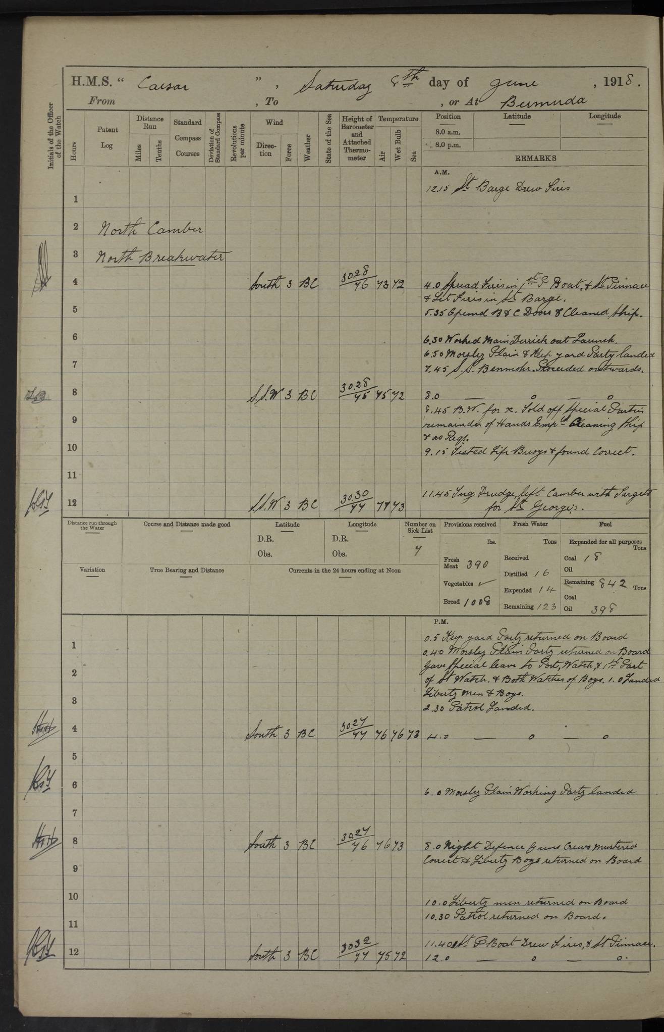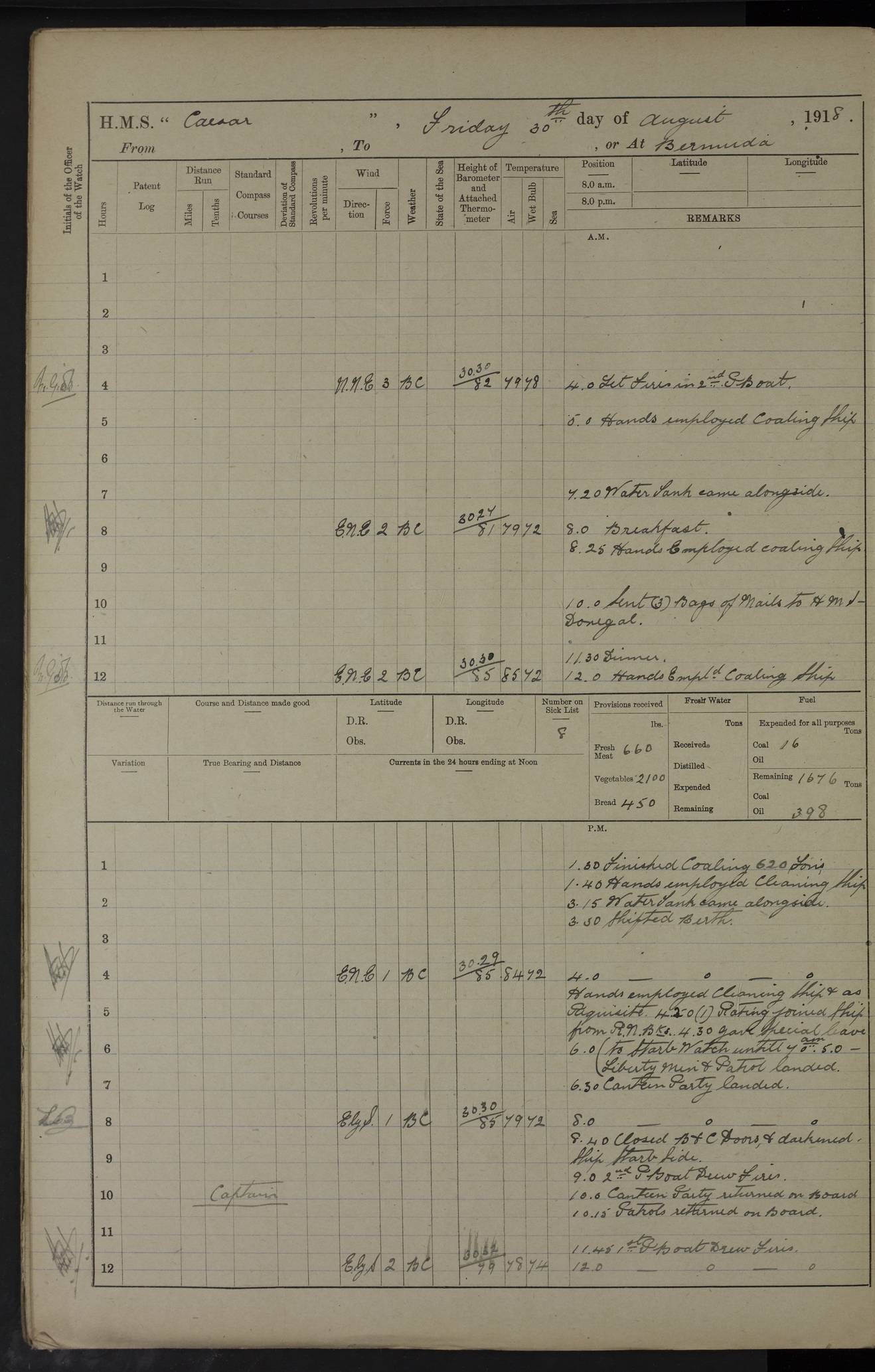 4caf84b6cadfd34197009939: (http://oldweather.s3.amazonaws.com/ADM53-36574/ADM 53-36574-145_1.jpg) 1 January 1917 At Bermuda Lat 32.32, Long -64.83 [Alongside Outer Camber Wall] 4.0am: Raised steam in first Picket boat. 6.0am: Employed cleaning ship. 7.0am: Landed Dockyard parties. Opened B, C doors. am: Employed drawing ammunition and stores, refitting and as requisite. 0.45pm: Paid monthly advance. pm: Employed as in forenoon. 4.30pm: Special leave to Starboard Watch till 7.0am. Landed patrol. 5.0pm: Dockyard parties returned. 6.30pm: Canteen leave to second part Port Watch till 10.0pm. 8.0pm: Night guns’ and search lights’ crews told off. 8.40pm: Closed B, C doors. 10.15pm: Patrol returned. 11.35pm: Drew fires in picket boats. [Number on sick list: 8] [Provisions received: Fresh Meat 340 lbs, Vegetables 2000 lbs, Bread 464 lbs] [Weather fine, though squally in early am. Noon temperature 63F] 4caf84b6cadfd3419700993a: (http://oldweather.s3.amazonaws.com/ADM53-36574/ADM 53-36574-146_0.jpg) 2 January 1917 [Year incorrectly shown as 1916] At Bermuda Lat 32.32, Long -64.83 [Alongside Outer Camber Wall] 4.30am: Raised steam in first picket boat. 6.30am: Landed working party to assist in repair of fenders in Inner Camber. 7.0am: Opened B, C doors. am: Employed embarking ammunition, refitting and as requisite. 11.45am: Working party returned. pm: Employed as in forenoon. 4.0pm: Quarters. 4.30pm: Special leave to Port Watch till 7.0am. Landed patrol. 6.30pm: Canteen leave to second part Starboard Watch till 10.0pm. 10.0pm: Patrol returned. 11.45pm: Drew fires in first picket boat. [Number on sick list: 8] [Provisions received: Fresh Meat 690 lbs, Bread 524 lbs] 4caf84b6cadfd3419700993b: (http://oldweather.s3.amazonaws.com/ADM53-36574/ADM 53-36574-146_1.jpg) 3 January 1917 [Year incorrectly shown as 1916] At Bermuda Lat 32.32, Long -64.83 [Alongside Outer Camber Wall] 7.0am: Opened B, C doors. Landed Dockyard parties. Sailed HMS “Antrim”. Landed Sanitary working party. am: Employed dismounting guns, drawing and returning stores, refitting and as requisite. Training class under instruction. 4.0pm: Quarters. Read Warrants No 268, 269. 4.30pm: Special leave to Starboard Watch till 7.0am. Landed patrol. 5.0pm: Dockyard and Working parties returned. 6.30pm: Canteen leave to first part Port Watch till 10.0pm. 8.5pm: Night guns’ and search lights’ crews told off. 10.0pm: Patrol returned. [Number on sick list: 8] [Provisions received: Fresh Meat 351 lbs, Vegetables 1000 lbs, Bread 512 lbs] 4caf84b6cadfd3419700993c: (http://oldweather.s3.amazonaws.com/ADM53-36574/ADM 53-36574-147_0.jpg) 4 January 1917 At Bermuda Lat 32.32, Long -64.83 [Alongside Outer Camber Wall] 7.0am: Landed Dockyard and Sanitary Working parties. am: Employed dismounting guns, sending up foretopmast, refitting and as requisite. Gunnery training class under instruction. 9.0am: Landed Working party to assist in repairs of fenders in Inner Camber. Discharged to SS “Kiakora” [probably Kaikoura] two ratings to form gun’s crew. 3.30pm: Working parties returned. 4.30pm: Special leave to Port Watch till 7.0am. Landed patrol. 6.30pm: Canteen leave to first part Starboard Watch till 10.0pm; 10.15pm: Patrol returned. [Number on sick list: 9] [Provisions received: Fresh Meat 353 lbs, Vegetables 1000 lbs, Bread 498 lbs] 4caf84b6cadfd3419700993d: (http://oldweather.s3.amazonaws.com/ADM53-36574/ADM 53-36574-147_1.jpg) 5 January 1917 At Bermuda Lat 32.32, Long -64.83 [Alongside Outer Camber Wall] 7.0am: Landed Dockyard and Sanitary Working parties. am: Employed refitting, dismounting guns and as requisite. Gunnery Training class under instruction. pm: Employed as in forenoon. 2.55pm: Arrived HMS “Antrim”. 4.30pm: Special leave to Starboard Watch till 7.0am. Landed patrol. 5.40pm: Drew fires in second picket boat. 6.30pm: Canteen leave to second part Port Watch till 10.0pm. 11.0pm: Patrol returned. 11.40pm: Drew fires in first picket boat. [Number on sick list: 9] [Provisions received: Fresh Meat 350 lbs, Vegetables 400 lbs, Bread 514 lbs] 4caf84b6cadfd3419700993e: (http://oldweather.s3.amazonaws.com/ADM53-36574/ADM 53-36574-148_0.jpg) 6 January 1917 At Bermuda Lat 32.32, Long -64.83 [Alongside Outer Camber Wall] 7.0am: Landed Dockyard parties. am: Employed cleaning ship, refitting, discharging ammunition from SS “Goodwood”, assisting in repairs to fenders of Inner Camber and as requisite. Training class under instruction. 11.45am: Dockyard parties returned. 0.30pm: Observed SS “Prophet” aground in Stag Channel. pm: Make and mend clothes. 1.30pm: Special leave to Port Watch till 7.0am and boys till 5.0pm. 3.0pm: SS “Prophet” refloated and proceeded to anchor. 4.0pm: Quarters. Read Warrant No 270. 4.30pm: Landed patrol. 5.0pm: Party employed discharging SS “Goodwood”. 6.30pm: Canteen leave to second part Starboard Watch till 10.0pm. 8.0pm: Night guns’ and search lights’ crews told off. 8.40pm: Closed B, C doors. 10.15pm: Patrol returned. [Number on sick list: 7] [Provisions received: Fresh Meat 361 lbs, Vegetables 2000 lbs, Bread 928 lbs] 4caf84b6cadfd3419700993f: (http://oldweather.s3.amazonaws.com/ADM53-36574/ADM 53-36574-148_1.jpg) 7 January 1917 At Bermuda Lat 32.32, Long -64.83 [Alongside Outer Camber Wall] 5.55am: Opened B, C doors. Employed cleaning ship. 8.30am: Landed Church parties, Presbyterians 18, Wesleyans 43, RCs 41. 9.30am: Divisions. 10.15am: Ship’s Company attended Divine Service at Dockyard Church. 11.20am: Church parties returned. 1.0pm: Special leave to Starboard Watch till 7.0am and boys will 5.0pm. 6.30pm: Canteen leave to first part Port Watch till 10.0pm. [Number on sick list: 8] [Weather fine, noon temperature 70F] 4caf84b6cadfd34197009940: (http://oldweather.s3.amazonaws.com/ADM53-36574/ADM 53-36574-149_0.jpg) 8 January 1917 At Bermuda Lat 32.32, Long -64.83 [Alongside Outer Camber Wall] 4.0am: Raised steam in first picket boat. 7.0am: Landed Dockyard parties. am: Employed dischargi