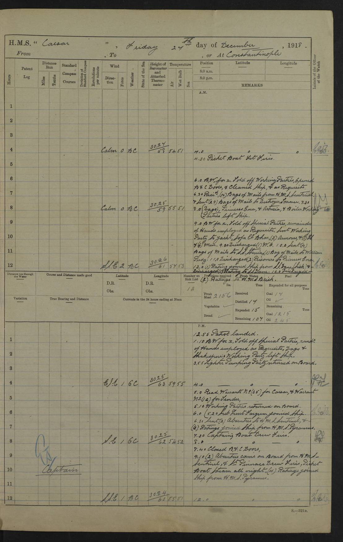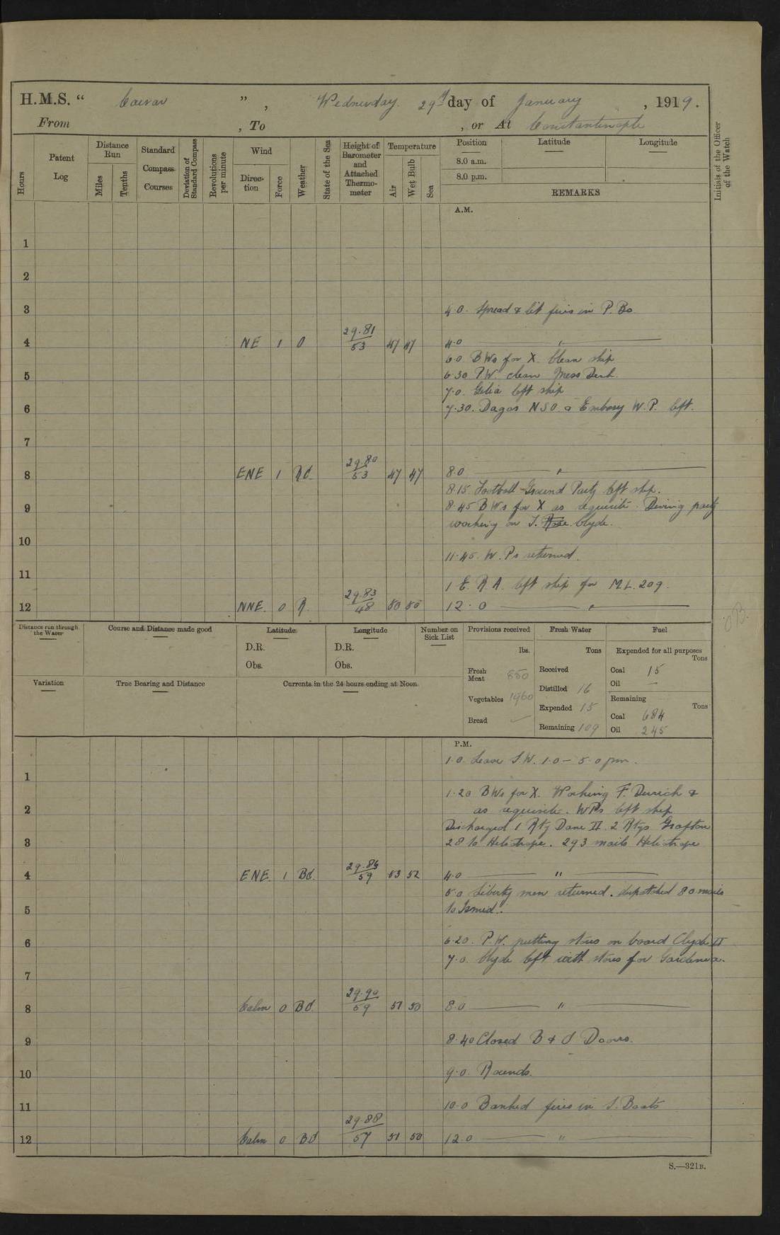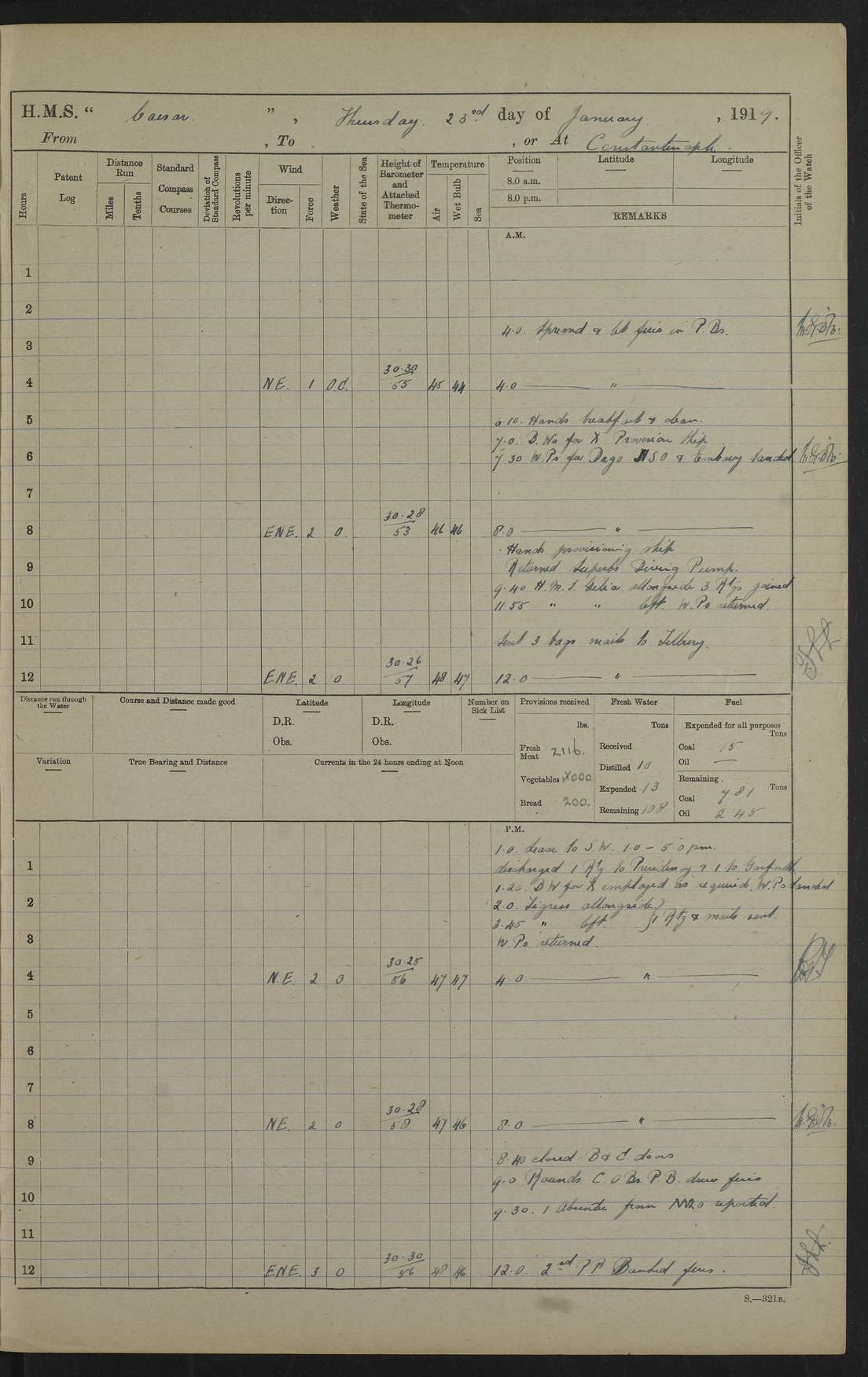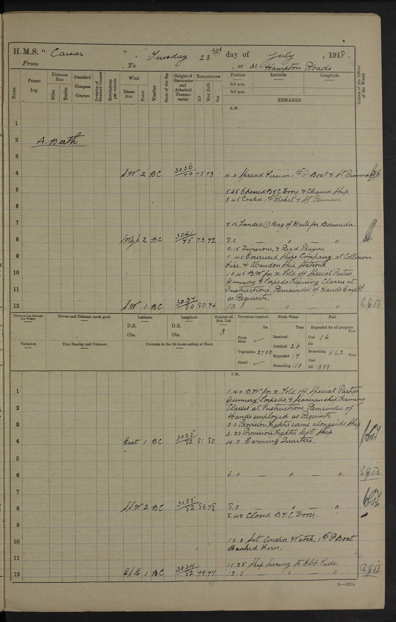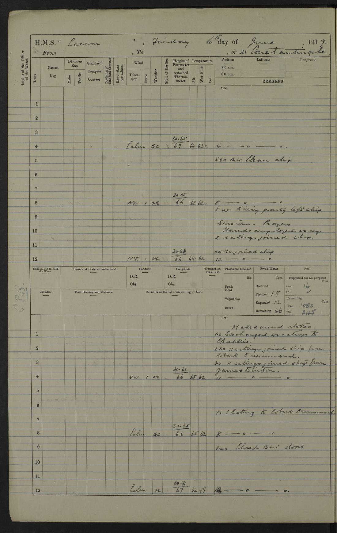 4caf84b6cadfd34197009939: (http://oldweather.s3.amazonaws.com/ADM53-36574/ADM 53-36574-145_1.jpg) 1 January 1917 At Bermuda Lat 32.32, Long -64.83 [Alongside Outer Camber Wall] 4.0am: Raised steam in first Picket boat. 6.0am: Employed cleaning ship. 7.0am: Landed Dockyard parties. Opened B, C doors. am: Employed drawing ammunition and stores, refitting and as requisite. 0.45pm: Paid monthly advance. pm: Employed as in forenoon. 4.30pm: Special leave to Starboard Watch till 7.0am. Landed patrol. 5.0pm: Dockyard parties returned. 6.30pm: Canteen leave to second part Port Watch till 10.0pm. 8.0pm: Night guns’ and search lights’ crews told off. 8.40pm: Closed B, C doors. 10.15pm: Patrol returned. 11.35pm: Drew fires in picket boats. [Number on sick list: 8] [Provisions received: Fresh Meat 340 lbs, Vegetables 2000 lbs, Bread 464 lbs] [Weather fine, though squally in early am. Noon temperature 63F] 4caf84b6cadfd3419700993a: (http://oldweather.s3.amazonaws.com/ADM53-36574/ADM 53-36574-146_0.jpg) 2 January 1917 [Year incorrectly shown as 1916] At Bermuda Lat 32.32, Long -64.83 [Alongside Outer Camber Wall] 4.30am: Raised steam in first picket boat. 6.30am: Landed working party to assist in repair of fenders in Inner Camber. 7.0am: Opened B, C doors. am: Employed embarking ammunition, refitting and as requisite. 11.45am: Working party returned. pm: Employed as in forenoon. 4.0pm: Quarters. 4.30pm: Special leave to Port Watch till 7.0am. Landed patrol. 6.30pm: Canteen leave to second part Starboard Watch till 10.0pm. 10.0pm: Patrol returned. 11.45pm: Drew fires in first picket boat. [Number on sick list: 8] [Provisions received: Fresh Meat 690 lbs, Bread 524 lbs] 4caf84b6cadfd3419700993b: (http://oldweather.s3.amazonaws.com/ADM53-36574/ADM 53-36574-146_1.jpg) 3 January 1917 [Year incorrectly shown as 1916] At Bermuda Lat 32.32, Long -64.83 [Alongside Outer Camber Wall] 7.0am: Opened B, C doors. Landed Dockyard parties. Sailed HMS “Antrim”. Landed Sanitary working party. am: Employed dismounting guns, drawing and returning stores, refitting and as requisite. Training class under instruction. 4.0pm: Quarters. Read Warrants No 268, 269. 4.30pm: Special leave to Starboard Watch till 7.0am. Landed patrol. 5.0pm: Dockyard and Working parties returned. 6.30pm: Canteen leave to first part Port Watch till 10.0pm. 8.5pm: Night guns’ and search lights’ crews told off. 10.0pm: Patrol returned. [Number on sick list: 8] [Provisions received: Fresh Meat 351 lbs, Vegetables 1000 lbs, Bread 512 lbs] 4caf84b6cadfd3419700993c: (http://oldweather.s3.amazonaws.com/ADM53-36574/ADM 53-36574-147_0.jpg) 4 January 1917 At Bermuda Lat 32.32, Long -64.83 [Alongside Outer Camber Wall] 7.0am: Landed Dockyard and Sanitary Working parties. am: Employed dismounting guns, sending up foretopmast, refitting and as requisite. Gunnery training class under instruction. 9.0am: Landed Working party to assist in repairs of fenders in Inner Camber. Discharged to SS “Kiakora” [probably Kaikoura] two ratings to form gun’s crew. 3.30pm: Working parties returned. 4.30pm: Special leave to Port Watch till 7.0am. Landed patrol. 6.30pm: Canteen leave to first part Starboard Watch till 10.0pm; 10.15pm: Patrol returned. [Number on sick list: 9] [Provisions received: Fresh Meat 353 lbs, Vegetables 1000 lbs, Bread 498 lbs] 4caf84b6cadfd3419700993d: (http://oldweather.s3.amazonaws.com/ADM53-36574/ADM 53-36574-147_1.jpg) 5 January 1917 At Bermuda Lat 32.32, Long -64.83 [Alongside Outer Camber Wall] 7.0am: Landed Dockyard and Sanitary Working parties. am: Employed refitting, dismounting guns and as requisite. Gunnery Training class under instruction. pm: Employed as in forenoon. 2.55pm: Arrived HMS “Antrim”. 4.30pm: Special leave to Starboard Watch till 7.0am. Landed patrol. 5.40pm: Drew fires in second picket boat. 6.30pm: Canteen leave to second part Port Watch till 10.0pm. 11.0pm: Patrol returned. 11.40pm: Drew fires in first picket boat. [Number on sick list: 9] [Provisions received: Fresh Meat 350 lbs, Vegetables 400 lbs, Bread 514 lbs] 4caf84b6cadfd3419700993e: (http://oldweather.s3.amazonaws.com/ADM53-36574/ADM 53-36574-148_0.jpg) 6 January 1917 At Bermuda Lat 32.32, Long -64.83 [Alongside Outer Camber Wall] 7.0am: Landed Dockyard parties. am: Employed cleaning ship, refitting, discharging ammunition from SS “Goodwood”, assisting in repairs to fenders of Inner Camber and as requisite. Training class under instruction. 11.45am: Dockyard parties returned. 0.30pm: Observed SS “Prophet” aground in Stag Channel. pm: Make and mend clothes. 1.30pm: Special leave to Port Watch till 7.0am and boys till 5.0pm. 3.0pm: SS “Prophet” refloated and proceeded to anchor. 4.0pm: Quarters. Read Warrant No 270. 4.30pm: Landed patrol. 5.0pm: Party employed discharging SS “Goodwood”. 6.30pm: Canteen leave to second part Starboard Watch till 10.0pm. 8.0pm: Night guns’ and search lights’ crews told off. 8.40pm: Closed B, C doors. 10.15pm: Patrol returned. [Number on sick list: 7] [Provisions received: Fresh Meat 361 lbs, Vegetables 2000 lbs, Bread 928 lbs] 4caf84b6cadfd3419700993f: (http://oldweather.s3.amazonaws.com/ADM53-36574/ADM 53-36574-148_1.jpg) 7 January 1917 At Bermuda Lat 32.32, Long -64.83 [Alongside Outer Camber Wall] 5.55am: Opened B, C doors. Employed cleaning ship. 8.30am: Landed Church parties, Presbyterians 18, Wesleyans 43, RCs 41. 9.30am: Divisions. 10.15am: Ship’s Company attended Divine Service at Dockyard Church. 11.20am: Church parties returned. 1.0pm: Special leave to Starboard Watch till 7.0am and boys will 5.0pm. 6.30pm: Canteen leave to first part Port Watch till 10.0pm. [Number on sick list: 8] [Weather fine, noon temperature 70F] 4caf84b6cadfd34197009940: (http://oldweather.s3.amazonaws.com/ADM53-36574/ADM 53-36574-149_0.jpg) 8 January 1917 At Bermuda Lat 32.32, Long -64.83 [Alongside Outer Camber Wall] 4.0am: Raised steam in first picket boat. 7.0am: Landed Dockyard parties. am: Employed dischargi