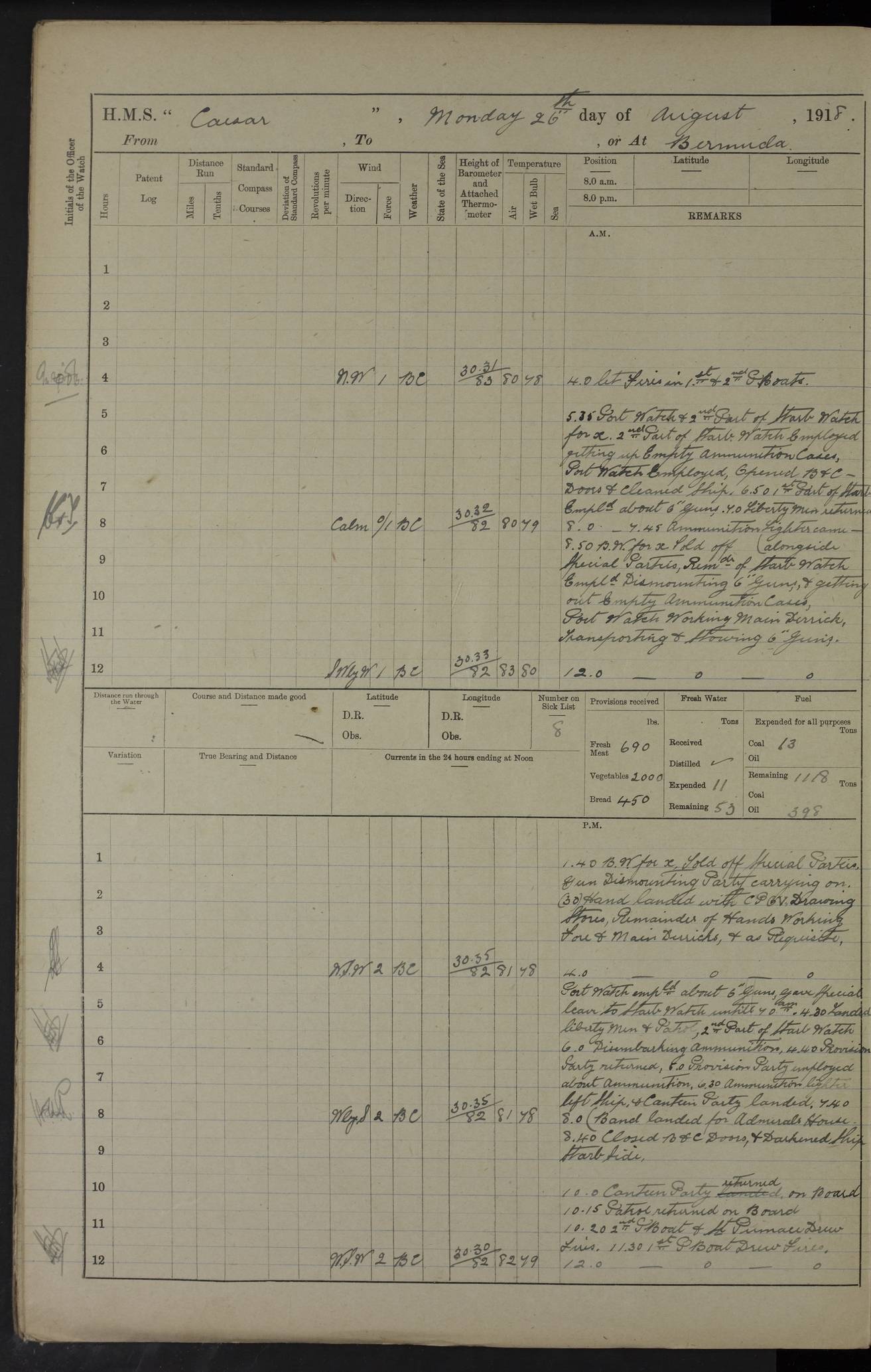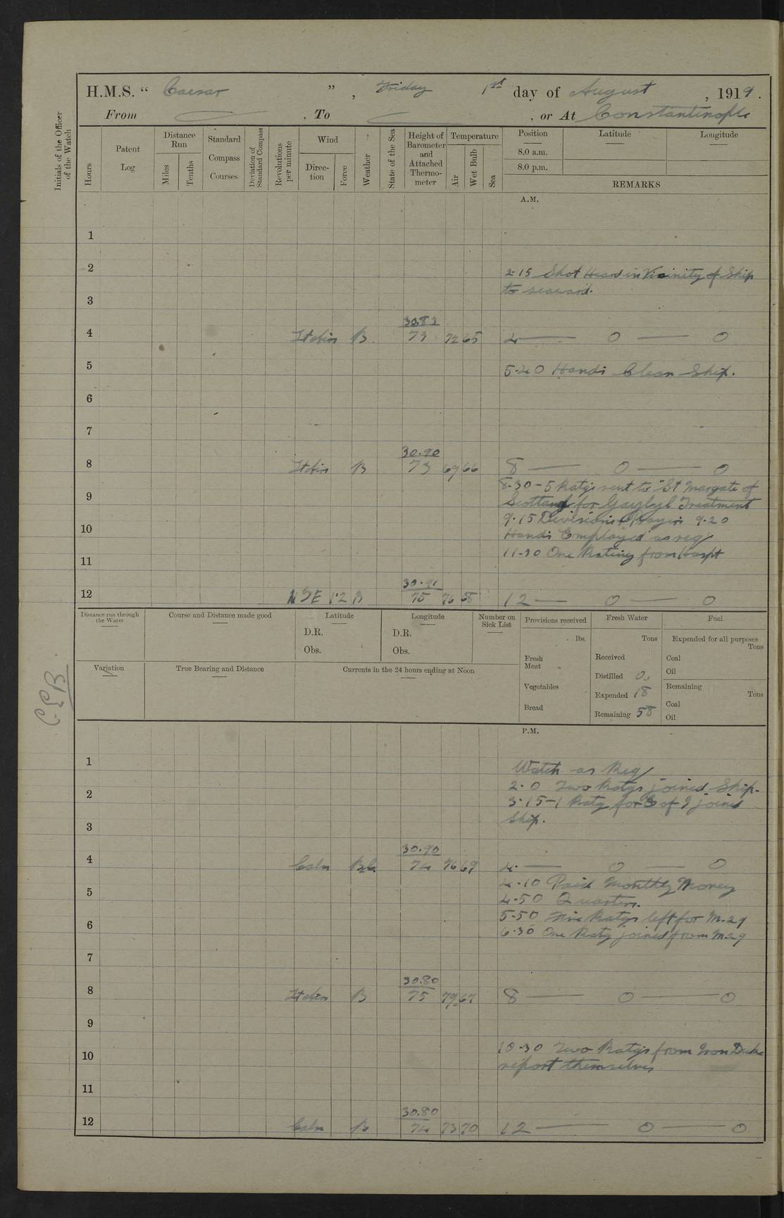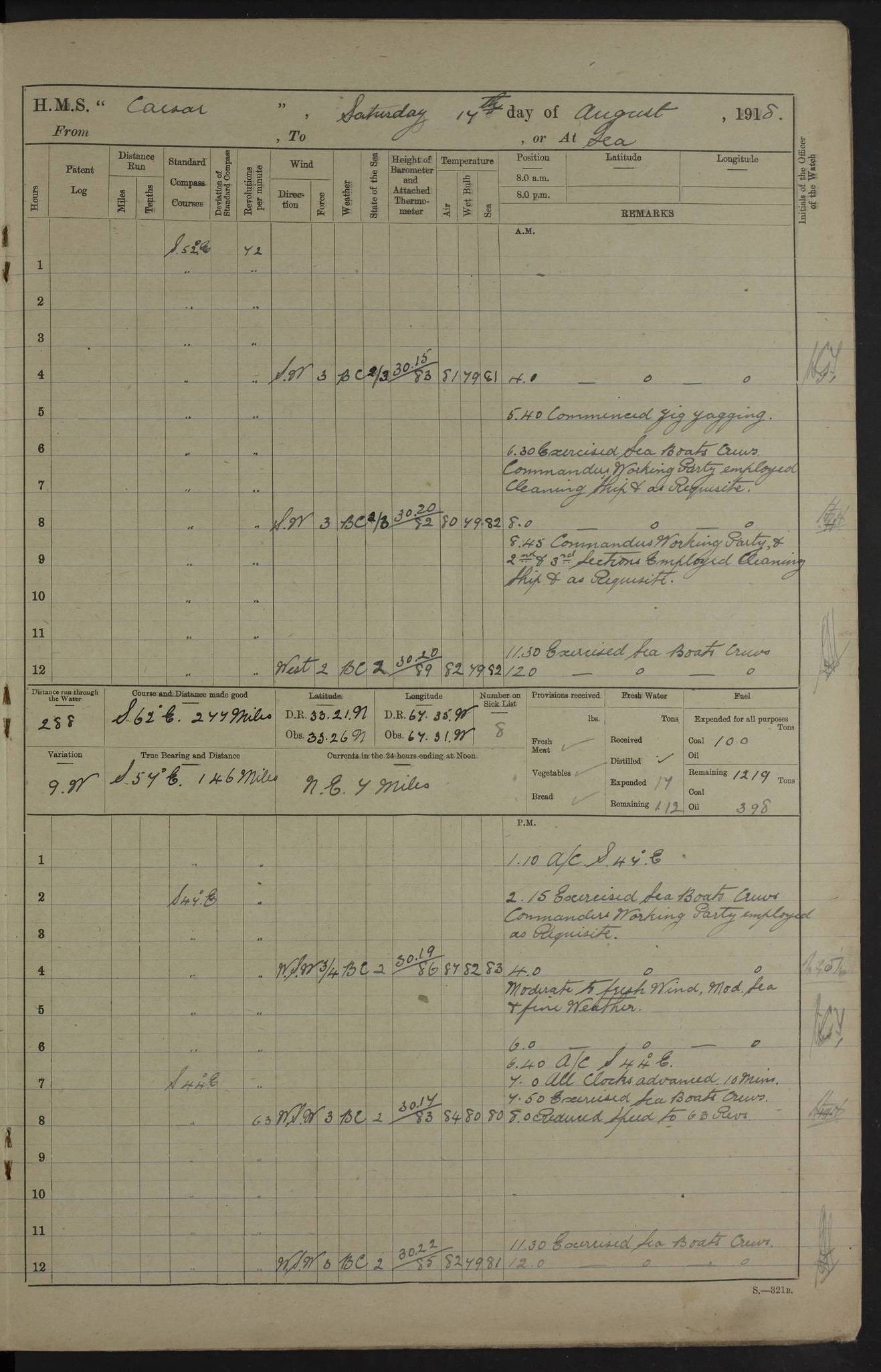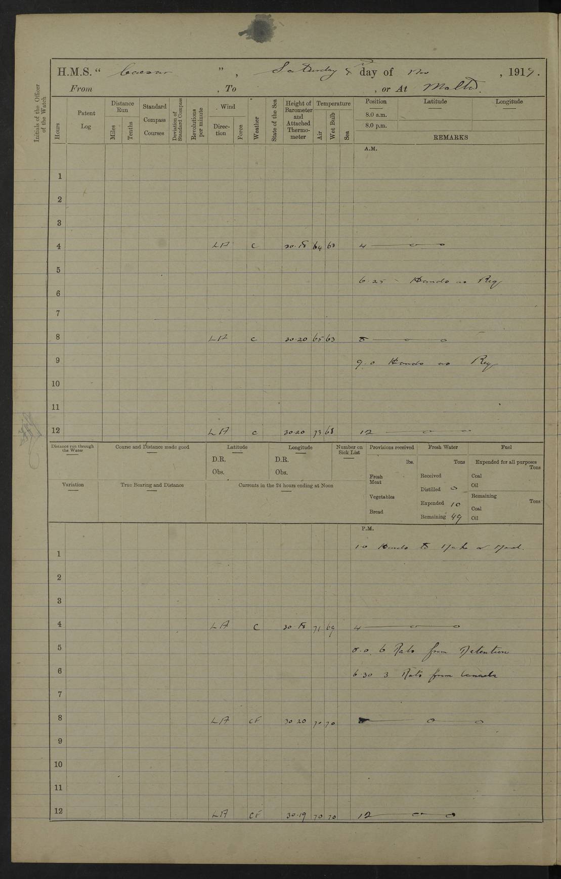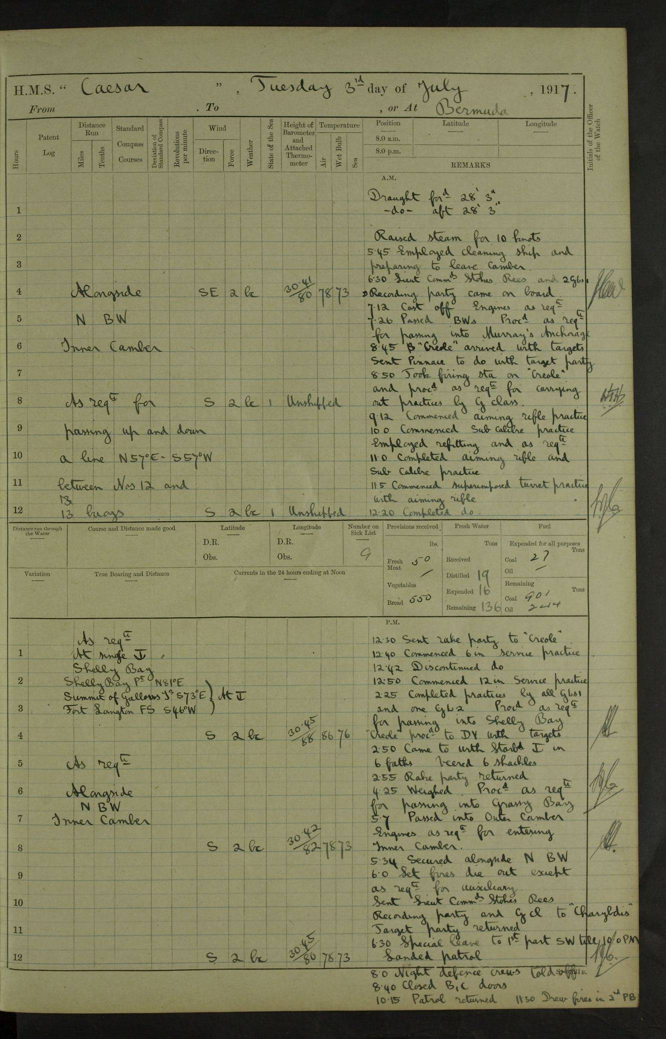Notes: 1. Latitude/longitude, including for days in port, show representative decimal positions for each day, as calculated by the Old Weather project's analysis program. As such, they differ by varying amounts from the positions recorded, usually at noon, in the log pages. In addition, some latitudes/longitudes have been amended in edited logs for errors in the logs, for errors in identifying locations by the analysis program, or simply for greater accuracy. In all cases, refer to the log-page scans for the positions as originally recorded. Not all log pages contain this information and the ships' positions have therefore often been estimated. 2. Full account of any day is available by clicking on the link above that day. Groups of links refer to log book covers and introductory information; some may be blank. Editor’s notes: Positions (Latitude and Longitude) are given for noon each day, correcting or estimating the position when appropriate. These positions are shown to two decimal places, even when approximate, to indicate when Caesar has moved short distances, particularly when engaged in gunnery practice. If exact times are not indicated in the log they have, when appropriate, been estimated from the position of the entries (which show times on the left hand side of the log page). A note is made of numbers on the sick list where this is 5 or more. This and other information from the log is included in square brackets [not in italics] if it is not to be found under “Remarks” on the right hand side of the page. Additional information about geographical locations, terminology and about merchant and foreign naval ships encountered has been provided where identification is reasonably certain, by means of embedded links within the text. |