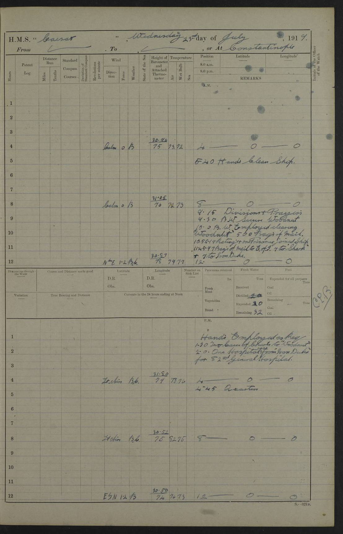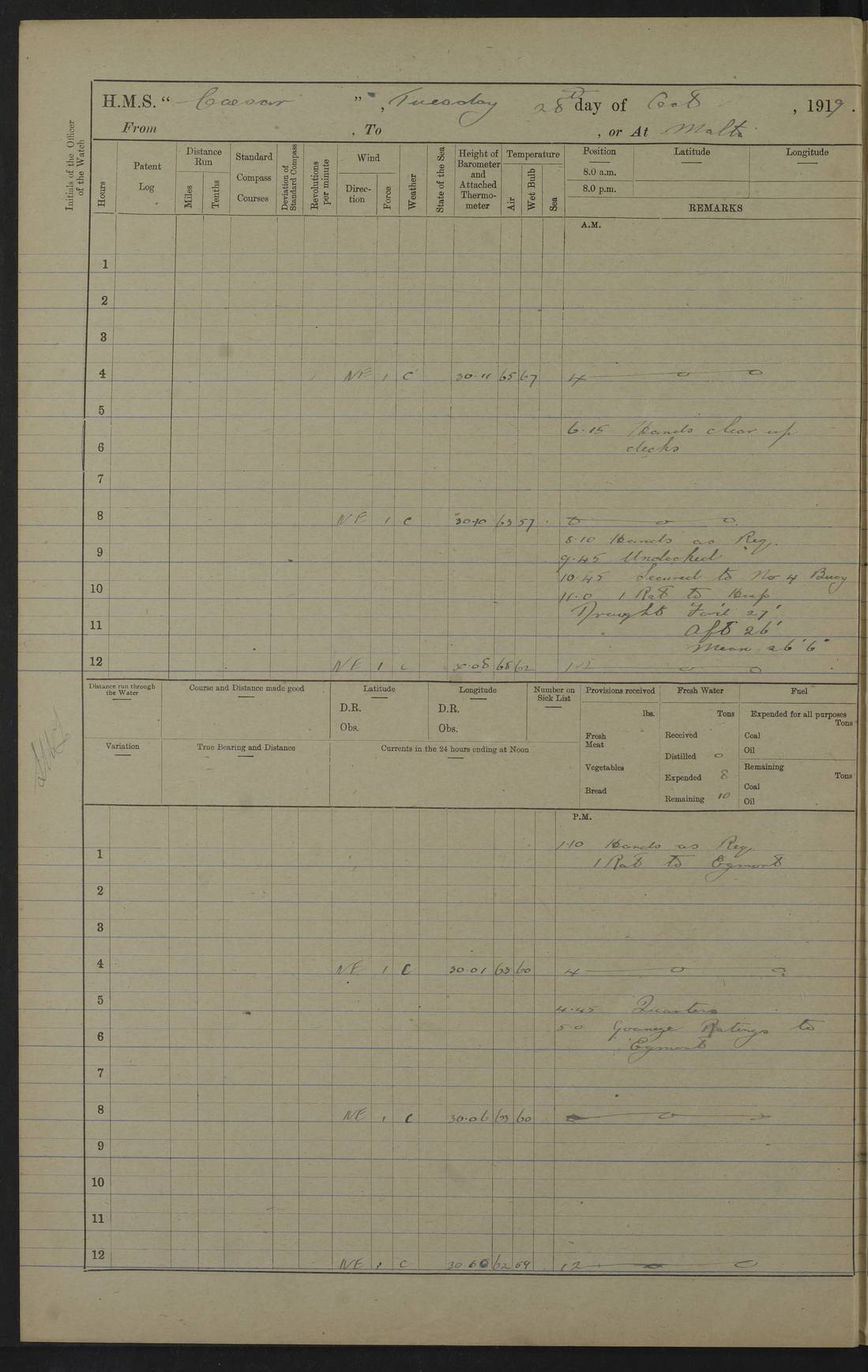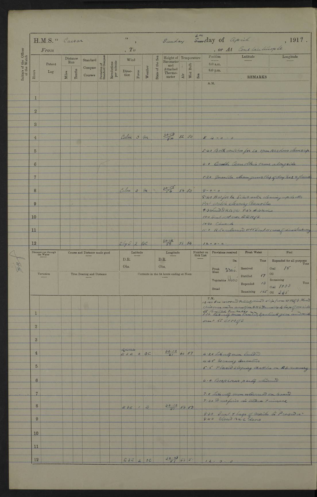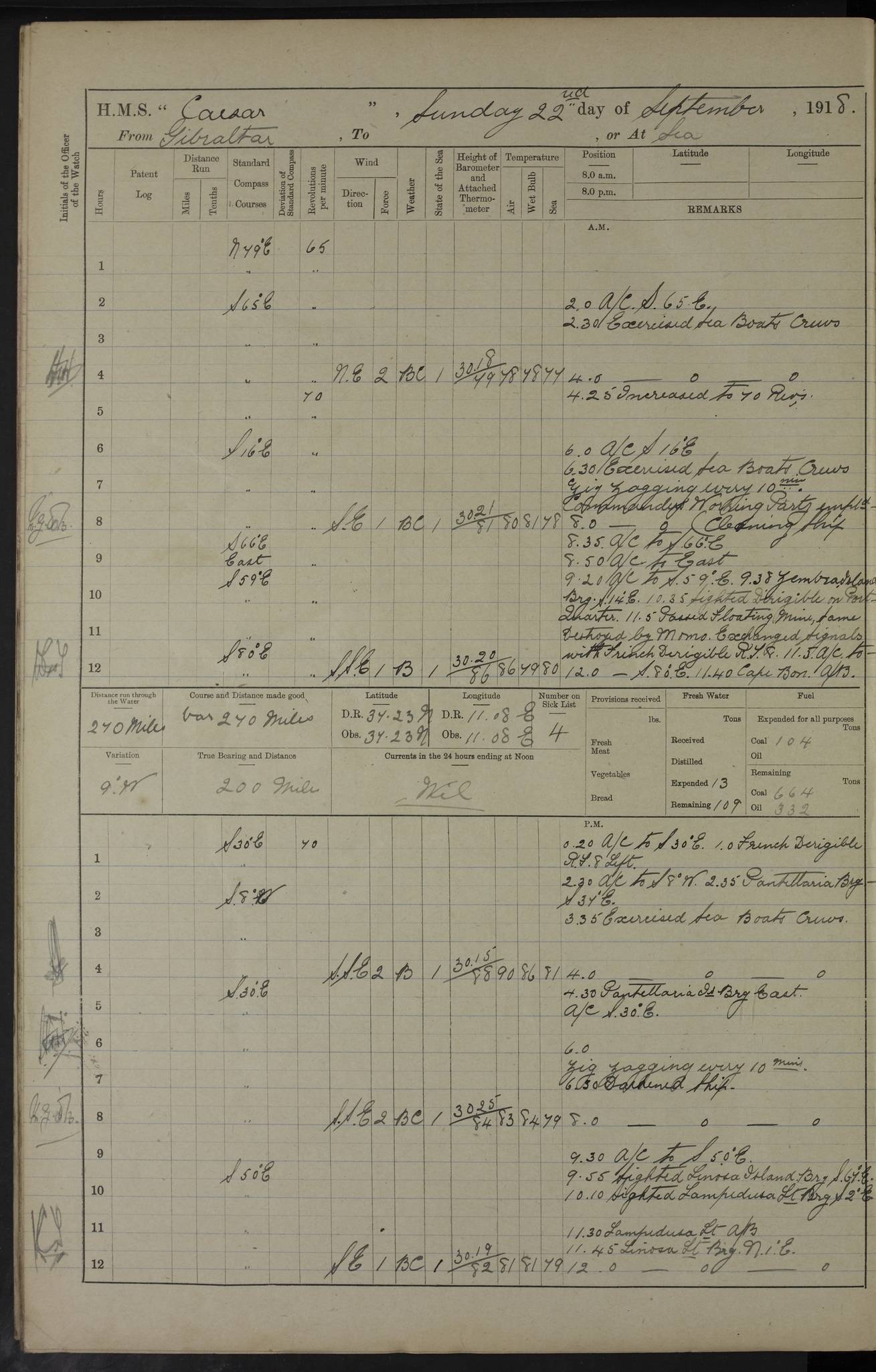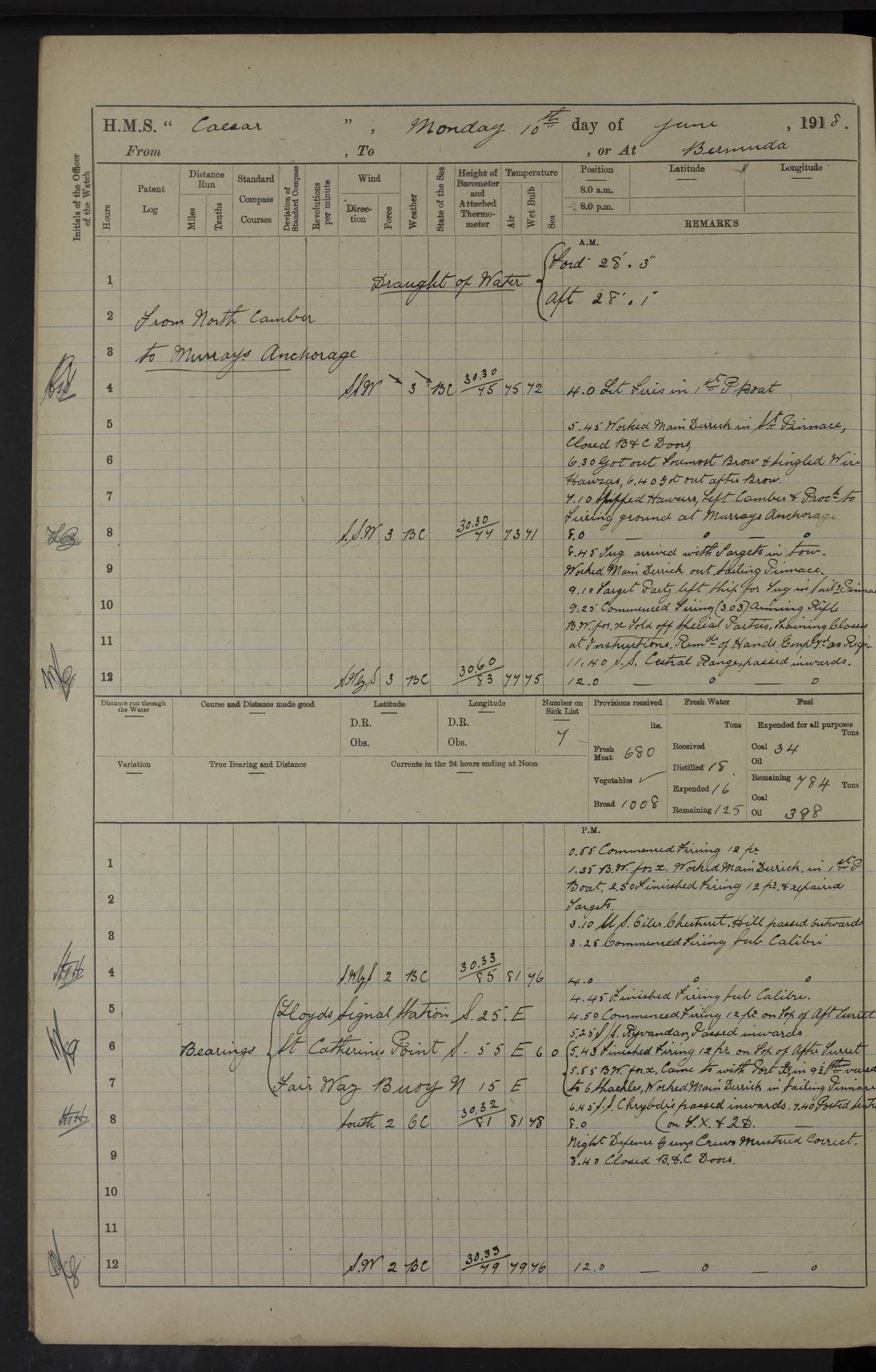 Notes: 1. Latitude/longitude, including for days in port, show representative decimal positions for each day, as calculated by the Old Weather project's analysis program. As such, they differ by varying amounts from the positions recorded, usually at noon, in the log pages. In addition, some latitudes/longitudes have been amended in edited logs for errors in the logs, for errors in identifying locations by the analysis program, or simply for greater accuracy. In all cases, refer to the log-page scans for the positions as originally recorded. Not all log pages contain this information and the ships' positions have therefore often been estimated. 2. Full account of any day is available by clicking on the link above that day. Groups of links refer to log book covers and introductory information; some may be blank. Editor’s notes: Positions (Latitude and Longitude) are given for noon each day, correcting or estimating the position when appropriate. These positions are shown to two decimal places, even when approximate, to indicate when Caesar has moved short distances, particularly when engaged in gunnery practice. If exact times are not indicated in the log they have, when appropriate, been estimated from the position of the entries (which show times on the left hand side of the log page). A note is made of numbers on the sick list where this is 5 or more. This and other information from the log is included in square brackets [not in italics] if it is not to be found under “Remarks” on the right hand side of the page. Additional information about geographical locations, terminology and about merchant and foreign naval ships encountered has been provided where identification is reasonably certain, by means of embedded links within the text. |