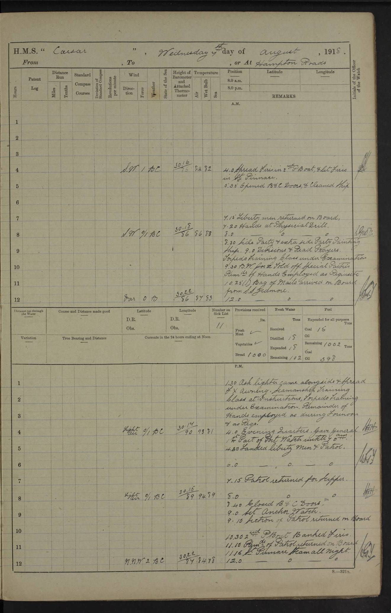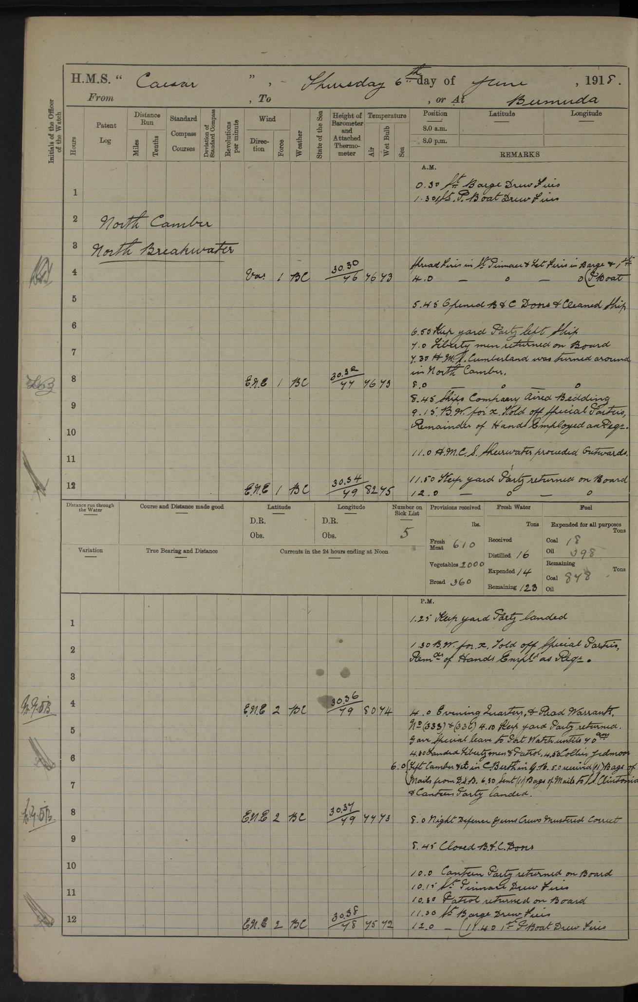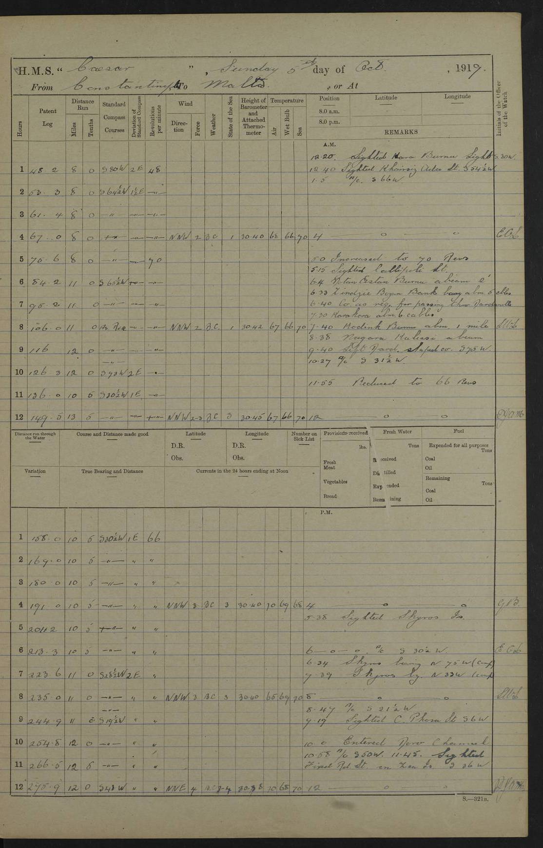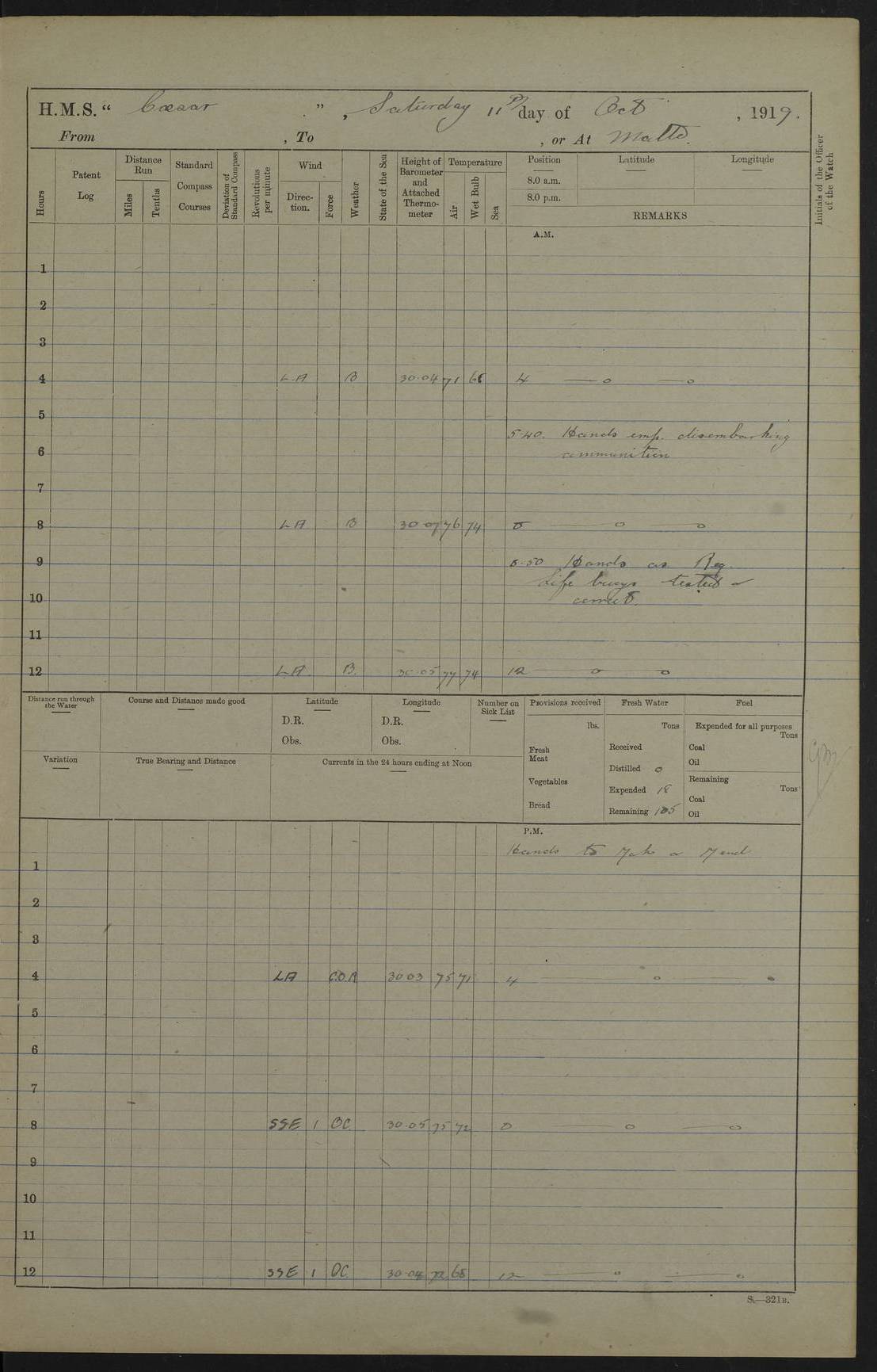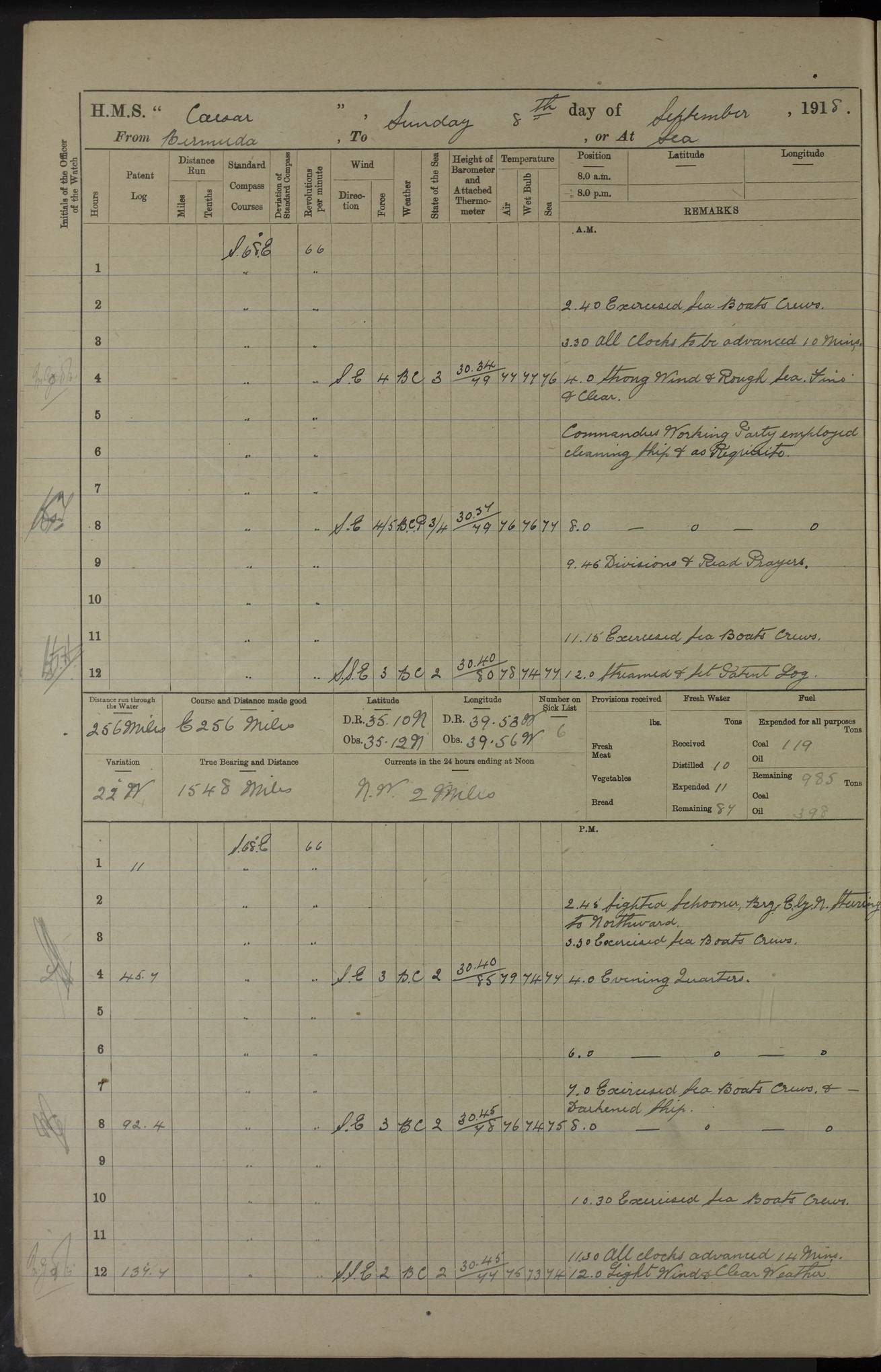 Notes: 1. Latitude/longitude, including for days in port, show representative decimal positions for each day, as calculated by the Old Weather project's analysis program. As such, they differ by varying amounts from the positions recorded, usually at noon, in the log pages. In addition, some latitudes/longitudes have been amended in edited logs for errors in the logs, for errors in identifying locations by the analysis program, or simply for greater accuracy. In all cases, refer to the log-page scans for the positions as originally recorded. Not all log pages contain this information and the ships' positions have therefore often been estimated. 2. Full account of any day is available by clicking on the link above that day. Groups of links refer to log book covers and introductory information; some may be blank. Editor’s notes: Positions (Latitude and Longitude) are given for noon each day, correcting or estimating the position when appropriate. These positions are shown to two decimal places, even when approximate, to indicate when Caesar has moved short distances, particularly when engaged in gunnery practice. If exact times are not indicated in the log they have, when appropriate, been estimated from the position of the entries (which show times on the left hand side of the log page). A note is made of numbers on the sick list where this is 5 or more. This and other information from the log is included in square brackets [not in italics] if it is not to be found under “Remarks” on the right hand side of the page. Additional information about geographical locations, terminology and about merchant and foreign naval ships encountered has been provided where identification is reasonably certain, by means of embedded links within the text. |