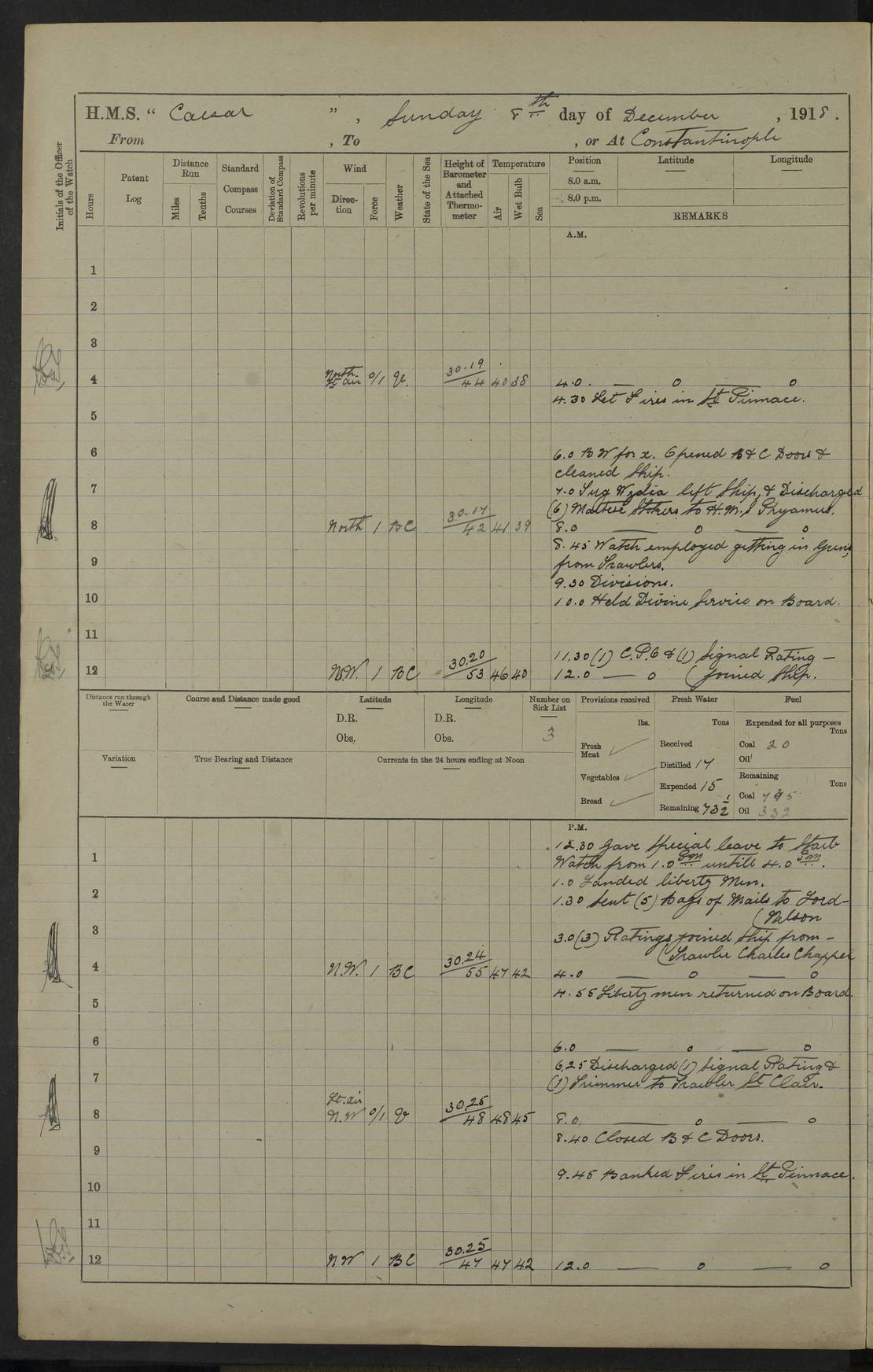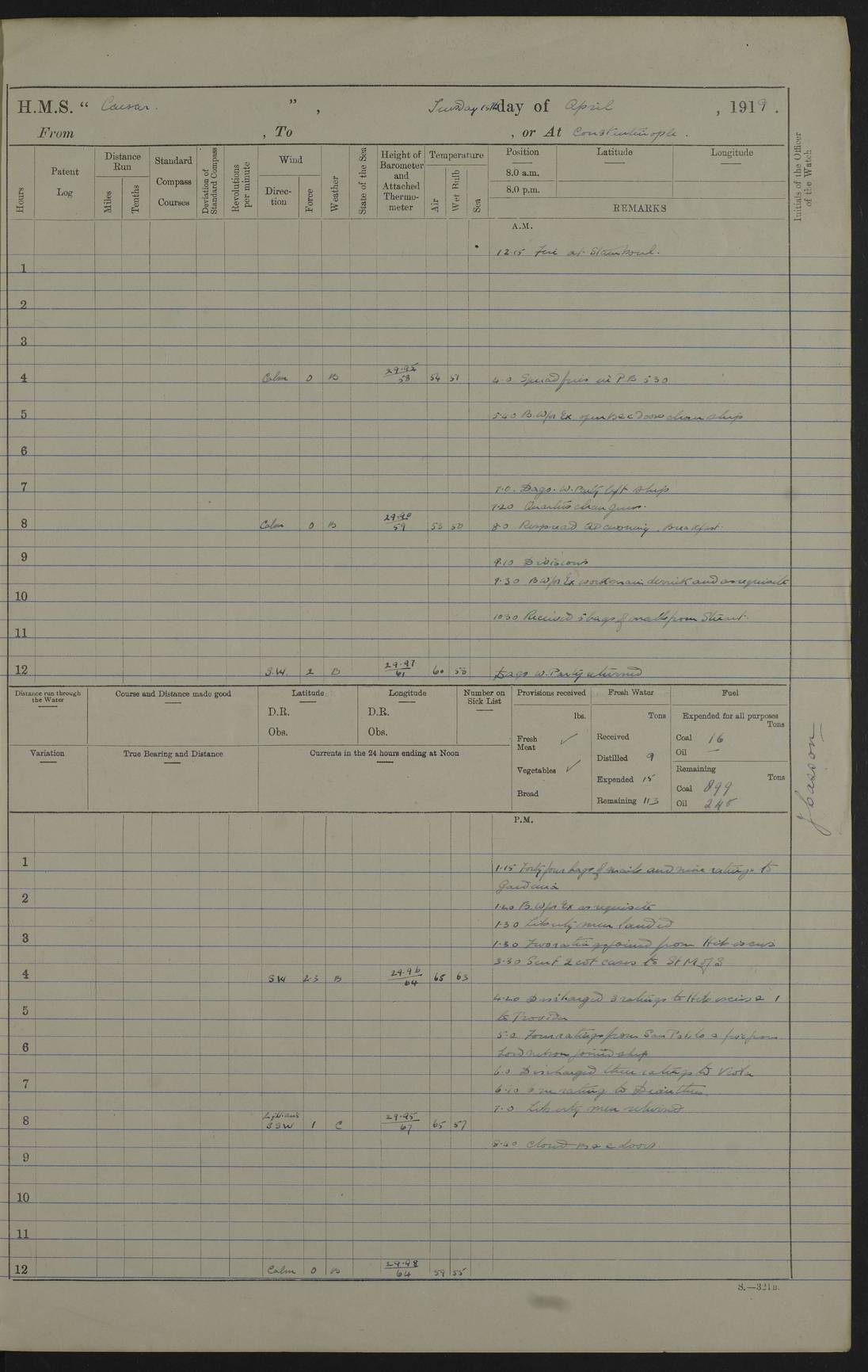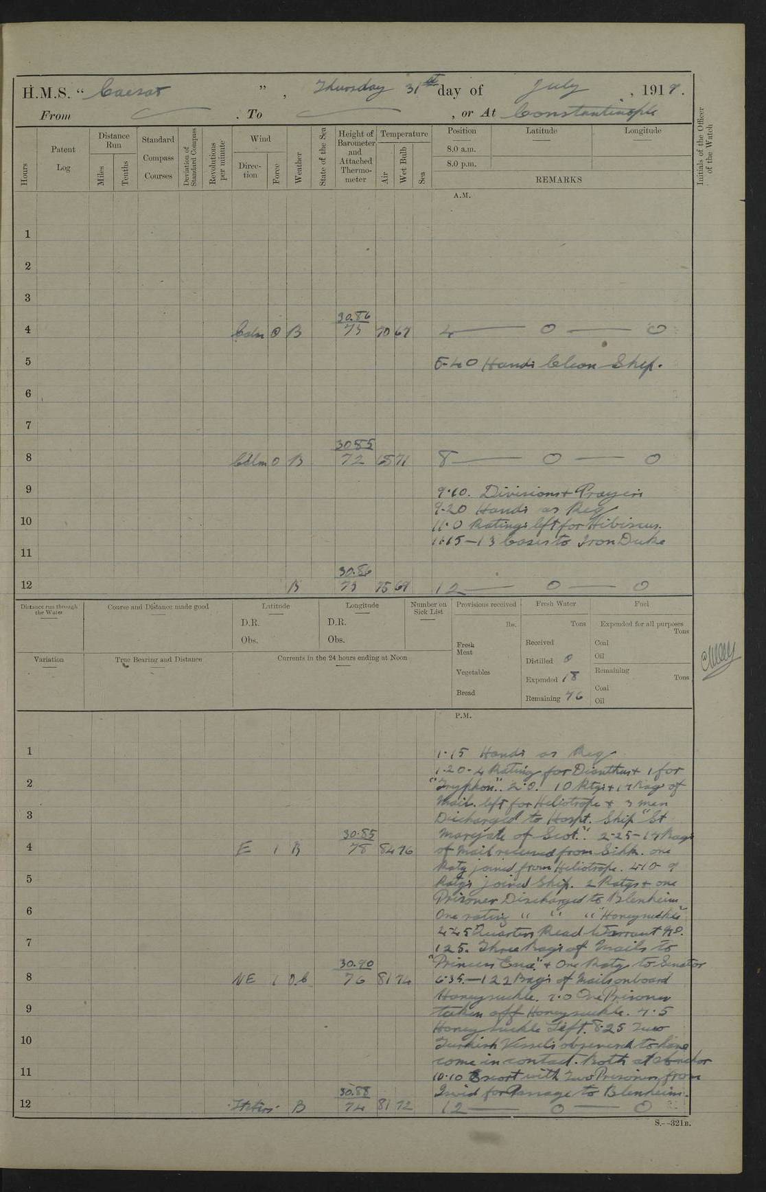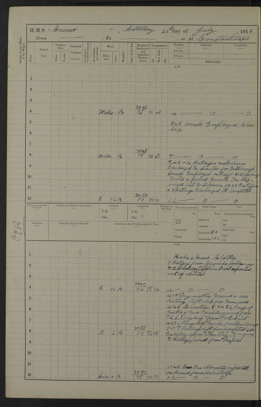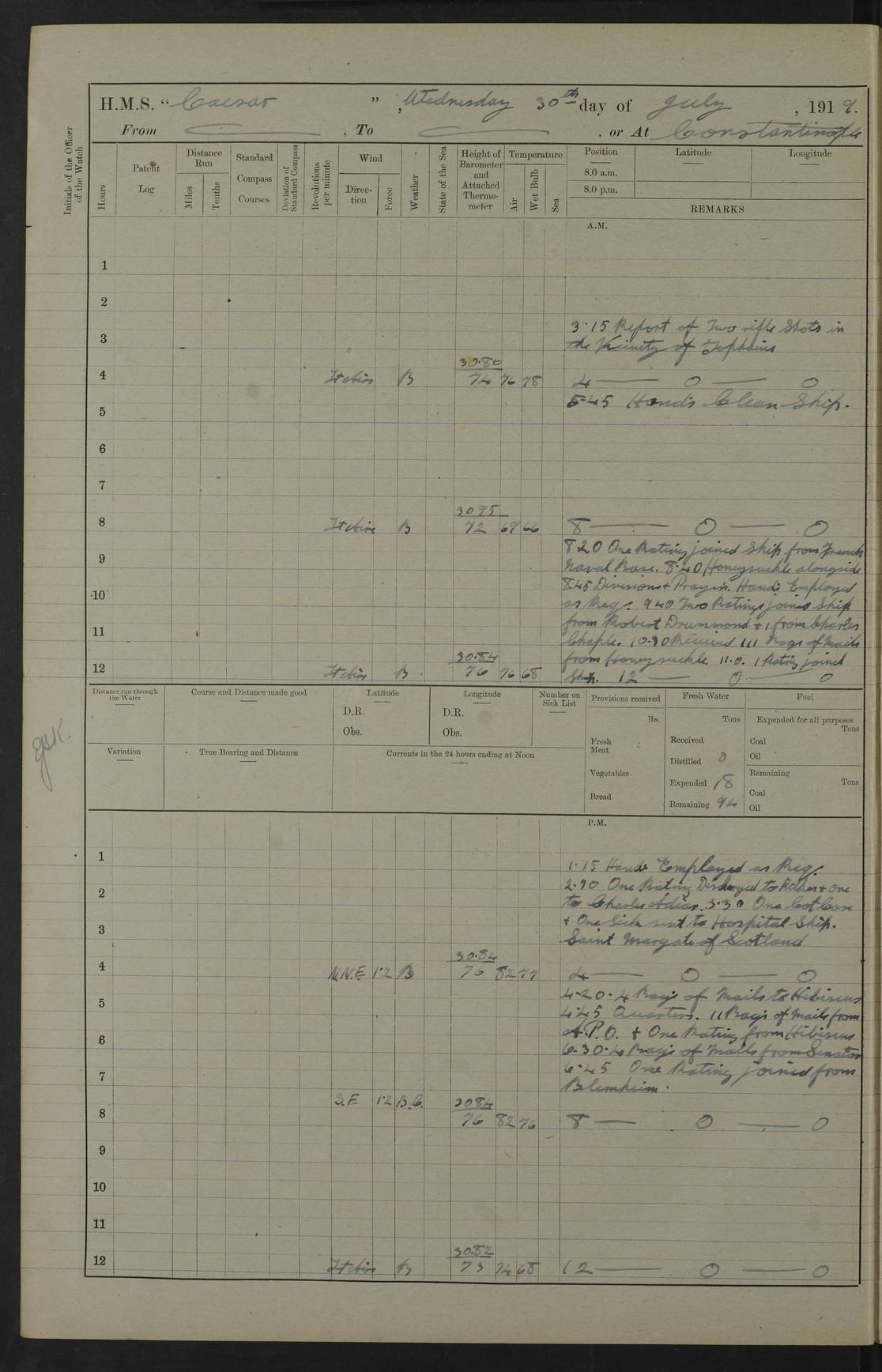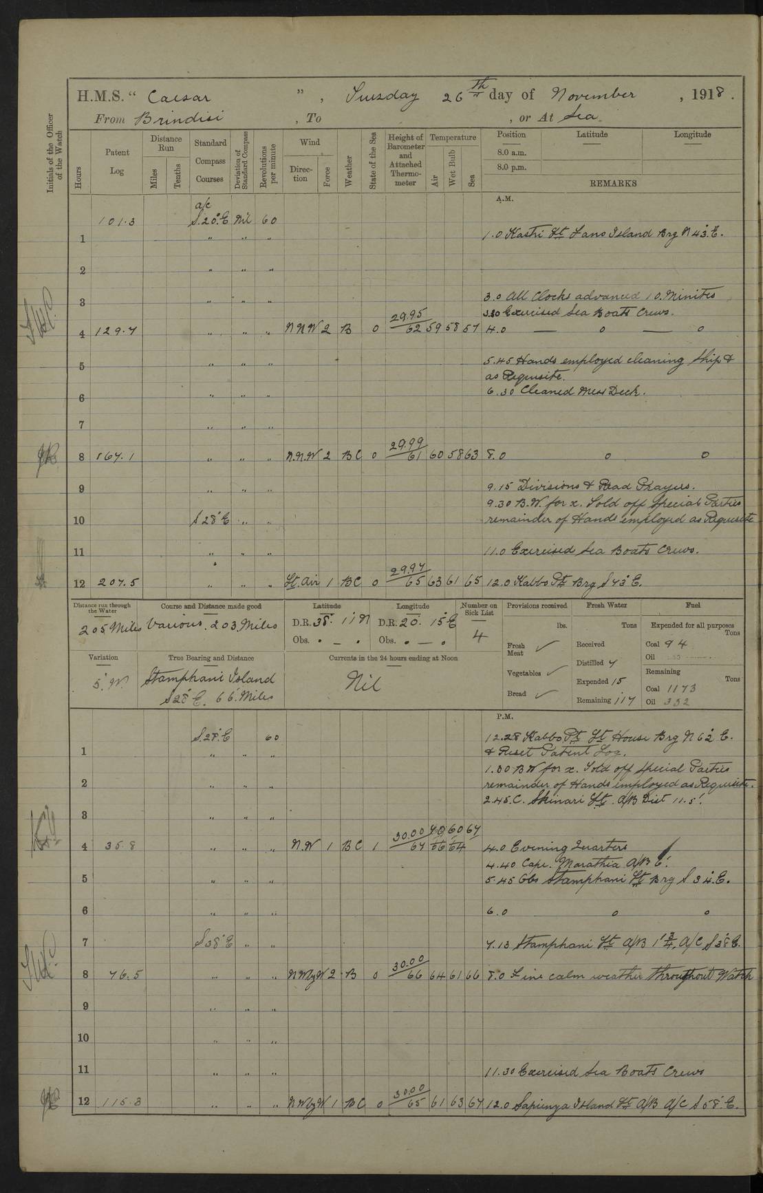 Notes: 1. Latitude/longitude, including for days in port, show representative decimal positions for each day, as calculated by the Old Weather project's analysis program. As such, they differ by varying amounts from the positions recorded, usually at noon, in the log pages. In addition, some latitudes/longitudes have been amended in edited logs for errors in the logs, for errors in identifying locations by the analysis program, or simply for greater accuracy. In all cases, refer to the log-page scans for the positions as originally recorded. Not all log pages contain this information and the ships' positions have therefore often been estimated. 2. Full account of any day is available by clicking on the link above that day. Groups of links refer to log book covers and introductory information; some may be blank. Editor’s notes: Positions (Latitude and Longitude) are given for noon each day, correcting or estimating the position when appropriate. These positions are shown to two decimal places, even when approximate, to indicate when Caesar has moved short distances, particularly when engaged in gunnery practice. If exact times are not indicated in the log they have, when appropriate, been estimated from the position of the entries (which show times on the left hand side of the log page). A note is made of numbers on the sick list where this is 5 or more. This and other information from the log is included in square brackets [not in italics] if it is not to be found under “Remarks” on the right hand side of the page. Additional information about geographical locations, terminology and about merchant and foreign naval ships encountered has been provided where identification is reasonably certain, by means of embedded links within the text. |