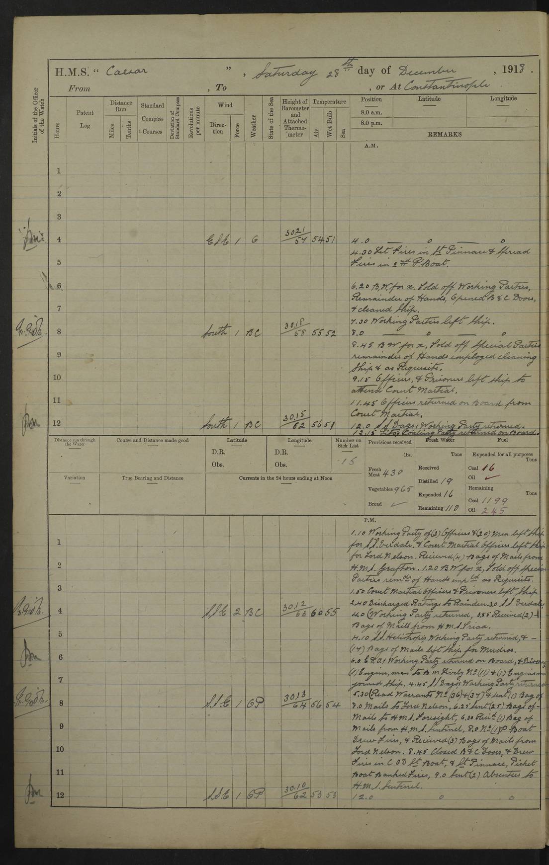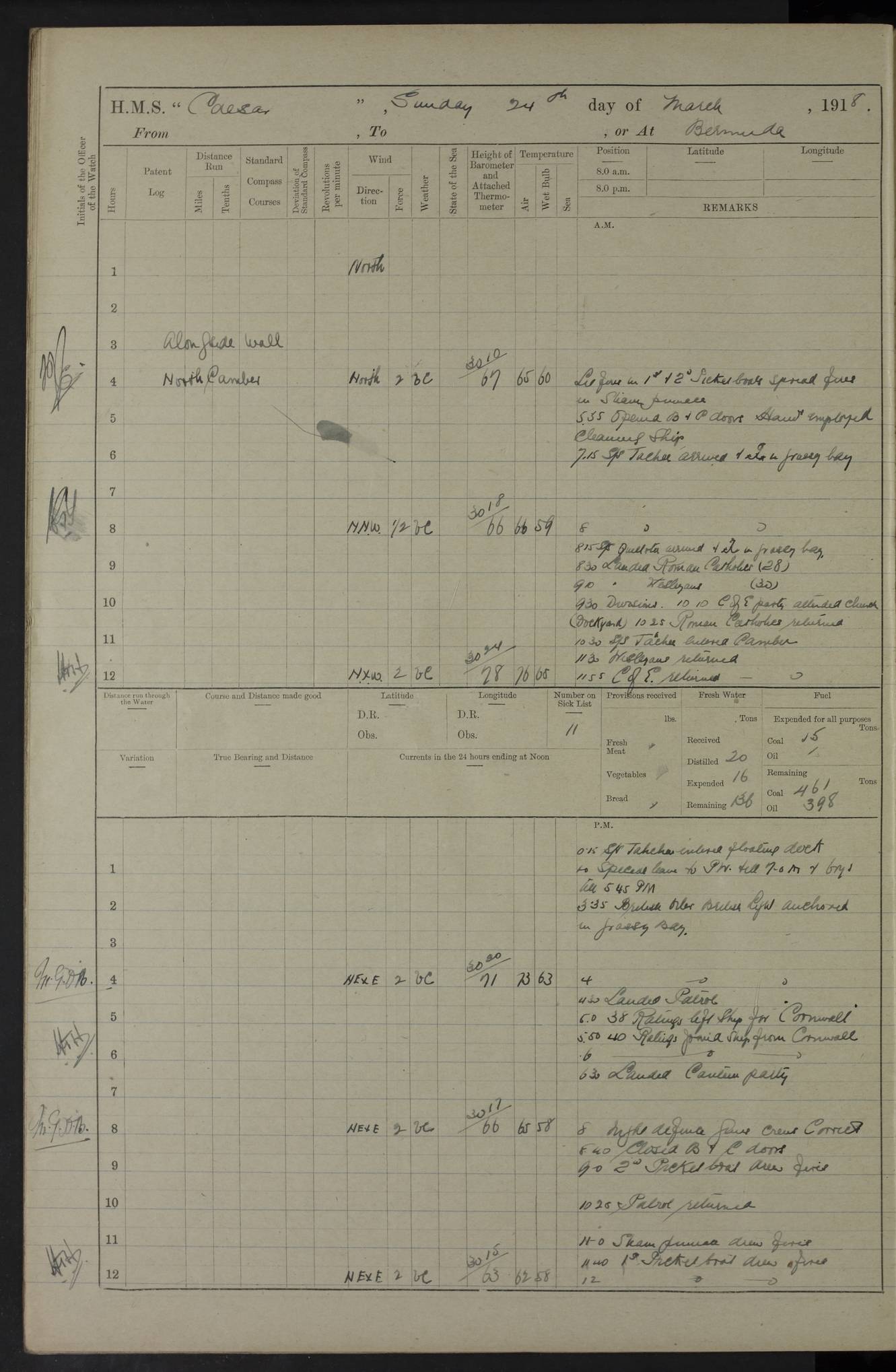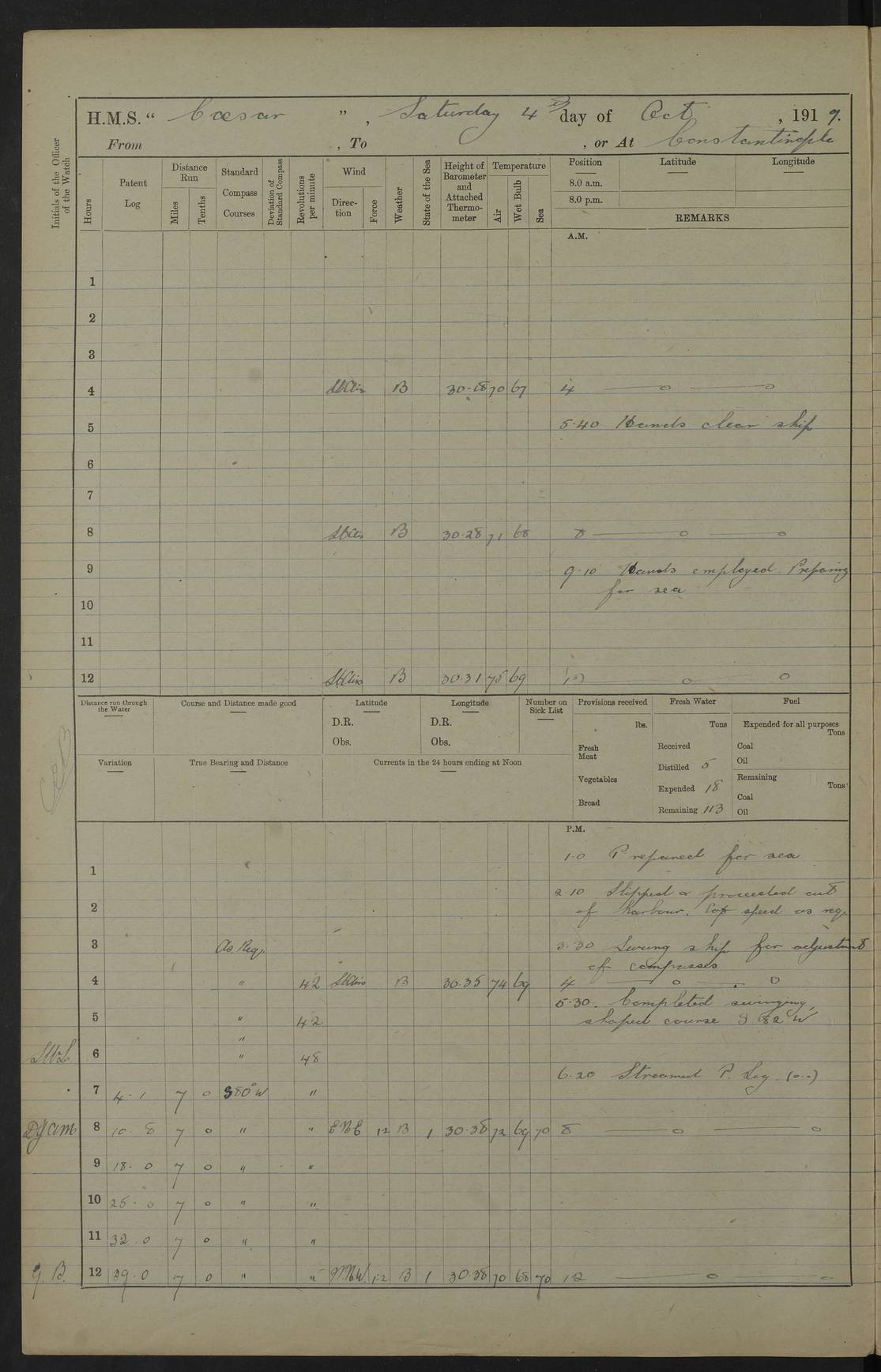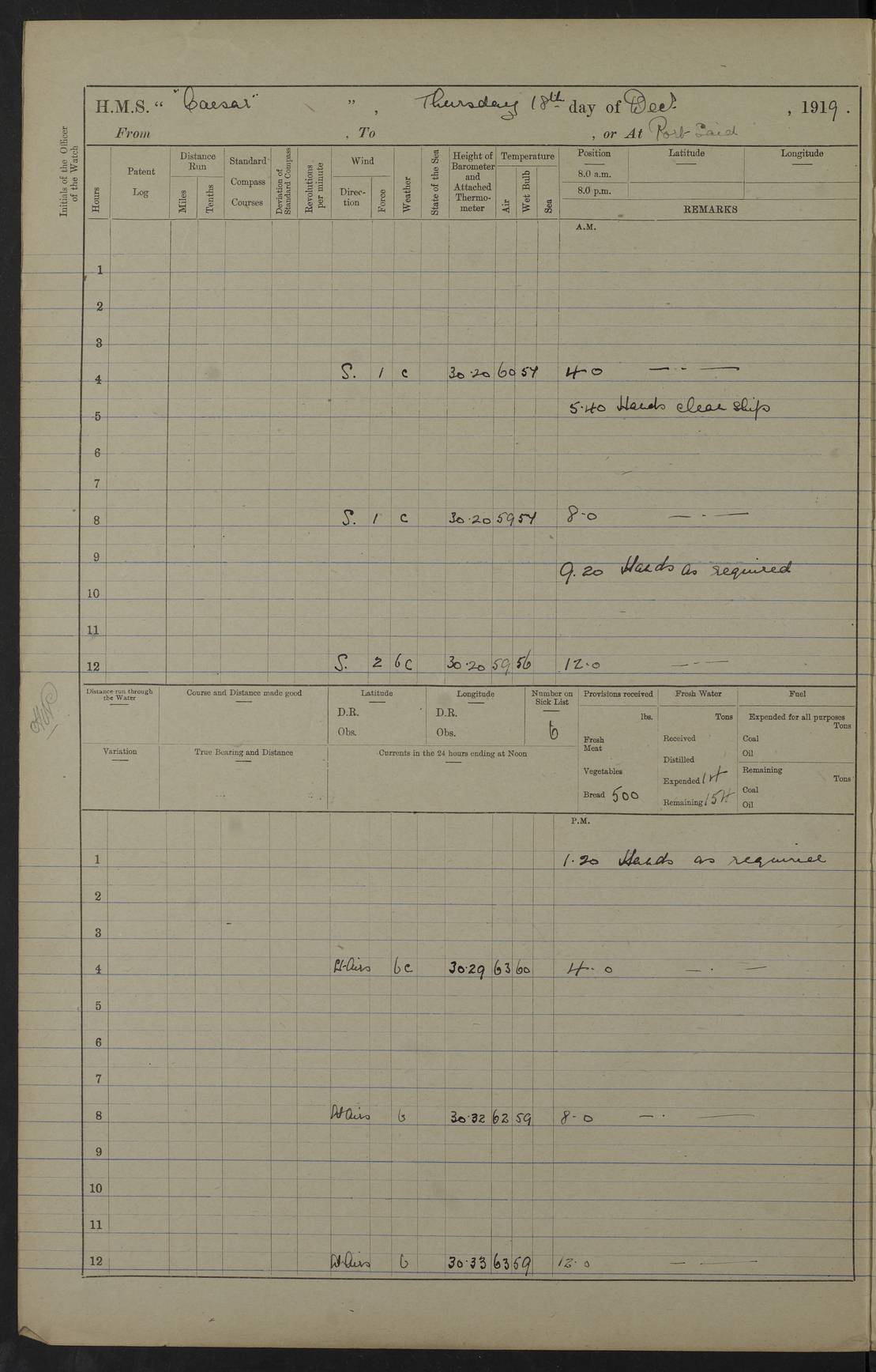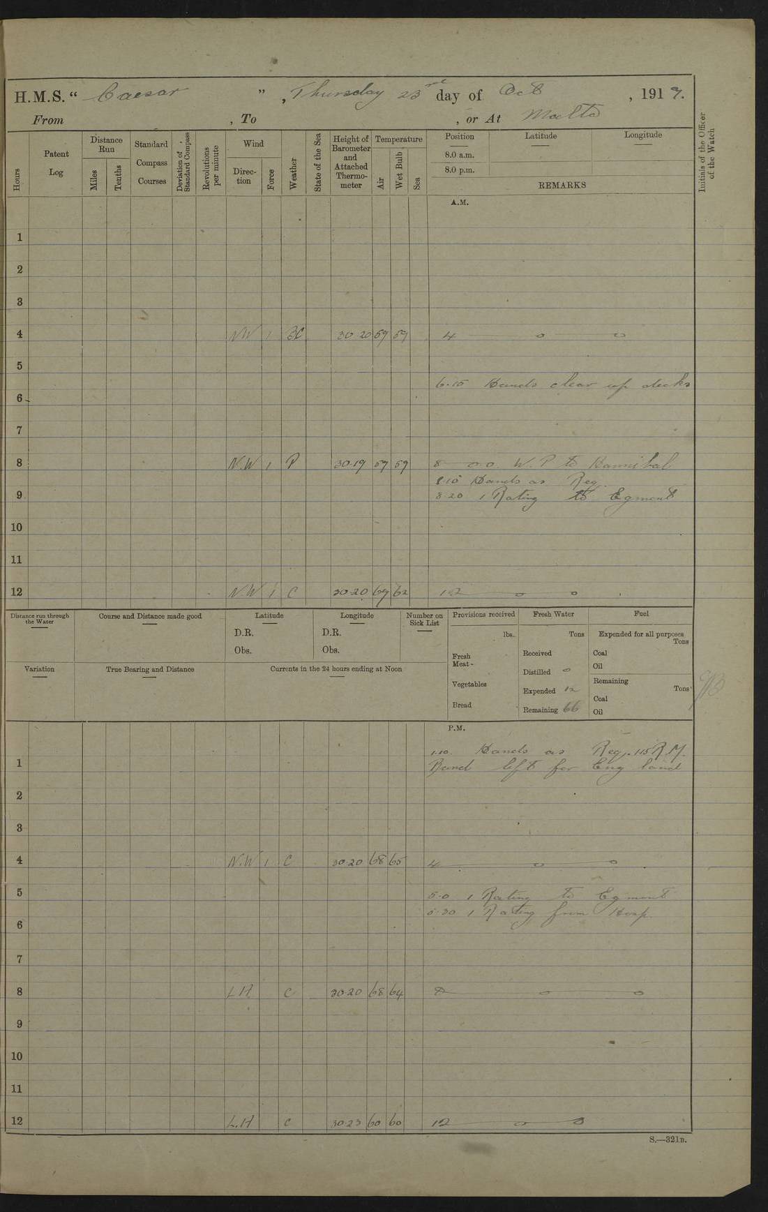 Notes: 1. Latitude/longitude, including for days in port, show representative decimal positions for each day, as calculated by the Old Weather project's analysis program. As such, they differ by varying amounts from the positions recorded, usually at noon, in the log pages. In addition, some latitudes/longitudes have been amended in edited logs for errors in the logs, for errors in identifying locations by the analysis program, or simply for greater accuracy. In all cases, refer to the log-page scans for the positions as originally recorded. Not all log pages contain this information and the ships' positions have therefore often been estimated. 2. Full account of any day is available by clicking on the link above that day. Groups of links refer to log book covers and introductory information; some may be blank. Editor’s notes: Positions (Latitude and Longitude) are given for noon each day, correcting or estimating the position when appropriate. These positions are shown to two decimal places, even when approximate, to indicate when Caesar has moved short distances, particularly when engaged in gunnery practice. If exact times are not indicated in the log they have, when appropriate, been estimated from the position of the entries (which show times on the left hand side of the log page). A note is made of numbers on the sick list where this is 5 or more. This and other information from the log is included in square brackets [not in italics] if it is not to be found under “Remarks” on the right hand side of the page. Additional information about geographical locations, terminology and about merchant and foreign naval ships encountered has been provided where identification is reasonably certain, by means of embedded links within the text. |