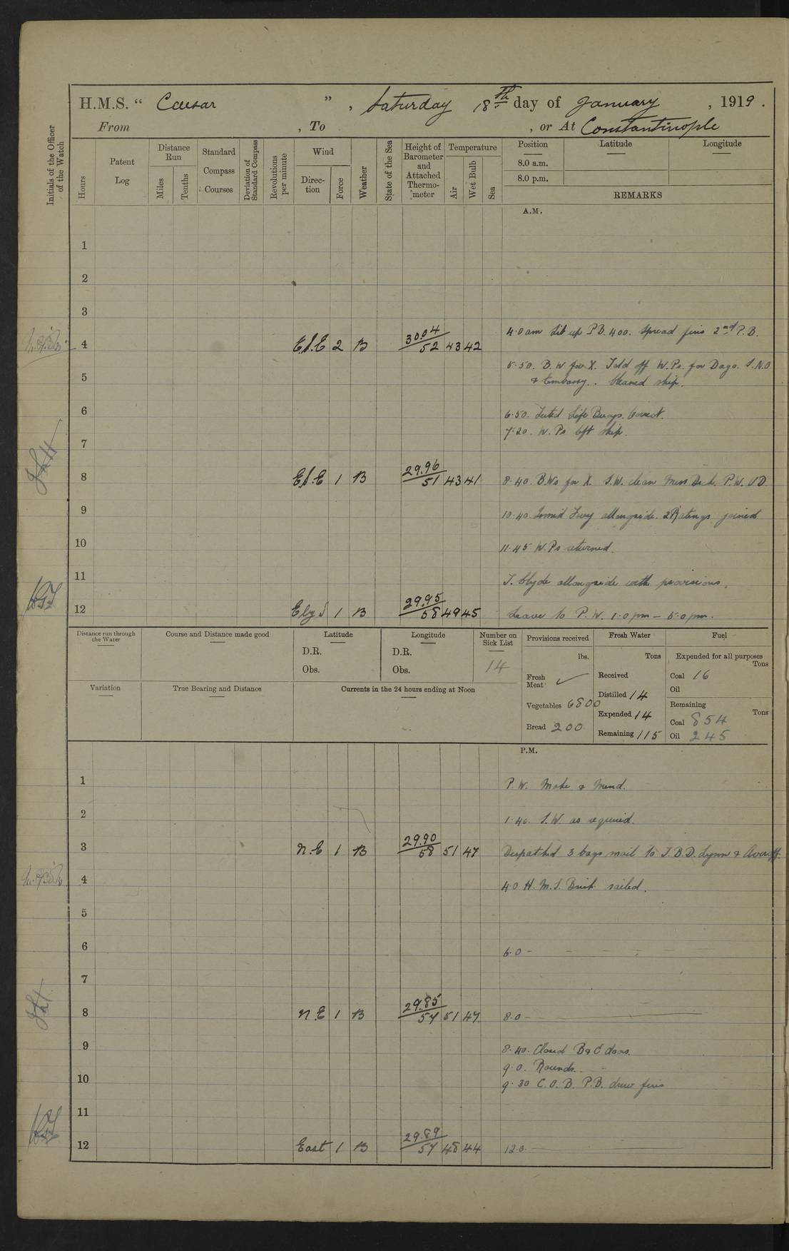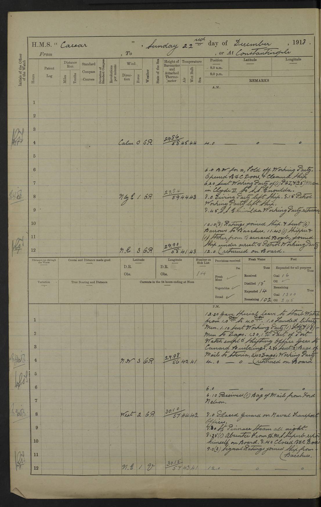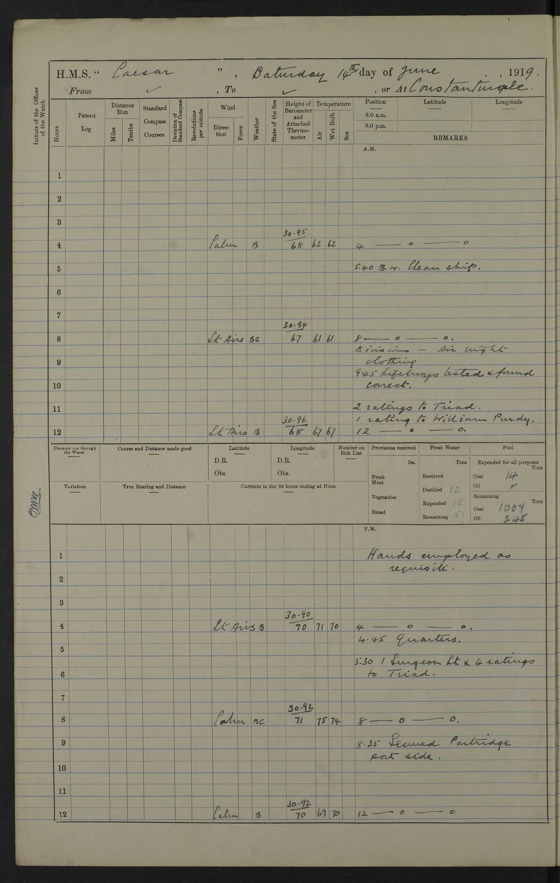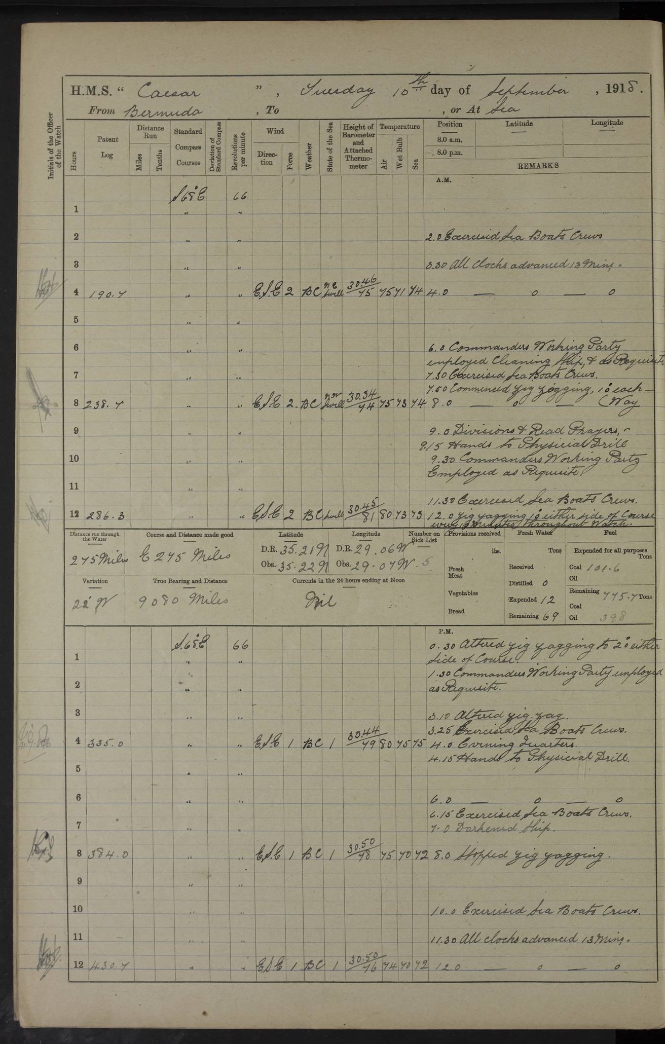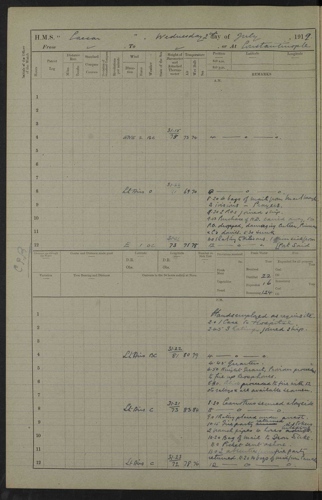 Notes: 1. Latitude/longitude, including for days in port, show representative decimal positions for each day, as calculated by the Old Weather project's analysis program. As such, they differ by varying amounts from the positions recorded, usually at noon, in the log pages. In addition, some latitudes/longitudes have been amended in edited logs for errors in the logs, for errors in identifying locations by the analysis program, or simply for greater accuracy. In all cases, refer to the log-page scans for the positions as originally recorded. Not all log pages contain this information and the ships' positions have therefore often been estimated. 2. Full account of any day is available by clicking on the link above that day. Groups of links refer to log book covers and introductory information; some may be blank. Editor’s notes: Positions (Latitude and Longitude) are given for noon each day, correcting or estimating the position when appropriate. These positions are shown to two decimal places, even when approximate, to indicate when Caesar has moved short distances, particularly when engaged in gunnery practice. If exact times are not indicated in the log they have, when appropriate, been estimated from the position of the entries (which show times on the left hand side of the log page). A note is made of numbers on the sick list where this is 5 or more. This and other information from the log is included in square brackets [not in italics] if it is not to be found under “Remarks” on the right hand side of the page. Additional information about geographical locations, terminology and about merchant and foreign naval ships encountered has been provided where identification is reasonably certain, by means of embedded links within the text. |