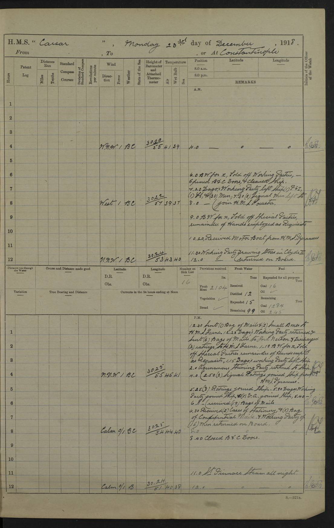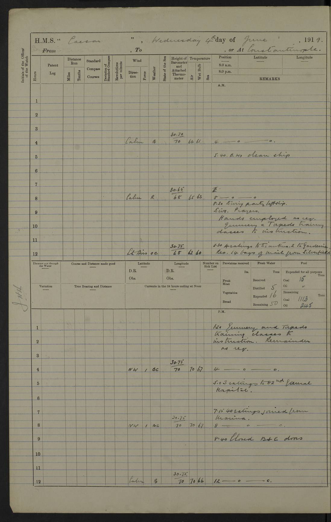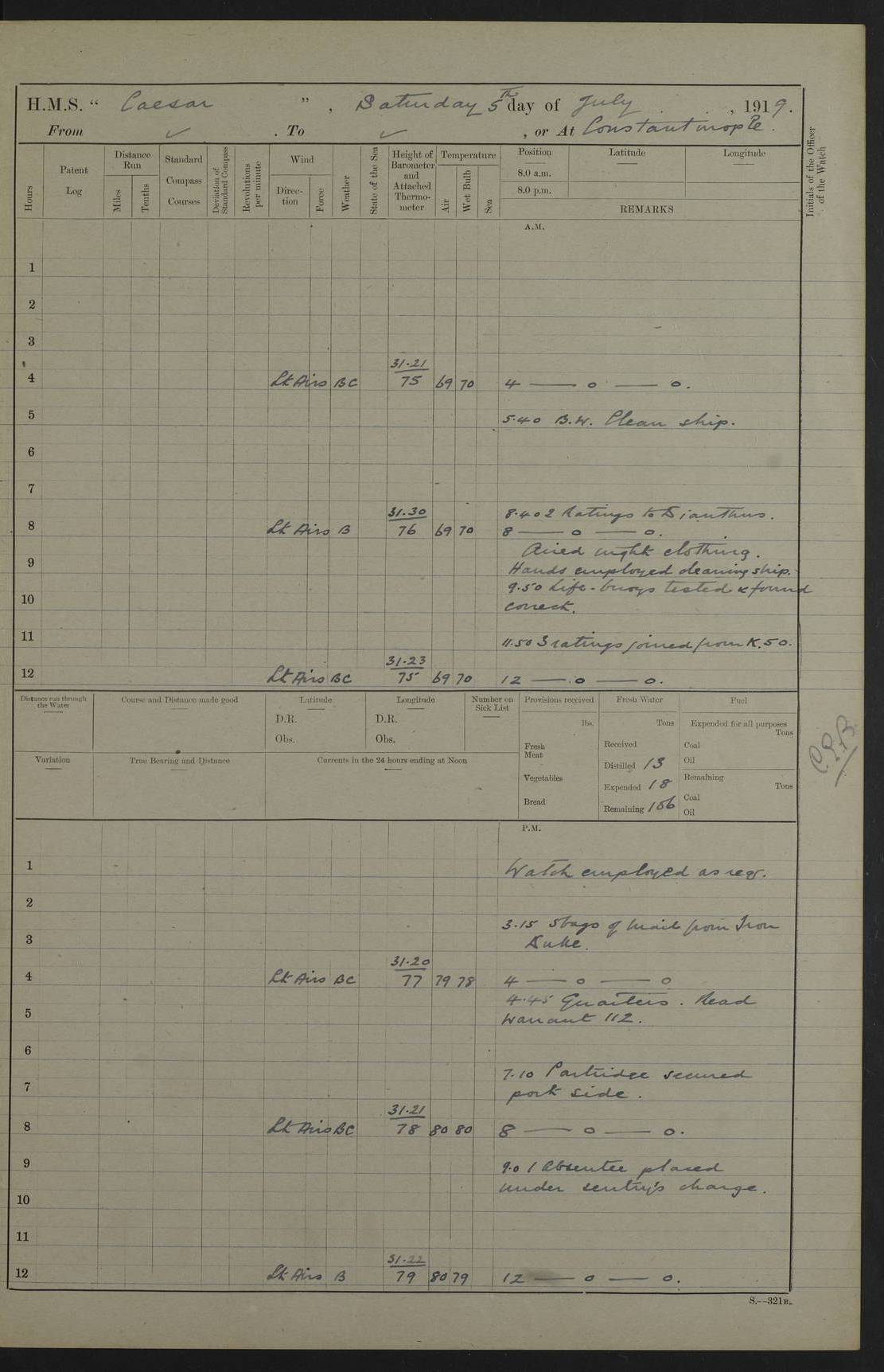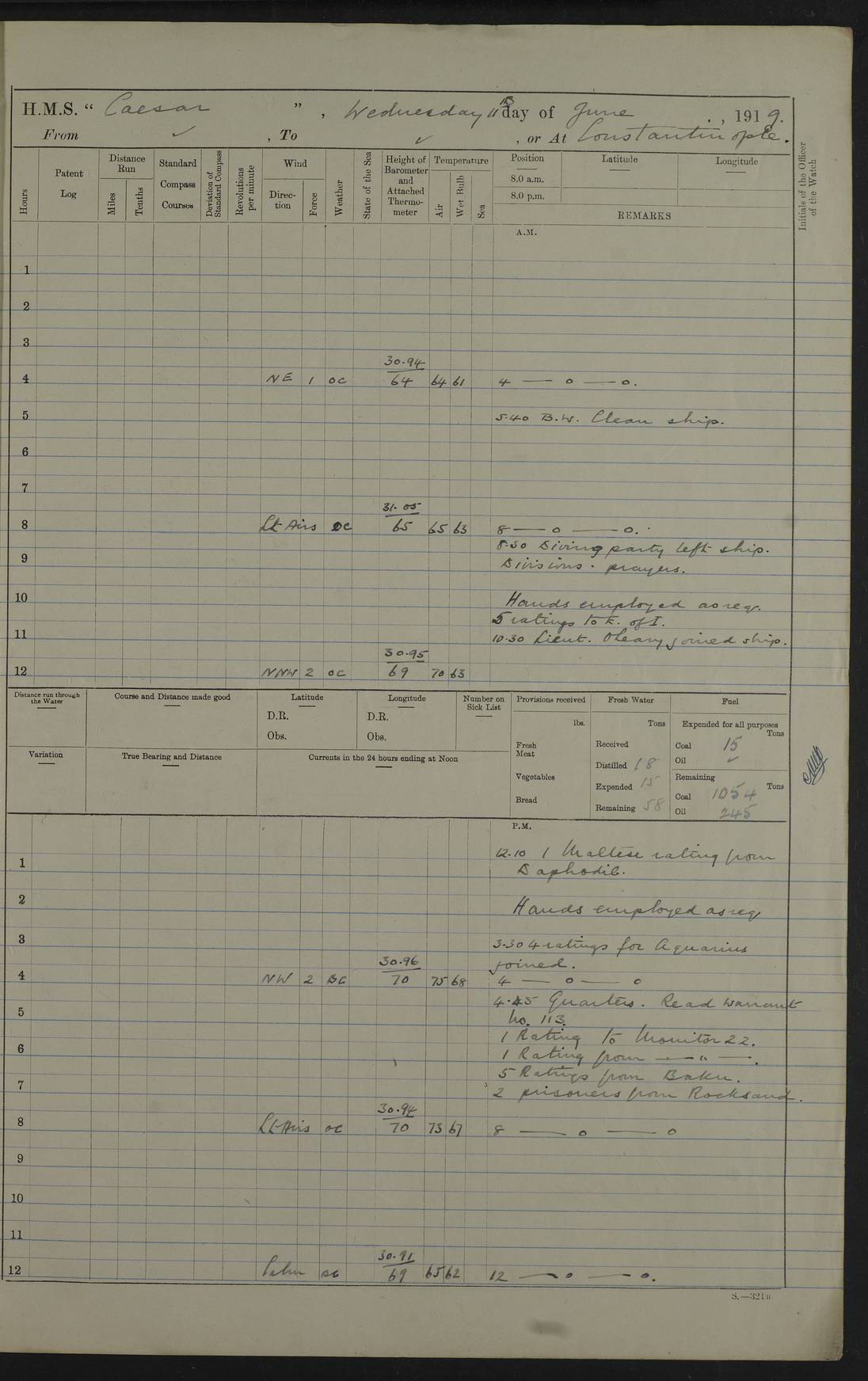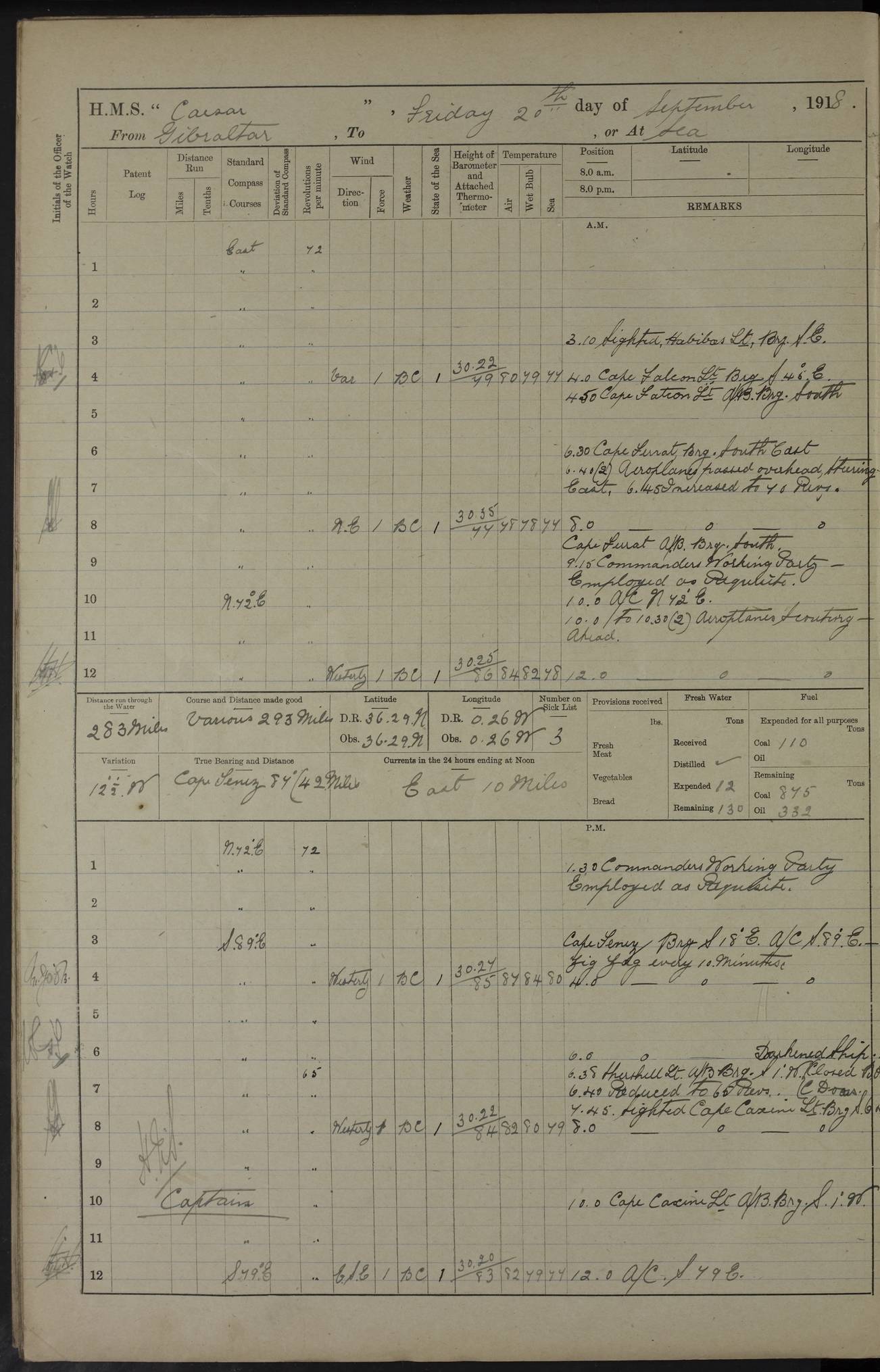 Notes: 1. Latitude/longitude, including for days in port, show representative decimal positions for each day, as calculated by the Old Weather project's analysis program. As such, they differ by varying amounts from the positions recorded, usually at noon, in the log pages. In addition, some latitudes/longitudes have been amended in edited logs for errors in the logs, for errors in identifying locations by the analysis program, or simply for greater accuracy. In all cases, refer to the log-page scans for the positions as originally recorded. Not all log pages contain this information and the ships' positions have therefore often been estimated. 2. Full account of any day is available by clicking on the link above that day. Groups of links refer to log book covers and introductory information; some may be blank. Editor’s notes: Positions (Latitude and Longitude) are given for noon each day, correcting or estimating the position when appropriate. These positions are shown to two decimal places, even when approximate, to indicate when Caesar has moved short distances, particularly when engaged in gunnery practice. If exact times are not indicated in the log they have, when appropriate, been estimated from the position of the entries (which show times on the left hand side of the log page). A note is made of numbers on the sick list where this is 5 or more. This and other information from the log is included in square brackets [not in italics] if it is not to be found under “Remarks” on the right hand side of the page. Additional information about geographical locations, terminology and about merchant and foreign naval ships encountered has been provided where identification is reasonably certain, by means of embedded links within the text. |
