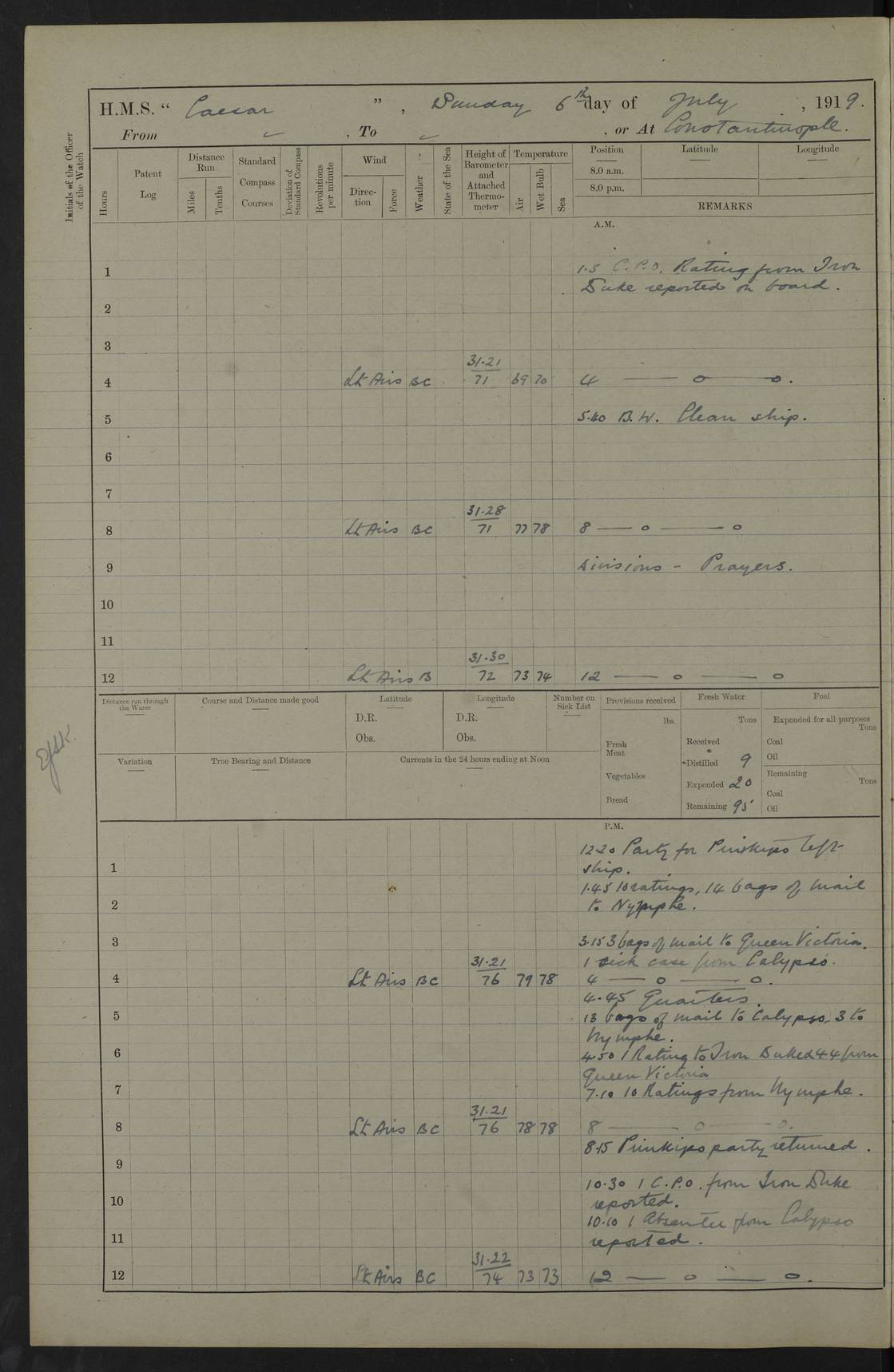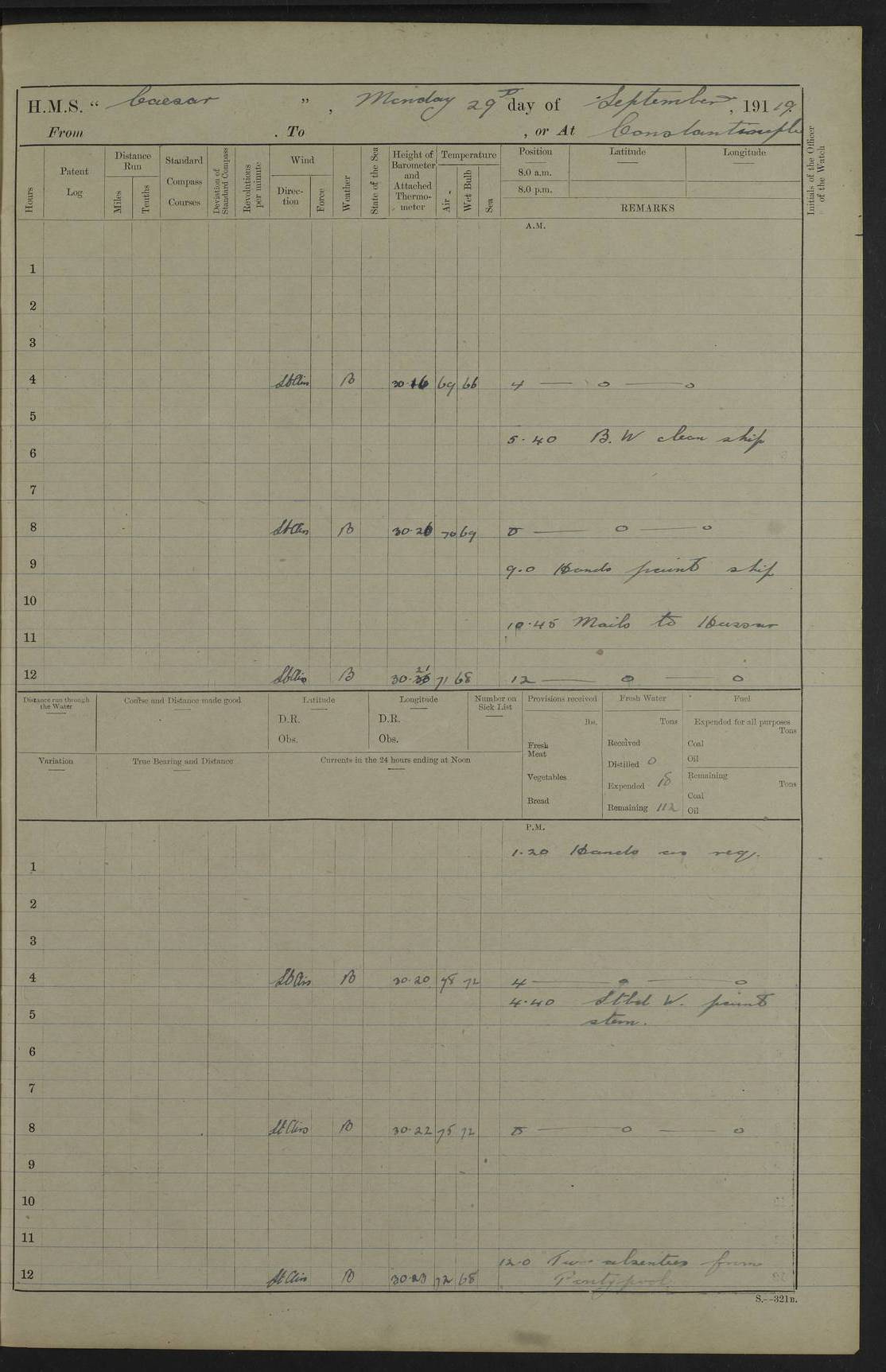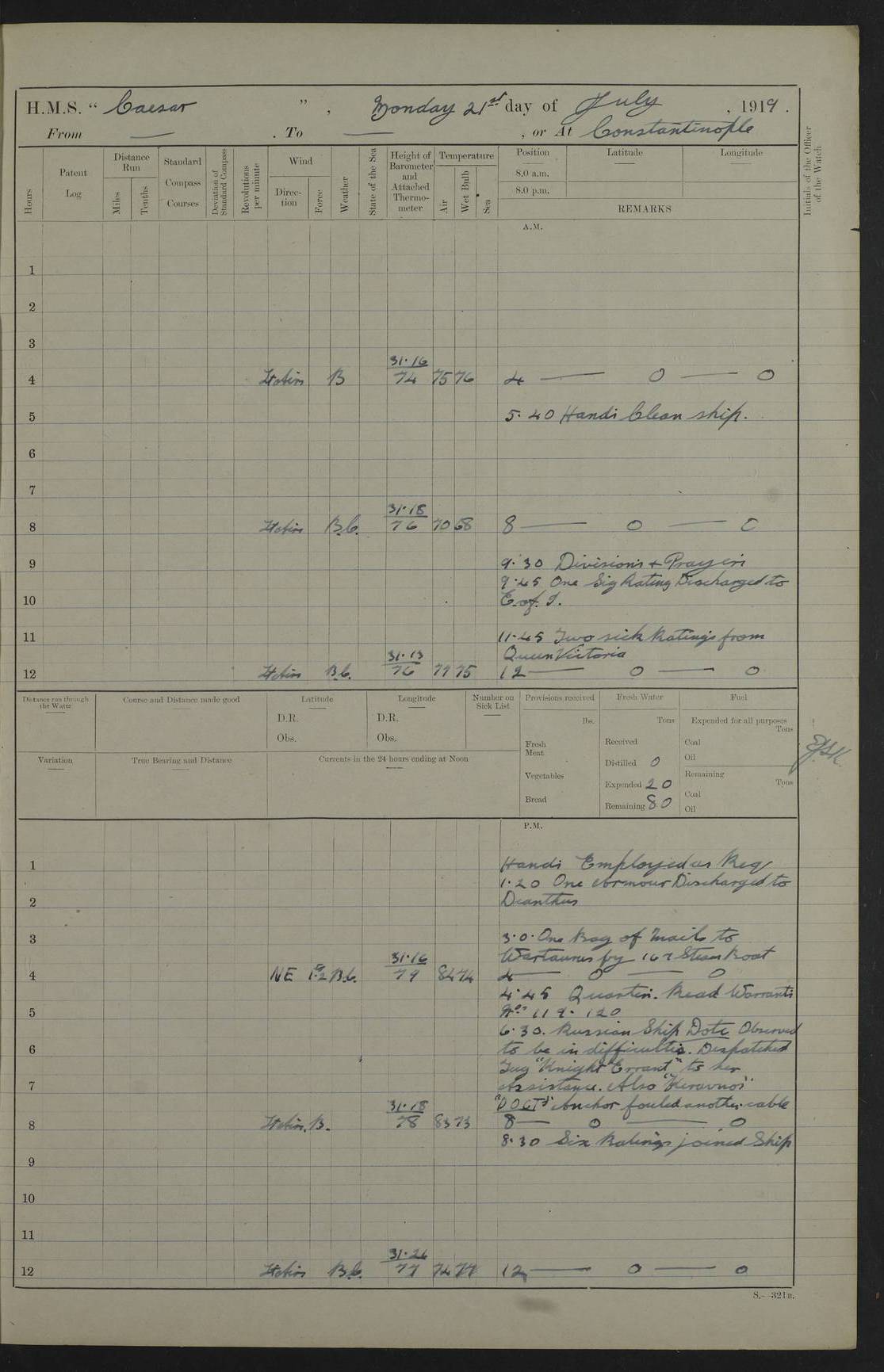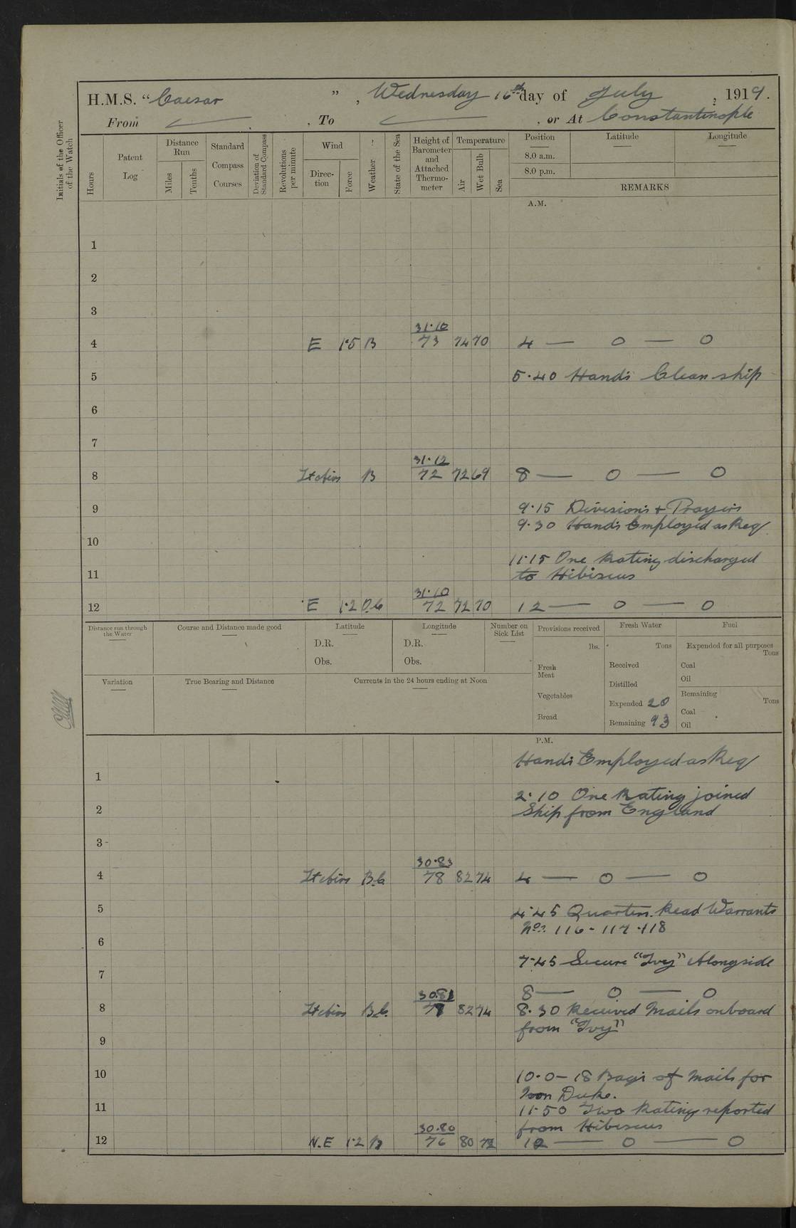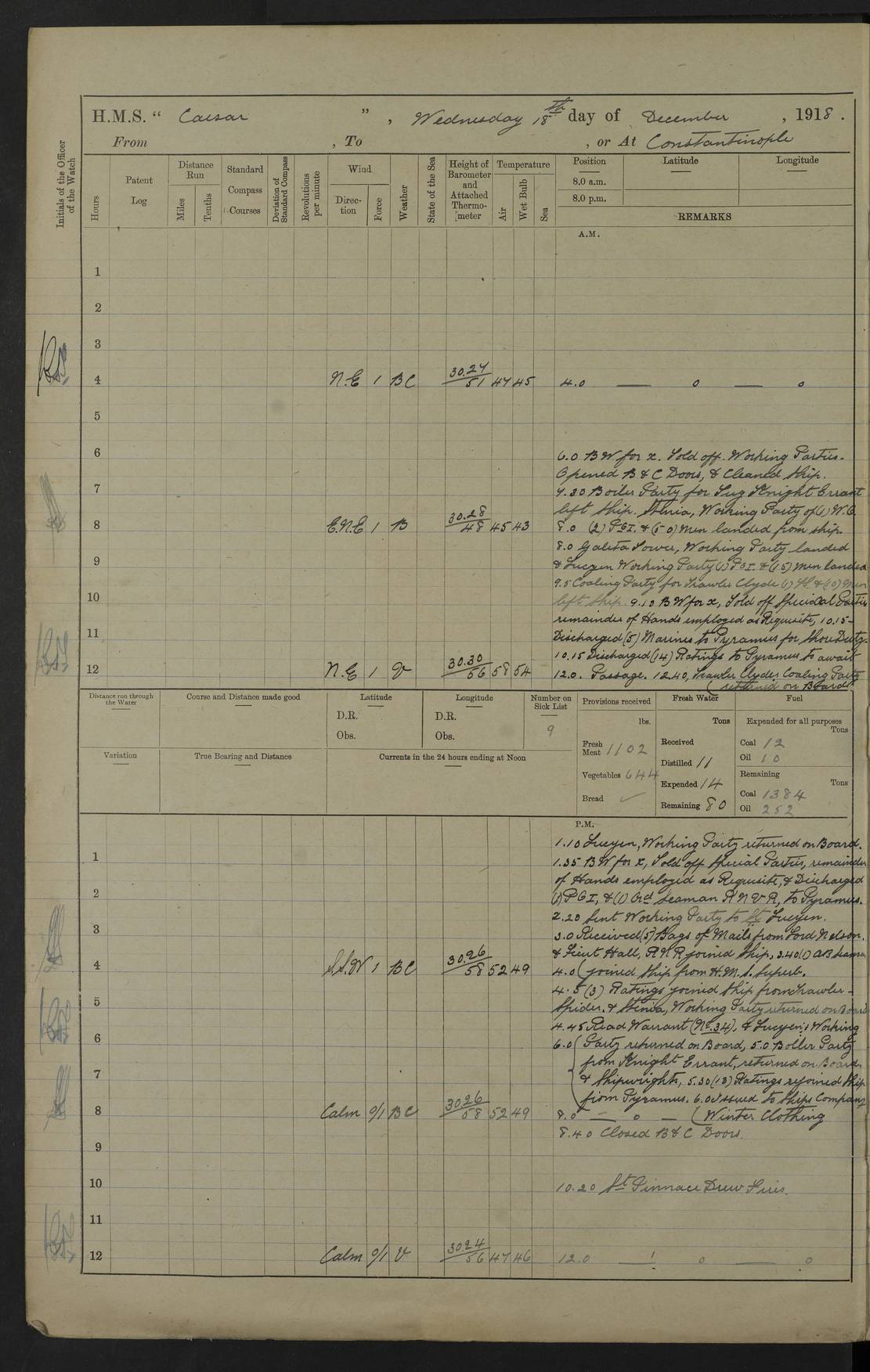 Notes: 1. Latitude/longitude, including for days in port, show representative decimal positions for each day, as calculated by the Old Weather project's analysis program. As such, they differ by varying amounts from the positions recorded, usually at noon, in the log pages. In addition, some latitudes/longitudes have been amended in edited logs for errors in the logs, for errors in identifying locations by the analysis program, or simply for greater accuracy. In all cases, refer to the log-page scans for the positions as originally recorded. Not all log pages contain this information and the ships' positions have therefore often been estimated. 2. Full account of any day is available by clicking on the link above that day. Groups of links refer to log book covers and introductory information; some may be blank. Editor’s notes: Positions (Latitude and Longitude) are given for noon each day, correcting or estimating the position when appropriate. These positions are shown to two decimal places, even when approximate, to indicate when Caesar has moved short distances, particularly when engaged in gunnery practice. If exact times are not indicated in the log they have, when appropriate, been estimated from the position of the entries (which show times on the left hand side of the log page). A note is made of numbers on the sick list where this is 5 or more. This and other information from the log is included in square brackets [not in italics] if it is not to be found under “Remarks” on the right hand side of the page. Additional information about geographical locations, terminology and about merchant and foreign naval ships encountered has been provided where identification is reasonably certain, by means of embedded links within the text. |