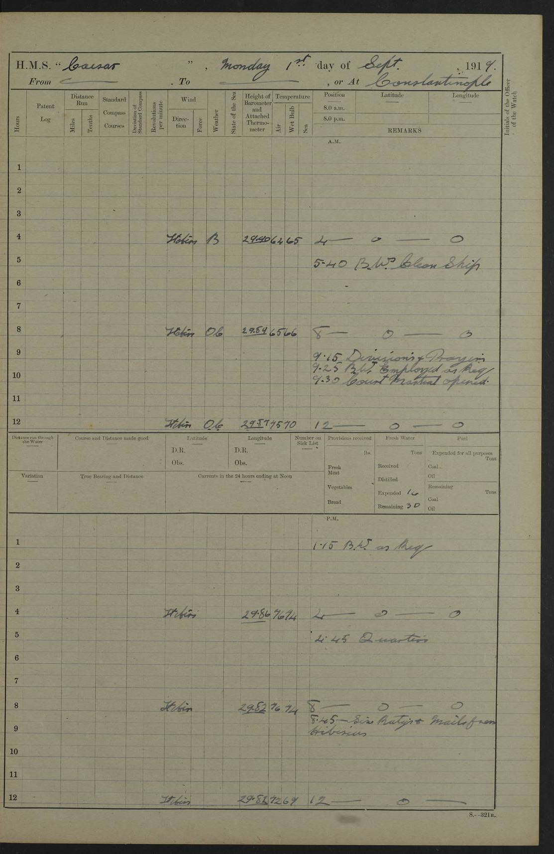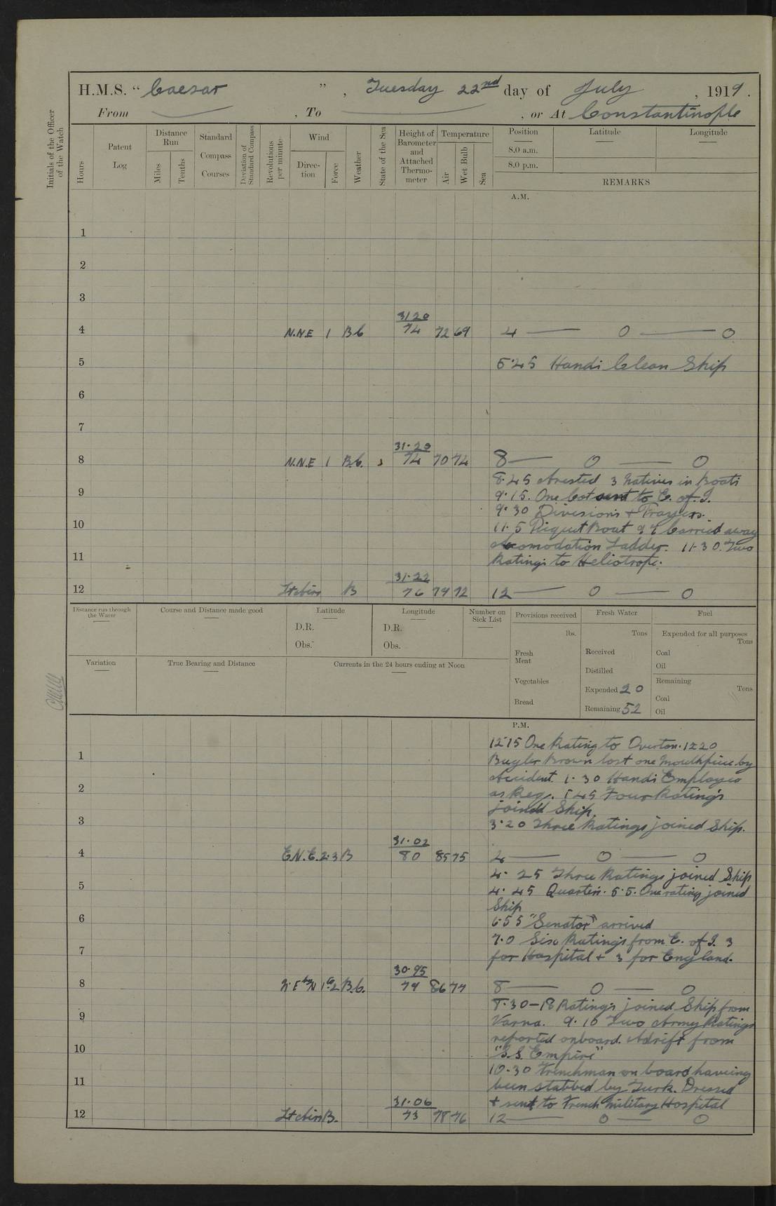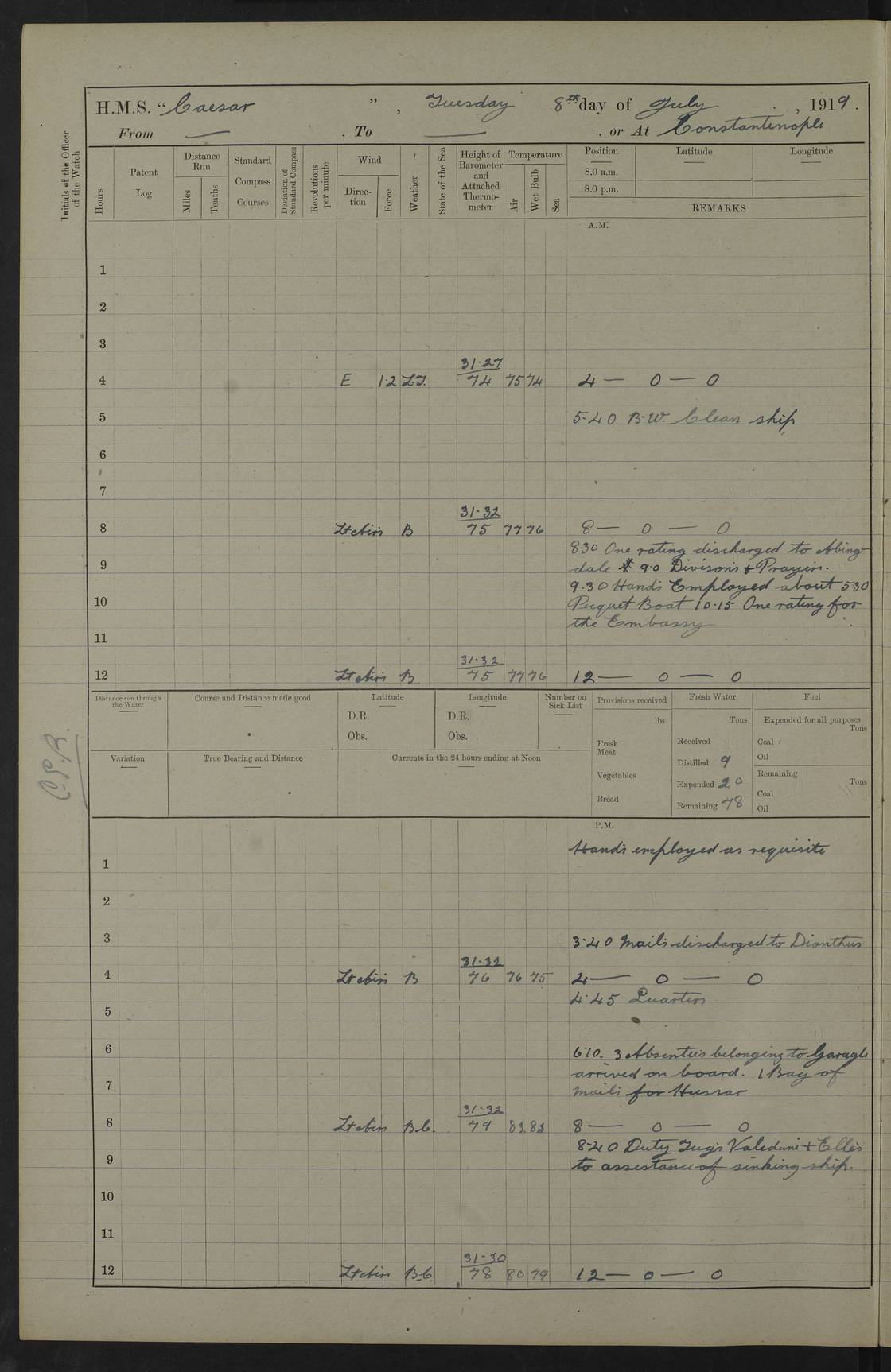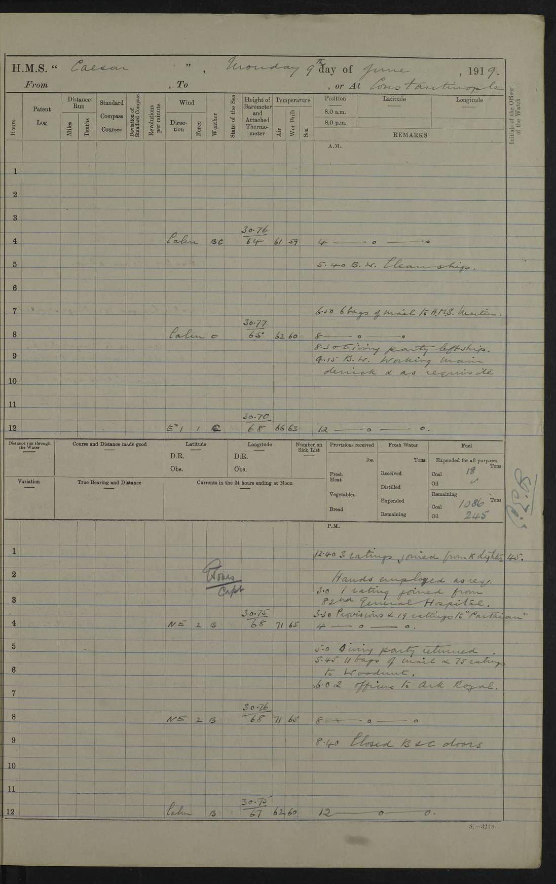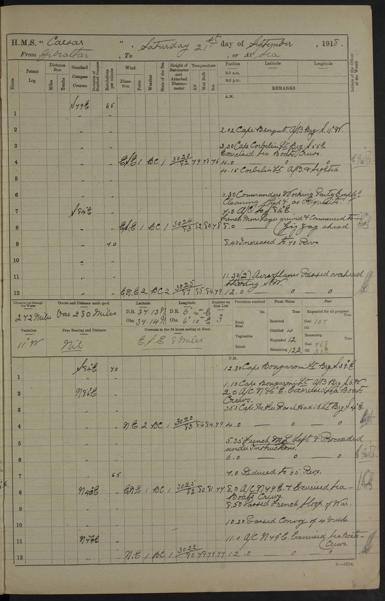 Notes: 1. Latitude/longitude, including for days in port, show representative decimal positions for each day, as calculated by the Old Weather project's analysis program. As such, they differ by varying amounts from the positions recorded, usually at noon, in the log pages. In addition, some latitudes/longitudes have been amended in edited logs for errors in the logs, for errors in identifying locations by the analysis program, or simply for greater accuracy. In all cases, refer to the log-page scans for the positions as originally recorded. Not all log pages contain this information and the ships' positions have therefore often been estimated. 2. Full account of any day is available by clicking on the link above that day. Groups of links refer to log book covers and introductory information; some may be blank. Editor’s notes: Positions (Latitude and Longitude) are given for noon each day, correcting or estimating the position when appropriate. These positions are shown to two decimal places, even when approximate, to indicate when Caesar has moved short distances, particularly when engaged in gunnery practice. If exact times are not indicated in the log they have, when appropriate, been estimated from the position of the entries (which show times on the left hand side of the log page). A note is made of numbers on the sick list where this is 5 or more. This and other information from the log is included in square brackets [not in italics] if it is not to be found under “Remarks” on the right hand side of the page. Additional information about geographical locations, terminology and about merchant and foreign naval ships encountered has been provided where identification is reasonably certain, by means of embedded links within the text. |