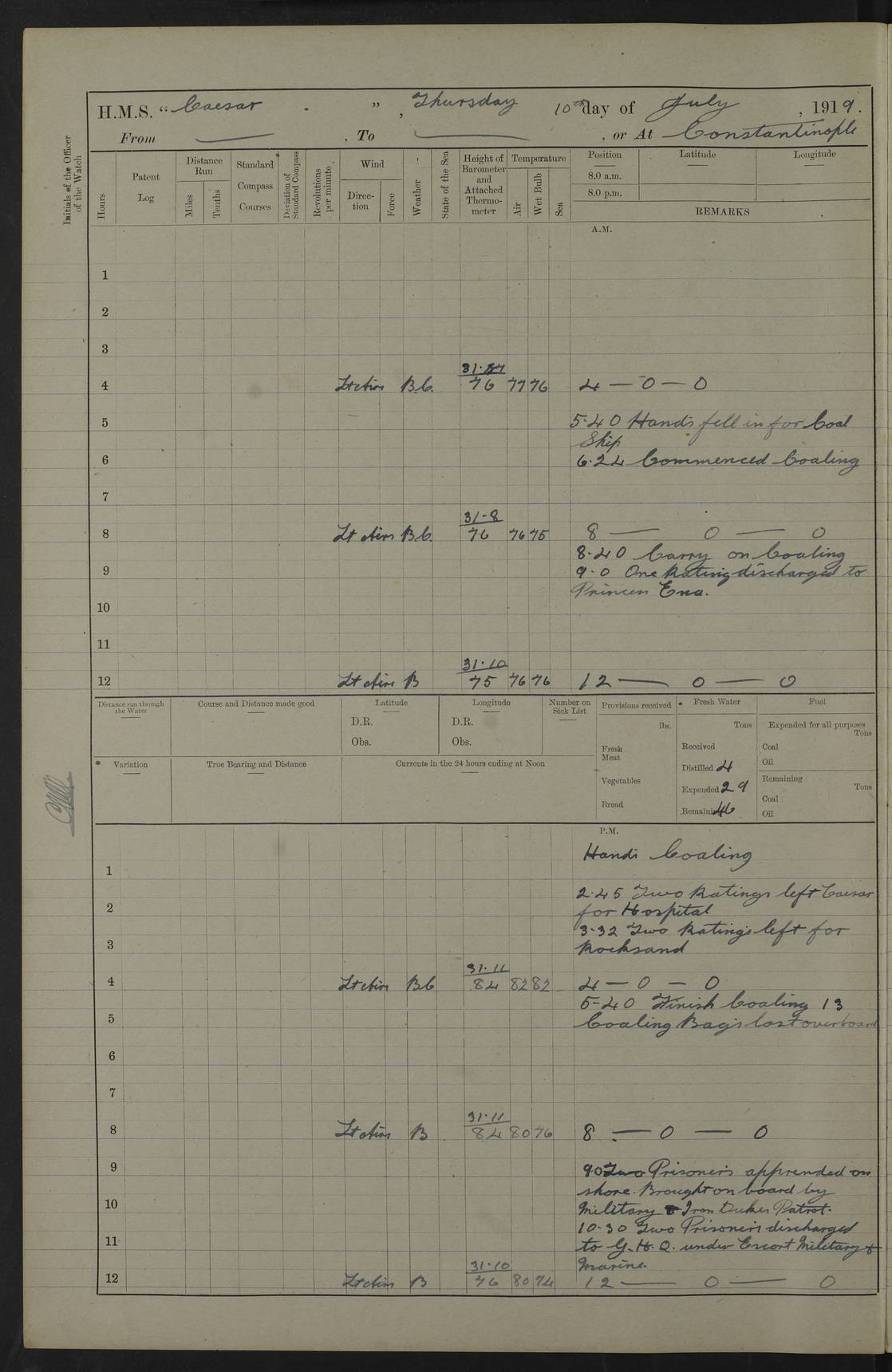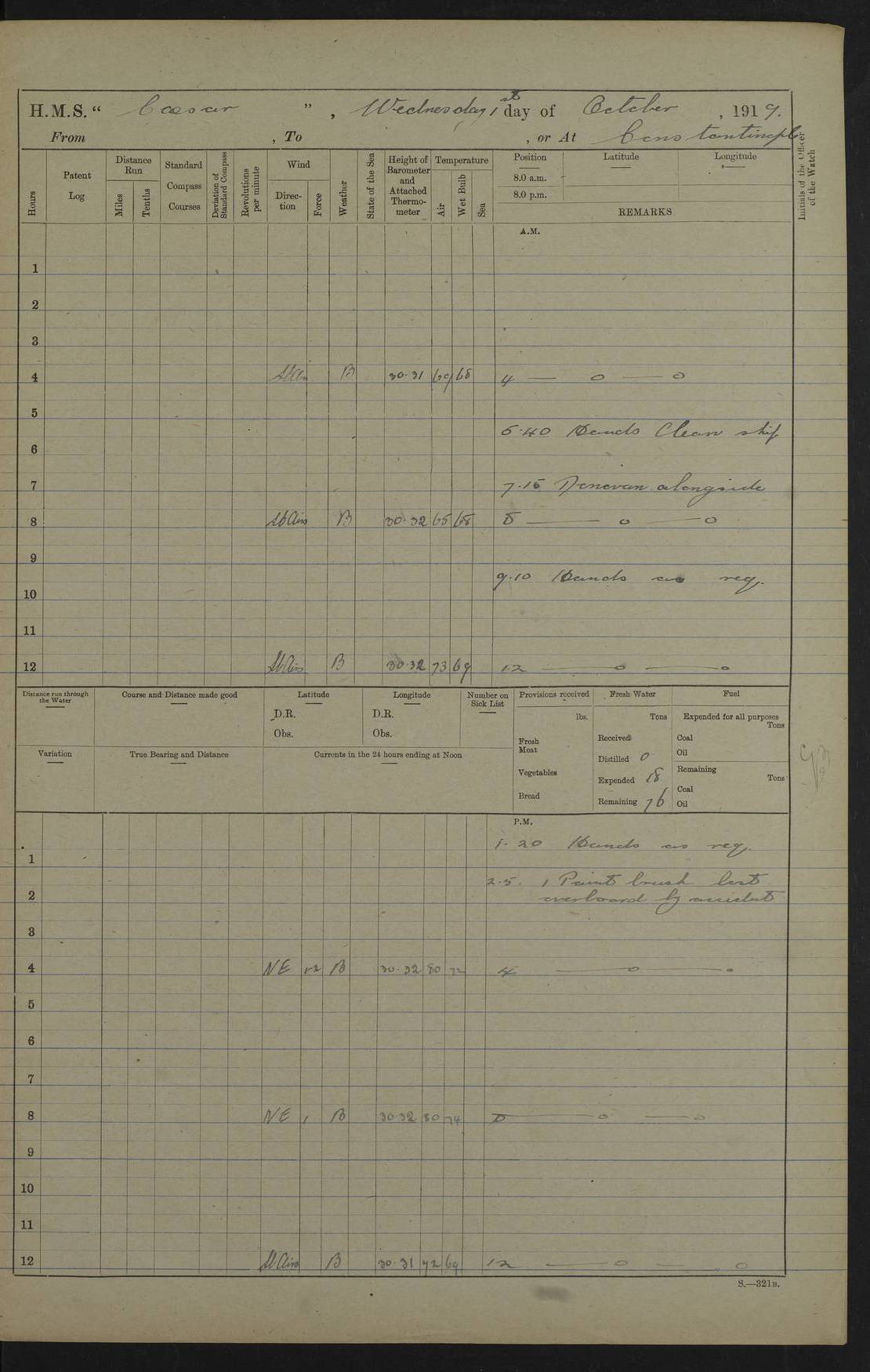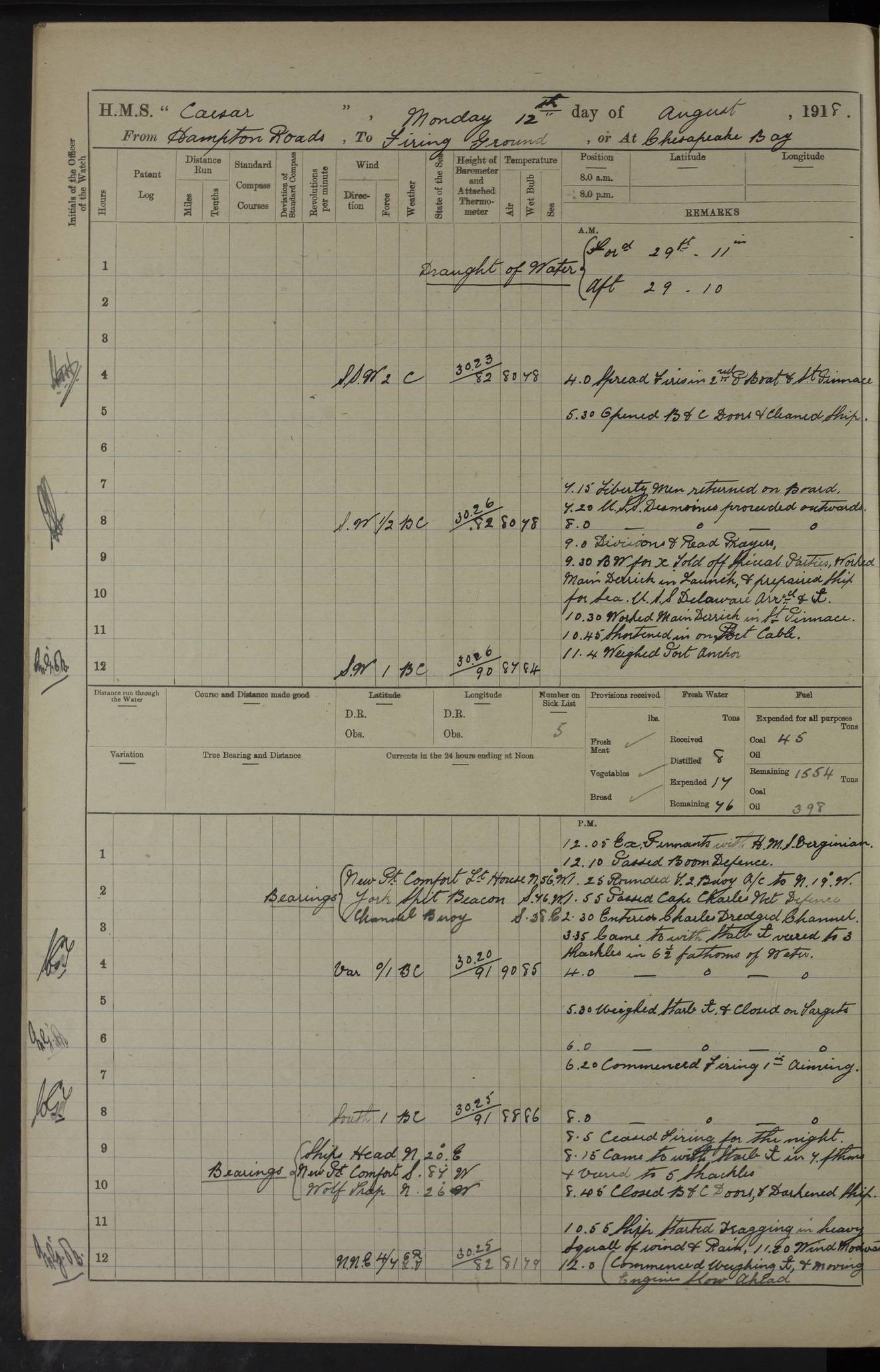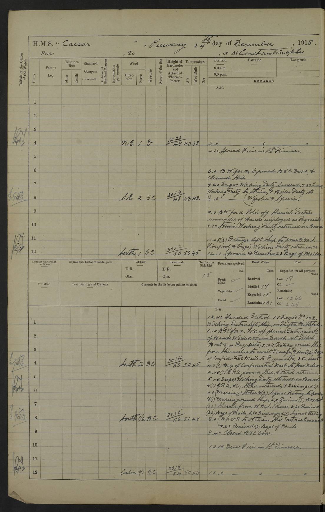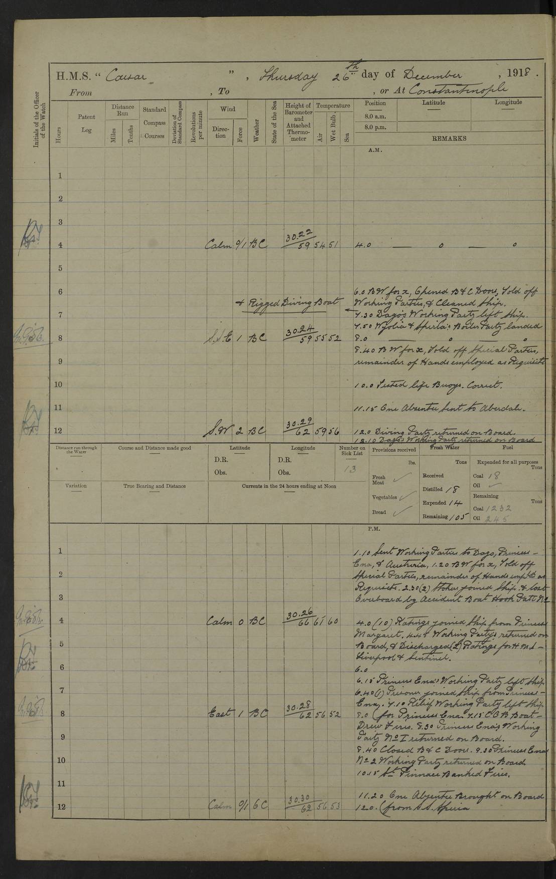 Notes: 1. Latitude/longitude, including for days in port, show representative decimal positions for each day, as calculated by the Old Weather project's analysis program. As such, they differ by varying amounts from the positions recorded, usually at noon, in the log pages. In addition, some latitudes/longitudes have been amended in edited logs for errors in the logs, for errors in identifying locations by the analysis program, or simply for greater accuracy. In all cases, refer to the log-page scans for the positions as originally recorded. Not all log pages contain this information and the ships' positions have therefore often been estimated. 2. Full account of any day is available by clicking on the link above that day. Groups of links refer to log book covers and introductory information; some may be blank. Editor’s notes: Positions (Latitude and Longitude) are given for noon each day, correcting or estimating the position when appropriate. These positions are shown to two decimal places, even when approximate, to indicate when Caesar has moved short distances, particularly when engaged in gunnery practice. If exact times are not indicated in the log they have, when appropriate, been estimated from the position of the entries (which show times on the left hand side of the log page). A note is made of numbers on the sick list where this is 5 or more. This and other information from the log is included in square brackets [not in italics] if it is not to be found under “Remarks” on the right hand side of the page. Additional information about geographical locations, terminology and about merchant and foreign naval ships encountered has been provided where identification is reasonably certain, by means of embedded links within the text. |