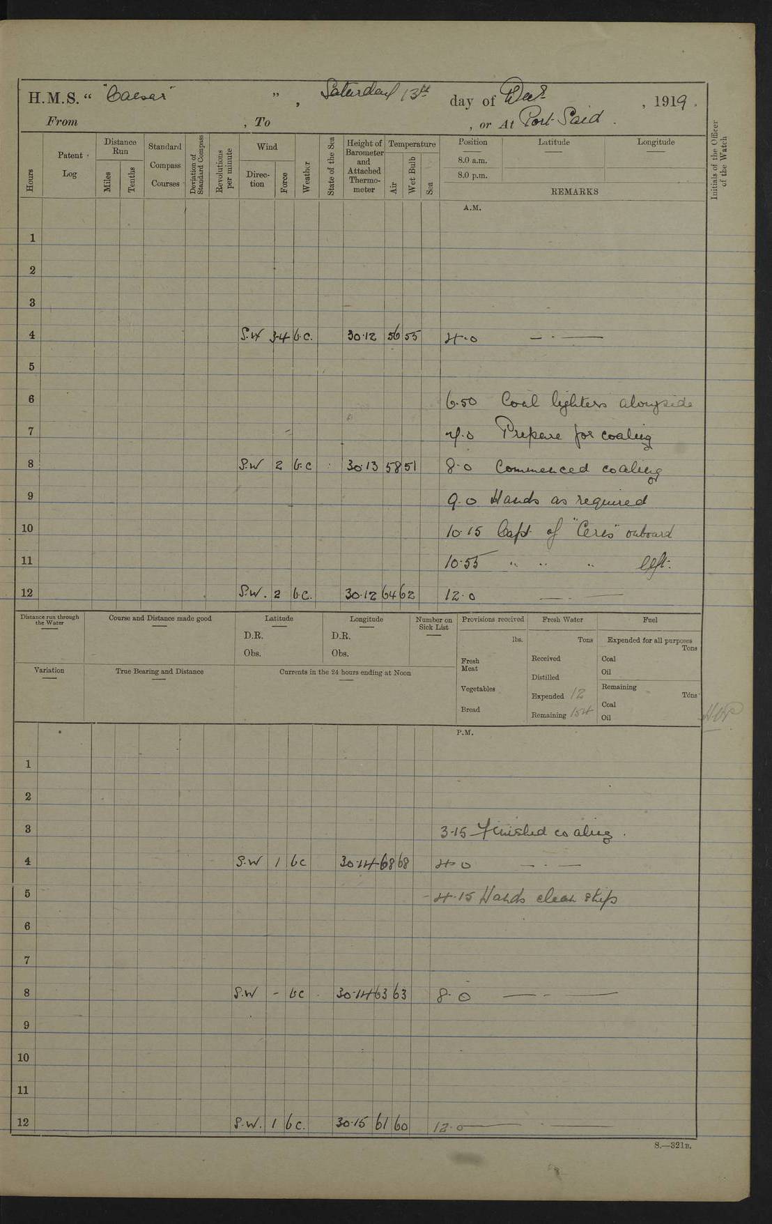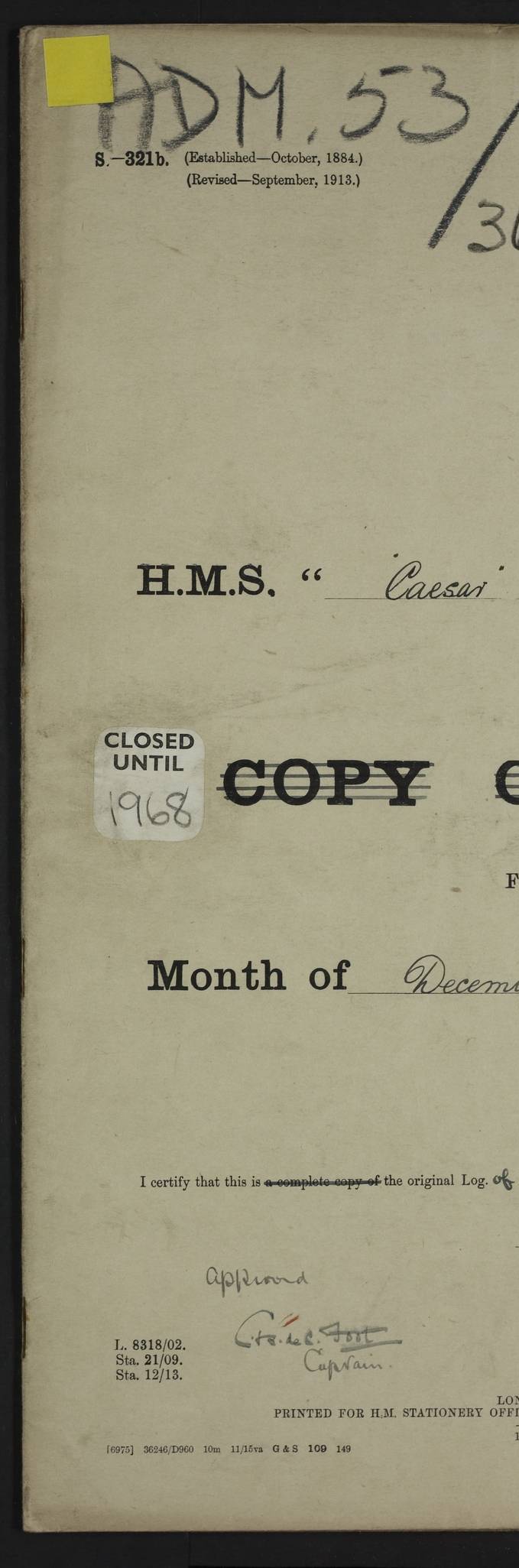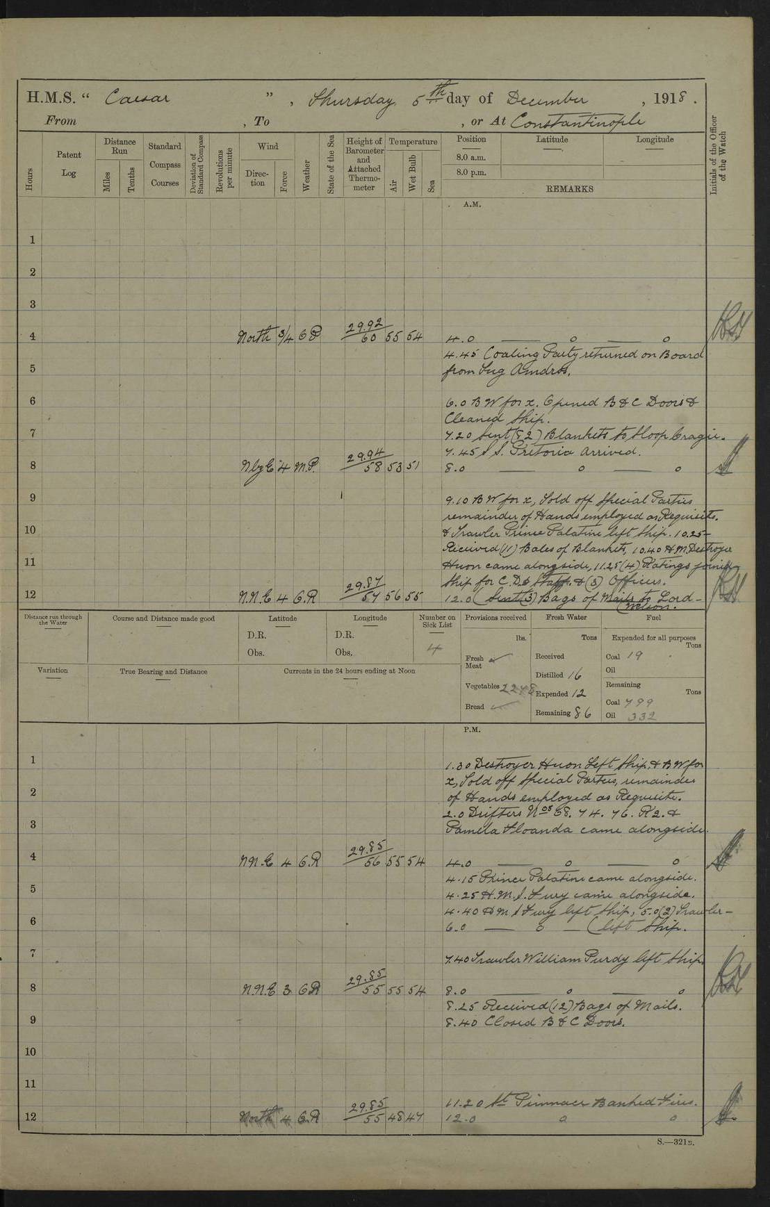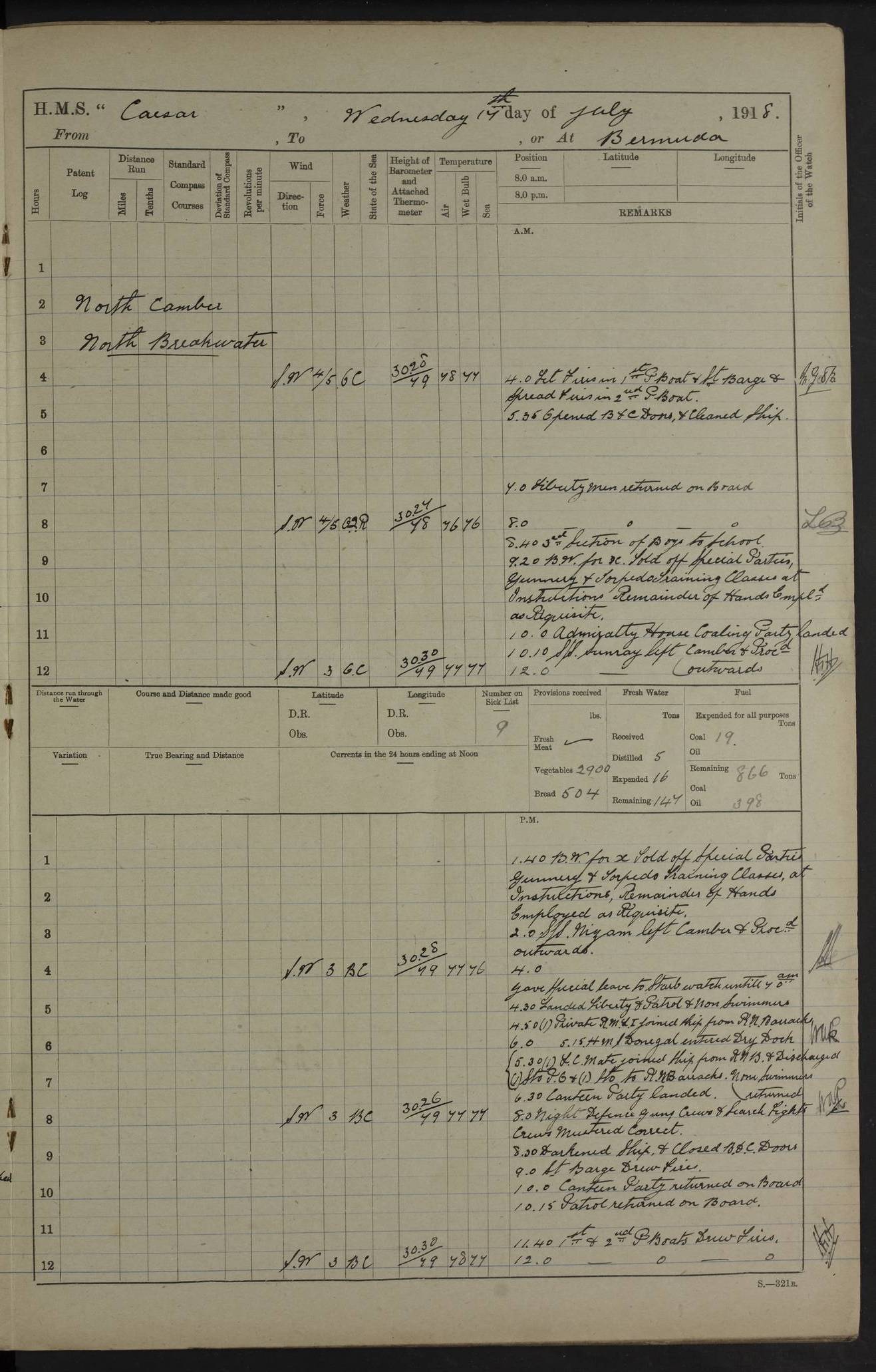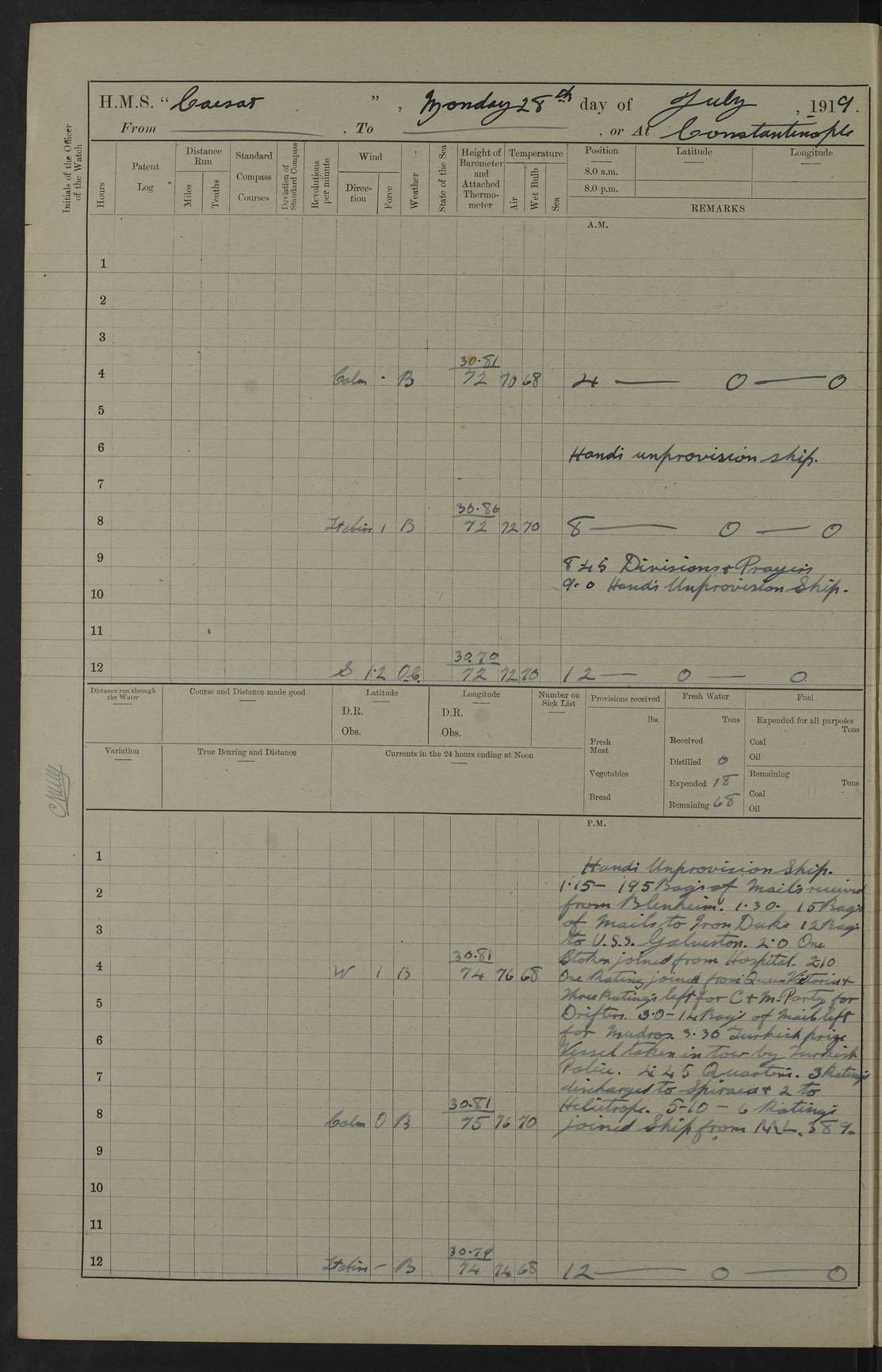 Notes: 1. Latitude/longitude, including for days in port, show representative decimal positions for each day, as calculated by the Old Weather project's analysis program. As such, they differ by varying amounts from the positions recorded, usually at noon, in the log pages. In addition, some latitudes/longitudes have been amended in edited logs for errors in the logs, for errors in identifying locations by the analysis program, or simply for greater accuracy. In all cases, refer to the log-page scans for the positions as originally recorded. Not all log pages contain this information and the ships' positions have therefore often been estimated. 2. Full account of any day is available by clicking on the link above that day. Groups of links refer to log book covers and introductory information; some may be blank. Editor’s notes: Positions (Latitude and Longitude) are given for noon each day, correcting or estimating the position when appropriate. These positions are shown to two decimal places, even when approximate, to indicate when Caesar has moved short distances, particularly when engaged in gunnery practice. If exact times are not indicated in the log they have, when appropriate, been estimated from the position of the entries (which show times on the left hand side of the log page). A note is made of numbers on the sick list where this is 5 or more. This and other information from the log is included in square brackets [not in italics] if it is not to be found under “Remarks” on the right hand side of the page. Additional information about geographical locations, terminology and about merchant and foreign naval ships encountered has been provided where identification is reasonably certain, by means of embedded links within the text. |