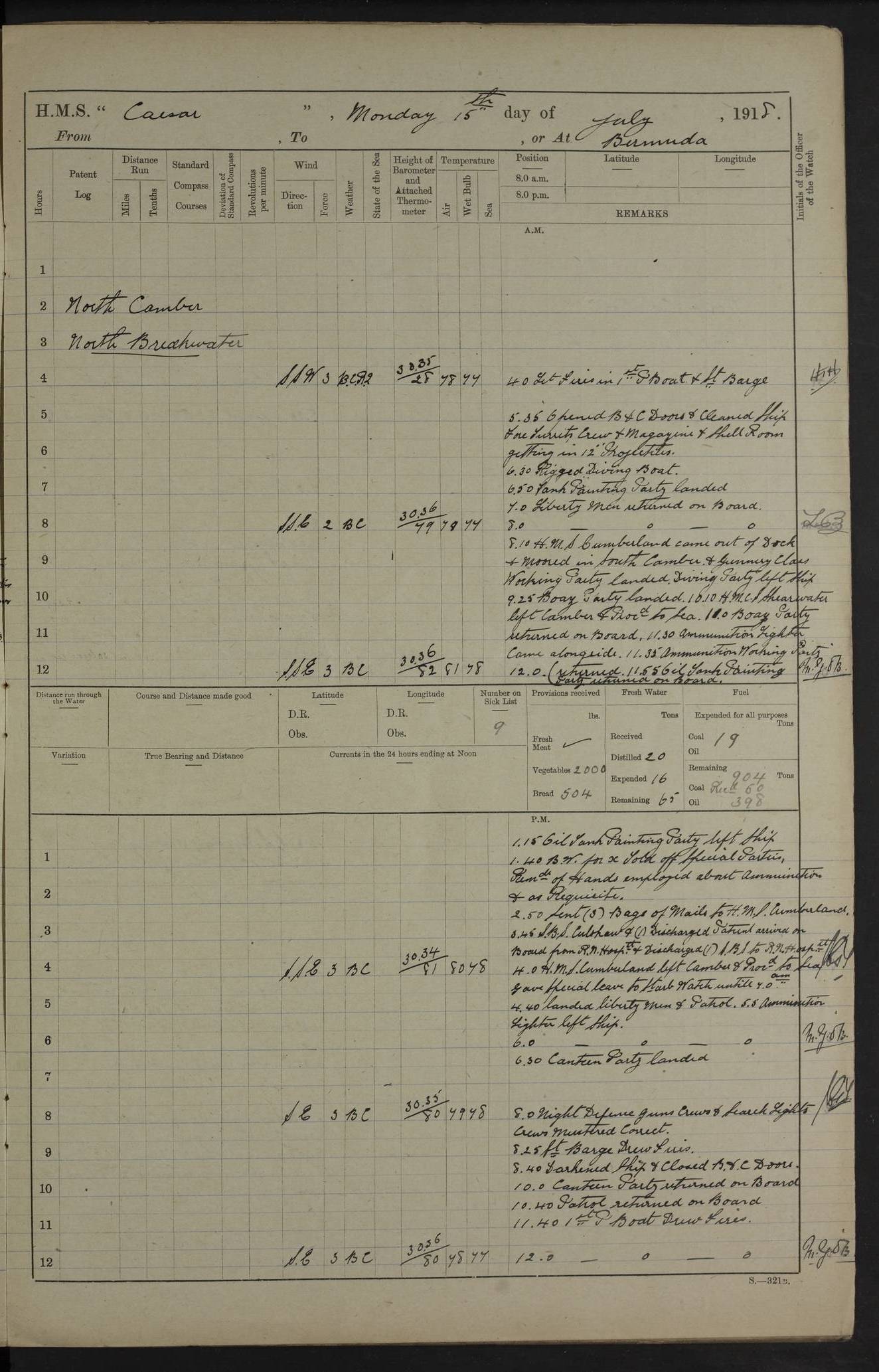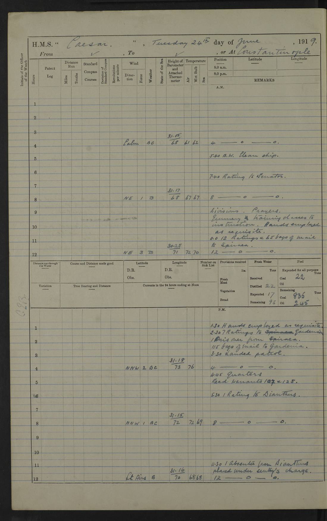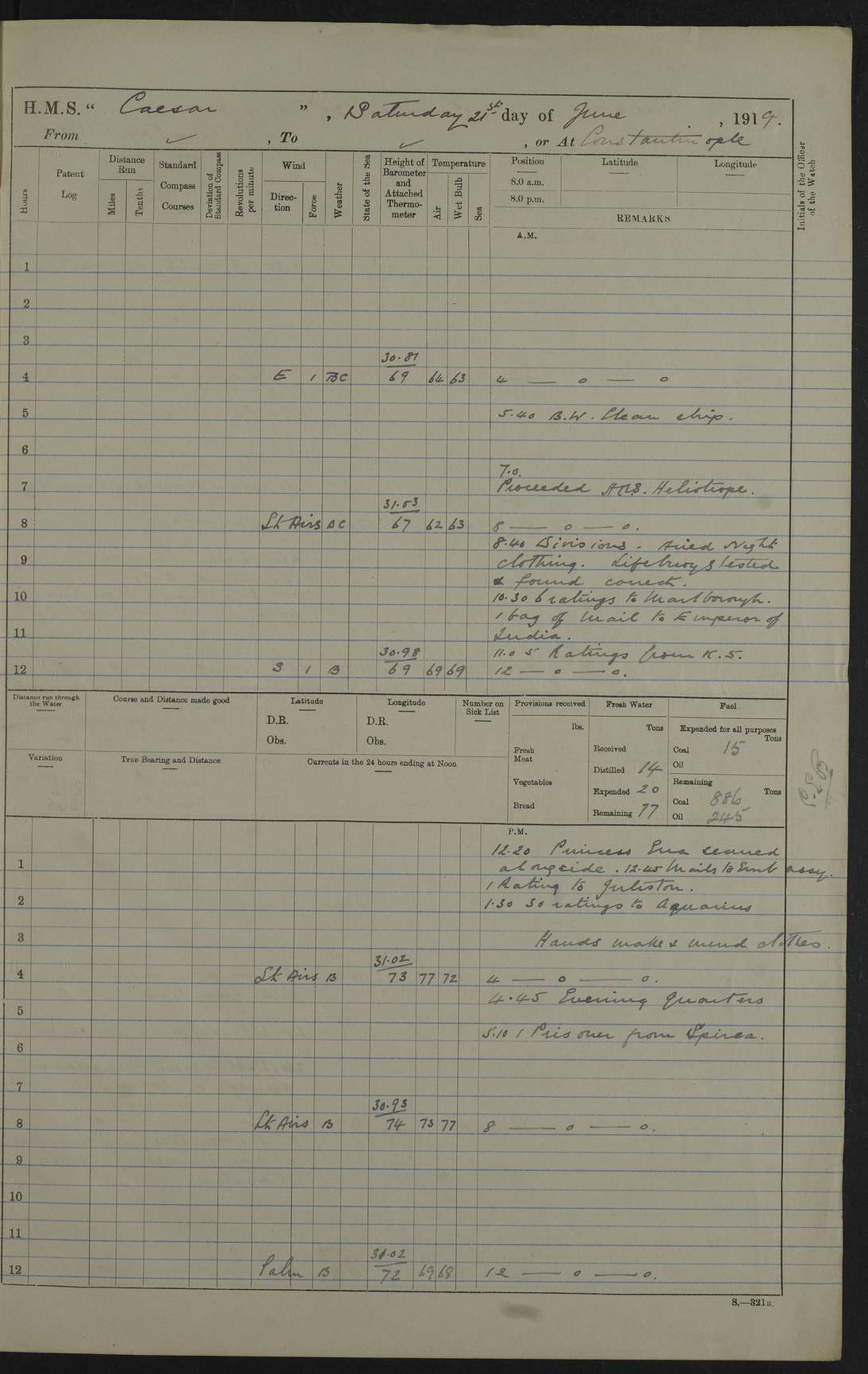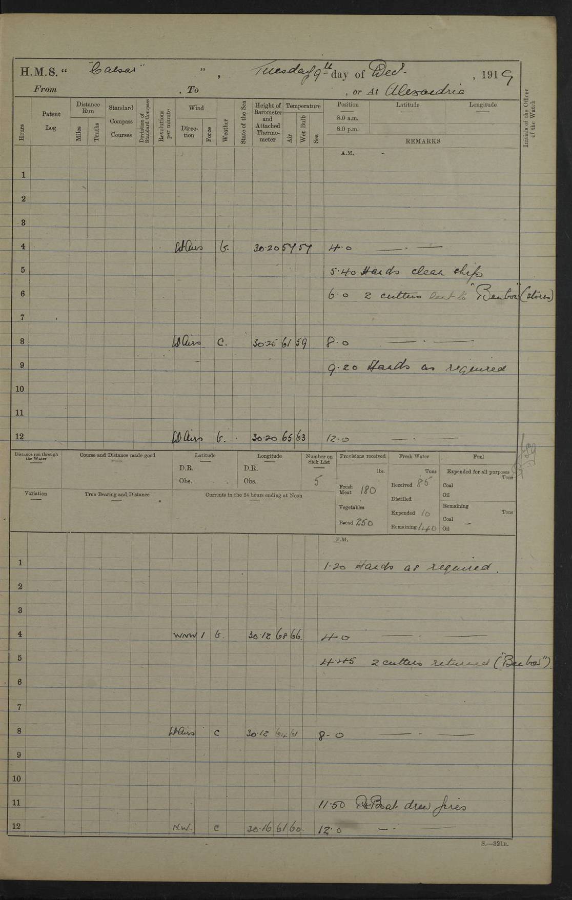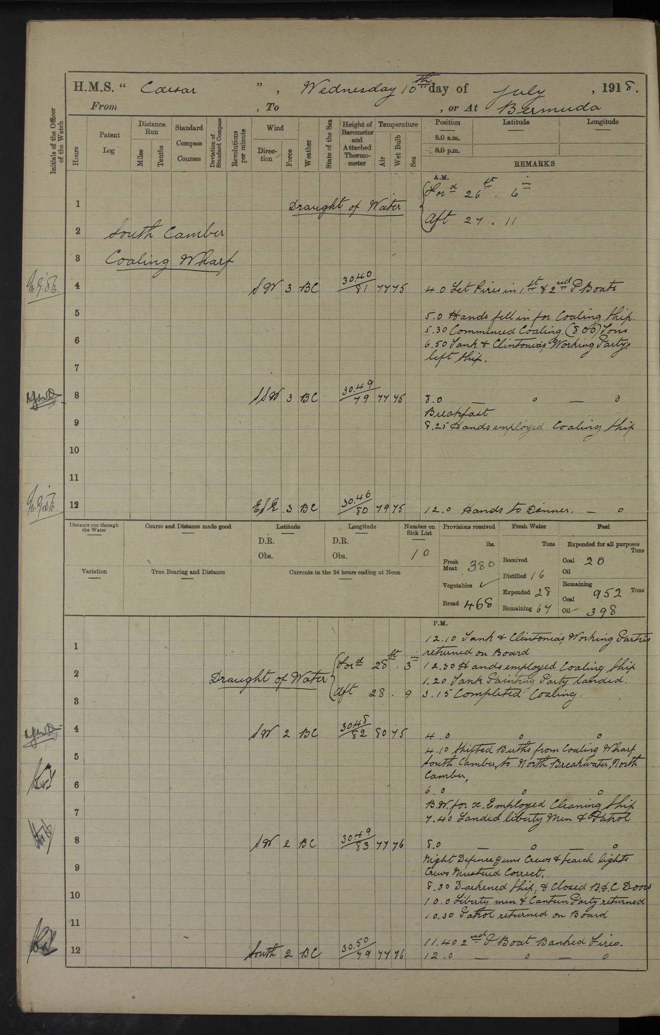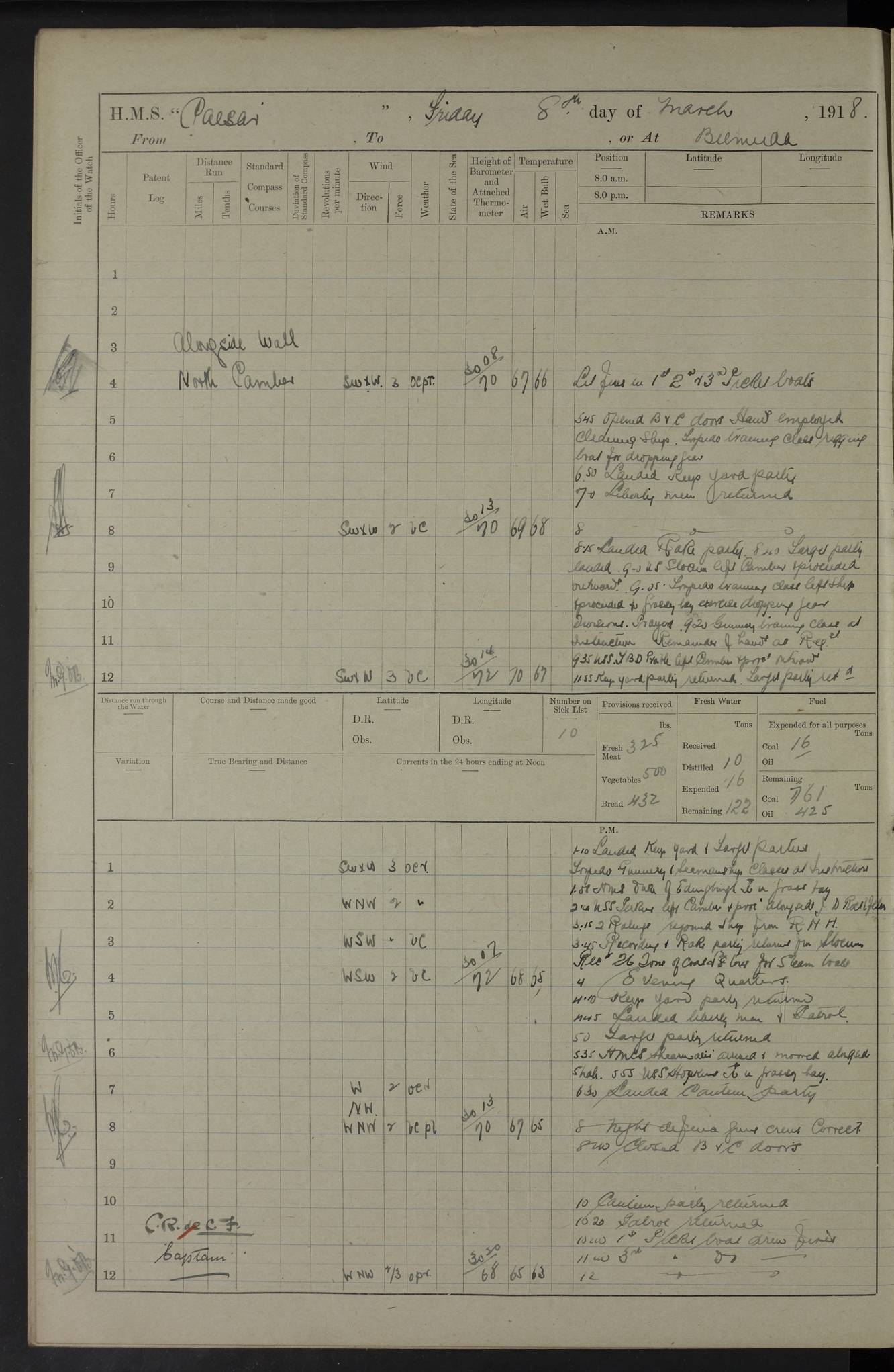 Notes: 1. Latitude/longitude, including for days in port, show representative decimal positions for each day, as calculated by the Old Weather project's analysis program. As such, they differ by varying amounts from the positions recorded, usually at noon, in the log pages. In addition, some latitudes/longitudes have been amended in edited logs for errors in the logs, for errors in identifying locations by the analysis program, or simply for greater accuracy. In all cases, refer to the log-page scans for the positions as originally recorded. Not all log pages contain this information and the ships' positions have therefore often been estimated. 2. Full account of any day is available by clicking on the link above that day. Groups of links refer to log book covers and introductory information; some may be blank. Editor’s notes: Positions (Latitude and Longitude) are given for noon each day, correcting or estimating the position when appropriate. These positions are shown to two decimal places, even when approximate, to indicate when Caesar has moved short distances, particularly when engaged in gunnery practice. If exact times are not indicated in the log they have, when appropriate, been estimated from the position of the entries (which show times on the left hand side of the log page). A note is made of numbers on the sick list where this is 5 or more. This and other information from the log is included in square brackets [not in italics] if it is not to be found under “Remarks” on the right hand side of the page. Additional information about geographical locations, terminology and about merchant and foreign naval ships encountered has been provided where identification is reasonably certain, by means of embedded links within the text. |