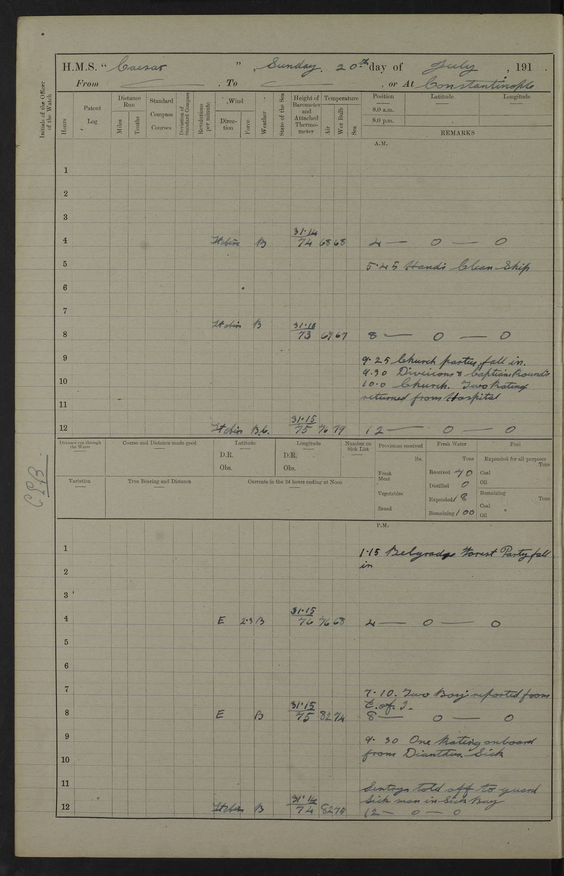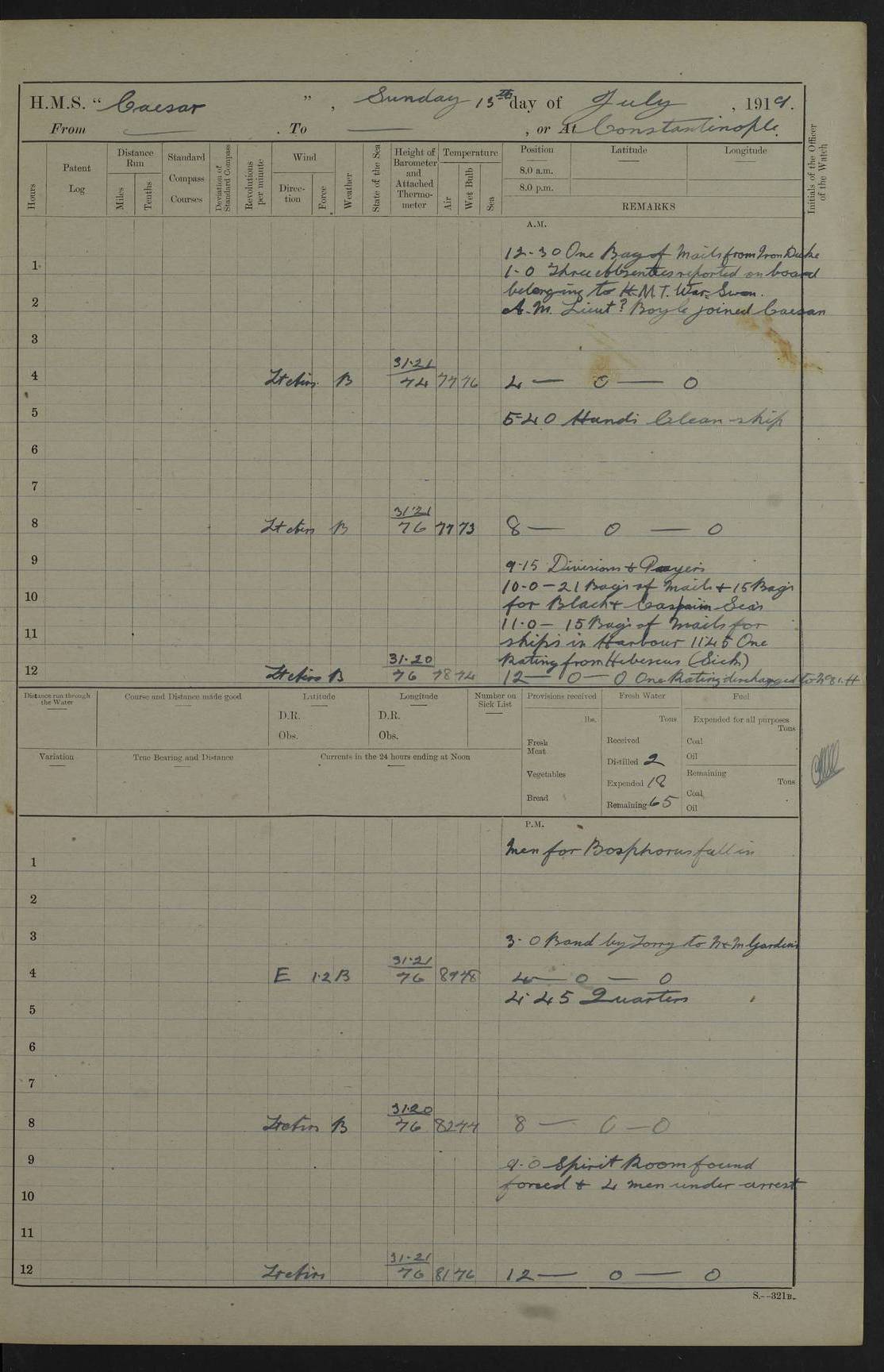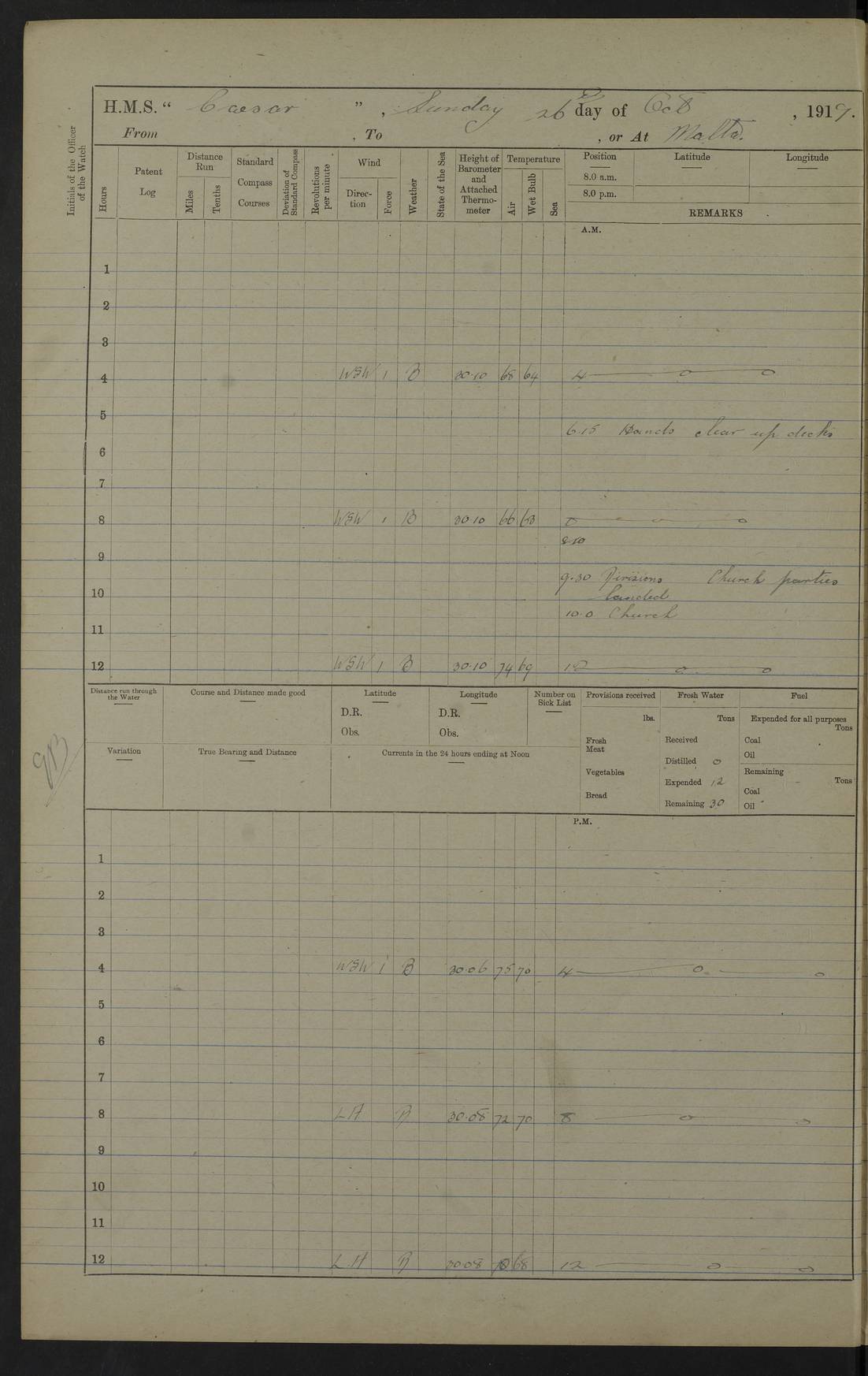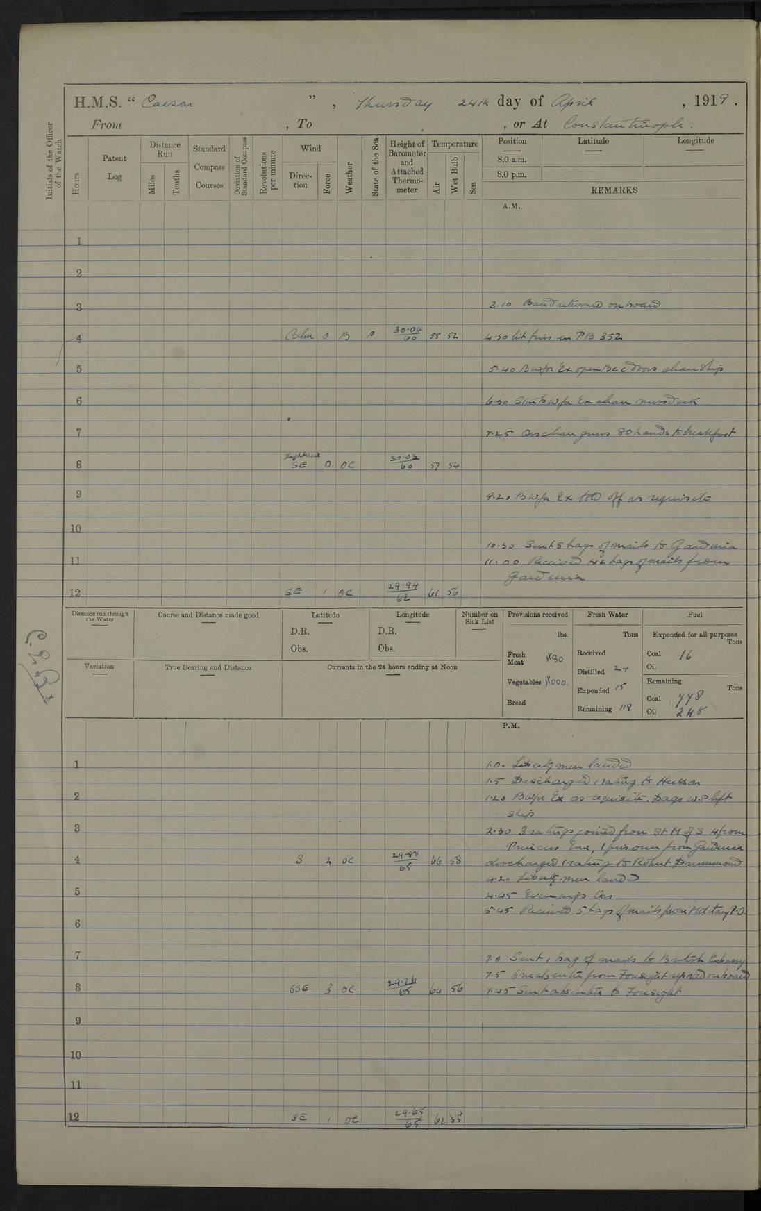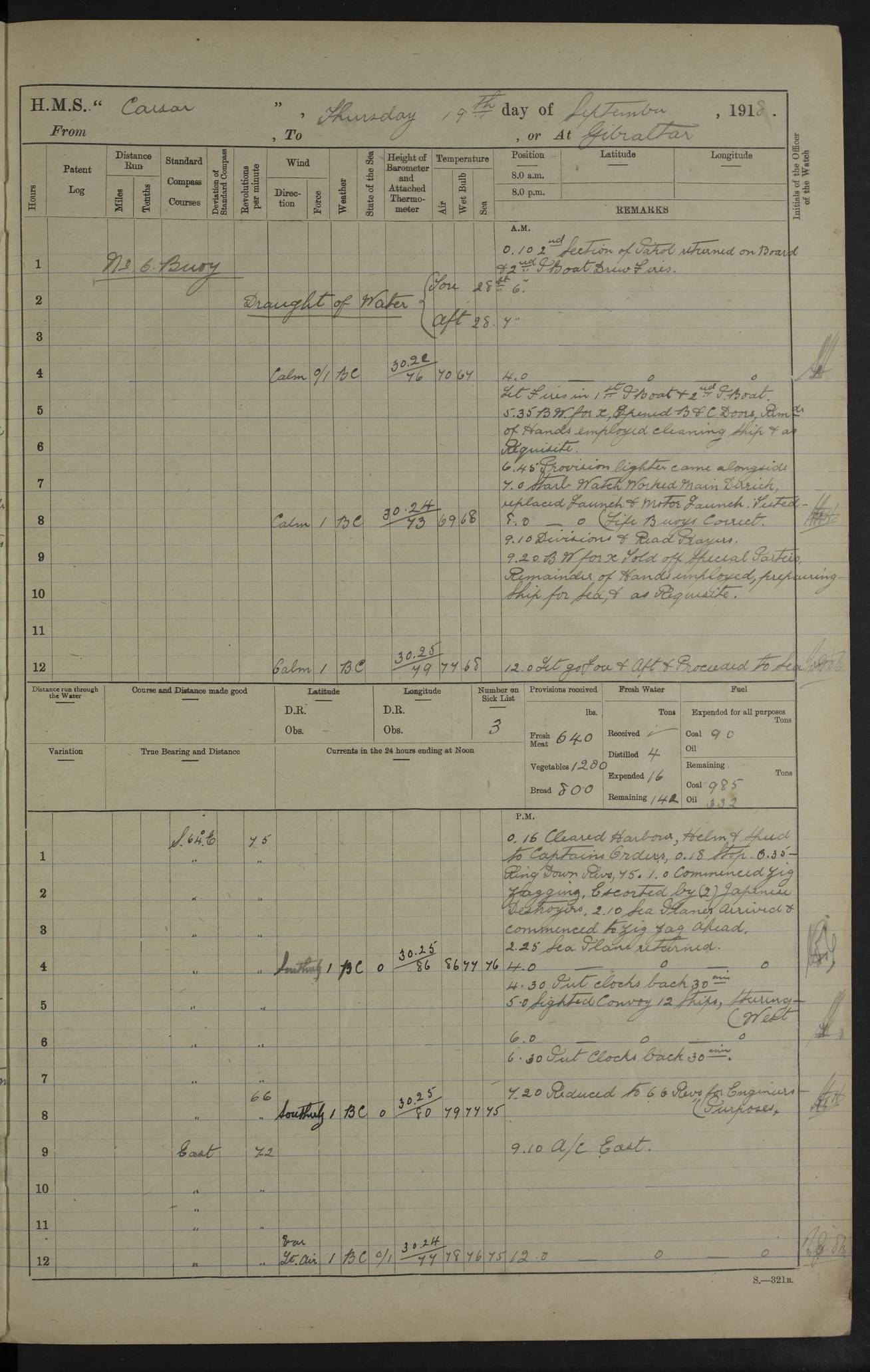 Notes: 1. Latitude/longitude, including for days in port, show representative decimal positions for each day, as calculated by the Old Weather project's analysis program. As such, they differ by varying amounts from the positions recorded, usually at noon, in the log pages. In addition, some latitudes/longitudes have been amended in edited logs for errors in the logs, for errors in identifying locations by the analysis program, or simply for greater accuracy. In all cases, refer to the log-page scans for the positions as originally recorded. Not all log pages contain this information and the ships' positions have therefore often been estimated. 2. Full account of any day is available by clicking on the link above that day. Groups of links refer to log book covers and introductory information; some may be blank. Editor’s notes: Positions (Latitude and Longitude) are given for noon each day, correcting or estimating the position when appropriate. These positions are shown to two decimal places, even when approximate, to indicate when Caesar has moved short distances, particularly when engaged in gunnery practice. If exact times are not indicated in the log they have, when appropriate, been estimated from the position of the entries (which show times on the left hand side of the log page). A note is made of numbers on the sick list where this is 5 or more. This and other information from the log is included in square brackets [not in italics] if it is not to be found under “Remarks” on the right hand side of the page. Additional information about geographical locations, terminology and about merchant and foreign naval ships encountered has been provided where identification is reasonably certain, by means of embedded links within the text. |
