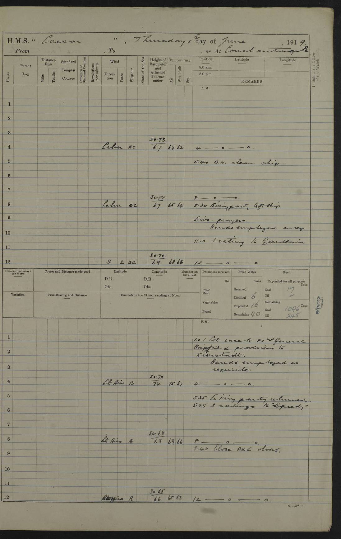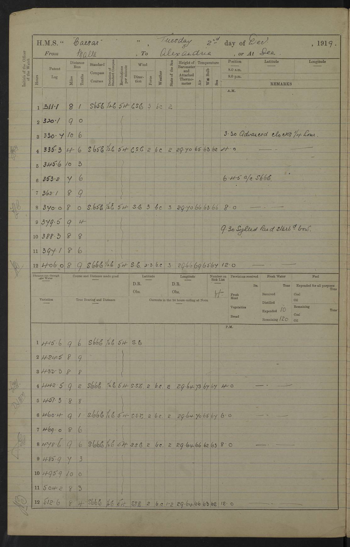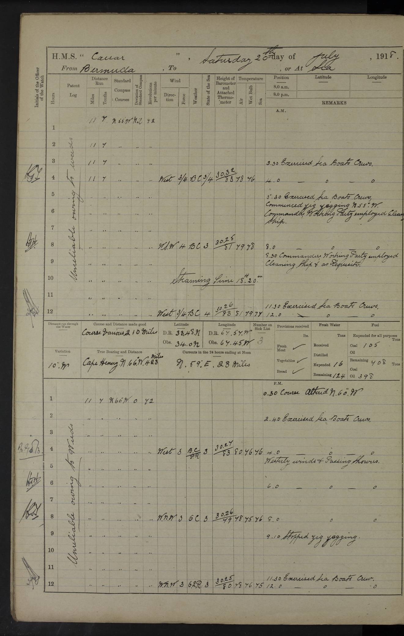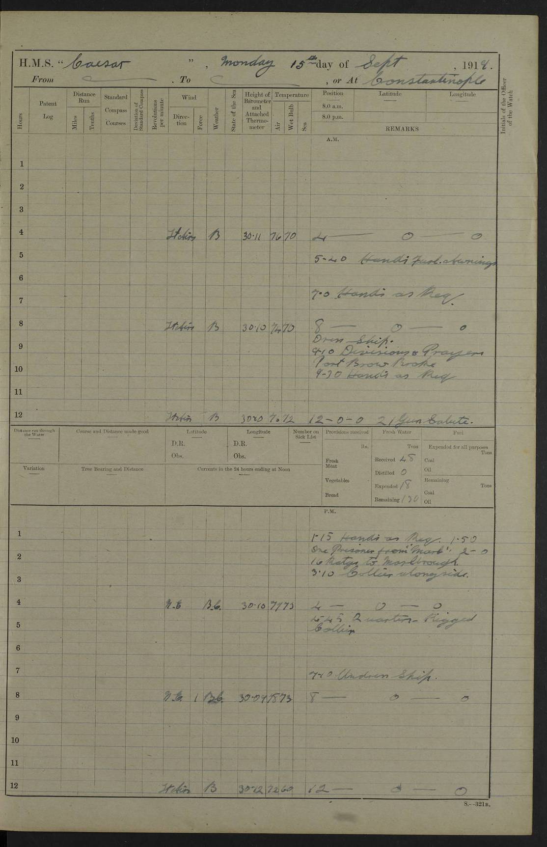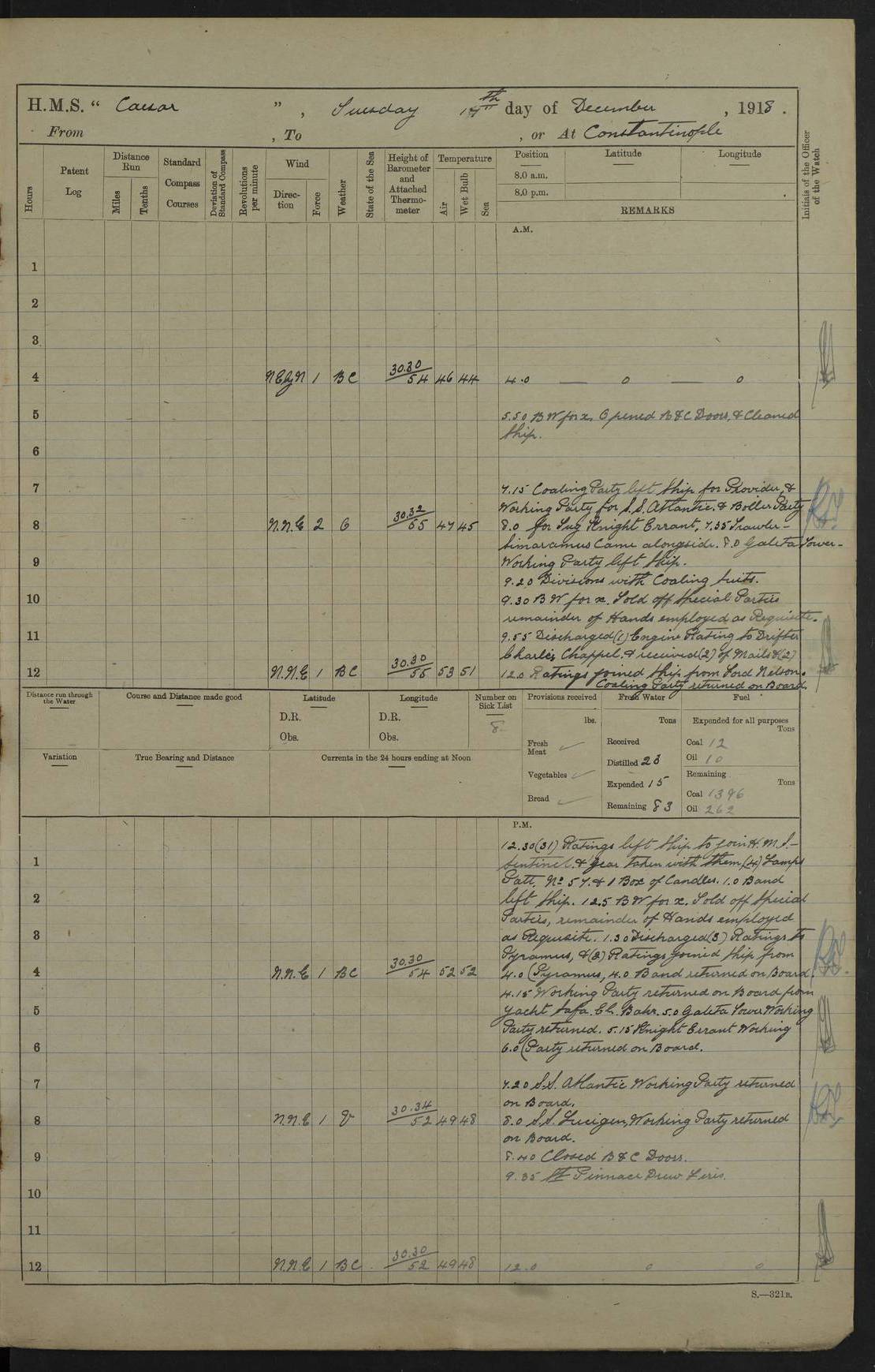 Notes: 1. Latitude/longitude, including for days in port, show representative decimal positions for each day, as calculated by the Old Weather project's analysis program. As such, they differ by varying amounts from the positions recorded, usually at noon, in the log pages. In addition, some latitudes/longitudes have been amended in edited logs for errors in the logs, for errors in identifying locations by the analysis program, or simply for greater accuracy. In all cases, refer to the log-page scans for the positions as originally recorded. Not all log pages contain this information and the ships' positions have therefore often been estimated. 2. Full account of any day is available by clicking on the link above that day. Groups of links refer to log book covers and introductory information; some may be blank. Editor’s notes: Positions (Latitude and Longitude) are given for noon each day, correcting or estimating the position when appropriate. These positions are shown to two decimal places, even when approximate, to indicate when Caesar has moved short distances, particularly when engaged in gunnery practice. If exact times are not indicated in the log they have, when appropriate, been estimated from the position of the entries (which show times on the left hand side of the log page). A note is made of numbers on the sick list where this is 5 or more. This and other information from the log is included in square brackets [not in italics] if it is not to be found under “Remarks” on the right hand side of the page. Additional information about geographical locations, terminology and about merchant and foreign naval ships encountered has been provided where identification is reasonably certain, by means of embedded links within the text. |