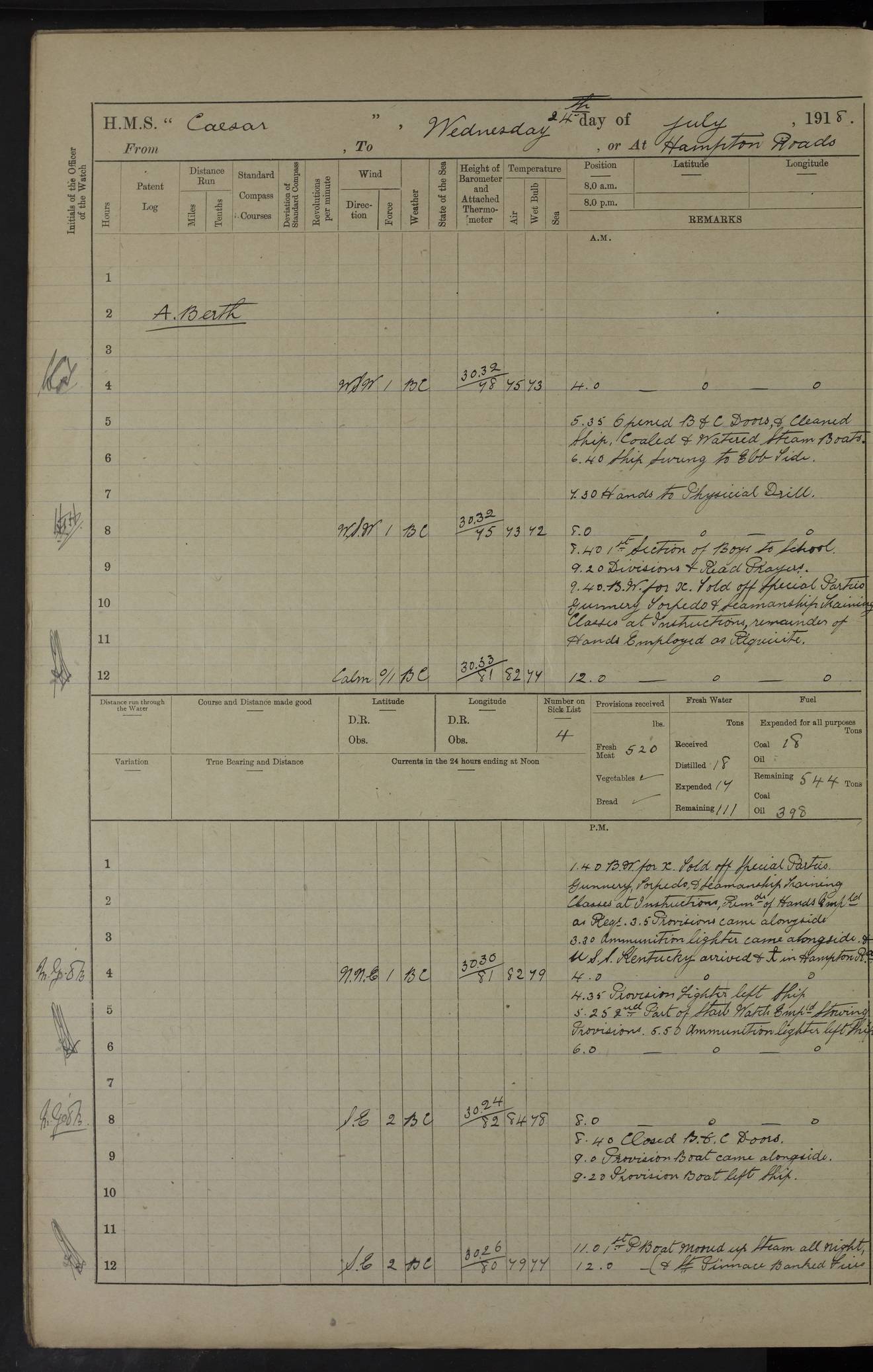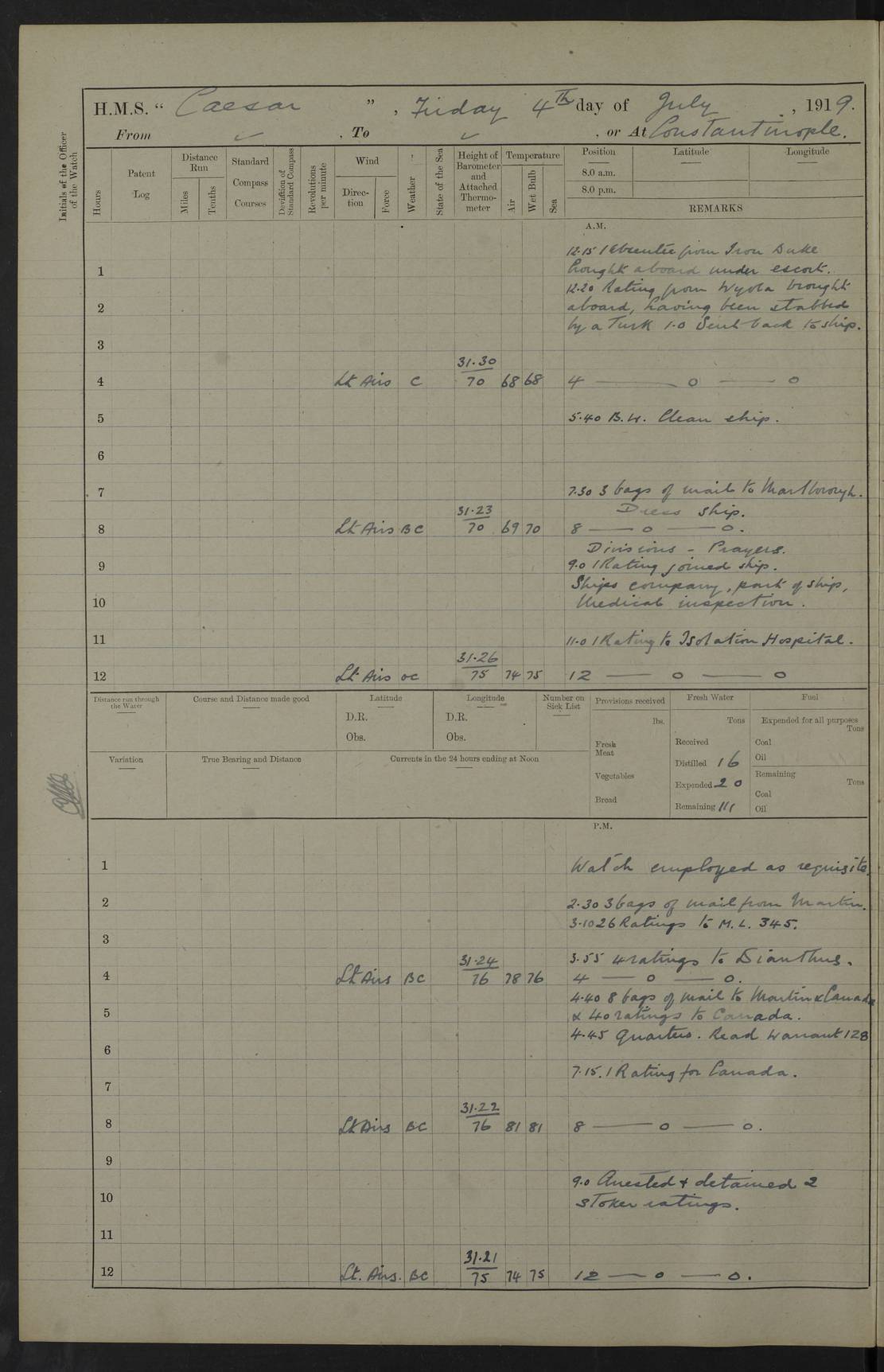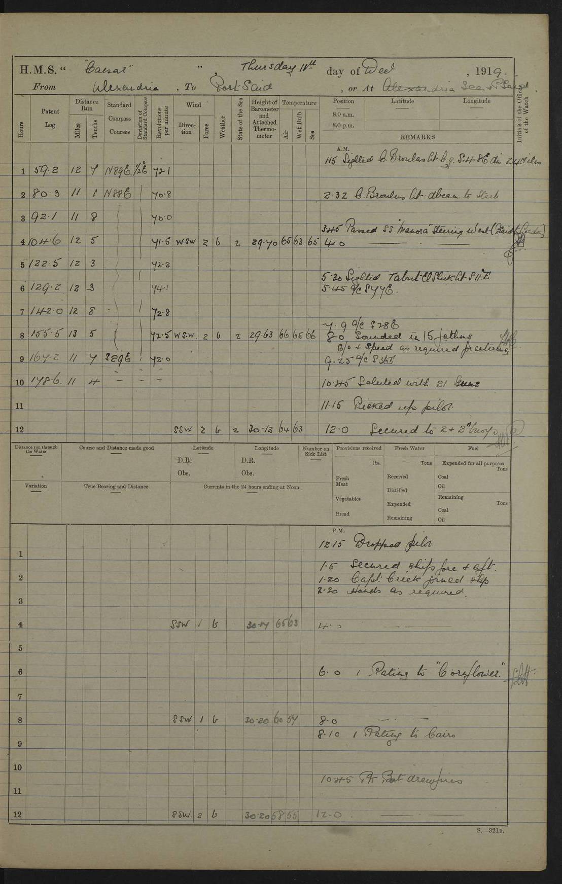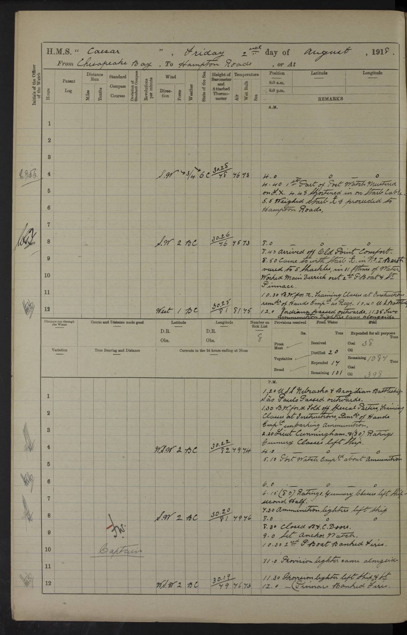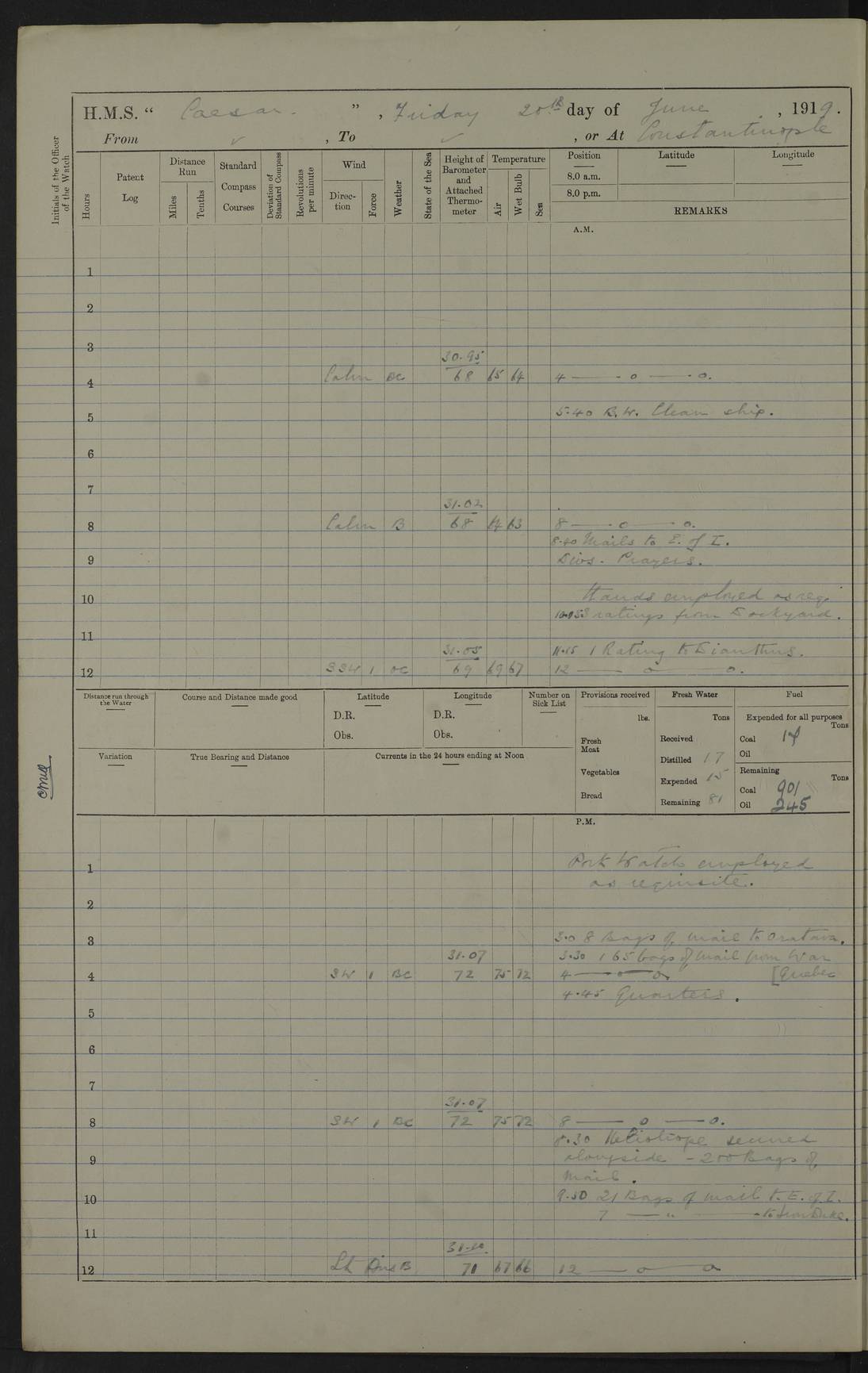 Notes: 1. Latitude/longitude, including for days in port, show representative decimal positions for each day, as calculated by the Old Weather project's analysis program. As such, they differ by varying amounts from the positions recorded, usually at noon, in the log pages. In addition, some latitudes/longitudes have been amended in edited logs for errors in the logs, for errors in identifying locations by the analysis program, or simply for greater accuracy. In all cases, refer to the log-page scans for the positions as originally recorded. Not all log pages contain this information and the ships' positions have therefore often been estimated. 2. Full account of any day is available by clicking on the link above that day. Groups of links refer to log book covers and introductory information; some may be blank. Editor’s notes: Positions (Latitude and Longitude) are given for noon each day, correcting or estimating the position when appropriate. These positions are shown to two decimal places, even when approximate, to indicate when Caesar has moved short distances, particularly when engaged in gunnery practice. If exact times are not indicated in the log they have, when appropriate, been estimated from the position of the entries (which show times on the left hand side of the log page). A note is made of numbers on the sick list where this is 5 or more. This and other information from the log is included in square brackets [not in italics] if it is not to be found under “Remarks” on the right hand side of the page. Additional information about geographical locations, terminology and about merchant and foreign naval ships encountered has been provided where identification is reasonably certain, by means of embedded links within the text. |