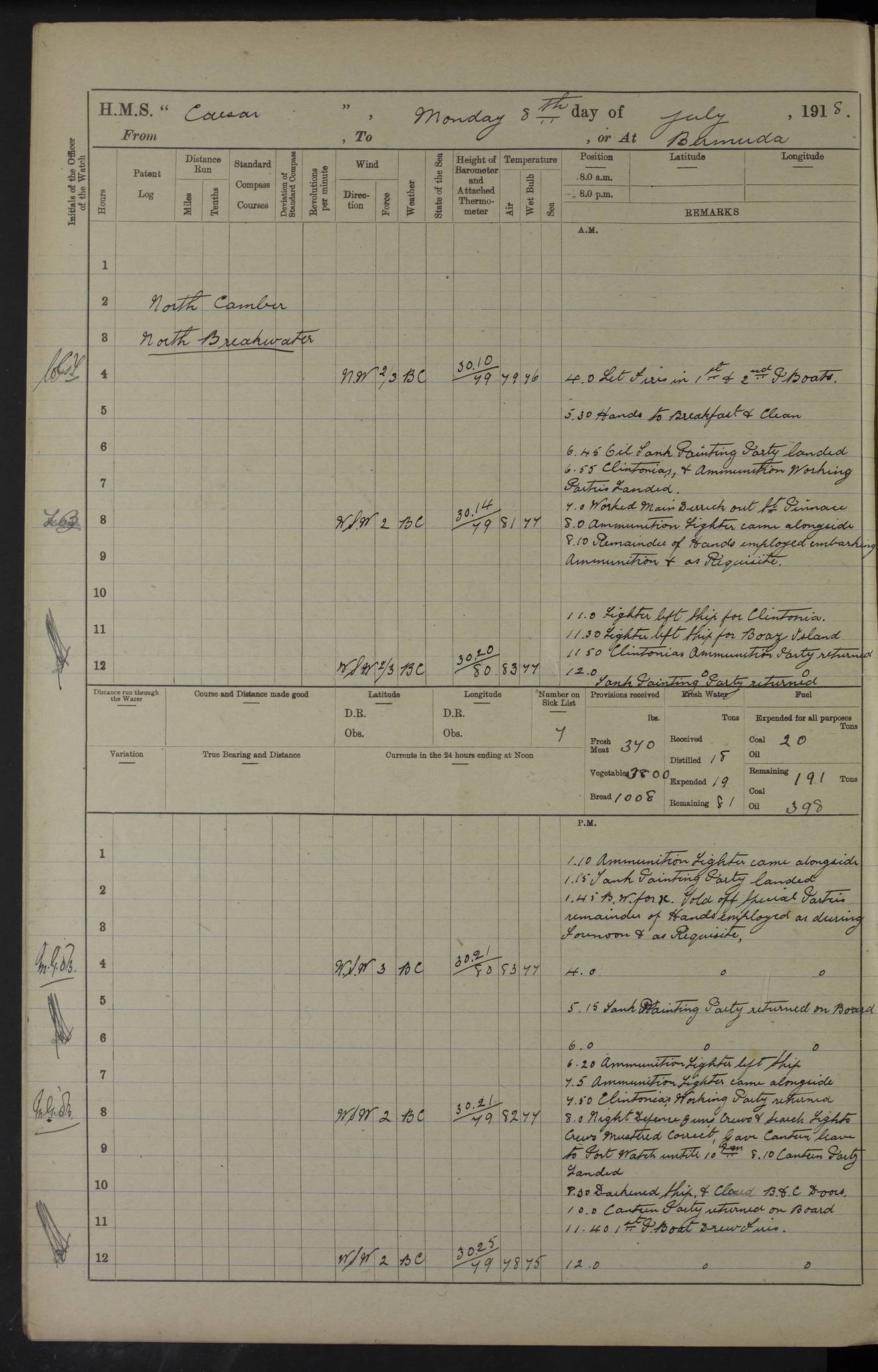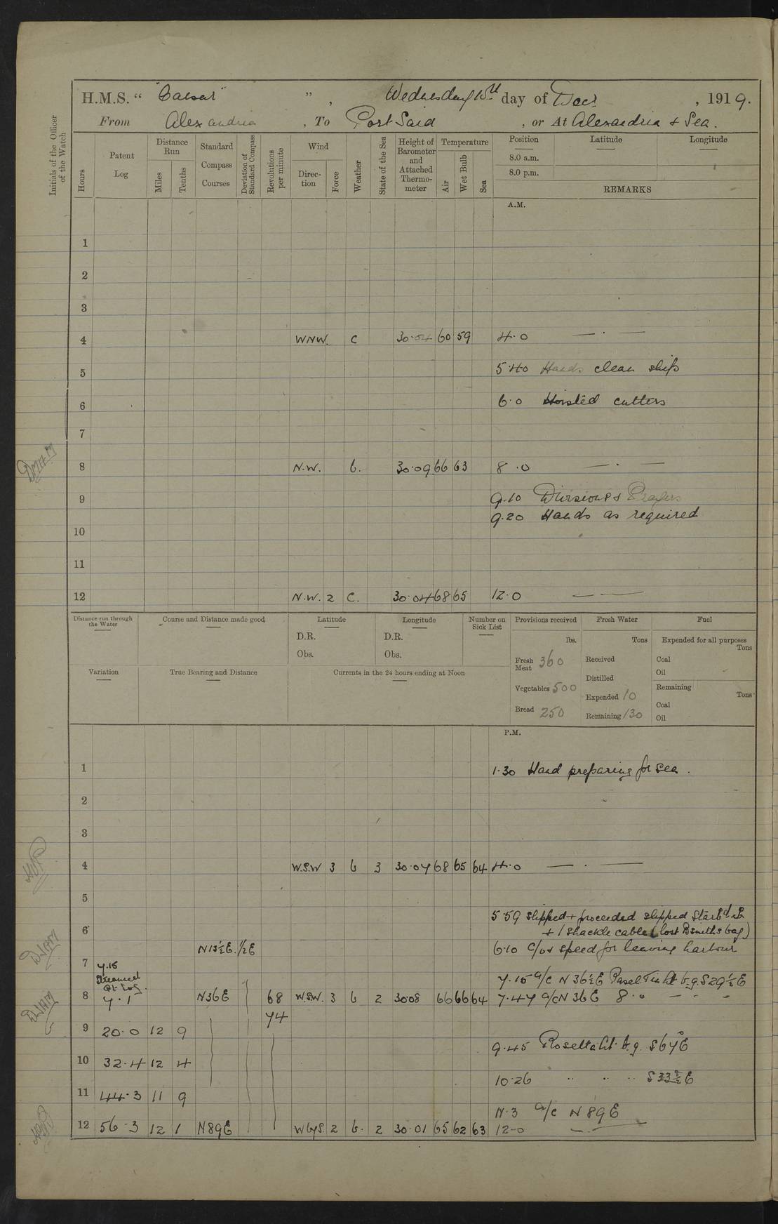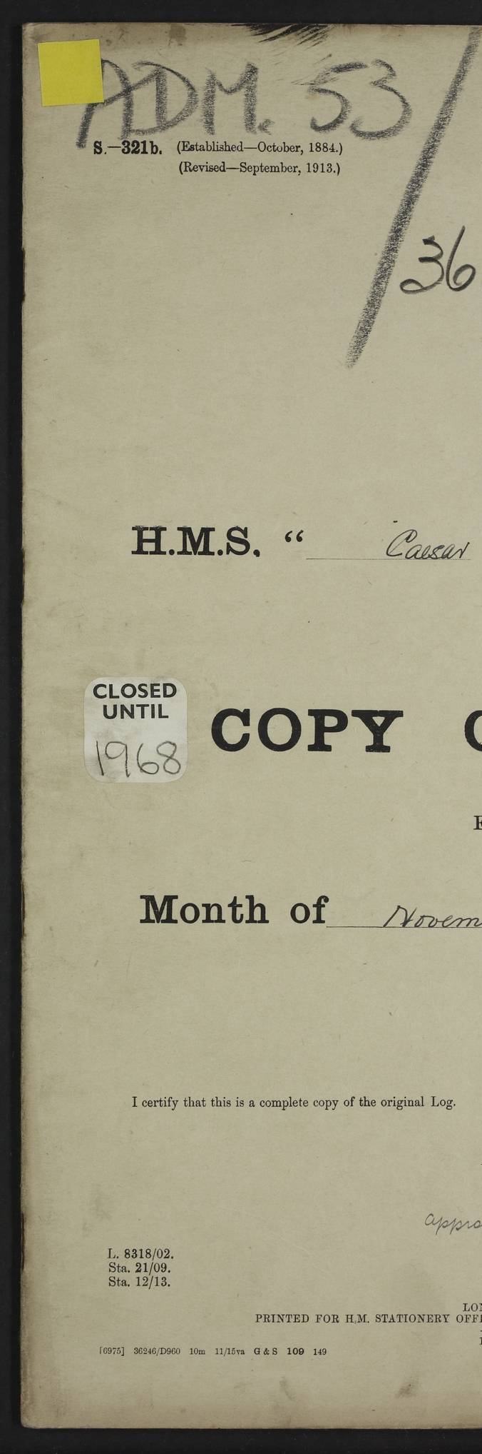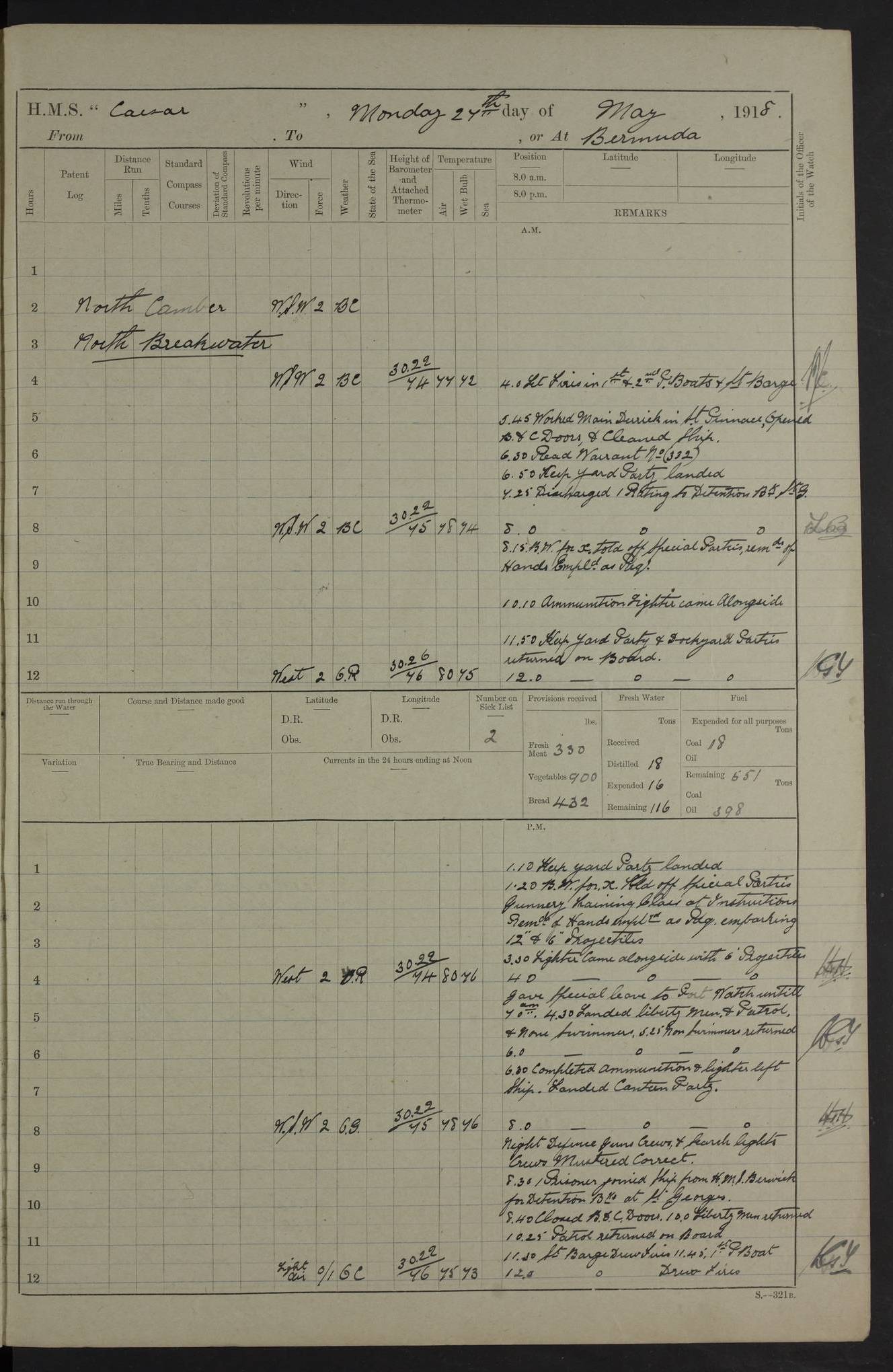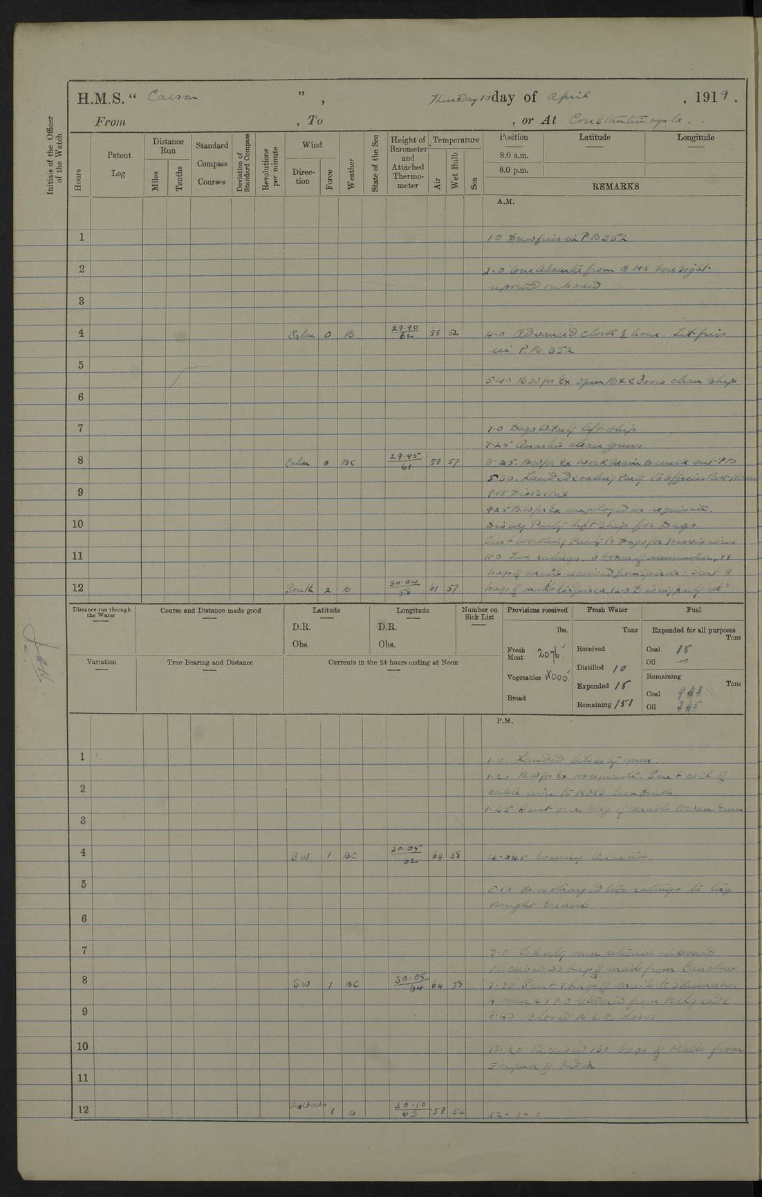 Notes: 1. Latitude/longitude, including for days in port, show representative decimal positions for each day, as calculated by the Old Weather project's analysis program. As such, they differ by varying amounts from the positions recorded, usually at noon, in the log pages. In addition, some latitudes/longitudes have been amended in edited logs for errors in the logs, for errors in identifying locations by the analysis program, or simply for greater accuracy. In all cases, refer to the log-page scans for the positions as originally recorded. Not all log pages contain this information and the ships' positions have therefore often been estimated. 2. Full account of any day is available by clicking on the link above that day. Groups of links refer to log book covers and introductory information; some may be blank. Editor’s notes: Positions (Latitude and Longitude) are given for noon each day, correcting or estimating the position when appropriate. These positions are shown to two decimal places, even when approximate, to indicate when Caesar has moved short distances, particularly when engaged in gunnery practice. If exact times are not indicated in the log they have, when appropriate, been estimated from the position of the entries (which show times on the left hand side of the log page). A note is made of numbers on the sick list where this is 5 or more. This and other information from the log is included in square brackets [not in italics] if it is not to be found under “Remarks” on the right hand side of the page. Additional information about geographical locations, terminology and about merchant and foreign naval ships encountered has been provided where identification is reasonably certain, by means of embedded links within the text. |