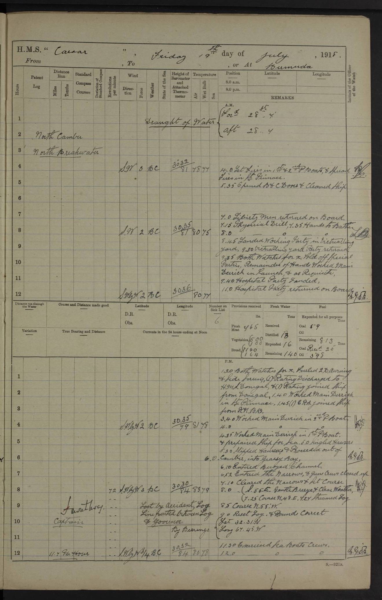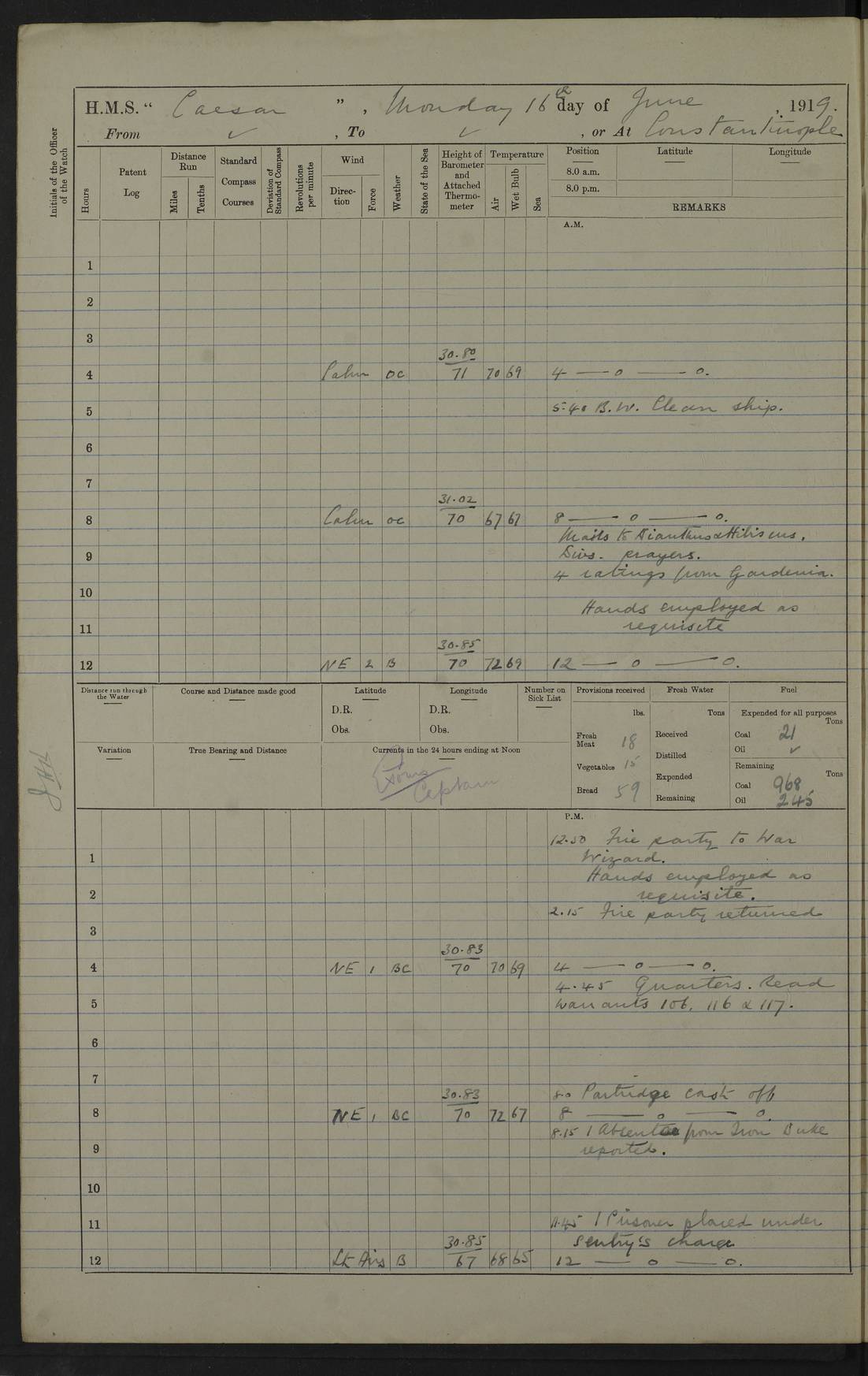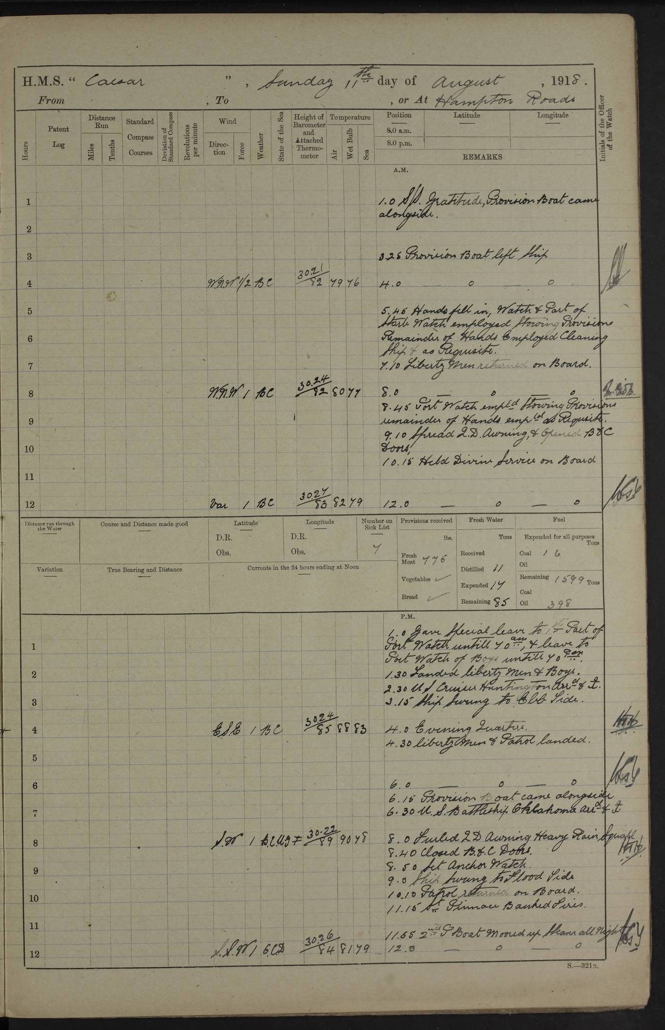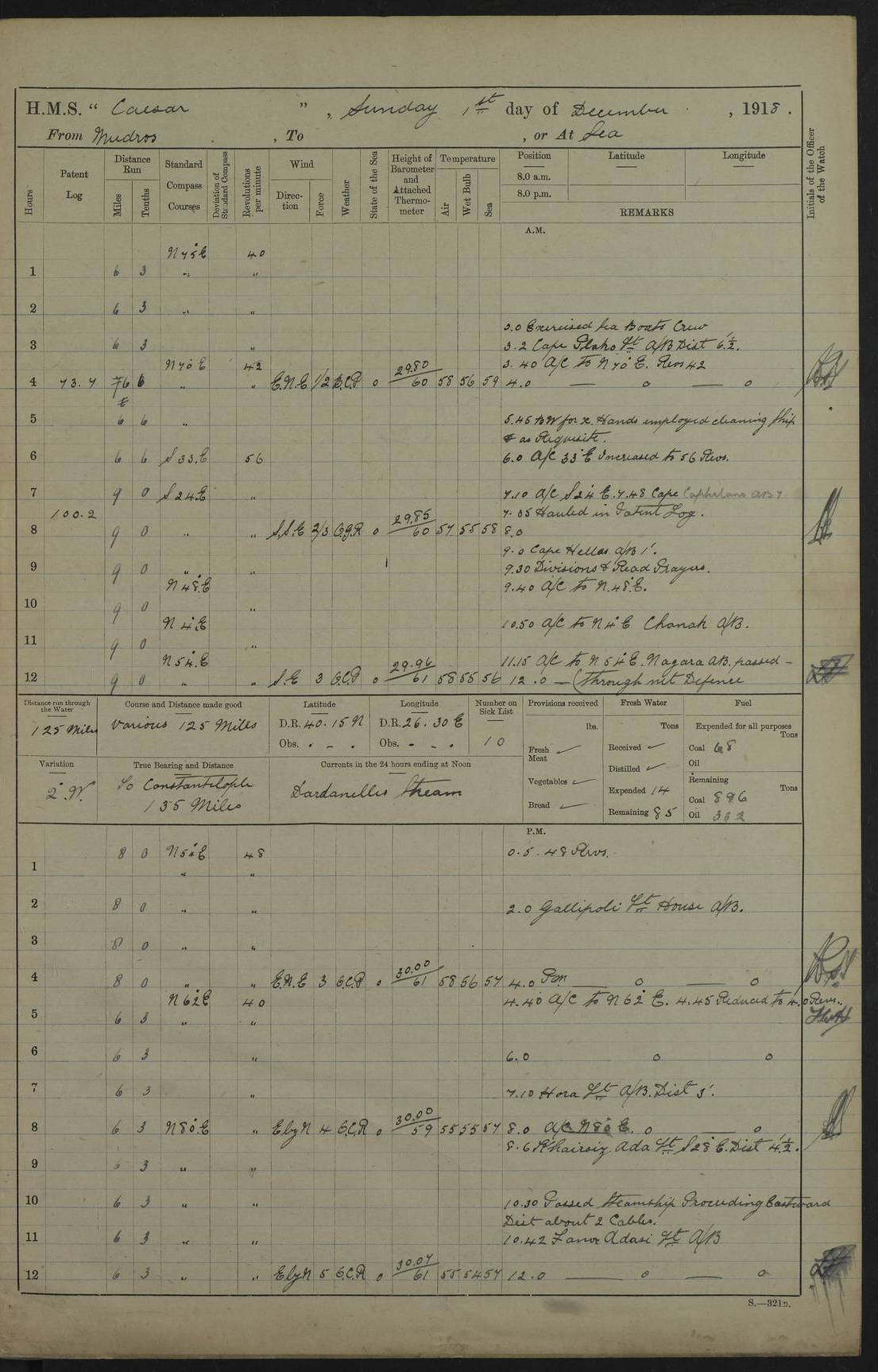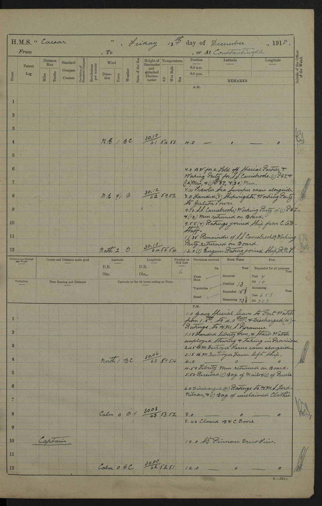 Notes: 1. Latitude/longitude, including for days in port, show representative decimal positions for each day, as calculated by the Old Weather project's analysis program. As such, they differ by varying amounts from the positions recorded, usually at noon, in the log pages. In addition, some latitudes/longitudes have been amended in edited logs for errors in the logs, for errors in identifying locations by the analysis program, or simply for greater accuracy. In all cases, refer to the log-page scans for the positions as originally recorded. Not all log pages contain this information and the ships' positions have therefore often been estimated. 2. Full account of any day is available by clicking on the link above that day. Groups of links refer to log book covers and introductory information; some may be blank. Editor’s notes: Positions (Latitude and Longitude) are given for noon each day, correcting or estimating the position when appropriate. These positions are shown to two decimal places, even when approximate, to indicate when Caesar has moved short distances, particularly when engaged in gunnery practice. If exact times are not indicated in the log they have, when appropriate, been estimated from the position of the entries (which show times on the left hand side of the log page). A note is made of numbers on the sick list where this is 5 or more. This and other information from the log is included in square brackets [not in italics] if it is not to be found under “Remarks” on the right hand side of the page. Additional information about geographical locations, terminology and about merchant and foreign naval ships encountered has been provided where identification is reasonably certain, by means of embedded links within the text. |