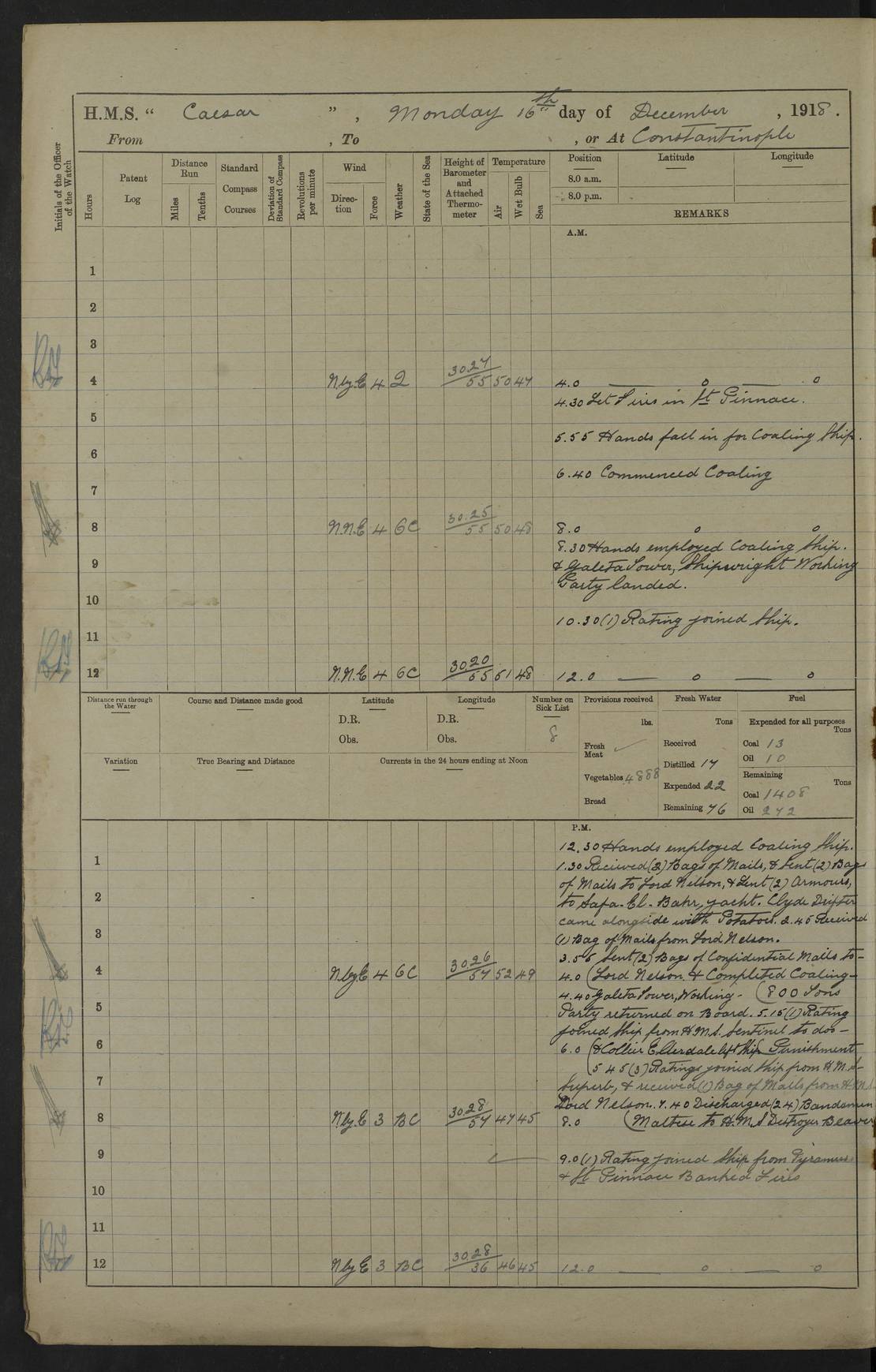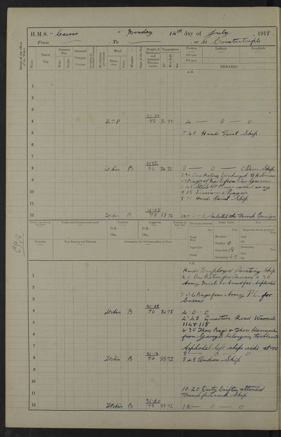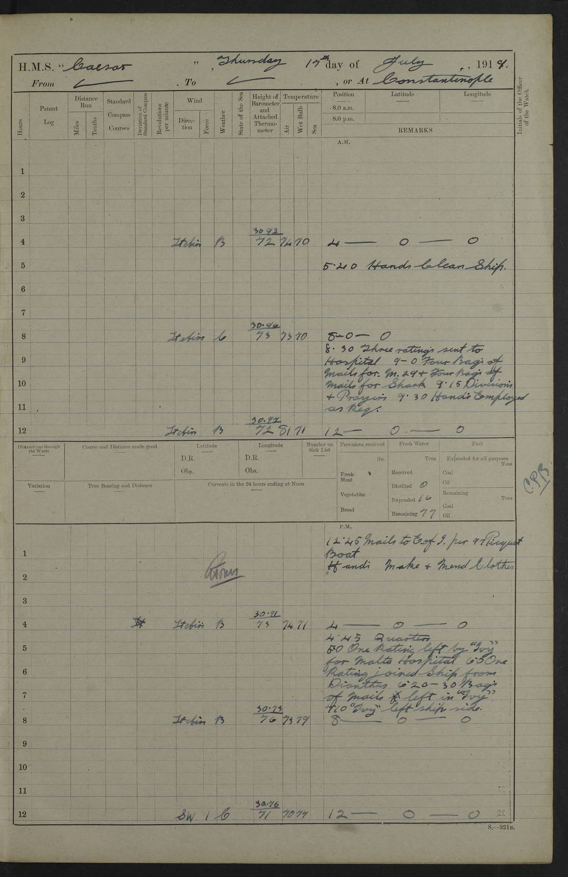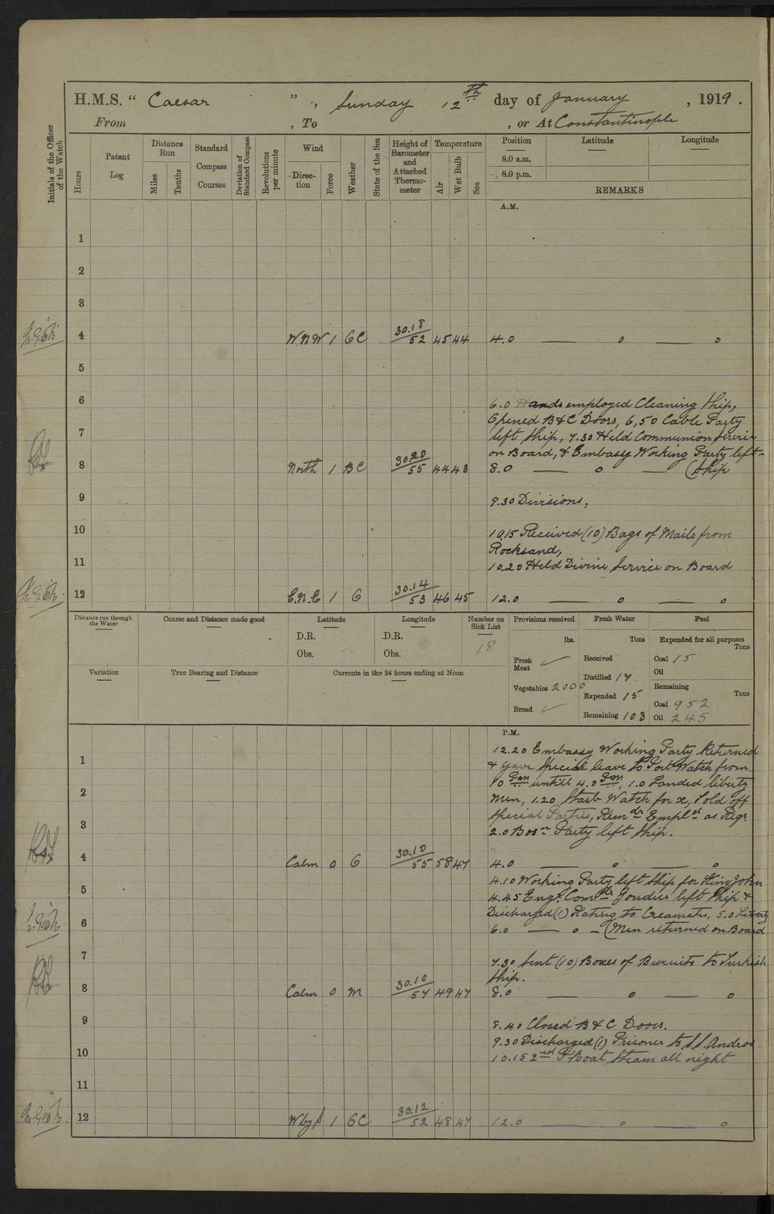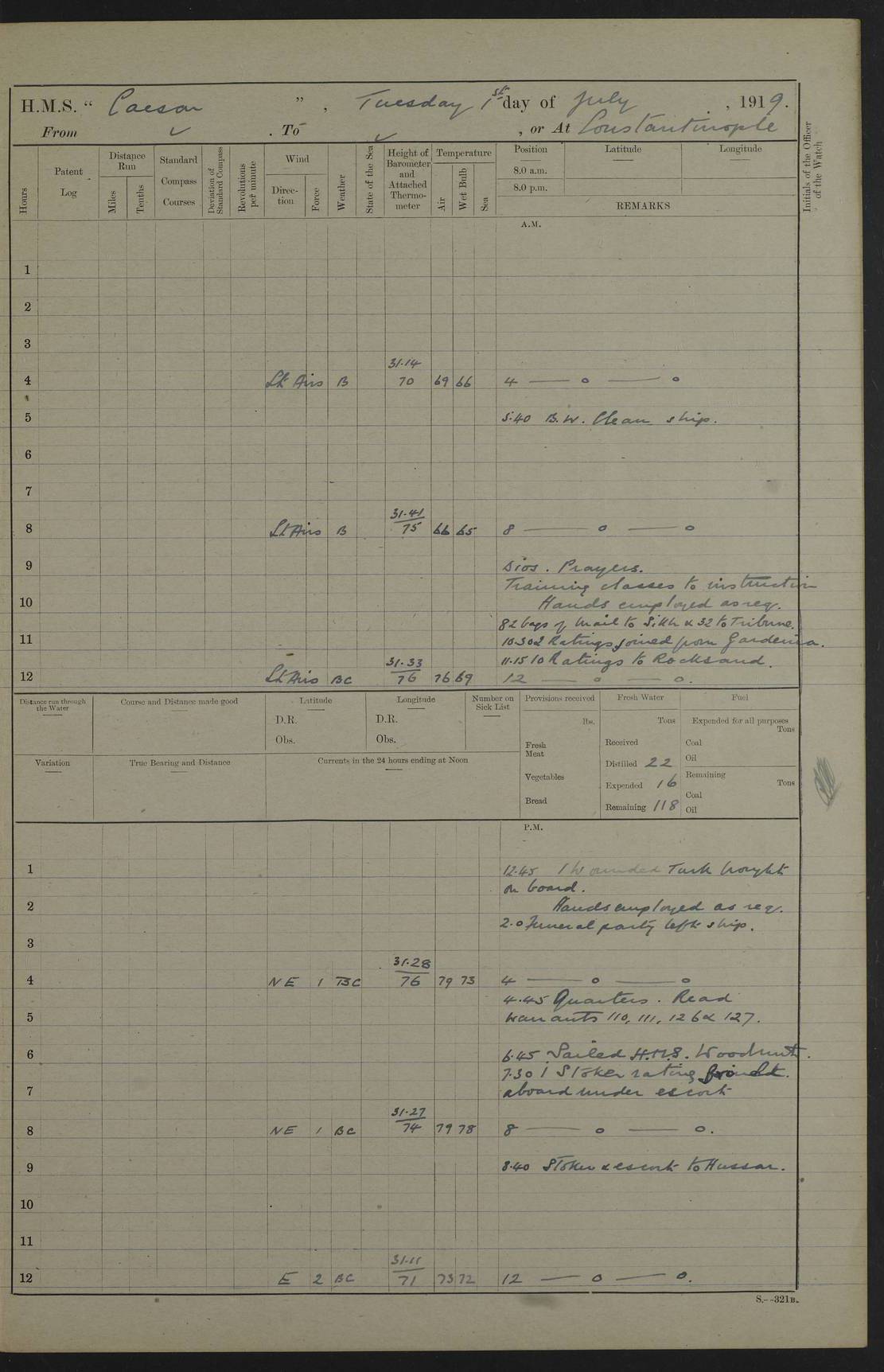 Notes: 1. Latitude/longitude, including for days in port, show representative decimal positions for each day, as calculated by the Old Weather project's analysis program. As such, they differ by varying amounts from the positions recorded, usually at noon, in the log pages. In addition, some latitudes/longitudes have been amended in edited logs for errors in the logs, for errors in identifying locations by the analysis program, or simply for greater accuracy. In all cases, refer to the log-page scans for the positions as originally recorded. Not all log pages contain this information and the ships' positions have therefore often been estimated. 2. Full account of any day is available by clicking on the link above that day. Groups of links refer to log book covers and introductory information; some may be blank. Editor’s notes: Positions (Latitude and Longitude) are given for noon each day, correcting or estimating the position when appropriate. These positions are shown to two decimal places, even when approximate, to indicate when Caesar has moved short distances, particularly when engaged in gunnery practice. If exact times are not indicated in the log they have, when appropriate, been estimated from the position of the entries (which show times on the left hand side of the log page). A note is made of numbers on the sick list where this is 5 or more. This and other information from the log is included in square brackets [not in italics] if it is not to be found under “Remarks” on the right hand side of the page. Additional information about geographical locations, terminology and about merchant and foreign naval ships encountered has been provided where identification is reasonably certain, by means of embedded links within the text. |
