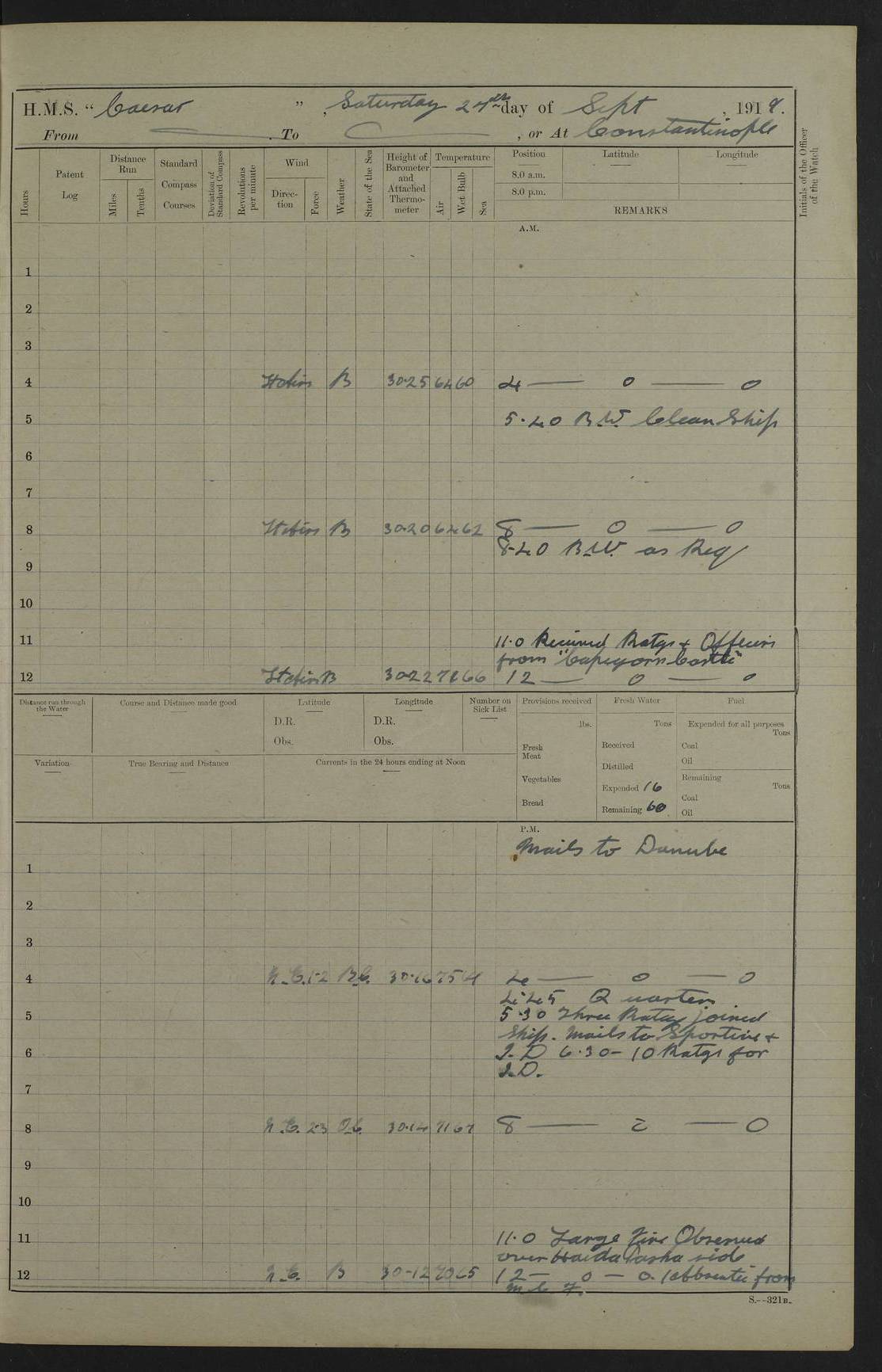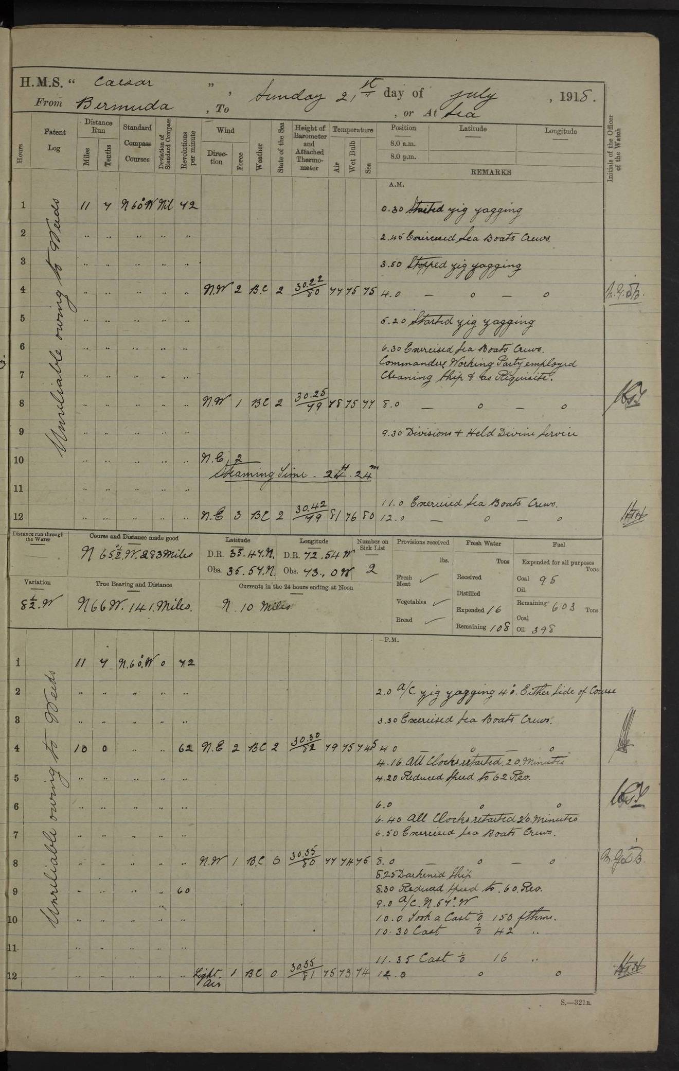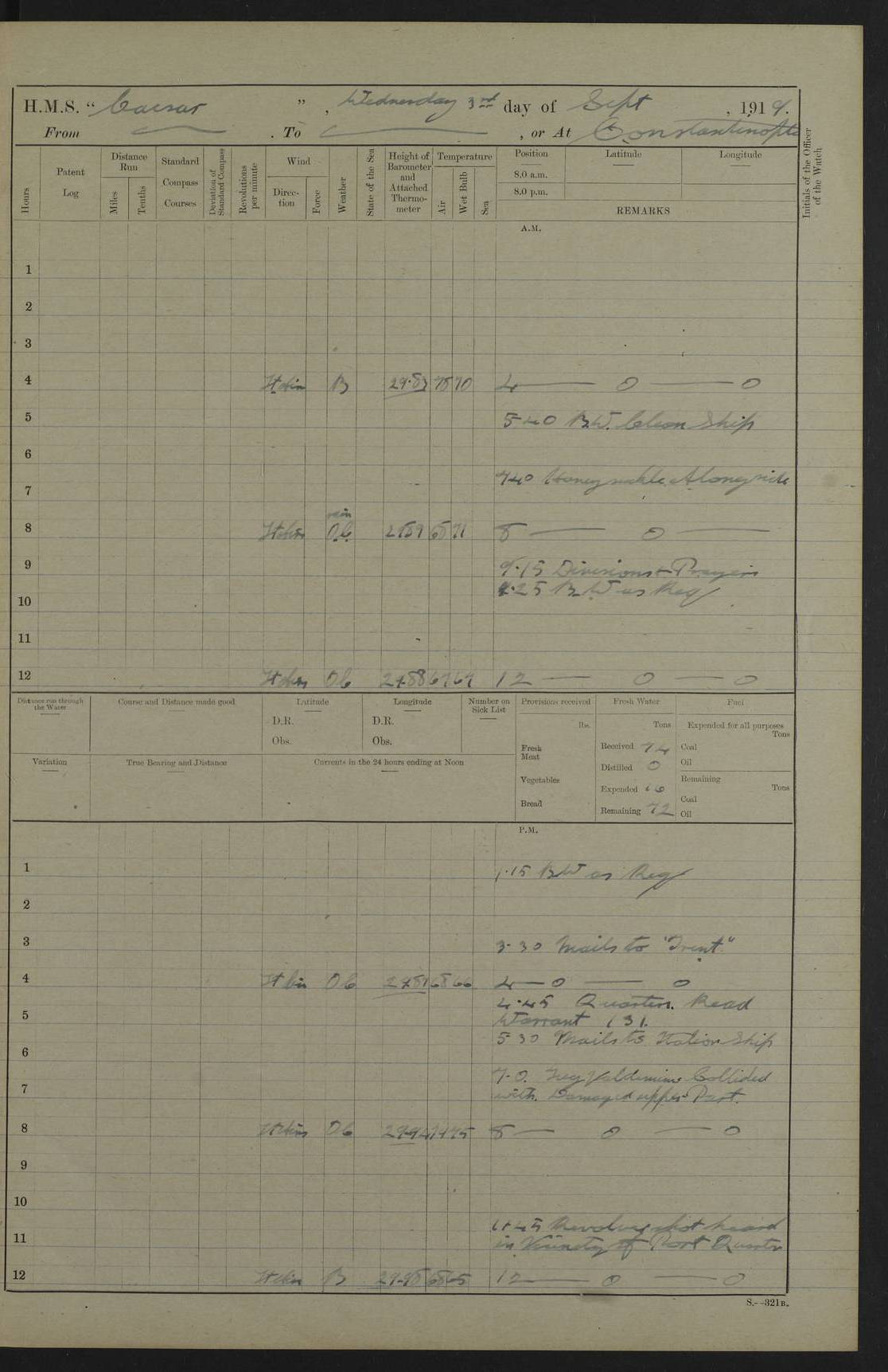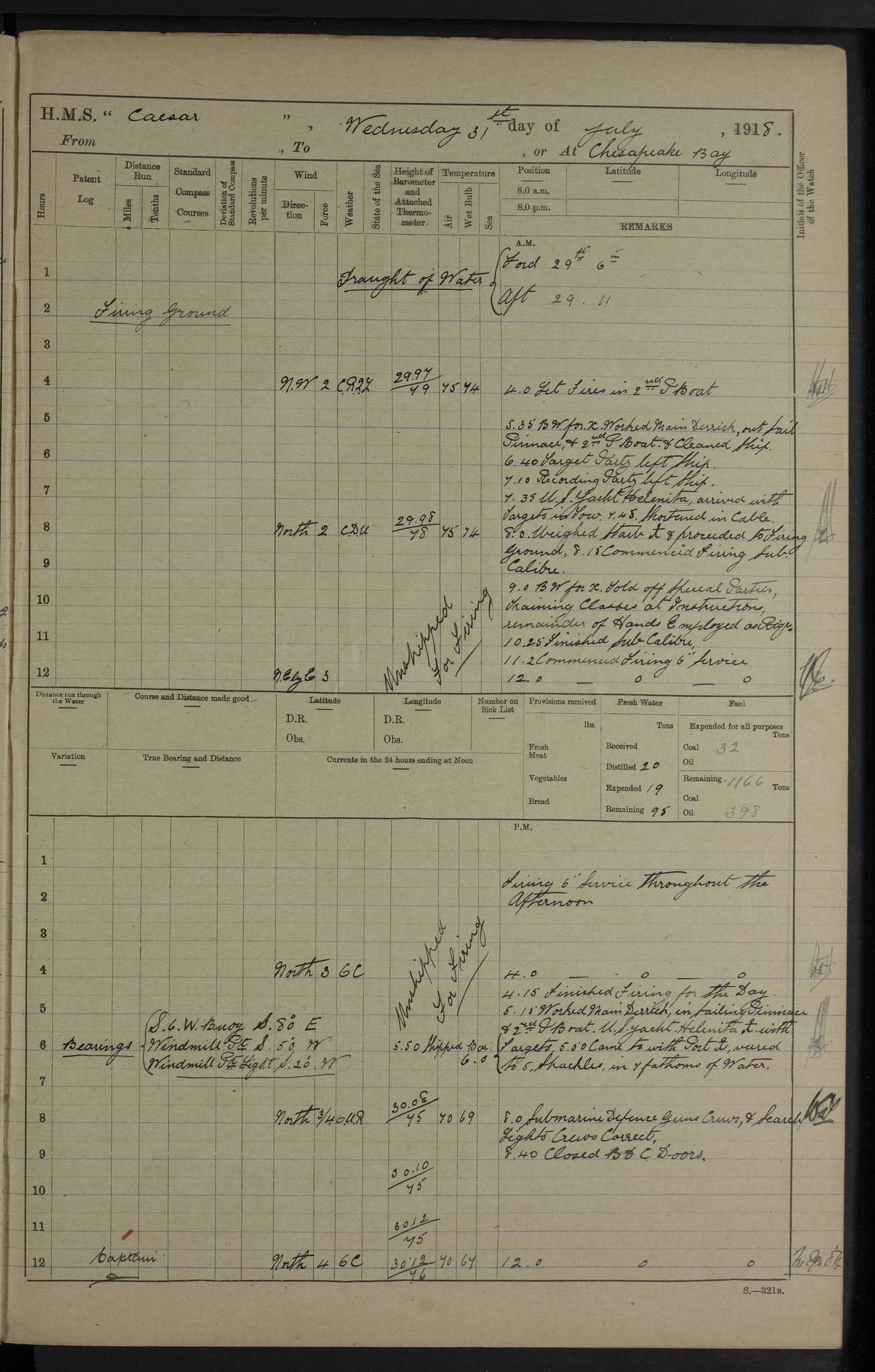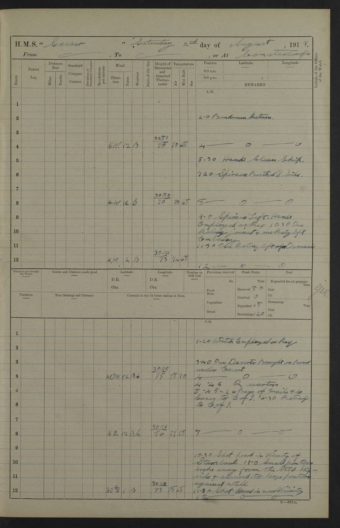 Notes: 1. Latitude/longitude, including for days in port, show representative decimal positions for each day, as calculated by the Old Weather project's analysis program. As such, they differ by varying amounts from the positions recorded, usually at noon, in the log pages. In addition, some latitudes/longitudes have been amended in edited logs for errors in the logs, for errors in identifying locations by the analysis program, or simply for greater accuracy. In all cases, refer to the log-page scans for the positions as originally recorded. Not all log pages contain this information and the ships' positions have therefore often been estimated. 2. Full account of any day is available by clicking on the link above that day. Groups of links refer to log book covers and introductory information; some may be blank. Editor’s notes: Positions (Latitude and Longitude) are given for noon each day, correcting or estimating the position when appropriate. These positions are shown to two decimal places, even when approximate, to indicate when Caesar has moved short distances, particularly when engaged in gunnery practice. If exact times are not indicated in the log they have, when appropriate, been estimated from the position of the entries (which show times on the left hand side of the log page). A note is made of numbers on the sick list where this is 5 or more. This and other information from the log is included in square brackets [not in italics] if it is not to be found under “Remarks” on the right hand side of the page. Additional information about geographical locations, terminology and about merchant and foreign naval ships encountered has been provided where identification is reasonably certain, by means of embedded links within the text. |