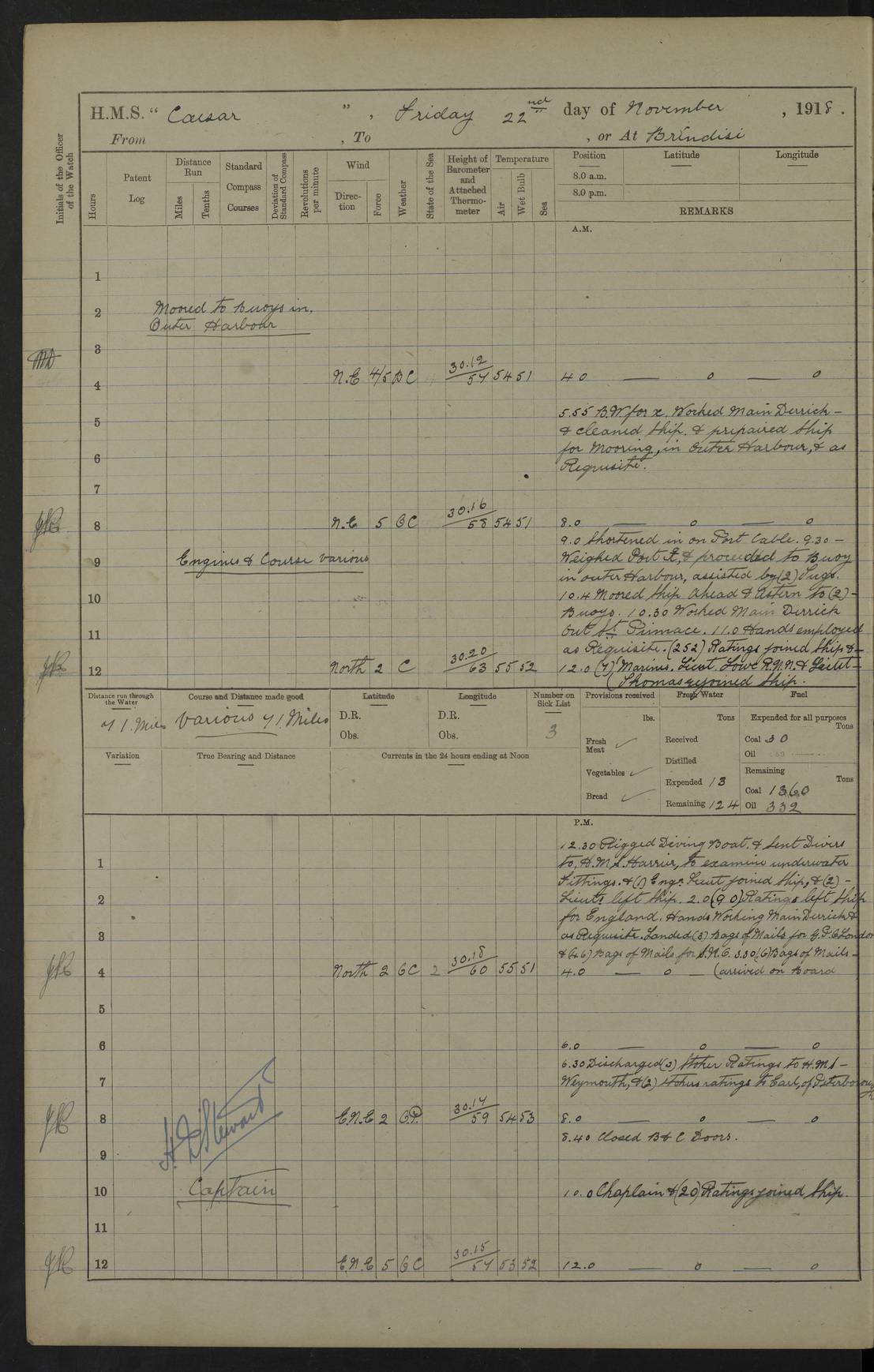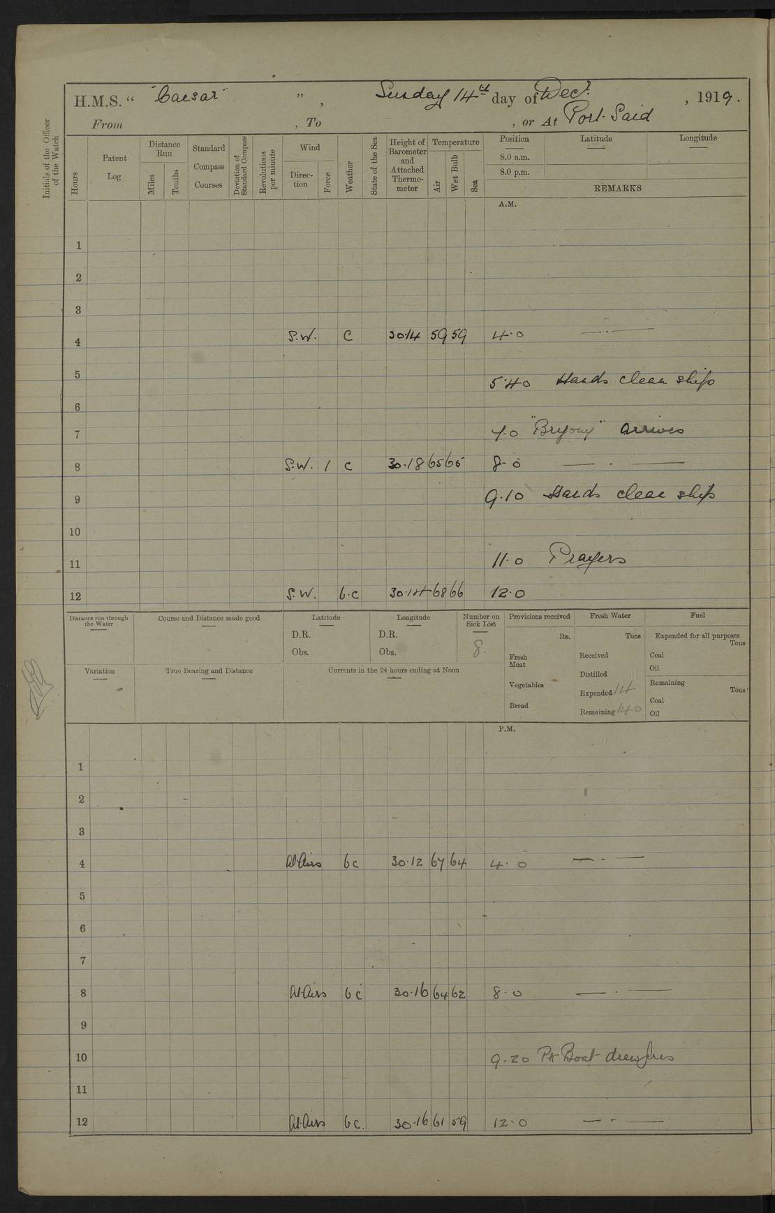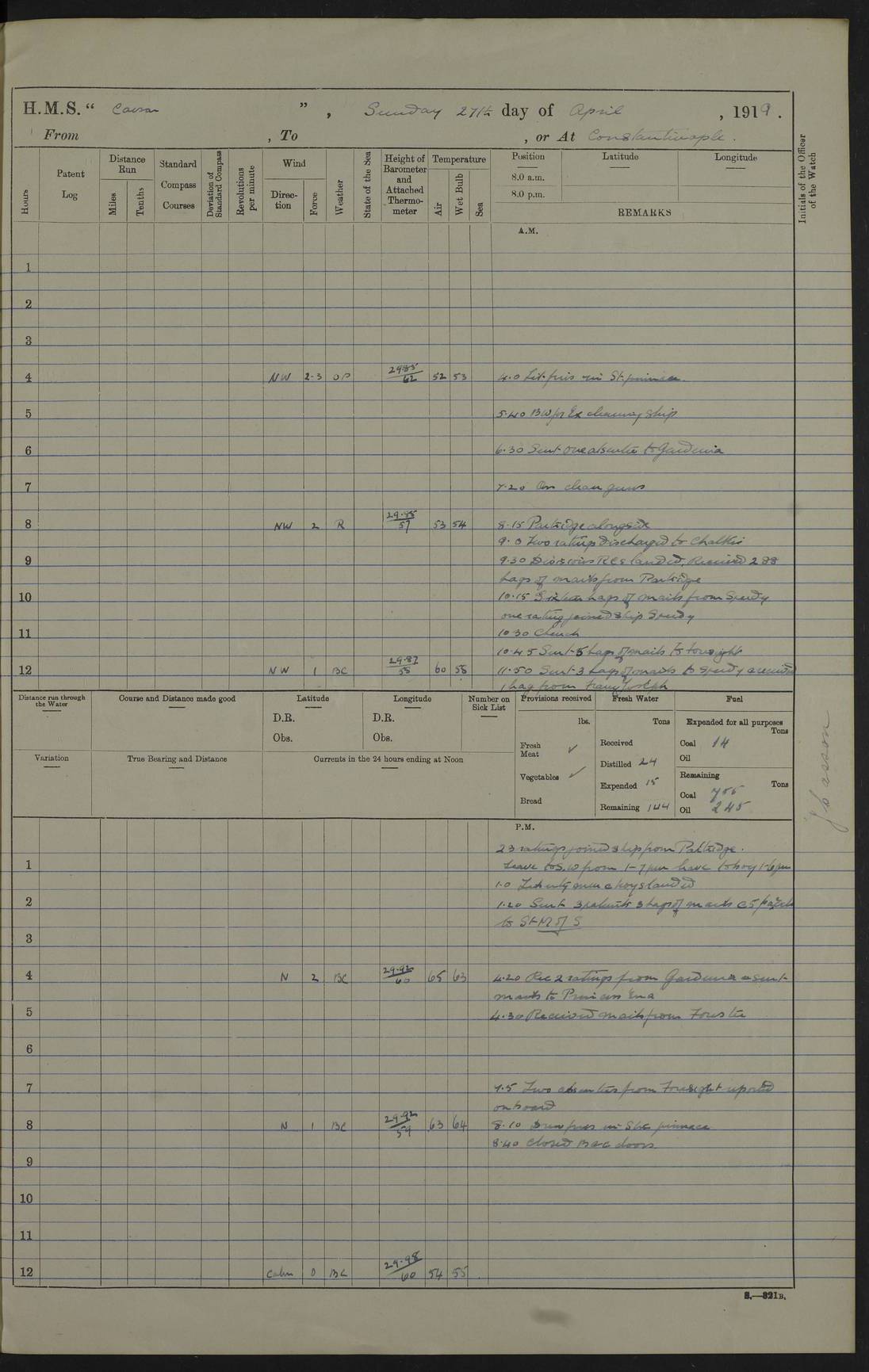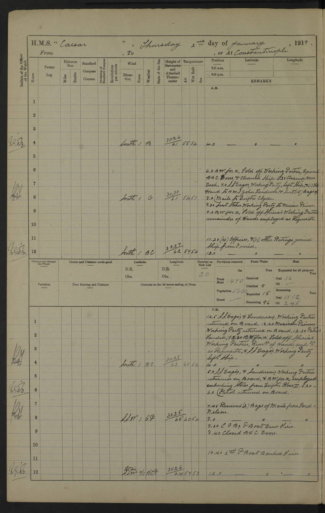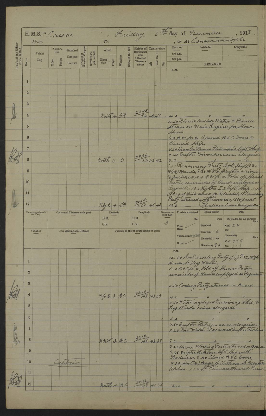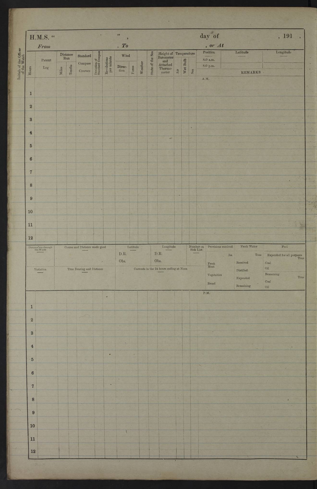 Notes: 1. Latitude/longitude, including for days in port, show representative decimal positions for each day, as calculated by the Old Weather project's analysis program. As such, they differ by varying amounts from the positions recorded, usually at noon, in the log pages. In addition, some latitudes/longitudes have been amended in edited logs for errors in the logs, for errors in identifying locations by the analysis program, or simply for greater accuracy. In all cases, refer to the log-page scans for the positions as originally recorded. Not all log pages contain this information and the ships' positions have therefore often been estimated. 2. Full account of any day is available by clicking on the link above that day. Groups of links refer to log book covers and introductory information; some may be blank. Editor’s notes: Positions (Latitude and Longitude) are given for noon each day, correcting or estimating the position when appropriate. These positions are shown to two decimal places, even when approximate, to indicate when Caesar has moved short distances, particularly when engaged in gunnery practice. If exact times are not indicated in the log they have, when appropriate, been estimated from the position of the entries (which show times on the left hand side of the log page). A note is made of numbers on the sick list where this is 5 or more. This and other information from the log is included in square brackets [not in italics] if it is not to be found under “Remarks” on the right hand side of the page. Additional information about geographical locations, terminology and about merchant and foreign naval ships encountered has been provided where identification is reasonably certain, by means of embedded links within the text. |