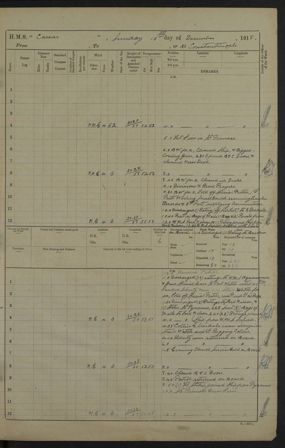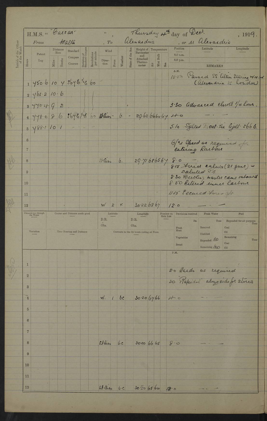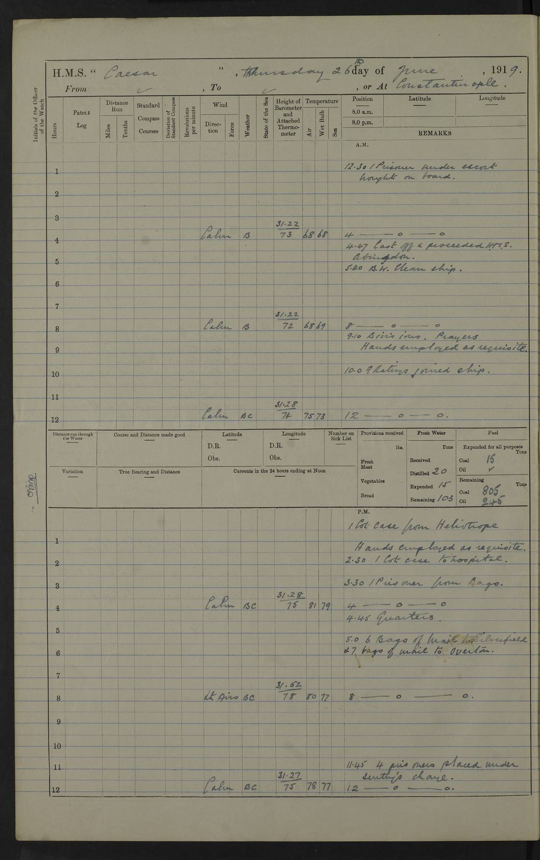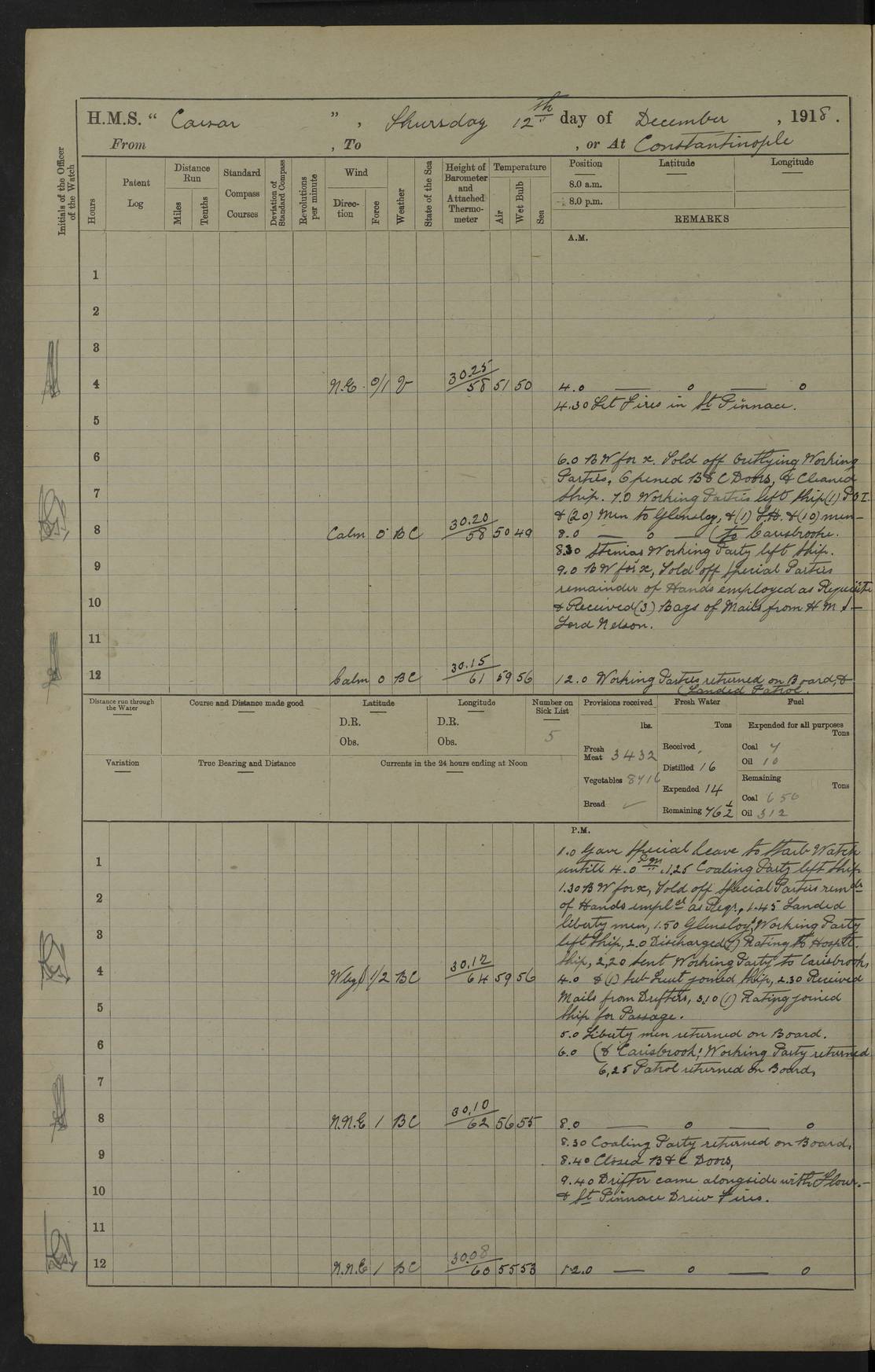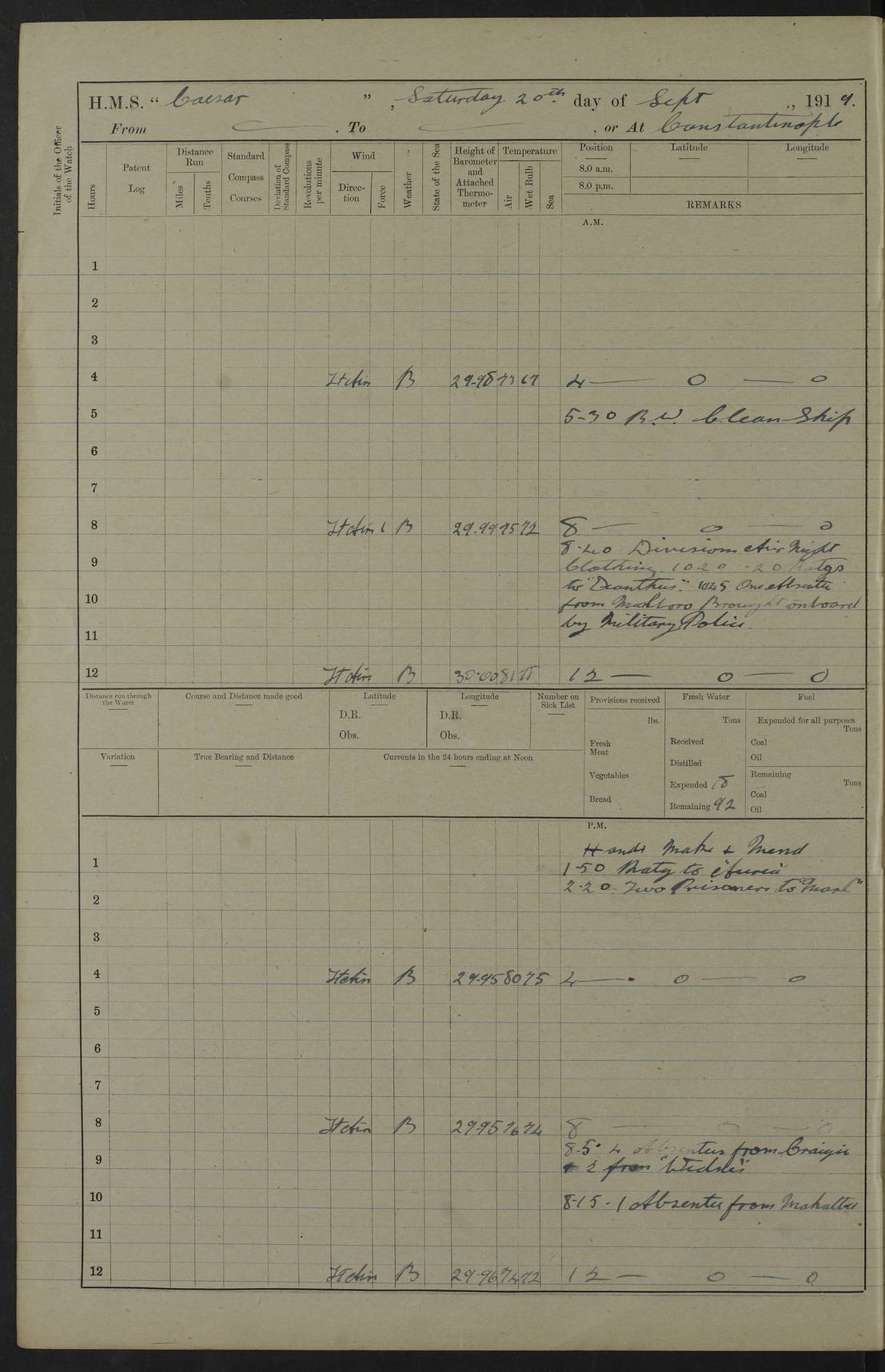 Notes: 1. Latitude/longitude, including for days in port, show representative decimal positions for each day, as calculated by the Old Weather project's analysis program. As such, they differ by varying amounts from the positions recorded, usually at noon, in the log pages. In addition, some latitudes/longitudes have been amended in edited logs for errors in the logs, for errors in identifying locations by the analysis program, or simply for greater accuracy. In all cases, refer to the log-page scans for the positions as originally recorded. Not all log pages contain this information and the ships' positions have therefore often been estimated. 2. Full account of any day is available by clicking on the link above that day. Groups of links refer to log book covers and introductory information; some may be blank. Editor’s notes: Positions (Latitude and Longitude) are given for noon each day, correcting or estimating the position when appropriate. These positions are shown to two decimal places, even when approximate, to indicate when Caesar has moved short distances, particularly when engaged in gunnery practice. If exact times are not indicated in the log they have, when appropriate, been estimated from the position of the entries (which show times on the left hand side of the log page). A note is made of numbers on the sick list where this is 5 or more. This and other information from the log is included in square brackets [not in italics] if it is not to be found under “Remarks” on the right hand side of the page. Additional information about geographical locations, terminology and about merchant and foreign naval ships encountered has been provided where identification is reasonably certain, by means of embedded links within the text. |