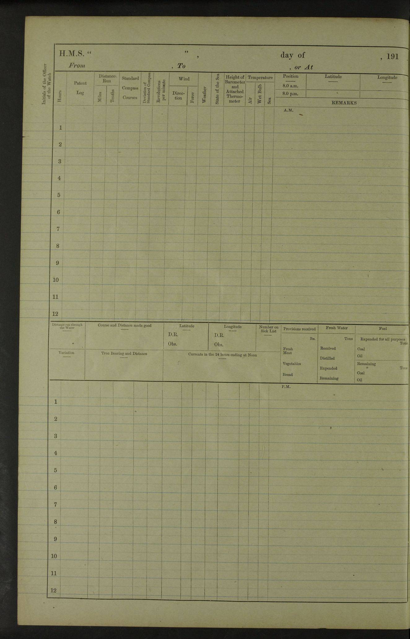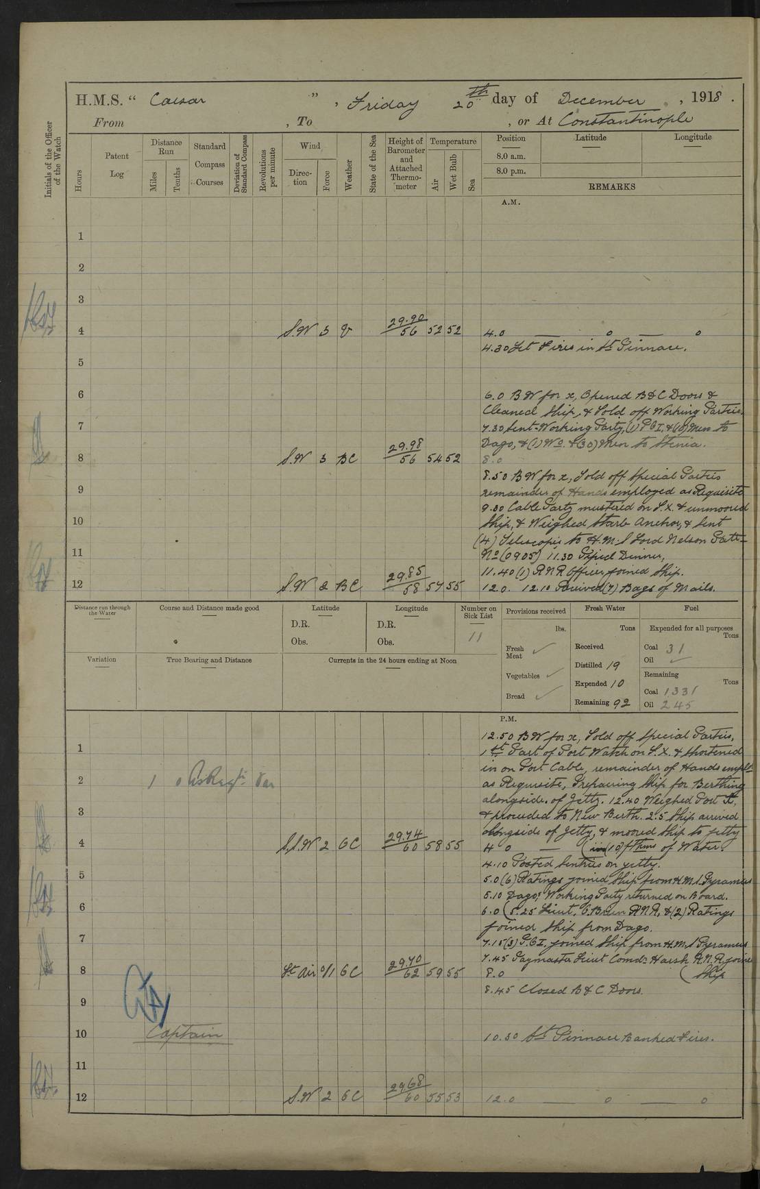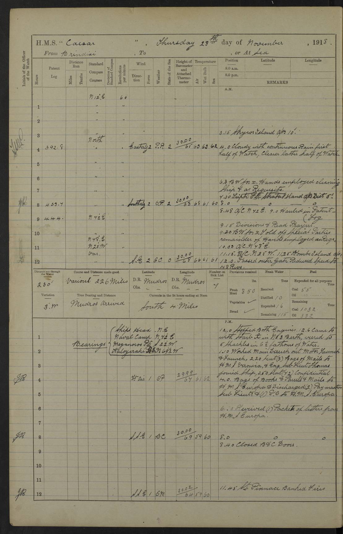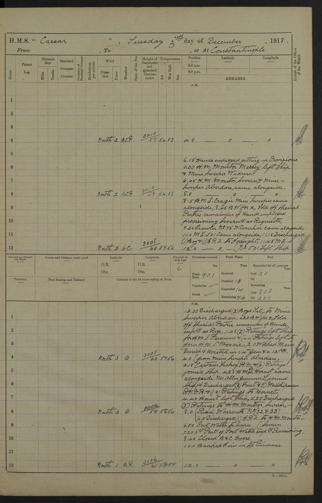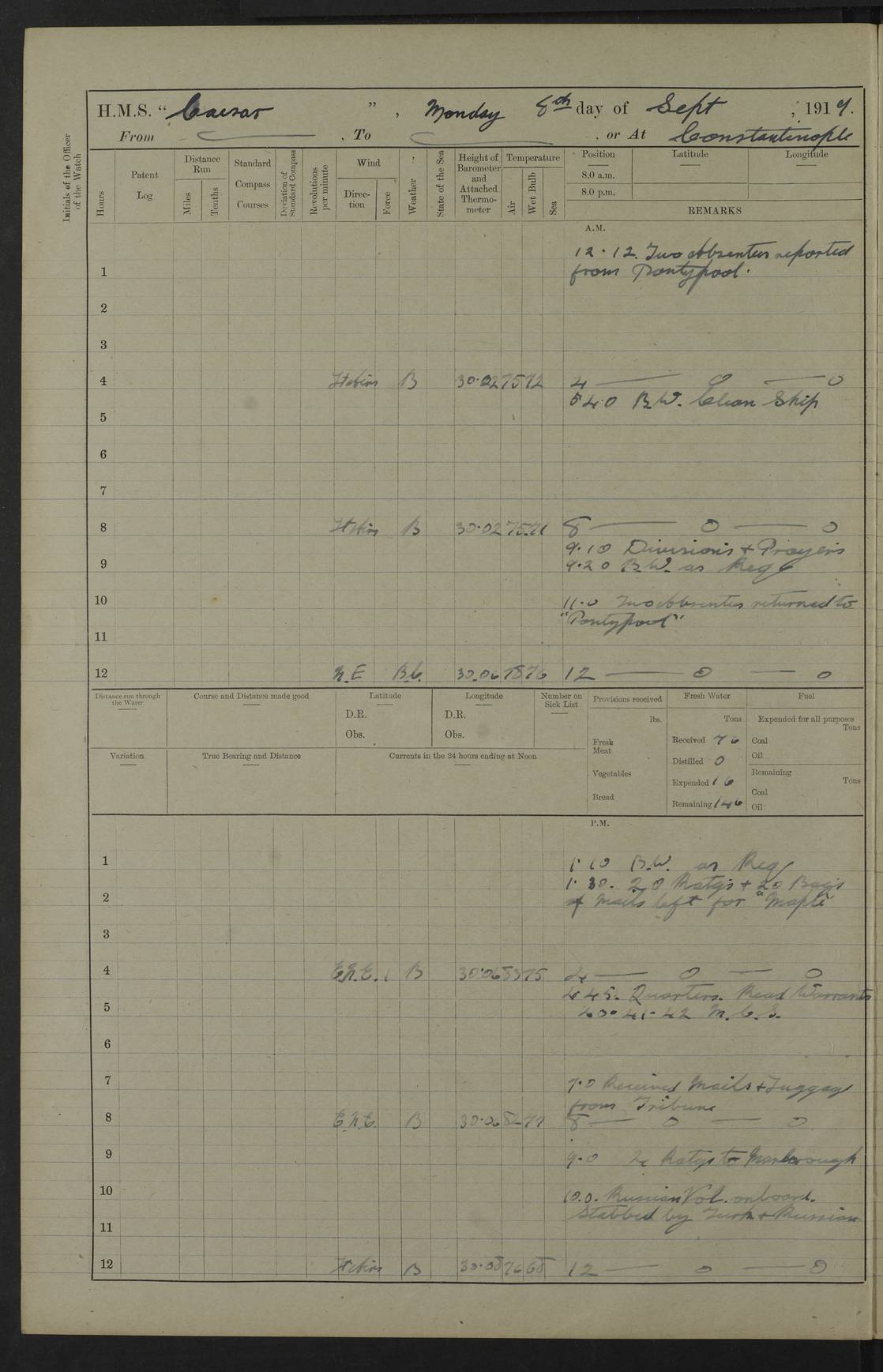 Notes: 1. Latitude/longitude, including for days in port, show representative decimal positions for each day, as calculated by the Old Weather project's analysis program. As such, they differ by varying amounts from the positions recorded, usually at noon, in the log pages. In addition, some latitudes/longitudes have been amended in edited logs for errors in the logs, for errors in identifying locations by the analysis program, or simply for greater accuracy. In all cases, refer to the log-page scans for the positions as originally recorded. Not all log pages contain this information and the ships' positions have therefore often been estimated. 2. Full account of any day is available by clicking on the link above that day. Groups of links refer to log book covers and introductory information; some may be blank. Editor’s notes: Positions (Latitude and Longitude) are given for noon each day, correcting or estimating the position when appropriate. These positions are shown to two decimal places, even when approximate, to indicate when Caesar has moved short distances, particularly when engaged in gunnery practice. If exact times are not indicated in the log they have, when appropriate, been estimated from the position of the entries (which show times on the left hand side of the log page). A note is made of numbers on the sick list where this is 5 or more. This and other information from the log is included in square brackets [not in italics] if it is not to be found under “Remarks” on the right hand side of the page. Additional information about geographical locations, terminology and about merchant and foreign naval ships encountered has been provided where identification is reasonably certain, by means of embedded links within the text. |