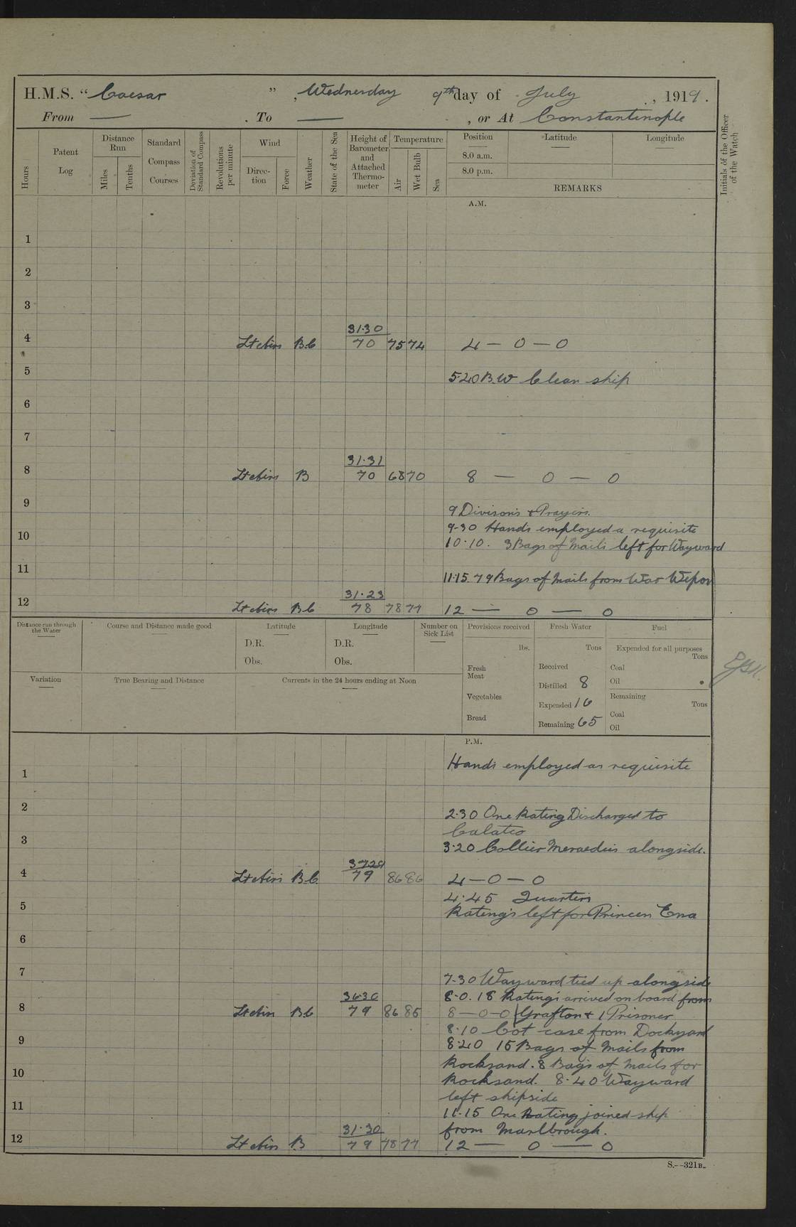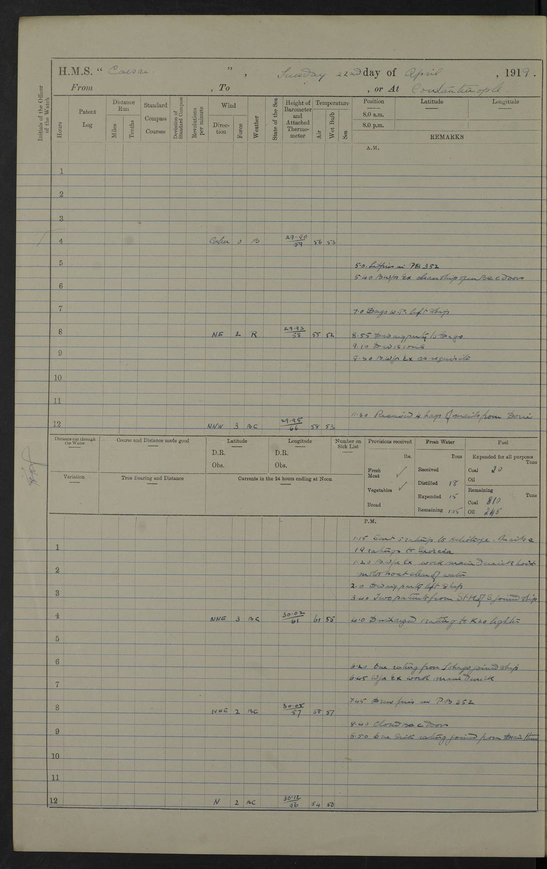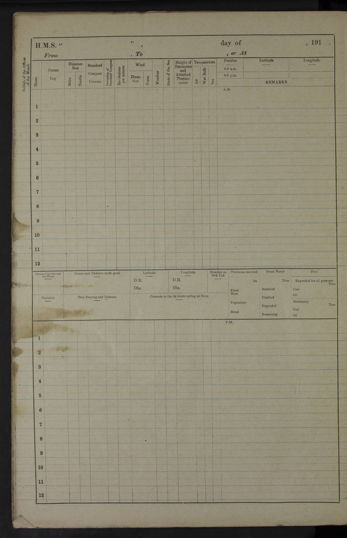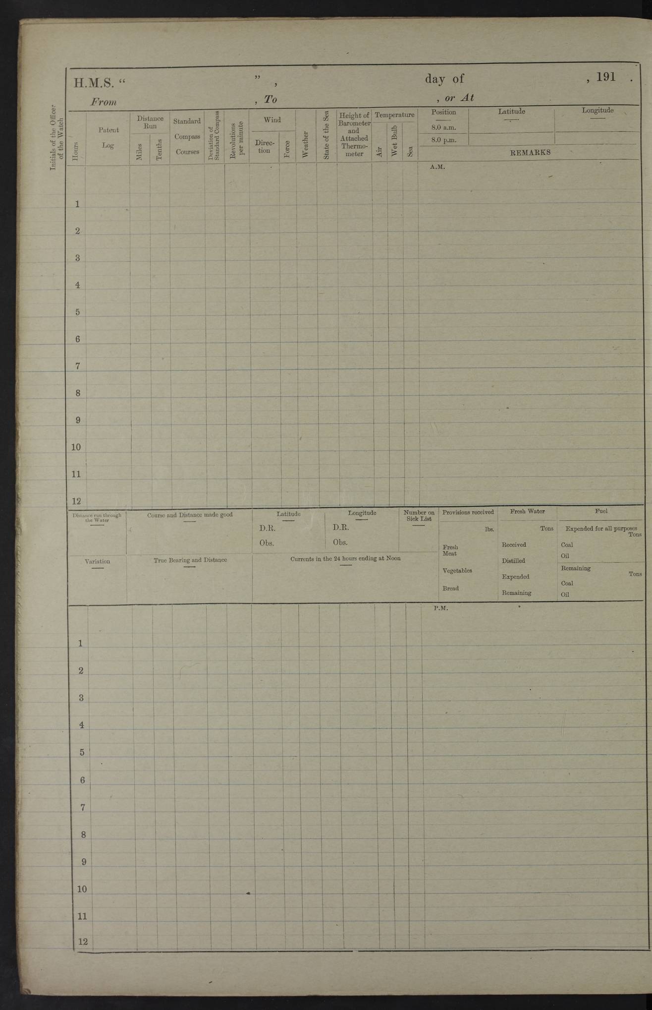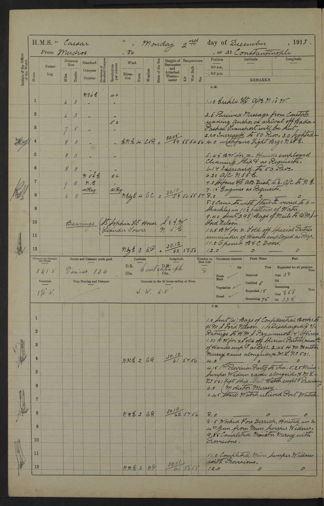 Notes: 1. Latitude/longitude, including for days in port, show representative decimal positions for each day, as calculated by the Old Weather project's analysis program. As such, they differ by varying amounts from the positions recorded, usually at noon, in the log pages. In addition, some latitudes/longitudes have been amended in edited logs for errors in the logs, for errors in identifying locations by the analysis program, or simply for greater accuracy. In all cases, refer to the log-page scans for the positions as originally recorded. Not all log pages contain this information and the ships' positions have therefore often been estimated. 2. Full account of any day is available by clicking on the link above that day. Groups of links refer to log book covers and introductory information; some may be blank. Editor’s notes: Positions (Latitude and Longitude) are given for noon each day, correcting or estimating the position when appropriate. These positions are shown to two decimal places, even when approximate, to indicate when Caesar has moved short distances, particularly when engaged in gunnery practice. If exact times are not indicated in the log they have, when appropriate, been estimated from the position of the entries (which show times on the left hand side of the log page). A note is made of numbers on the sick list where this is 5 or more. This and other information from the log is included in square brackets [not in italics] if it is not to be found under “Remarks” on the right hand side of the page. Additional information about geographical locations, terminology and about merchant and foreign naval ships encountered has been provided where identification is reasonably certain, by means of embedded links within the text. |
