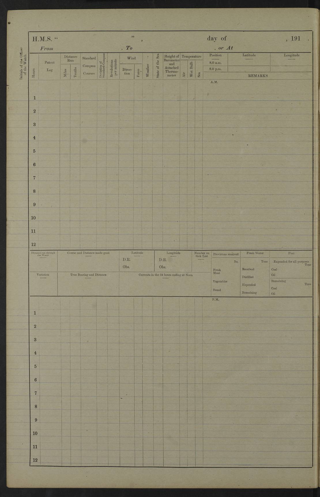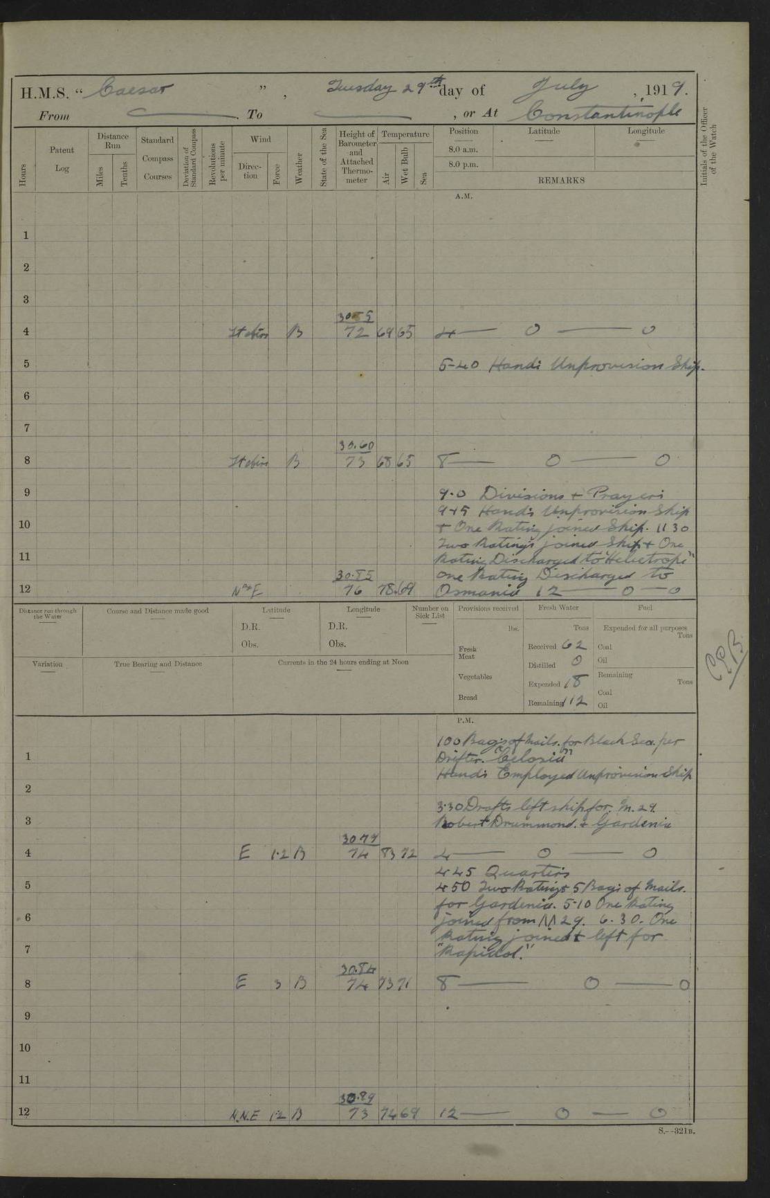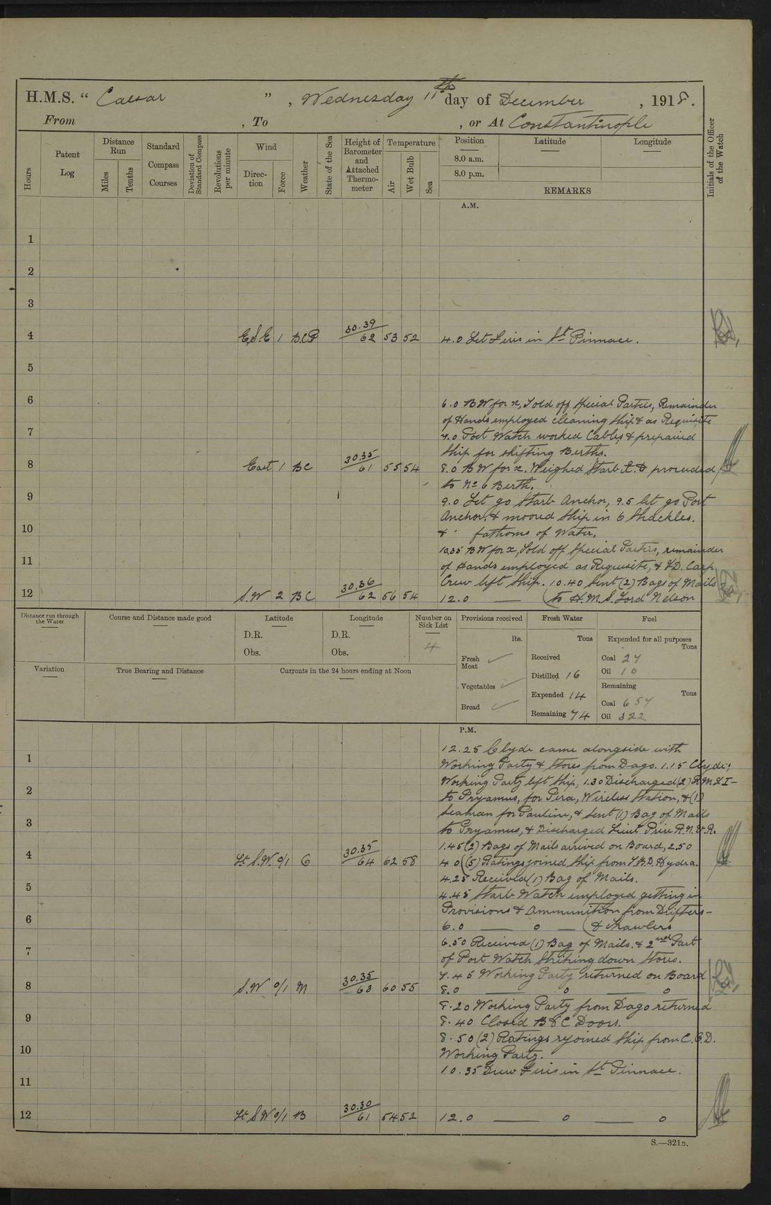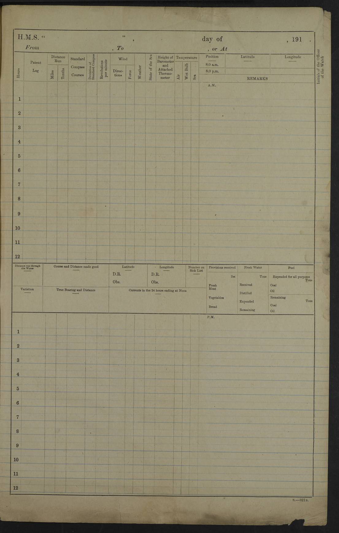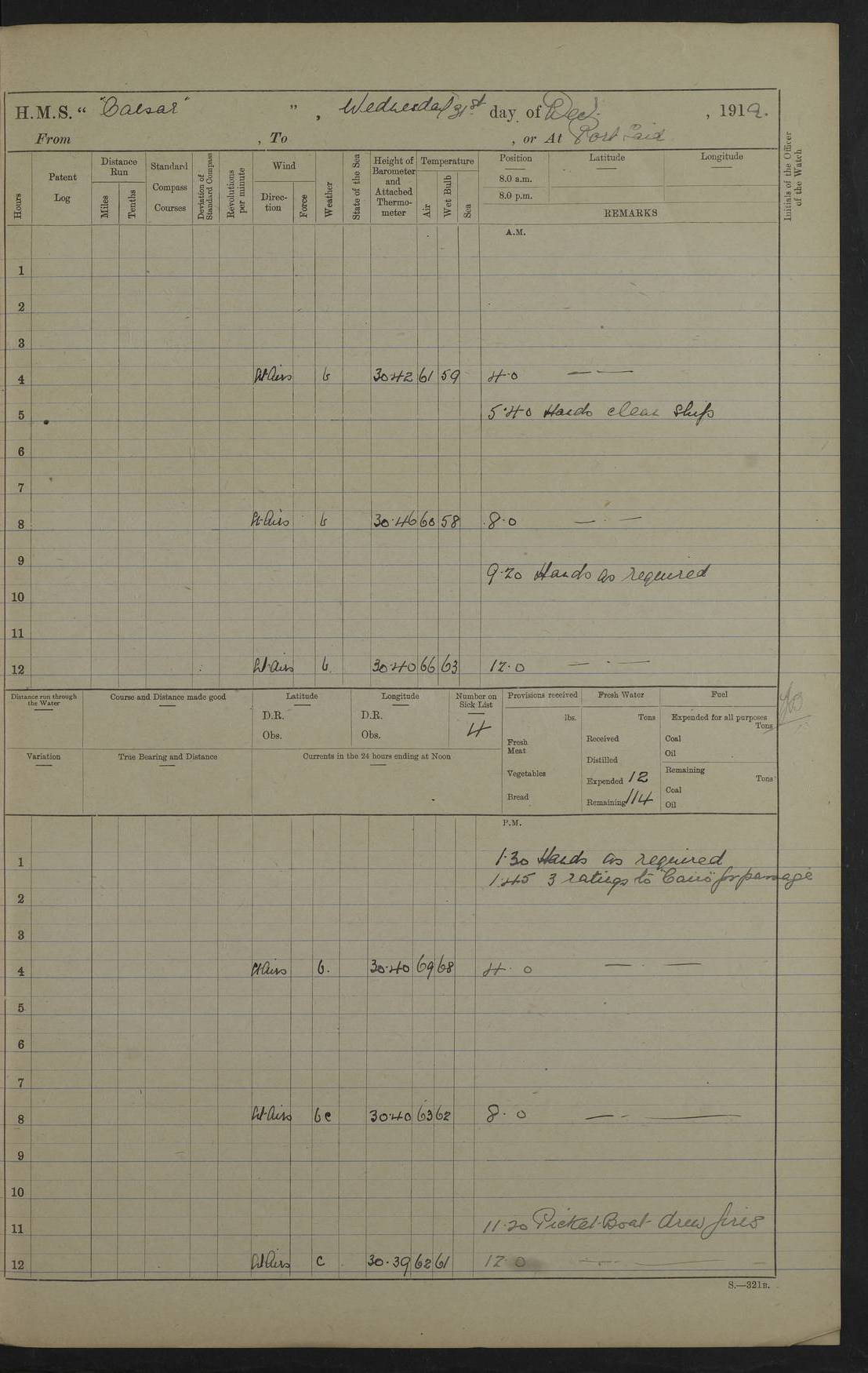 Notes: 1. Latitude/longitude, including for days in port, show representative decimal positions for each day, as calculated by the Old Weather project's analysis program. As such, they differ by varying amounts from the positions recorded, usually at noon, in the log pages. In addition, some latitudes/longitudes have been amended in edited logs for errors in the logs, for errors in identifying locations by the analysis program, or simply for greater accuracy. In all cases, refer to the log-page scans for the positions as originally recorded. Not all log pages contain this information and the ships' positions have therefore often been estimated. 2. Full account of any day is available by clicking on the link above that day. Groups of links refer to log book covers and introductory information; some may be blank. Editor’s notes: Positions (Latitude and Longitude) are given for noon each day, correcting or estimating the position when appropriate. These positions are shown to two decimal places, even when approximate, to indicate when Caesar has moved short distances, particularly when engaged in gunnery practice. If exact times are not indicated in the log they have, when appropriate, been estimated from the position of the entries (which show times on the left hand side of the log page). A note is made of numbers on the sick list where this is 5 or more. This and other information from the log is included in square brackets [not in italics] if it is not to be found under “Remarks” on the right hand side of the page. Additional information about geographical locations, terminology and about merchant and foreign naval ships encountered has been provided where identification is reasonably certain, by means of embedded links within the text. |
