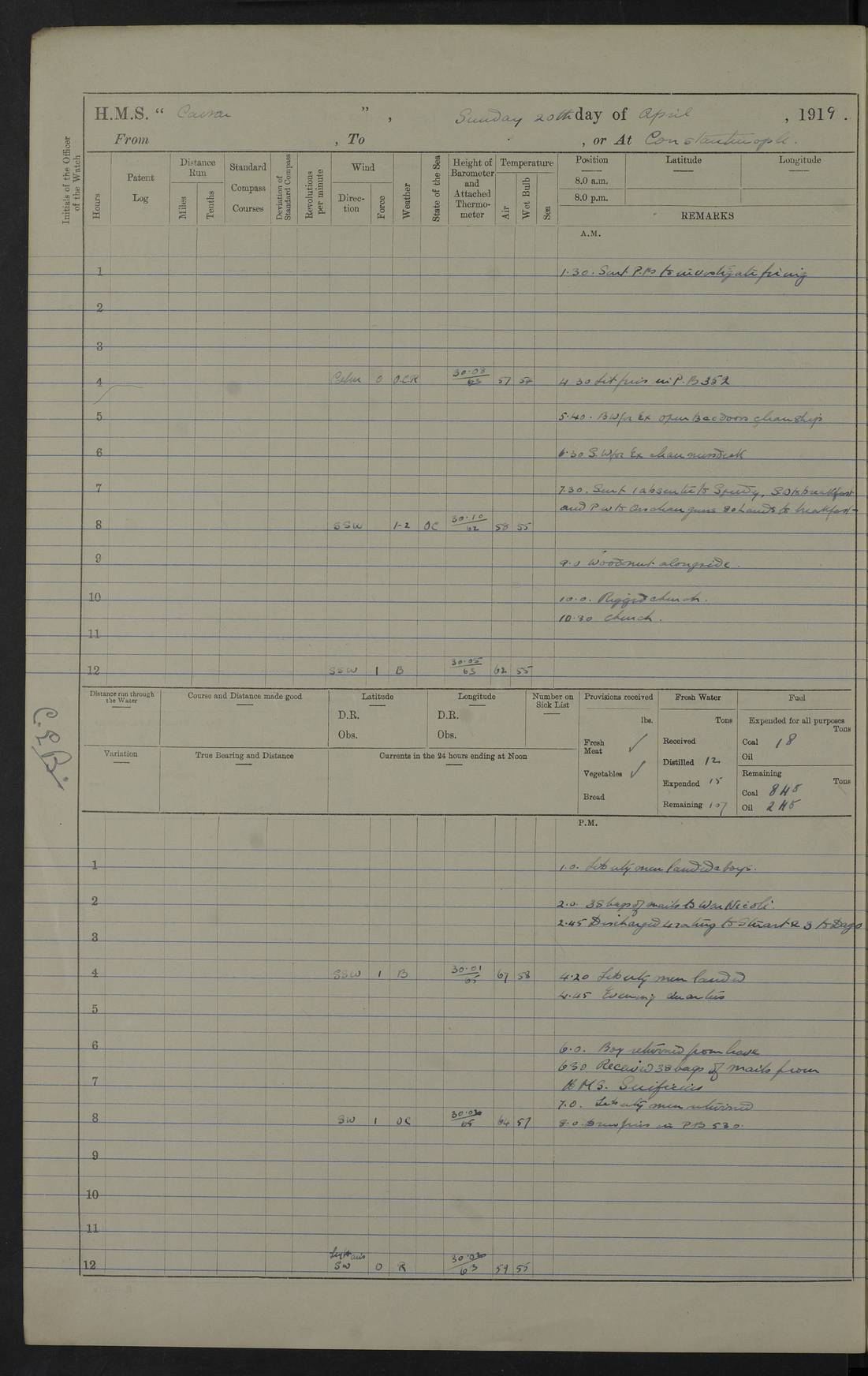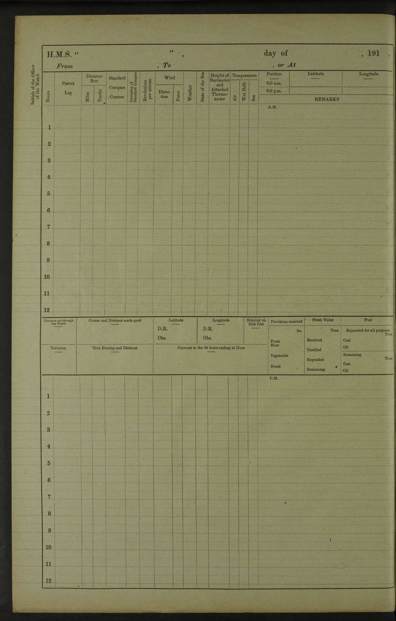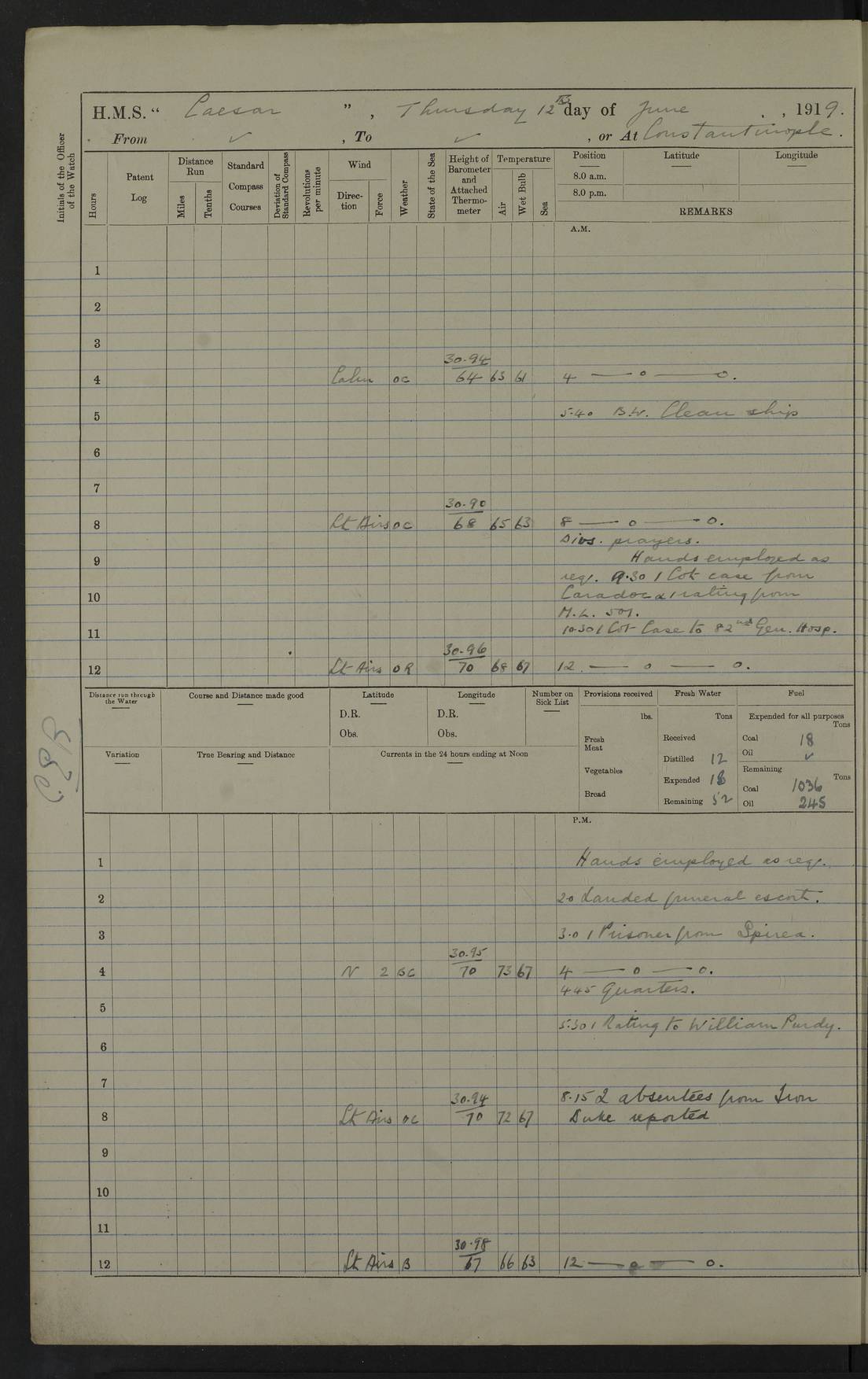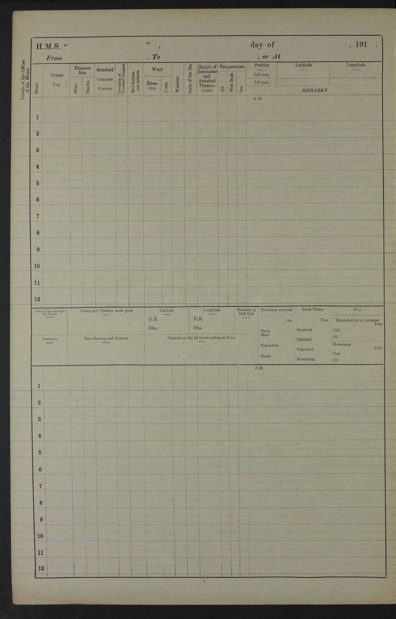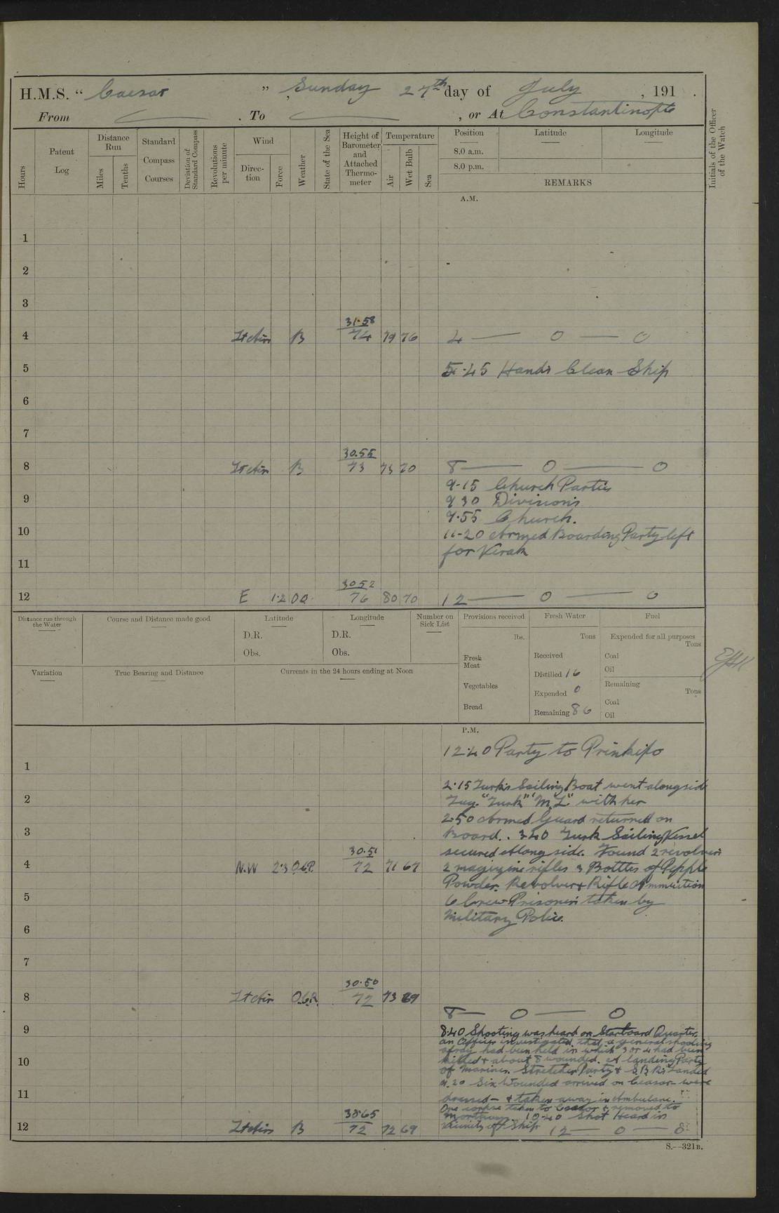Notes: 1. Latitude/longitude, including for days in port, show representative decimal positions for each day, as calculated by the Old Weather project's analysis program. As such, they differ by varying amounts from the positions recorded, usually at noon, in the log pages. In addition, some latitudes/longitudes have been amended in edited logs for errors in the logs, for errors in identifying locations by the analysis program, or simply for greater accuracy. In all cases, refer to the log-page scans for the positions as originally recorded. Not all log pages contain this information and the ships' positions have therefore often been estimated. 2. Full account of any day is available by clicking on the link above that day. Groups of links refer to log book covers and introductory information; some may be blank. Editor’s notes: Positions (Latitude and Longitude) are given for noon each day, correcting or estimating the position when appropriate. These positions are shown to two decimal places, even when approximate, to indicate when Caesar has moved short distances, particularly when engaged in gunnery practice. If exact times are not indicated in the log they have, when appropriate, been estimated from the position of the entries (which show times on the left hand side of the log page). A note is made of numbers on the sick list where this is 5 or more. This and other information from the log is included in square brackets [not in italics] if it is not to be found under “Remarks” on the right hand side of the page. Additional information about geographical locations, terminology and about merchant and foreign naval ships encountered has been provided where identification is reasonably certain, by means of embedded links within the text. |