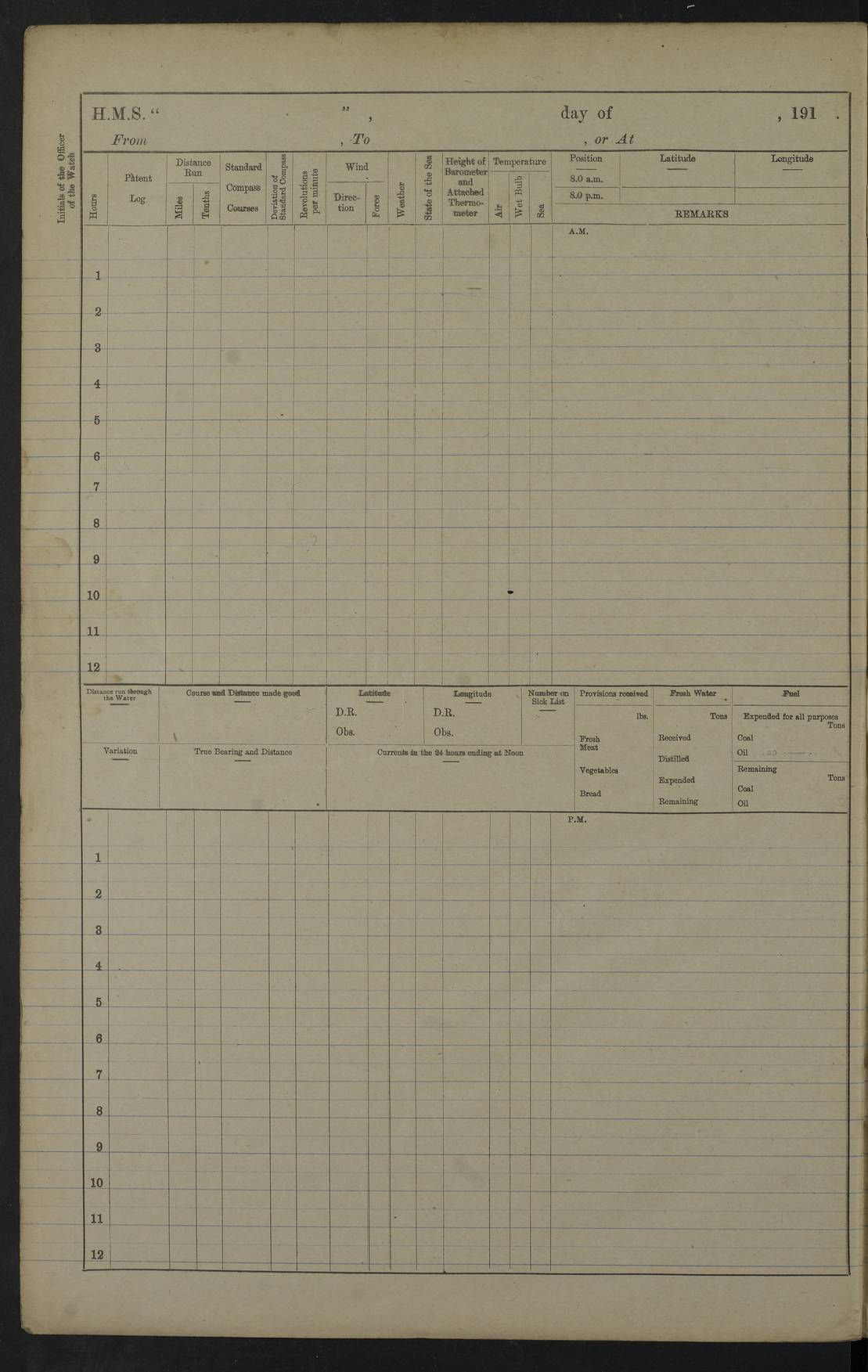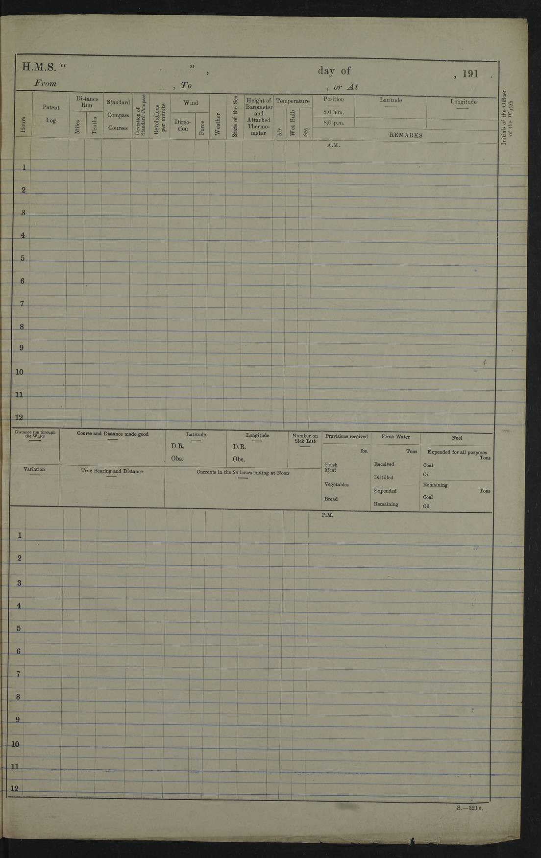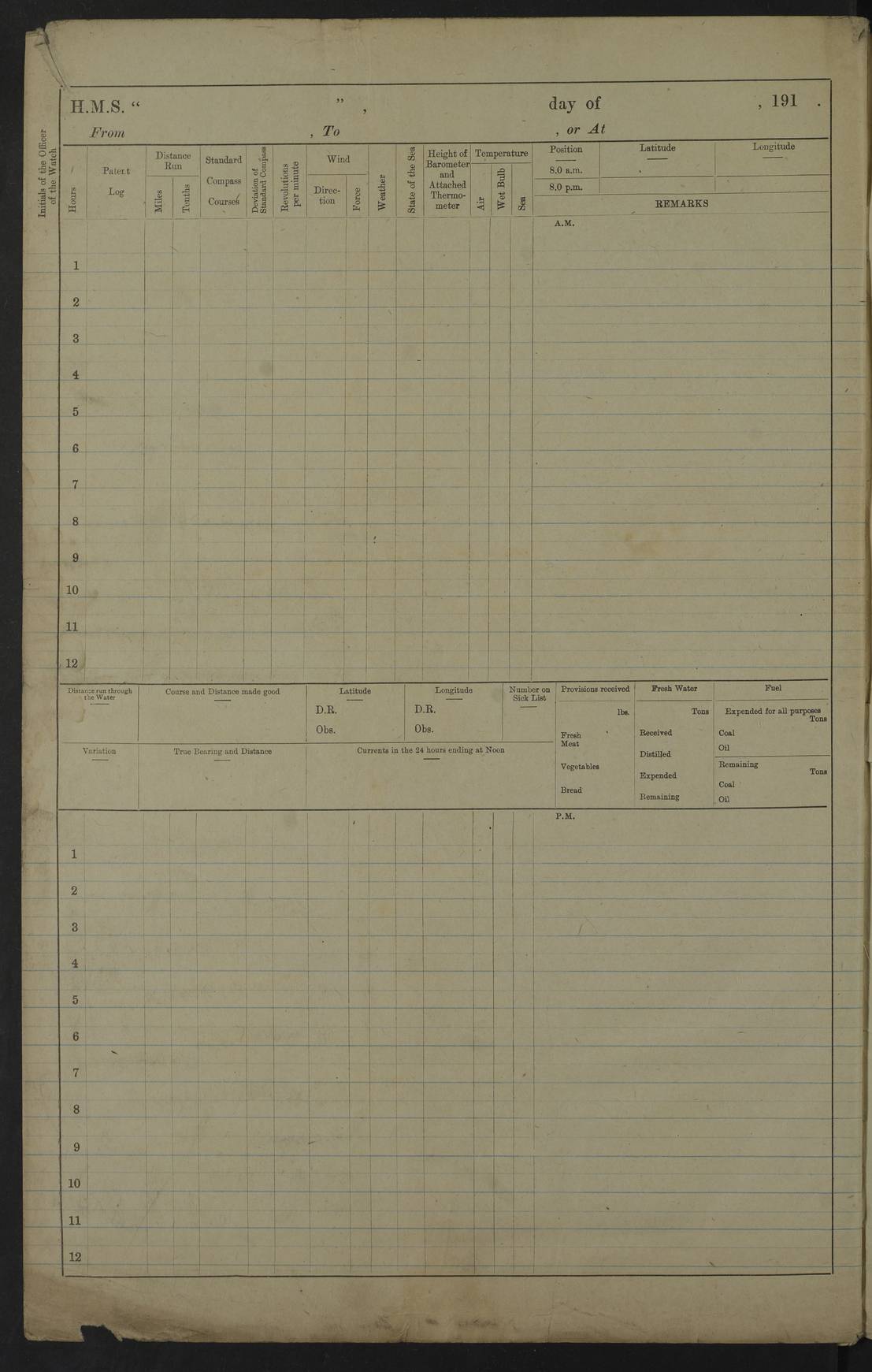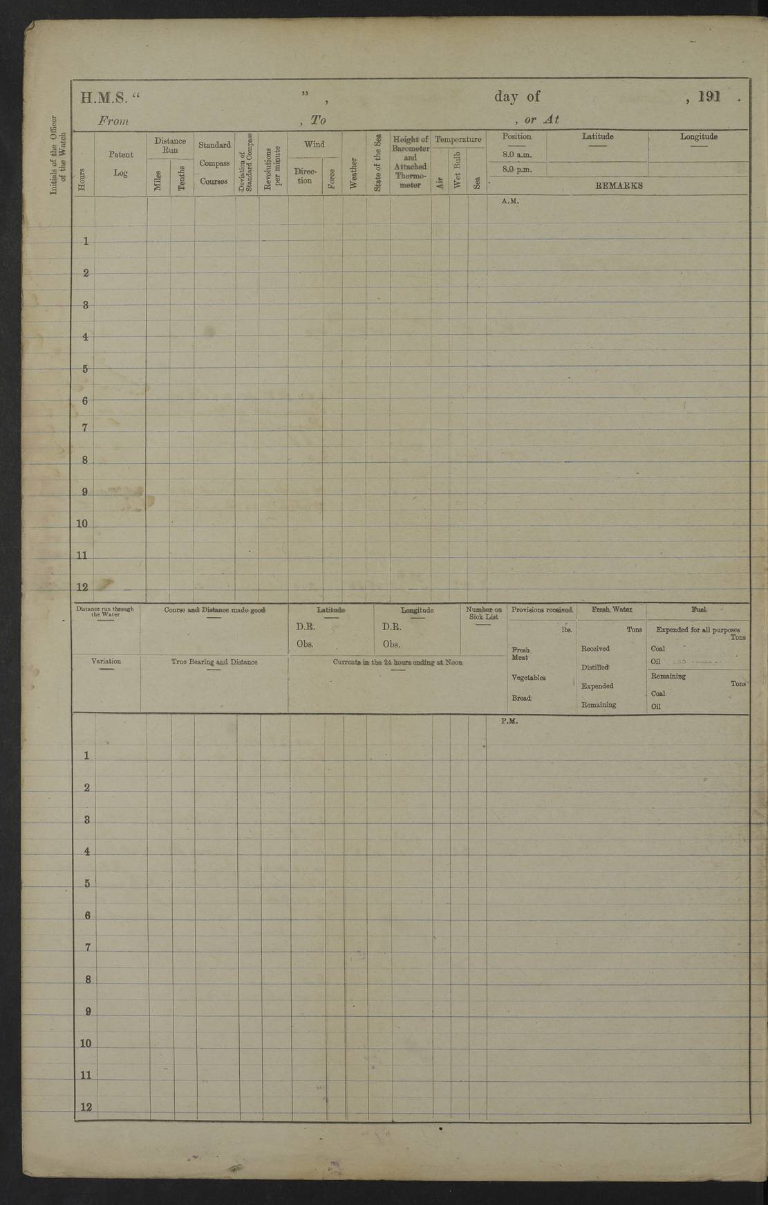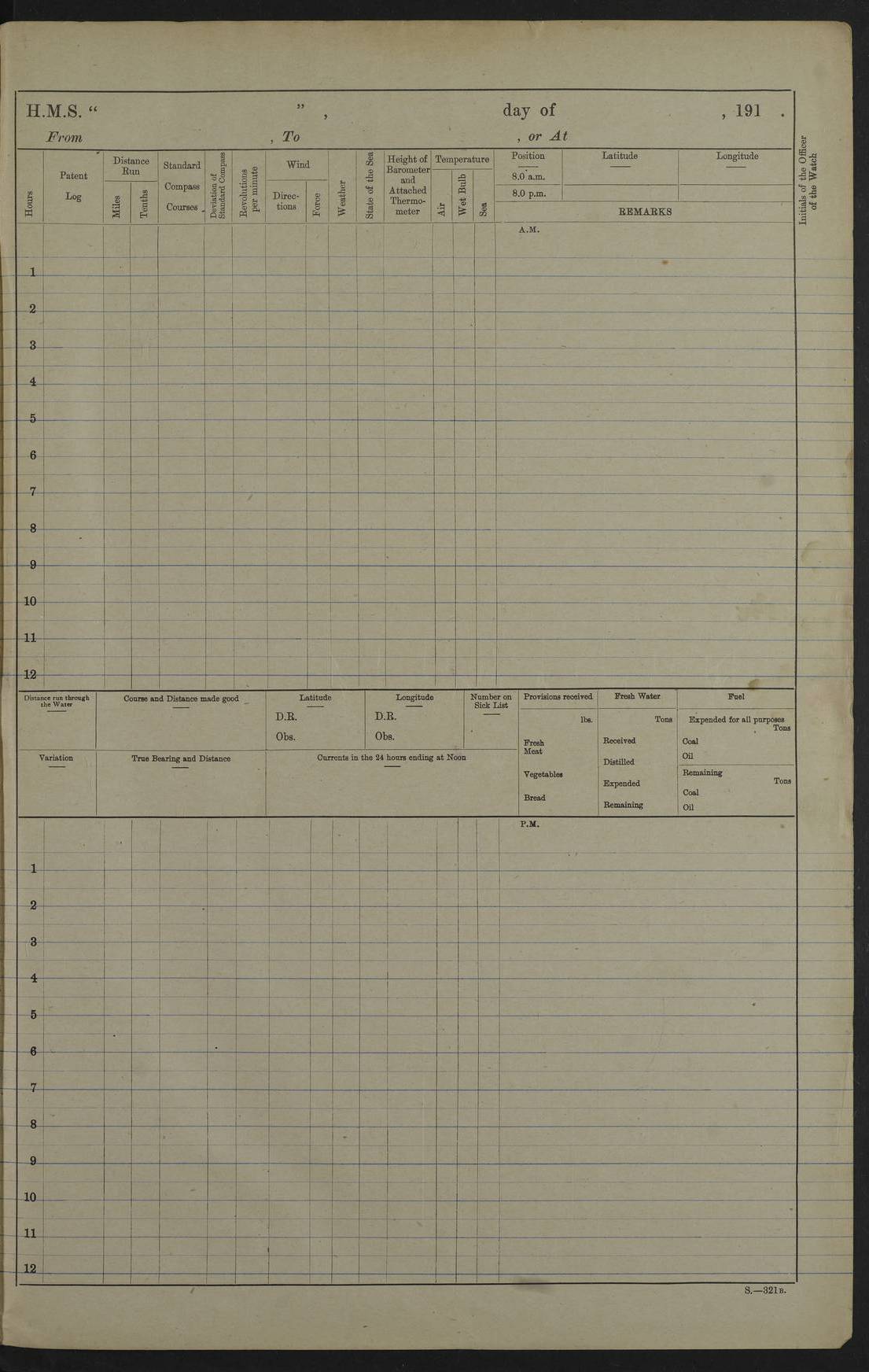 Notes: 1. Latitude/longitude, including for days in port, show representative decimal positions for each day, as calculated by the Old Weather project's analysis program. As such, they differ by varying amounts from the positions recorded, usually at noon, in the log pages. In addition, some latitudes/longitudes have been amended in edited logs for errors in the logs, for errors in identifying locations by the analysis program, or simply for greater accuracy. In all cases, refer to the log-page scans for the positions as originally recorded. Not all log pages contain this information and the ships' positions have therefore often been estimated. 2. Full account of any day is available by clicking on the link above that day. Groups of links refer to log book covers and introductory information; some may be blank. Editor’s notes: Positions (Latitude and Longitude) are given for noon each day, correcting or estimating the position when appropriate. These positions are shown to two decimal places, even when approximate, to indicate when Caesar has moved short distances, particularly when engaged in gunnery practice. If exact times are not indicated in the log they have, when appropriate, been estimated from the position of the entries (which show times on the left hand side of the log page). A note is made of numbers on the sick list where this is 5 or more. This and other information from the log is included in square brackets [not in italics] if it is not to be found under “Remarks” on the right hand side of the page. Additional information about geographical locations, terminology and about merchant and foreign naval ships encountered has been provided where identification is reasonably certain, by means of embedded links within the text. |