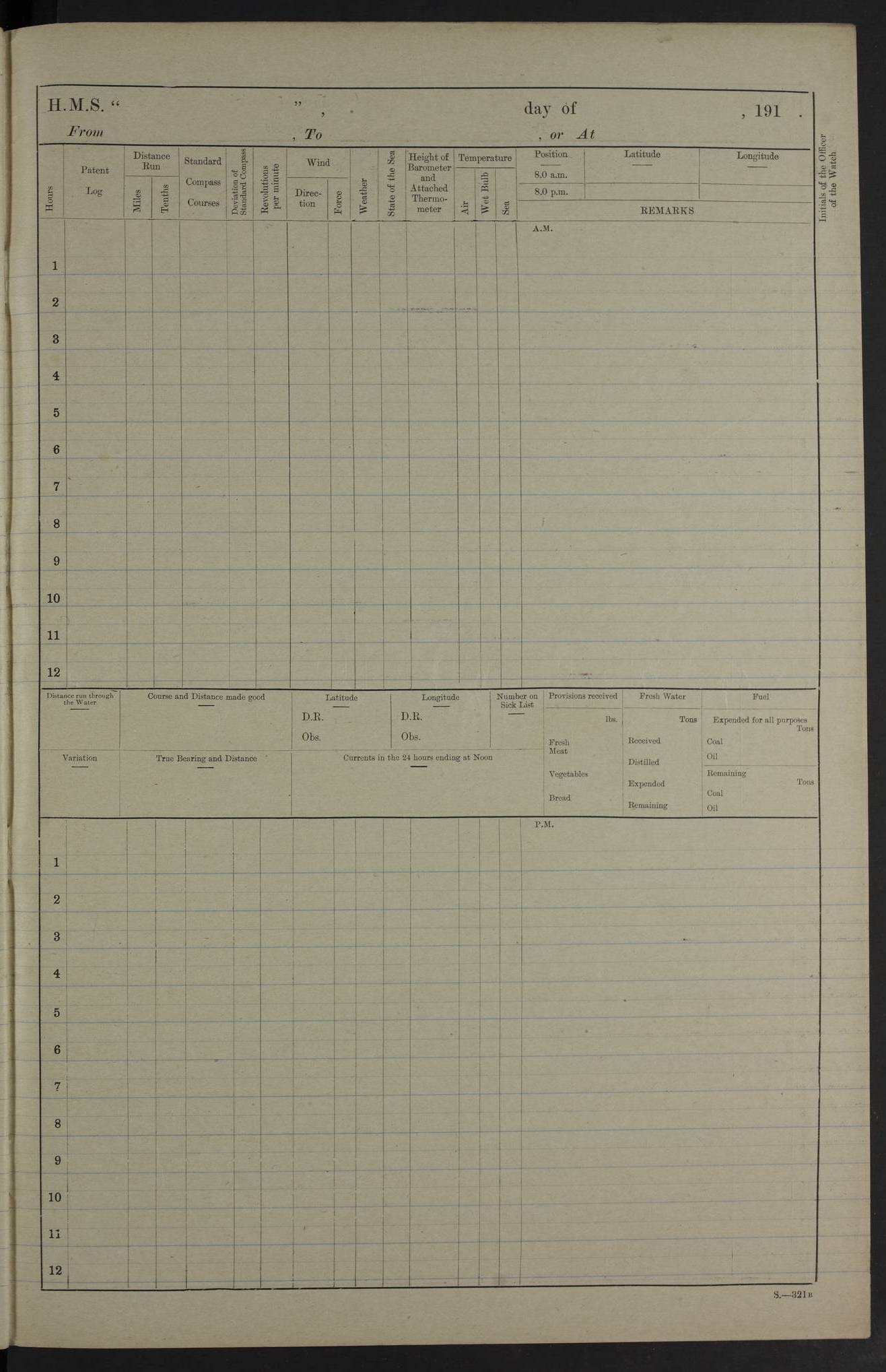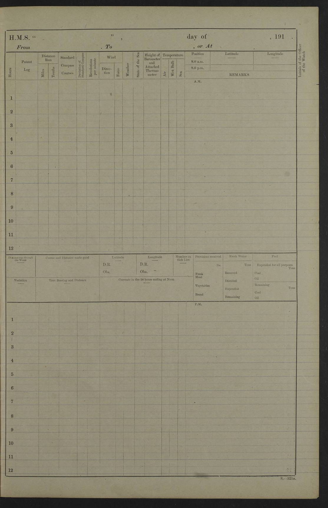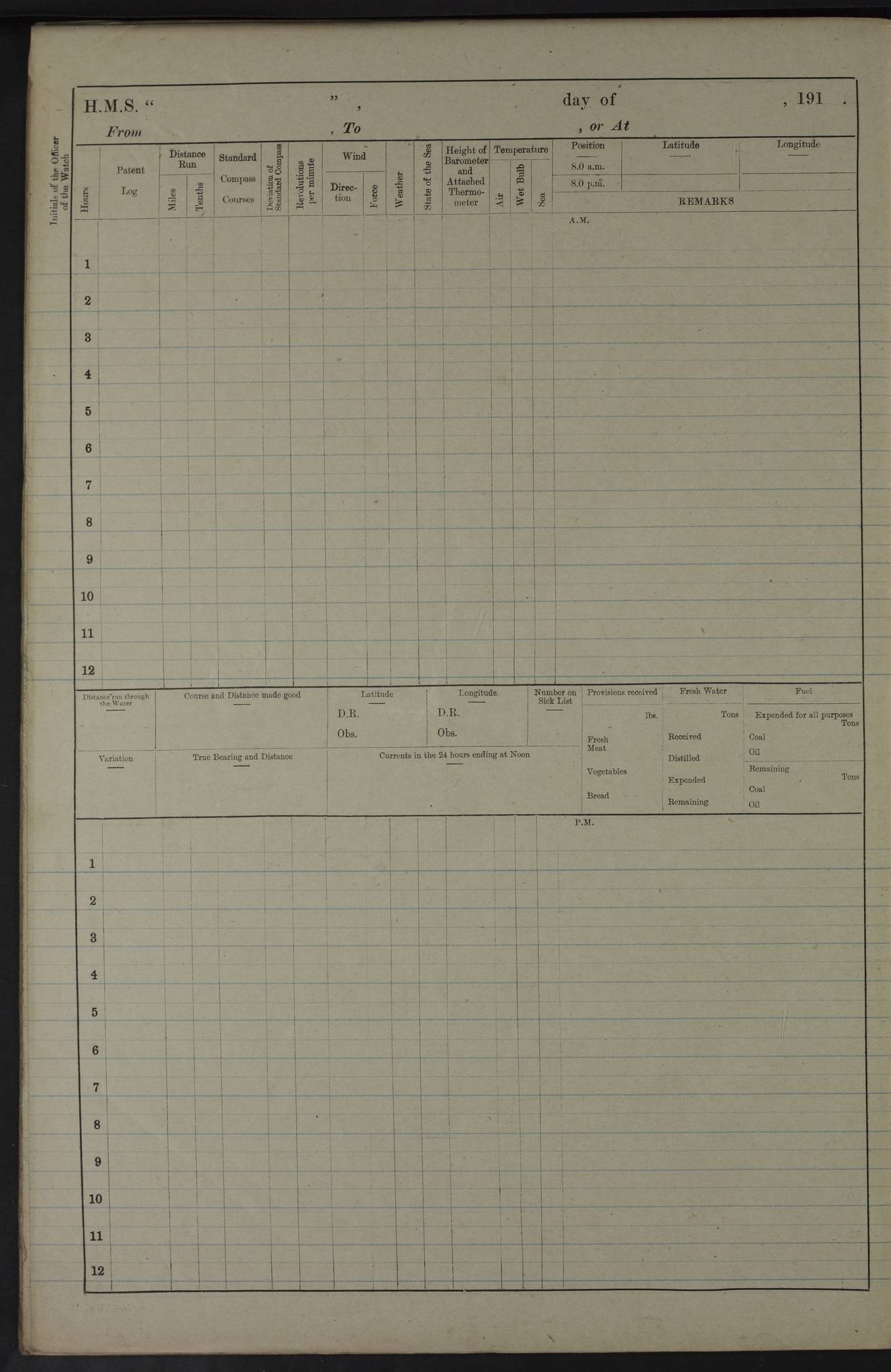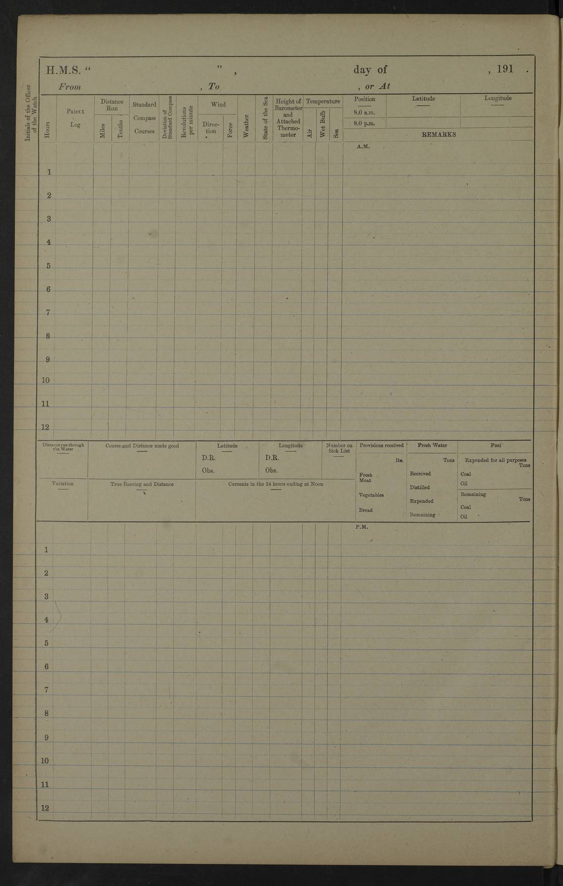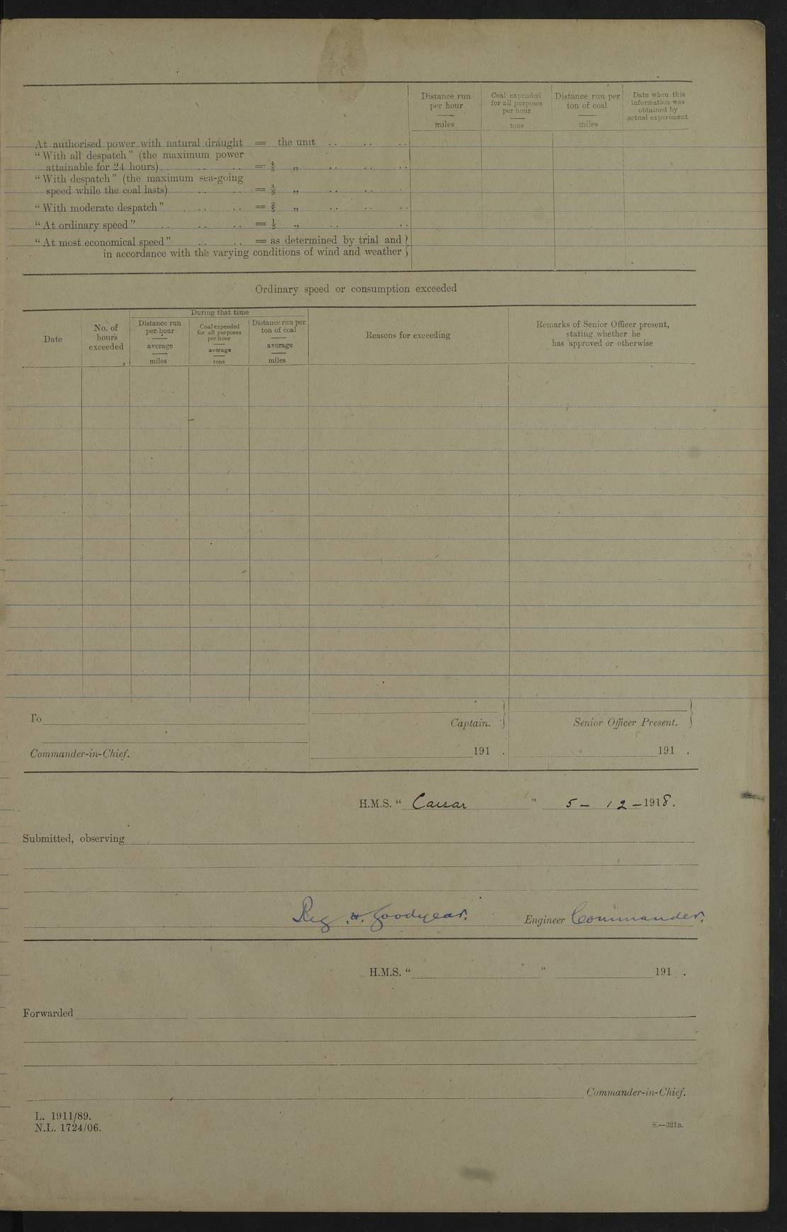 Notes: 1. Latitude/longitude, including for days in port, show representative decimal positions for each day, as calculated by the Old Weather project's analysis program. As such, they differ by varying amounts from the positions recorded, usually at noon, in the log pages. In addition, some latitudes/longitudes have been amended in edited logs for errors in the logs, for errors in identifying locations by the analysis program, or simply for greater accuracy. In all cases, refer to the log-page scans for the positions as originally recorded. Not all log pages contain this information and the ships' positions have therefore often been estimated. 2. Full account of any day is available by clicking on the link above that day. Groups of links refer to log book covers and introductory information; some may be blank. Editor’s notes: Positions (Latitude and Longitude) are given for noon each day, correcting or estimating the position when appropriate. These positions are shown to two decimal places, even when approximate, to indicate when Caesar has moved short distances, particularly when engaged in gunnery practice. If exact times are not indicated in the log they have, when appropriate, been estimated from the position of the entries (which show times on the left hand side of the log page). A note is made of numbers on the sick list where this is 5 or more. This and other information from the log is included in square brackets [not in italics] if it is not to be found under “Remarks” on the right hand side of the page. Additional information about geographical locations, terminology and about merchant and foreign naval ships encountered has been provided where identification is reasonably certain, by means of embedded links within the text. |