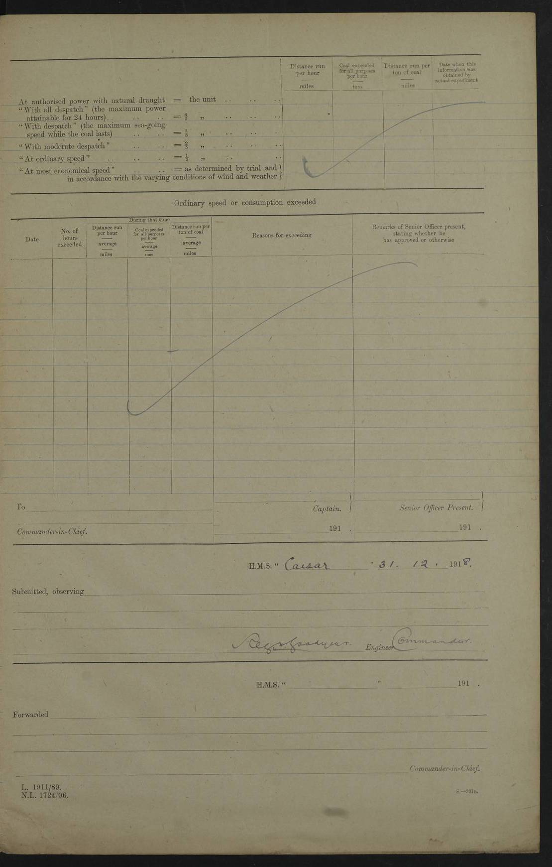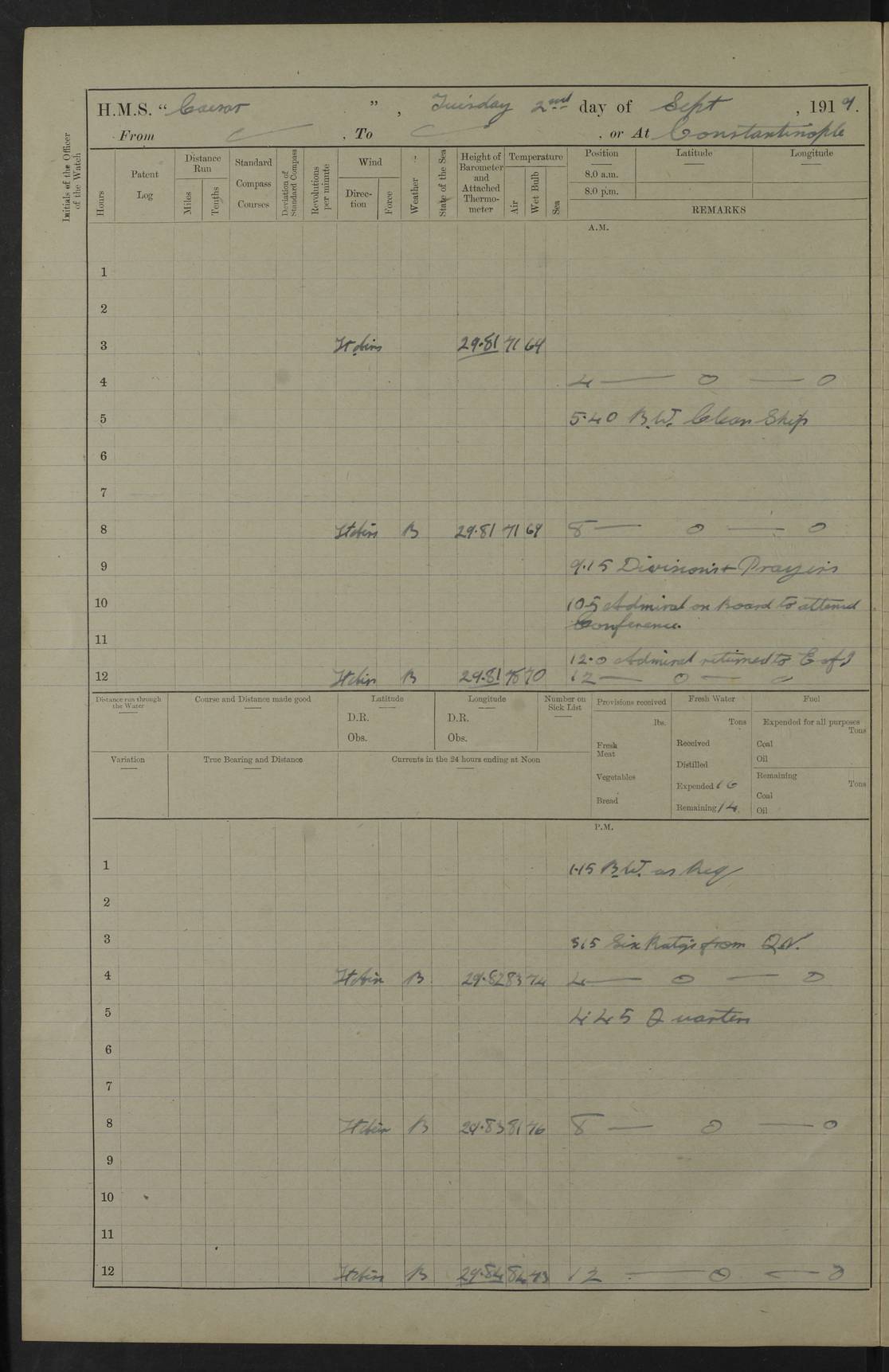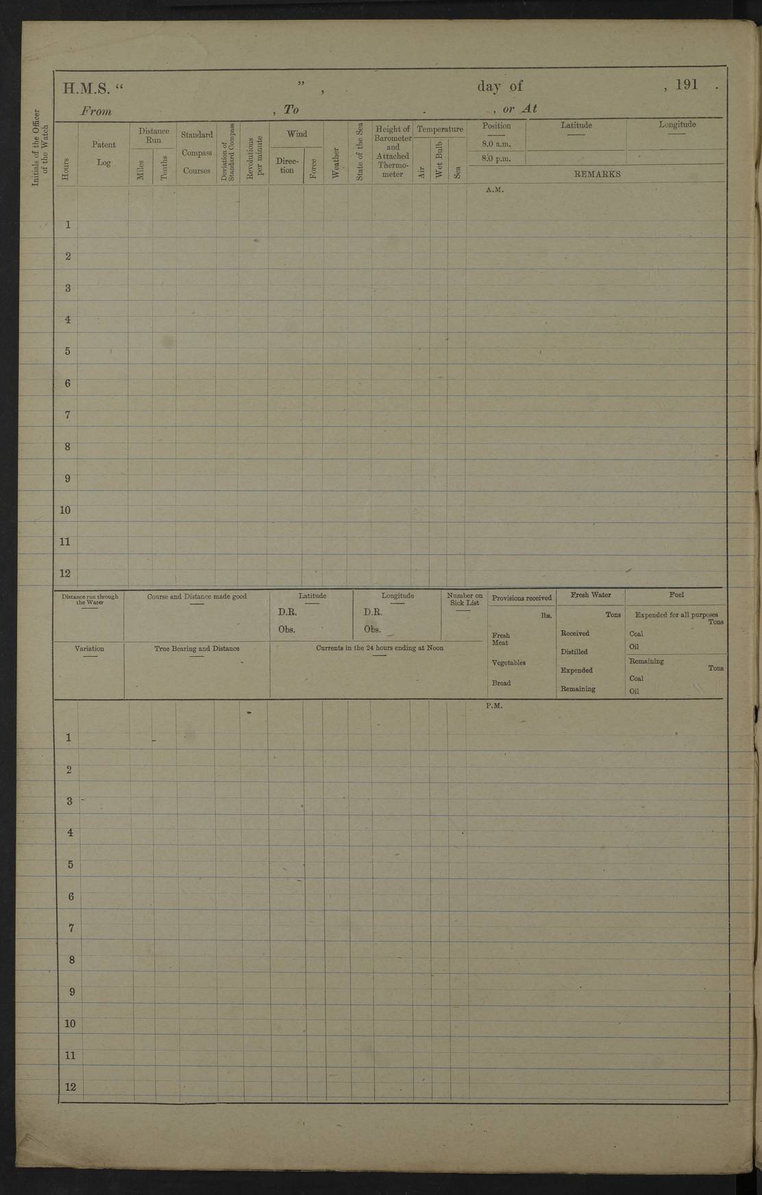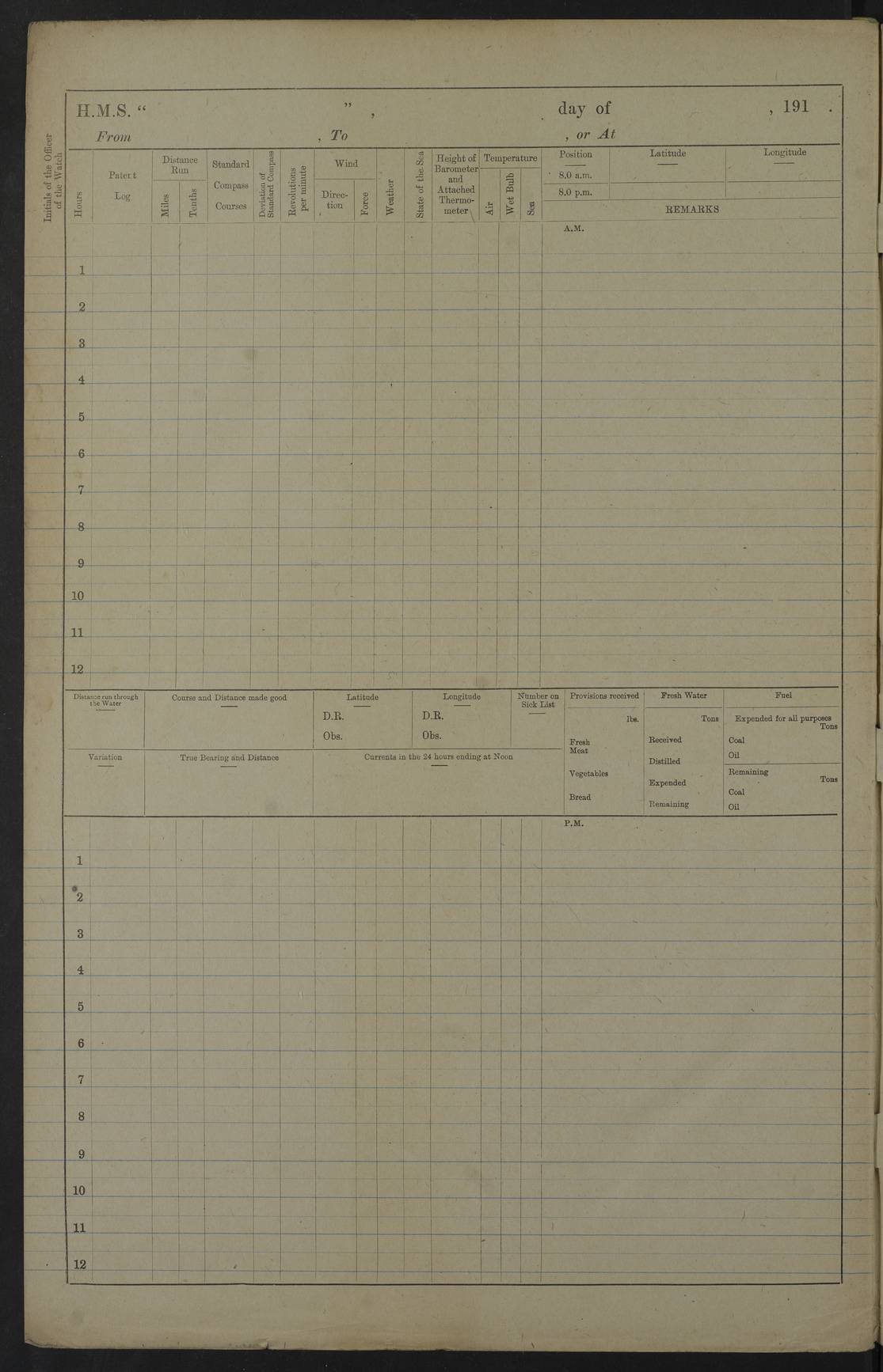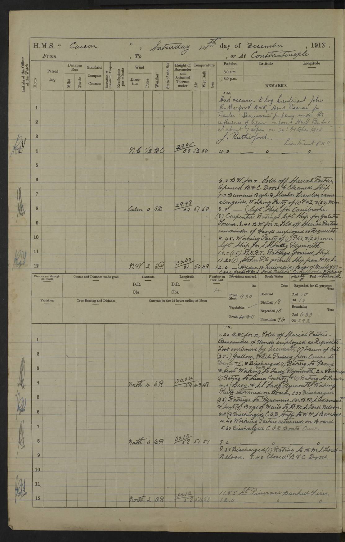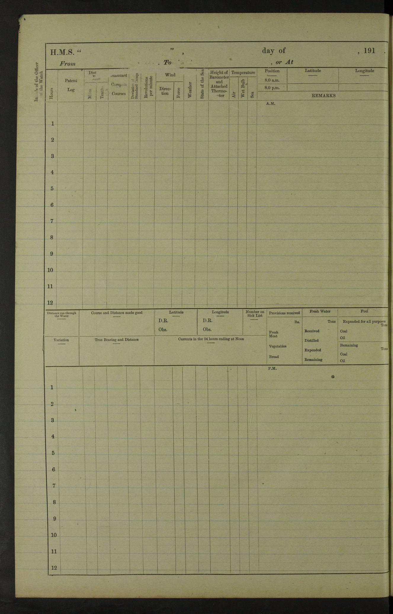 Notes: 1. Latitude/longitude, including for days in port, show representative decimal positions for each day, as calculated by the Old Weather project's analysis program. As such, they differ by varying amounts from the positions recorded, usually at noon, in the log pages. In addition, some latitudes/longitudes have been amended in edited logs for errors in the logs, for errors in identifying locations by the analysis program, or simply for greater accuracy. In all cases, refer to the log-page scans for the positions as originally recorded. Not all log pages contain this information and the ships' positions have therefore often been estimated. 2. Full account of any day is available by clicking on the link above that day. Groups of links refer to log book covers and introductory information; some may be blank. Editor’s notes: Positions (Latitude and Longitude) are given for noon each day, correcting or estimating the position when appropriate. These positions are shown to two decimal places, even when approximate, to indicate when Caesar has moved short distances, particularly when engaged in gunnery practice. If exact times are not indicated in the log they have, when appropriate, been estimated from the position of the entries (which show times on the left hand side of the log page). A note is made of numbers on the sick list where this is 5 or more. This and other information from the log is included in square brackets [not in italics] if it is not to be found under “Remarks” on the right hand side of the page. Additional information about geographical locations, terminology and about merchant and foreign naval ships encountered has been provided where identification is reasonably certain, by means of embedded links within the text. |