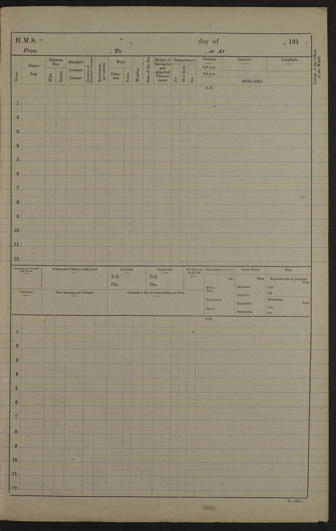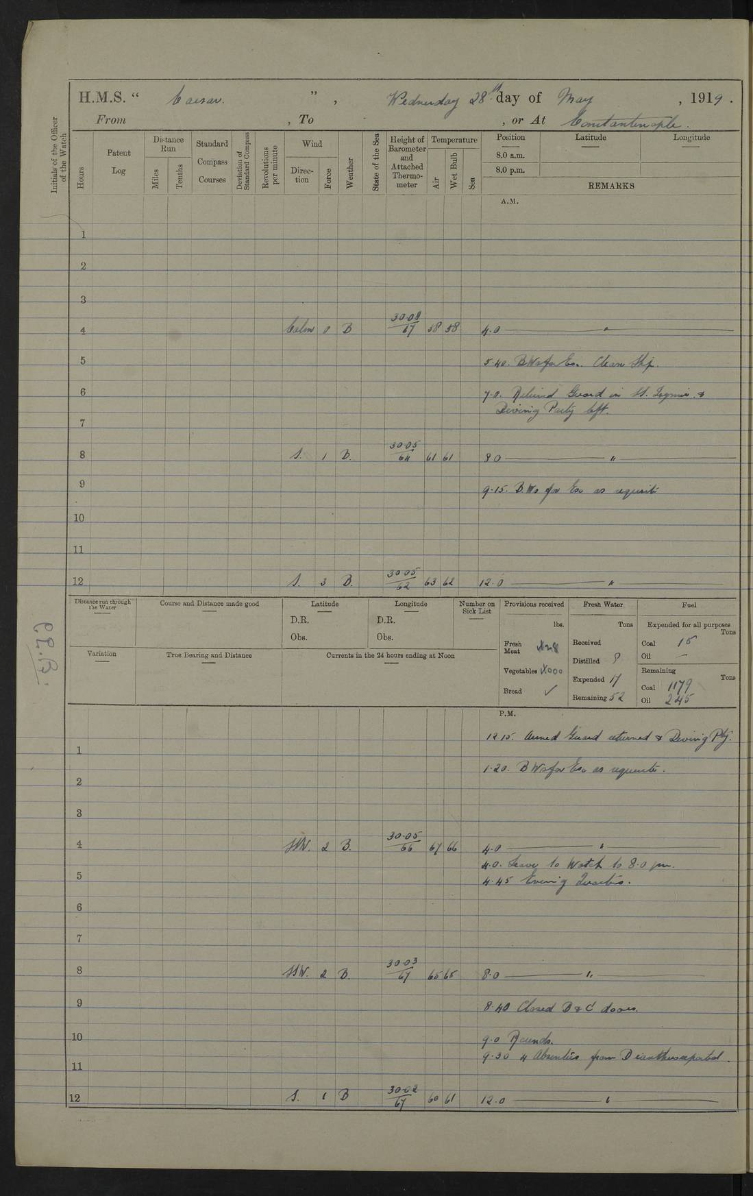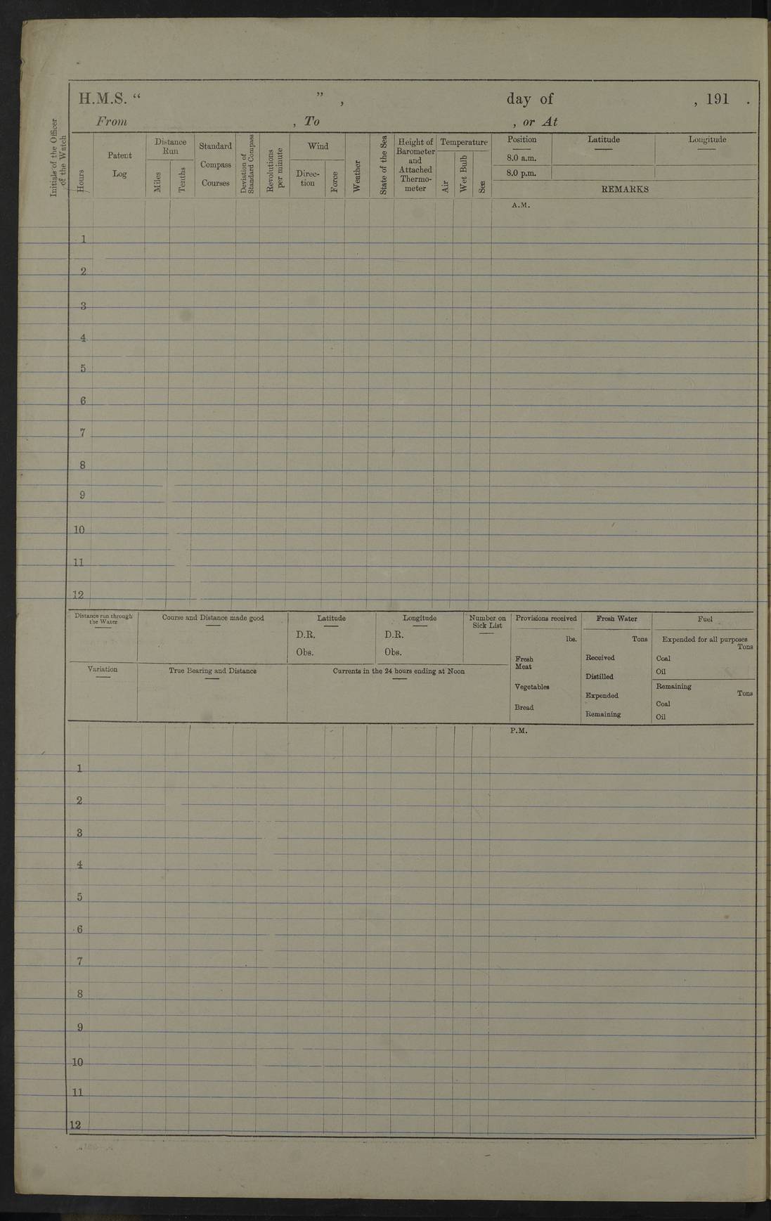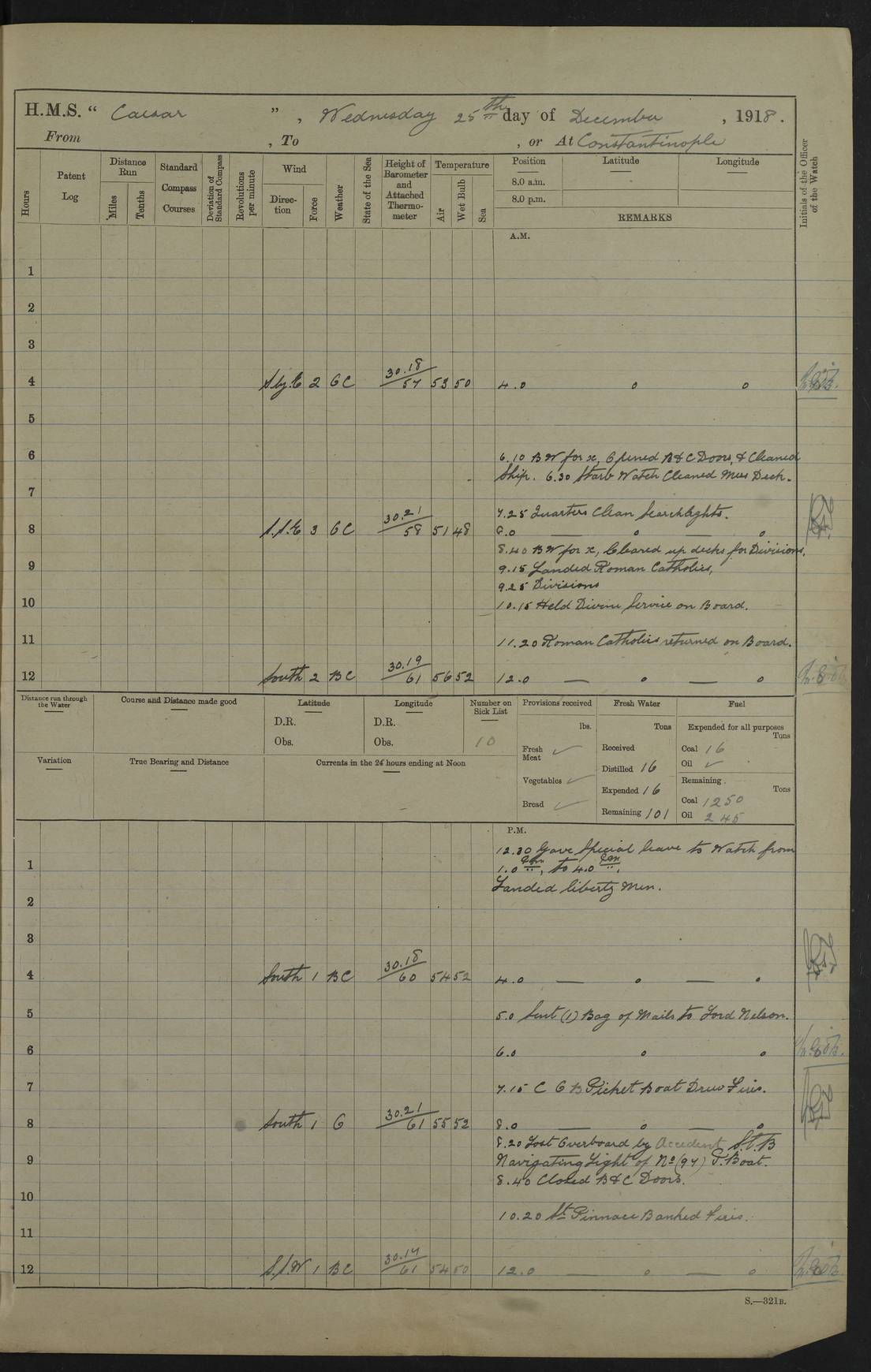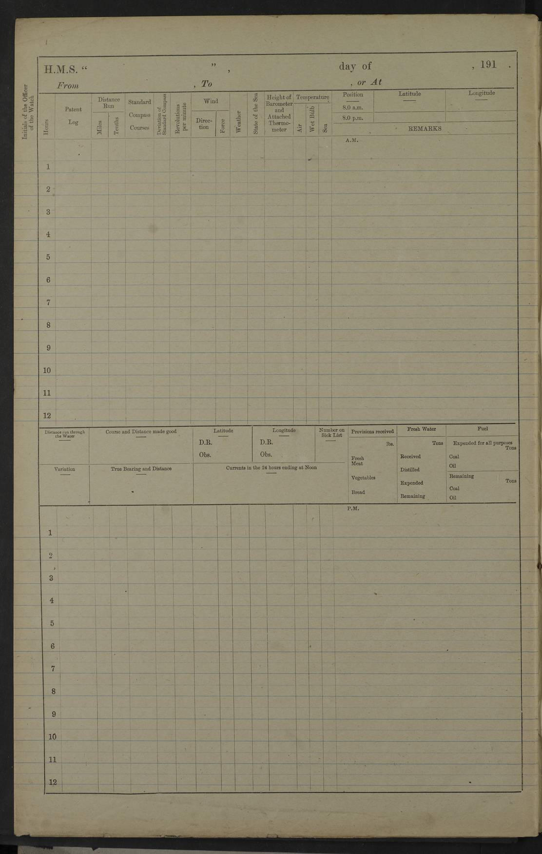 Notes: 1. Latitude/longitude, including for days in port, show representative decimal positions for each day, as calculated by the Old Weather project's analysis program. As such, they differ by varying amounts from the positions recorded, usually at noon, in the log pages. In addition, some latitudes/longitudes have been amended in edited logs for errors in the logs, for errors in identifying locations by the analysis program, or simply for greater accuracy. In all cases, refer to the log-page scans for the positions as originally recorded. Not all log pages contain this information and the ships' positions have therefore often been estimated. 2. Full account of any day is available by clicking on the link above that day. Groups of links refer to log book covers and introductory information; some may be blank. Editor’s notes: Positions (Latitude and Longitude) are given for noon each day, correcting or estimating the position when appropriate. These positions are shown to two decimal places, even when approximate, to indicate when Caesar has moved short distances, particularly when engaged in gunnery practice. If exact times are not indicated in the log they have, when appropriate, been estimated from the position of the entries (which show times on the left hand side of the log page). A note is made of numbers on the sick list where this is 5 or more. This and other information from the log is included in square brackets [not in italics] if it is not to be found under “Remarks” on the right hand side of the page. Additional information about geographical locations, terminology and about merchant and foreign naval ships encountered has been provided where identification is reasonably certain, by means of embedded links within the text. |