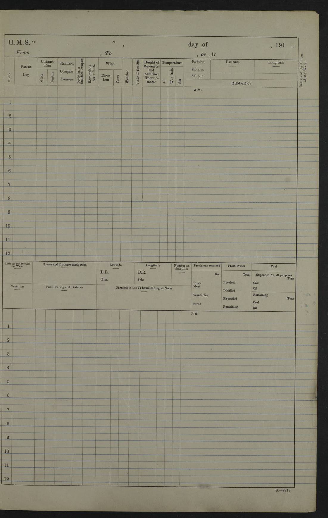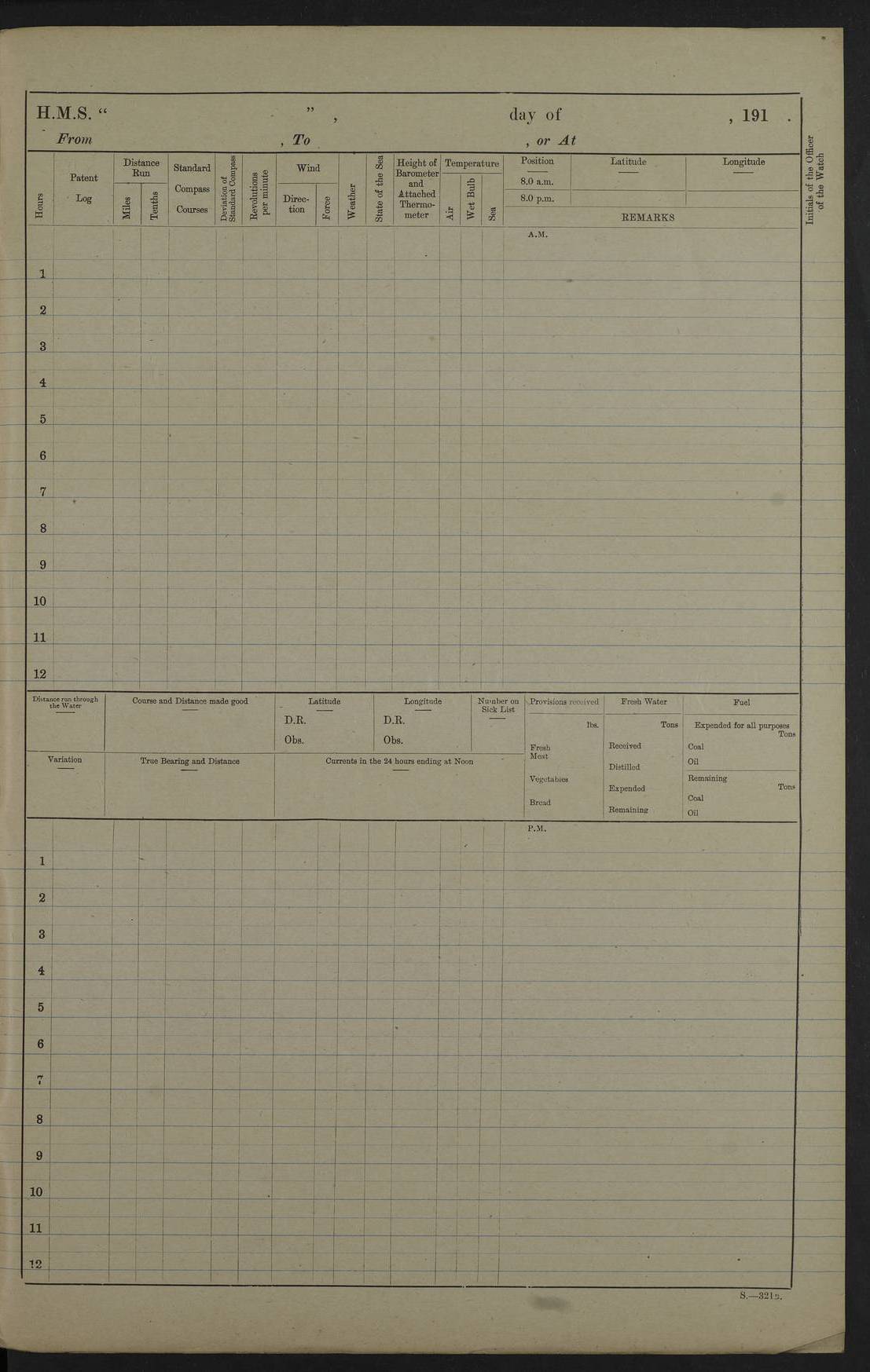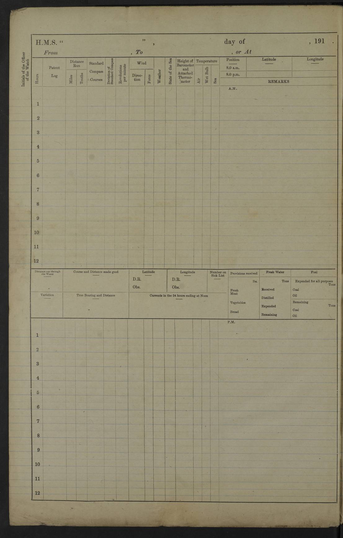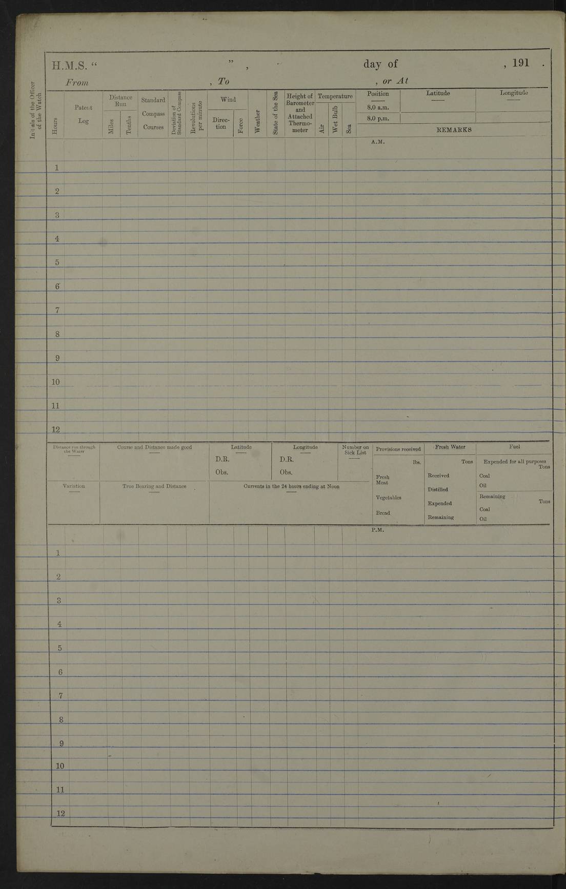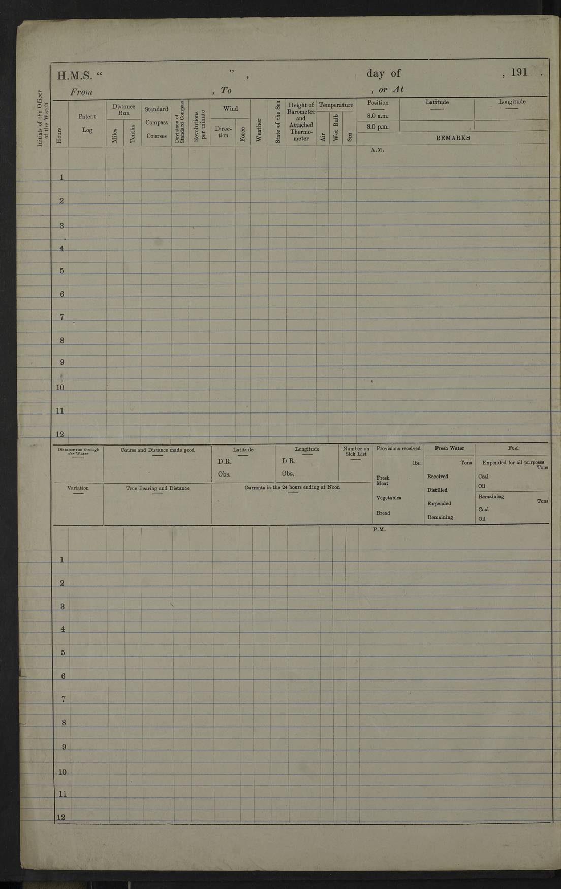 Notes: 1. Latitude/longitude, including for days in port, show representative decimal positions for each day, as calculated by the Old Weather project's analysis program. As such, they differ by varying amounts from the positions recorded, usually at noon, in the log pages. In addition, some latitudes/longitudes have been amended in edited logs for errors in the logs, for errors in identifying locations by the analysis program, or simply for greater accuracy. In all cases, refer to the log-page scans for the positions as originally recorded. Not all log pages contain this information and the ships' positions have therefore often been estimated. 2. Full account of any day is available by clicking on the link above that day. Groups of links refer to log book covers and introductory information; some may be blank. Editor’s notes: Positions (Latitude and Longitude) are given for noon each day, correcting or estimating the position when appropriate. These positions are shown to two decimal places, even when approximate, to indicate when Caesar has moved short distances, particularly when engaged in gunnery practice. If exact times are not indicated in the log they have, when appropriate, been estimated from the position of the entries (which show times on the left hand side of the log page). A note is made of numbers on the sick list where this is 5 or more. This and other information from the log is included in square brackets [not in italics] if it is not to be found under “Remarks” on the right hand side of the page. Additional information about geographical locations, terminology and about merchant and foreign naval ships encountered has been provided where identification is reasonably certain, by means of embedded links within the text. |