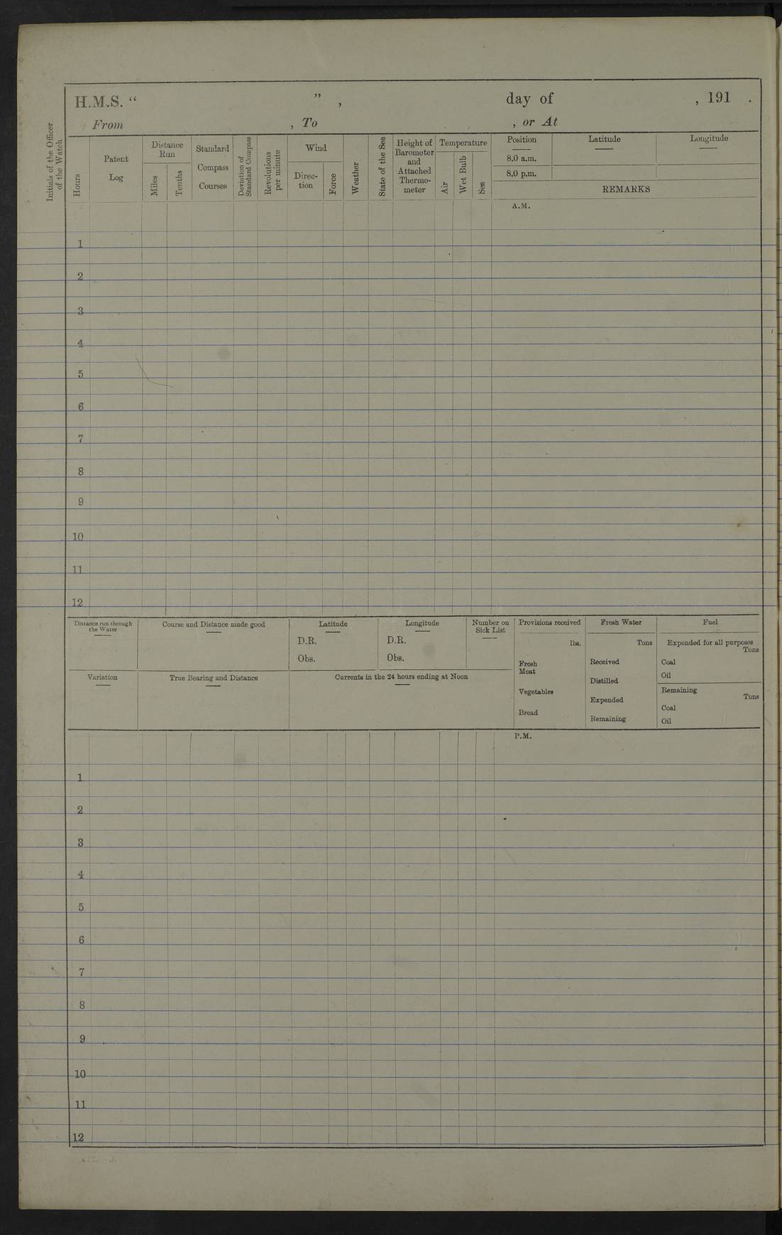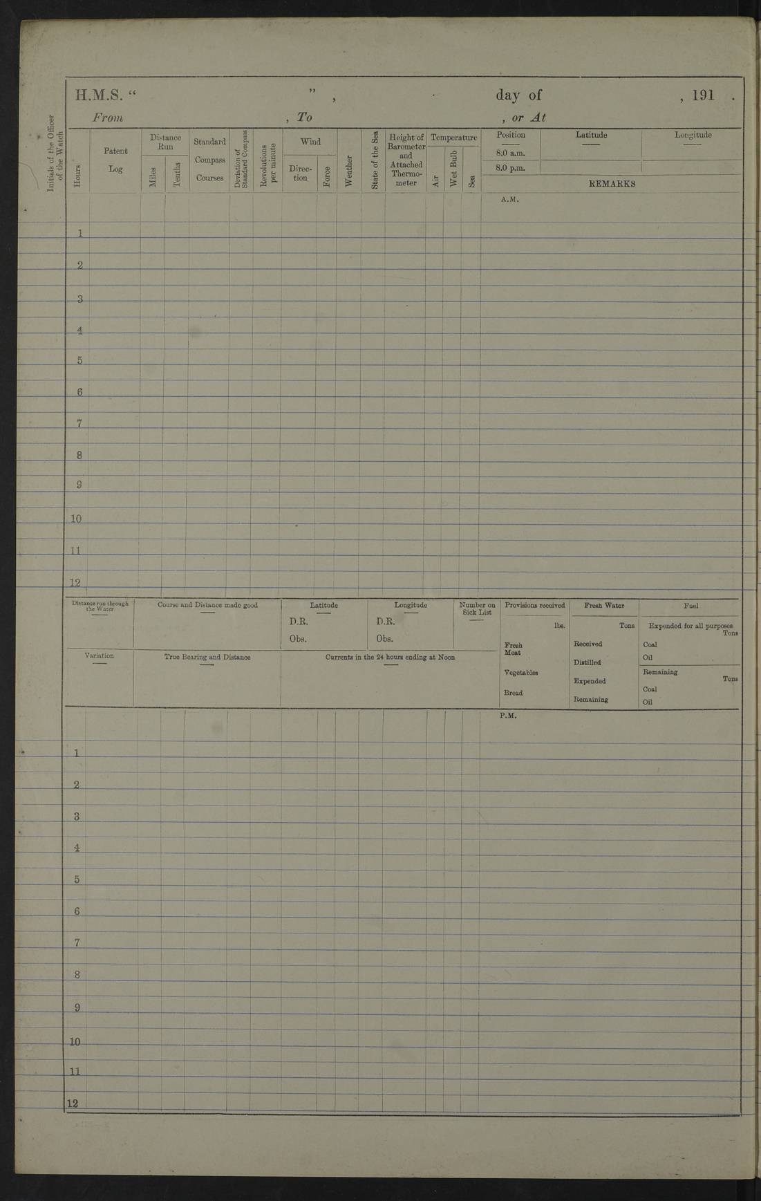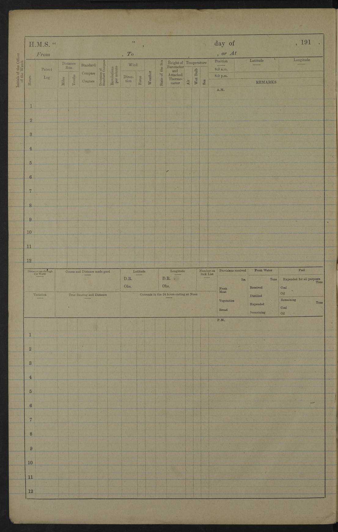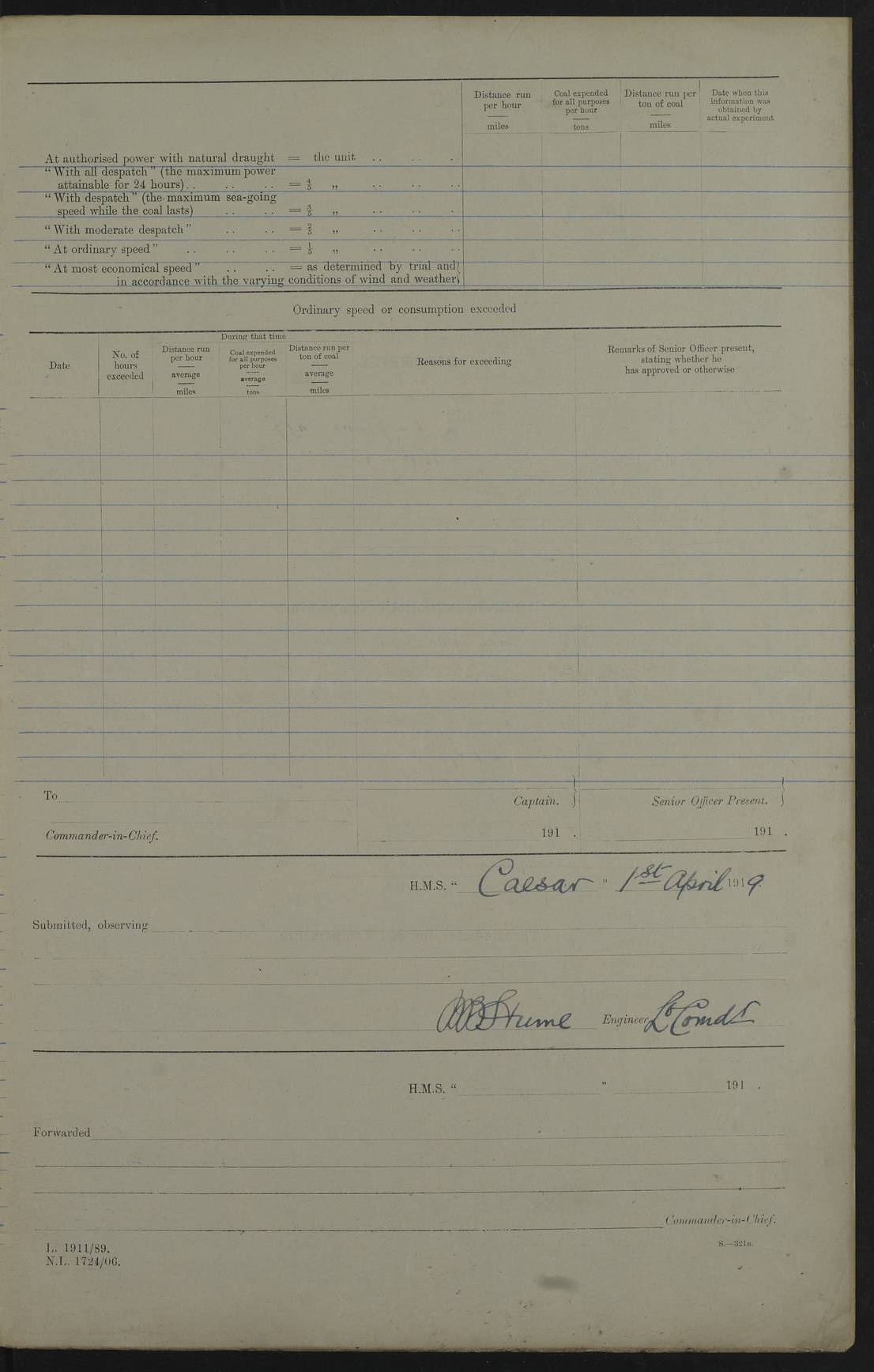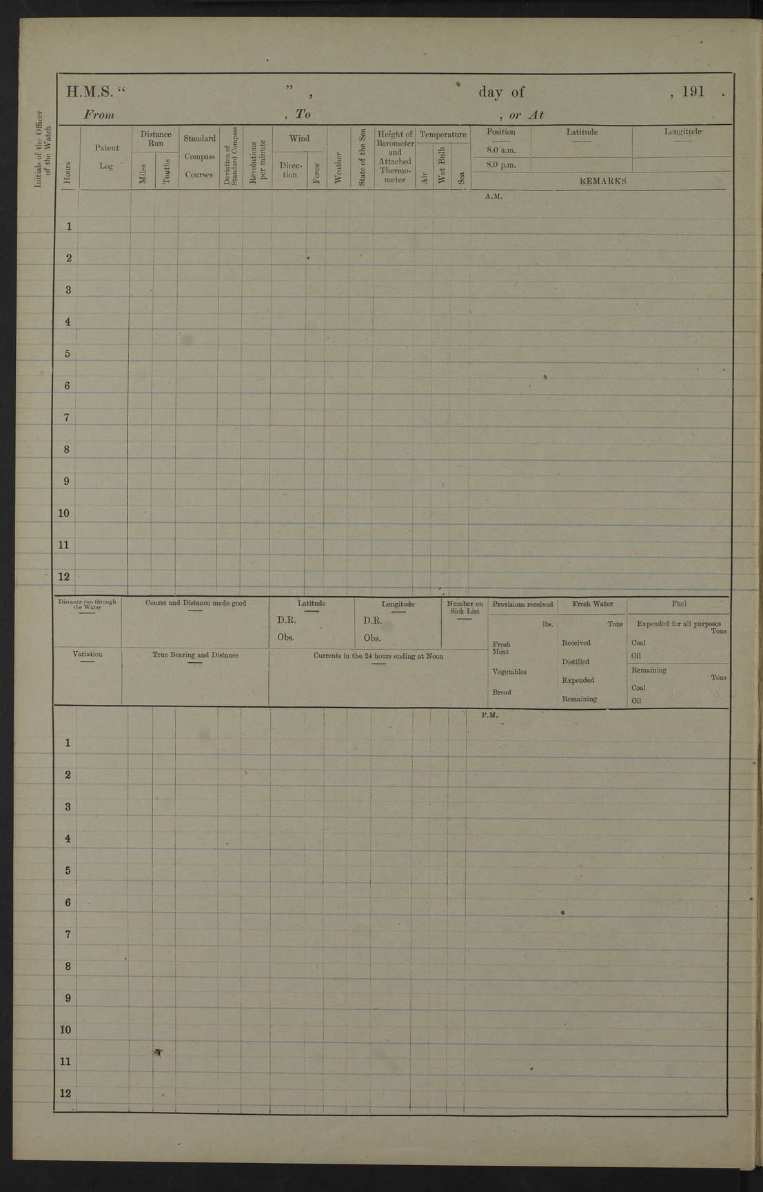 Notes: 1. Latitude/longitude, including for days in port, show representative decimal positions for each day, as calculated by the Old Weather project's analysis program. As such, they differ by varying amounts from the positions recorded, usually at noon, in the log pages. In addition, some latitudes/longitudes have been amended in edited logs for errors in the logs, for errors in identifying locations by the analysis program, or simply for greater accuracy. In all cases, refer to the log-page scans for the positions as originally recorded. Not all log pages contain this information and the ships' positions have therefore often been estimated. 2. Full account of any day is available by clicking on the link above that day. Groups of links refer to log book covers and introductory information; some may be blank. Editor’s notes: Positions (Latitude and Longitude) are given for noon each day, correcting or estimating the position when appropriate. These positions are shown to two decimal places, even when approximate, to indicate when Caesar has moved short distances, particularly when engaged in gunnery practice. If exact times are not indicated in the log they have, when appropriate, been estimated from the position of the entries (which show times on the left hand side of the log page). A note is made of numbers on the sick list where this is 5 or more. This and other information from the log is included in square brackets [not in italics] if it is not to be found under “Remarks” on the right hand side of the page. Additional information about geographical locations, terminology and about merchant and foreign naval ships encountered has been provided where identification is reasonably certain, by means of embedded links within the text. |