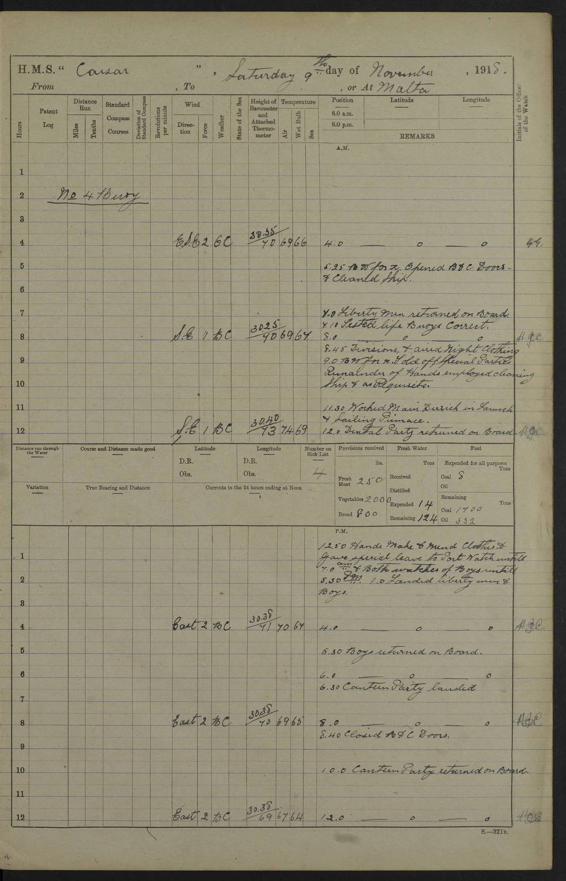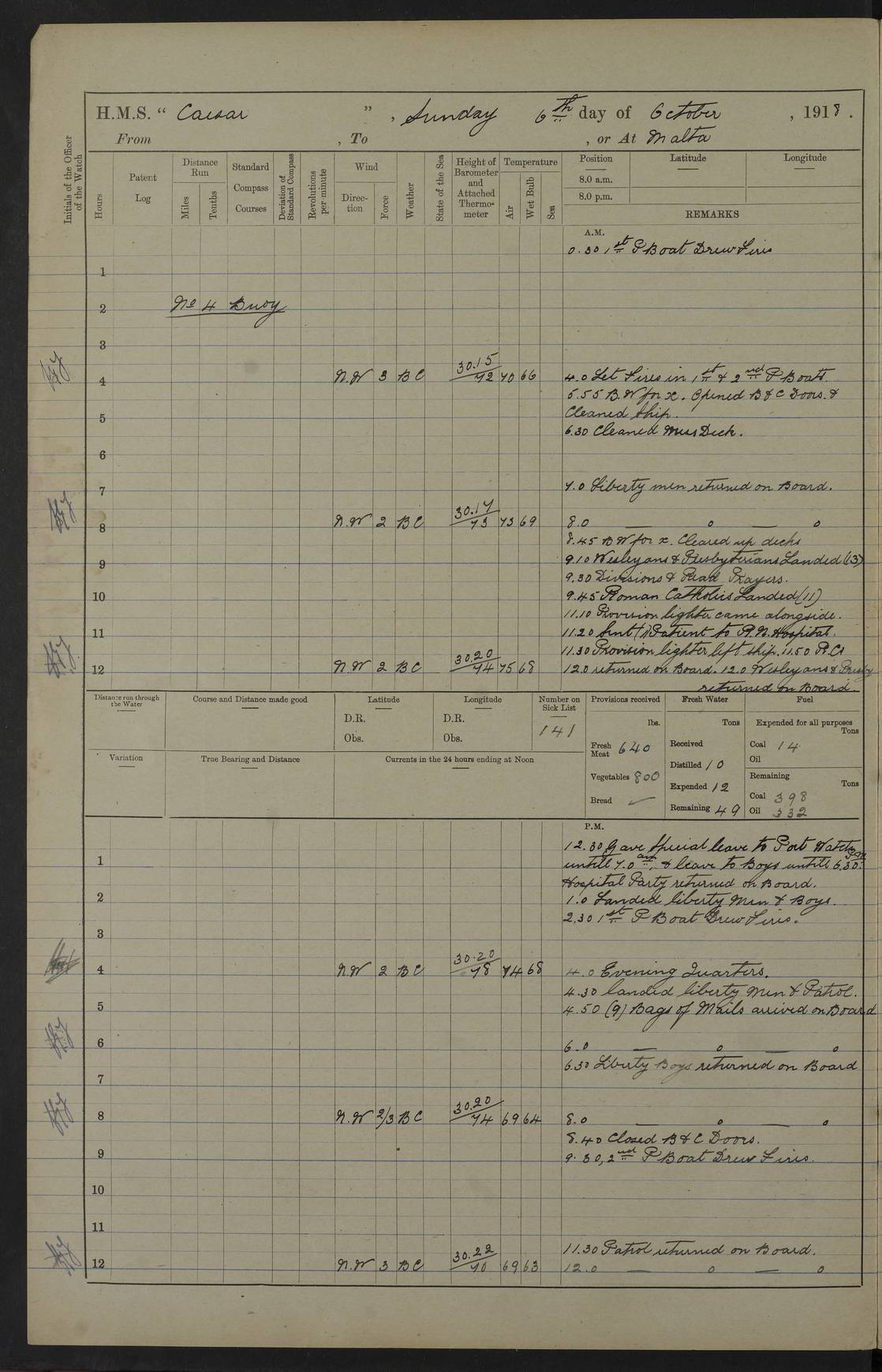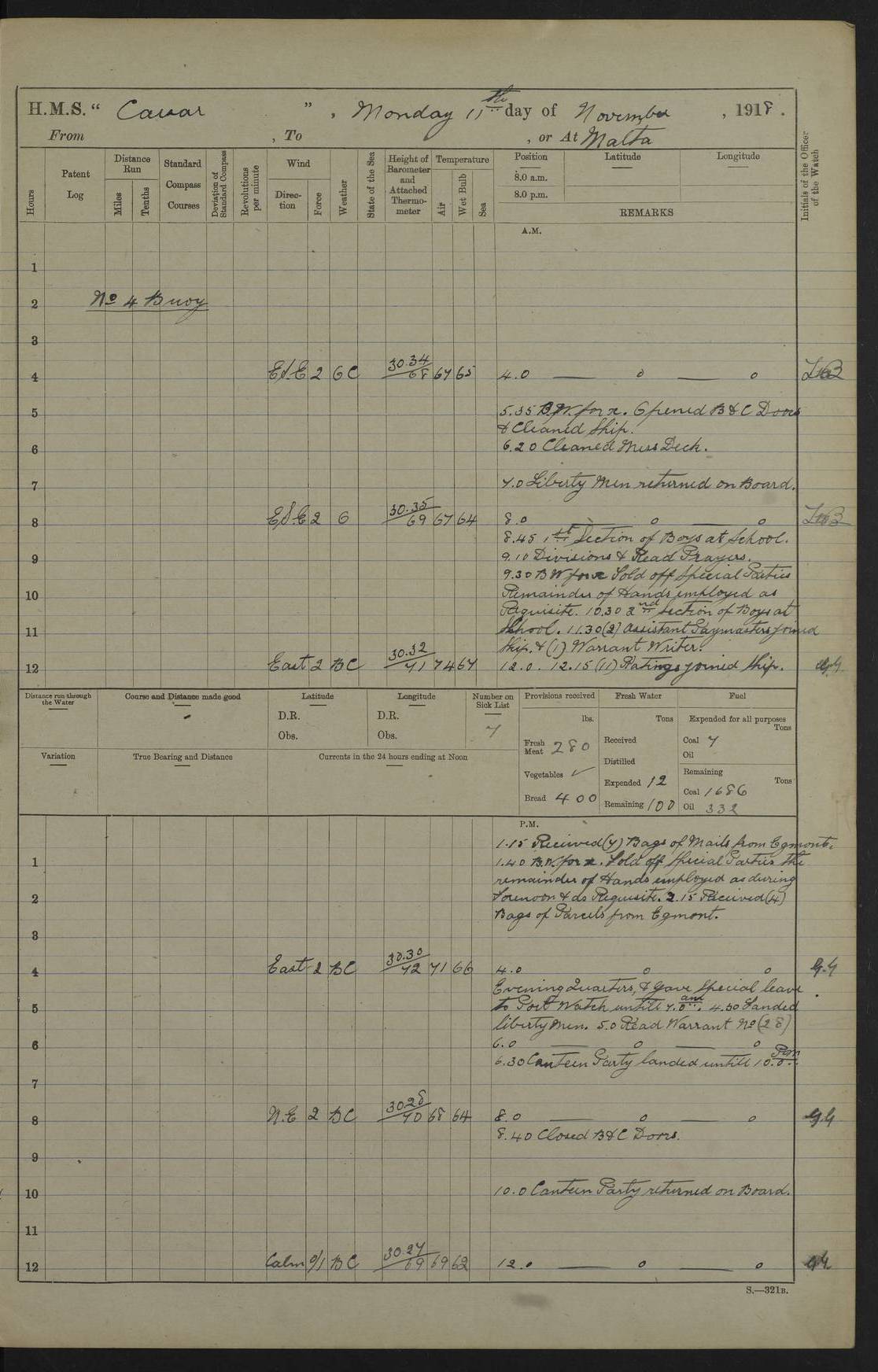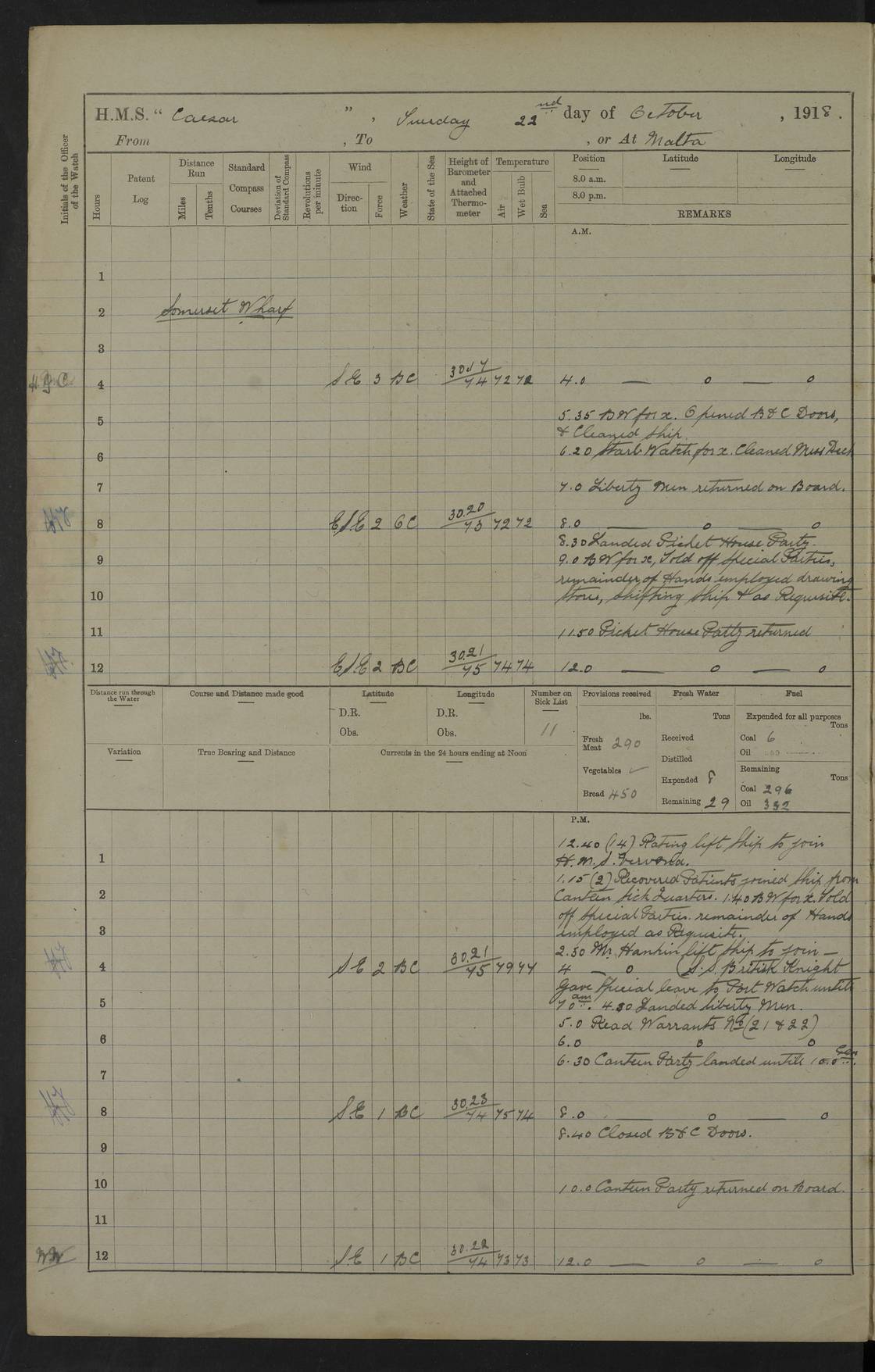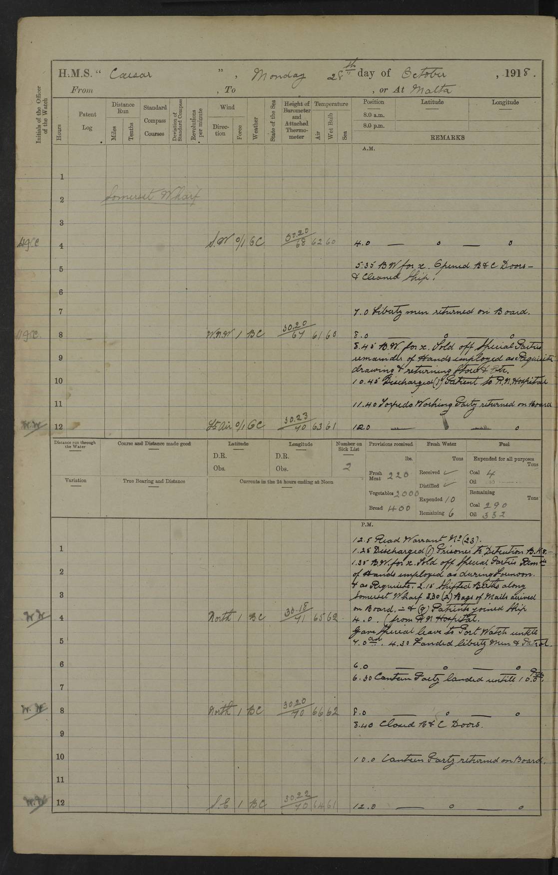 4edebb7b14d0450578000168: (https://s3.amazonaws.com:443/oldweather/ADM53-36589/0003_1.jpg) 1 November 1918 At Malta Lat 35.89, Long 14.52 [Somerset Wharf] 11.15am: Engineers Store Party returned on Board. 0.45pm: Paid Monthly Money. 1.0pm: Mr Goss, Gunner rejoined Ship from RN Hospital. 2.30pm: Gave Special leave to Port Watch untill 7.0am and Port Watch of Boys untill 6.0pm. Hands Made [sic] and Mend Clothes. 2.40pm: Landed liberty Men and Boys. 3.50pm: Provision Boat came alongside. 4.10pm: (4) Recovered Patients rejoined Ship from RN Hospital. 4.30pm: Landed liberty Men and Patrol. 6.0pm: Liberty Boys Returned on Board. 6.30pm: Canteen Party landed untill 10.0pm and Read Warrant No (24). 10.0pm: Canteen Party returned on Board. 11.50pm: Patrol returned on Board. [Provisions received: Fresh Meat 300 lbs, Vegetables 1000 lbs, Bread 450 lbs] 4edebb7c14d0450578000169: (https://s3.amazonaws.com:443/oldweather/ADM53-36589/0004_0.jpg) 2 November 1918 At Malta Lat 35.89, Long 14.52 [Hamilton Wharf] 7.15am: Shifted Berths from Somerset Wharf, to Hamilton Wharf. 8.0am: Tested life Buoys Correct. 8.45am: BW for x Told off Special Parties, Remainder of Hands employed as Requisite, and Landed Picket house Party. 9.10am: Held Court Martial on Board. 10.30am: Court Martial Finished. Noon: Picket House Party returned. 1.20pm: BW for x. Told off Special Parties. Remainder of Hands employed getting in Paymasters Stores and as Requisite. Lost overboard by accident Boat Hooks, Steel, Pattern (345), 2 in Number. 4.20pm: Hands to Fire Stations. 4.35pm: Read Warrant No 25 and gave Special leave to Starboard Watch untill 7.0am. 5.0pm: Landed liberty Men and Victualling Yard Lighter left Ship. 6.30pm: Canteen Party landed untill 10.0pm. [Provisions received: Fresh Meat 260 lbs, Bread 900 lbs] 4edebb7c14d045057800016a: (https://s3.amazonaws.com:443/oldweather/ADM53-36589/0004_1.jpg) 3 November 1918 At Malta Lat 35.89, Long 14.52 [Hamilton Wharf] 9.0am: Landed Church Parties, Wesleyans (14), Presbyterians (10). 9.30am: Divisions. 9.50am: Landed Roman Catholics (15). 10.10am: Discharged (5) Ratings to RN Hospital. 11.35am: All Church Parties returned on Board. 1.0pm: Gave Special leave to Port Watch untill 7.0am and Both Watches of Boys untill 5.30pm. 1.15pm: Landed liberty Men and Boys. 5.30pm: Liberty Boys returned on Board. 6.30pm: Canteen Party landed untill 10.0pm. 8.40pm: Closed B and C Doors. 10.0pm: Canteen Party returned on Board. [Number on sick list: 5] [Provisions received: Fresh Meat 280 lbs] 4edebb7c14d045057800016b: (https://s3.amazonaws.com:443/oldweather/ADM53-36589/0005_0.jpg) 4 November 1918 At Malta Lat 35.89, Long 14.52 [Hamilton Wharf] 6.50am: BW for x Told off Special Parties, remainder of Hands employed as Requisite. 7.0am: Liberty men returned on Board. 8.5am: Provision lighter came alongside. 8.10am: BW for x, Told off Special Parties, remainder of Hands employed Provisioning Ship and as requisite. 8.45am: Landed (1) Carpenter rating for Examination. 3.45pm: (2) Recovered Patients joined Ship from RN Hospital. 4.10pm: Received 8 Bags of Mails from Egmont, and Gave Special leave to Starboard Watch till 7.0am. 5.0pm: Landed Liberty Men and Patrol. 6.0pm: Hands employed getting in and stowing away Provisions. Midnight: Patrol returned on Board. [Weather fine, noon temperature 74F] 4edebb7c14d045057800016c: (https://s3.amazonaws.com:443/oldweather/ADM53-36589/0005_1.jpg) 5 November 1918 At Malta Lat 35.89, Long 14.52 [Hamilton Wharf] 6.45am: BW for x. Told off Special Parties. Remainder of Hands employed getting in and stowing away Provisions. 8.30am: Landed Hospital Party and Picket House Party. 11.0am: Landed (35) Rifles to Naval Ordinance for exchange. Noon: Picket House Party returned. 1.20pm: Landed (2) Ratings for Dental Treatment. 2.25pm: (35) Exchanged Rifles came on Board. 3.40pm: (2) Recovered Patients rejoined Ship from RN Hospital and disinfected Bedding. 4.0pm: Gave Special leave to Port Watch untill 7.0am. Starboard Watch employed stowing Provisions. 4.30pm: Landed Liberty men. Starboard Watch employed stowing away Provisions and Read Warrant No (26). [Provisions received: Fresh Meat 530 lbs, Bread 1000 lbs] 4edebb7c14d045057800016d: (https://s3.amazonaws.com:443/oldweather/ADM53-36589/0006_0.jpg) 6 November 1918 At Malta Lat 35.89, Long 14.52 [Hamilton Wharf] 6.50am: BW for x. Told off Special Parties, Remainder of Port Watch stowing Provisions, Starboard Watch drawing Quarter Deck Awning. 9.0am: Hands employed Provisioning Ship. 4.0pm: Gave Special leave to Starboard Watch untill 7.0am. 4.30pm: Landed liberty Men. Port Watch employed stowing away Provisions. 6.30pm: Canteen Party landed until 10.0pm. 10.0pm: Canteen Party returned on Board. [Number on sick list: 5] [Provisions received: Fresh Meat 250 lbs, Vegetables 1000 lbs, Bread 450 lbs] [Fuel Remaining: Coal 244 tons, Oil 332 tons] 4edebb7c14d045057800016e: (https://s3.amazonaws.com:443/oldweather/ADM53-36589/0006_1.jpg) 7 November 1918 At Malta Lat 35.89, Long 14.52 [No 4 Buoy] 6.30am: BW for x. Told off Special Parties. Remainder of Hands employed prepairing [preparing] Ship to Shift Berths, from Hamilton Wharf to No 4 Buoy. 7.0am: Liberty men returned on Board. 8.50am: Secured Ship to No 4 Buoy and Coal Lighters came alongside. 9.10am: Commenced Coaling Native labour. Hands employed Drawing Stores and as Requisite. 11.50am: Dockyard Parties returned. 1.40pm: BW for x Told off Special Parties, remainder of Hands employed as Requisite. 4.30pm: Gave Special leave to Port Watch untill 7.0am. 4.45pm: Landed liberty men and Patrol and Read Warrant No (27). 7.30pm: Completed Coaling (1481) Tons. 8.40pm: Watch employed sweeping down. 11.50pm: Patrol returned on Board. [Number on sick list: 6] [Provisions received: Fresh Meat 280 lbs, Bread 300 lbs] [Fuel Remaining: Coal 1716 tons, Oil 332 tons] 4edebb7c14d045057800016f: (https://s3.amazonaws.com:443/oldweather/ADM53-36589/0007_0.jpg) 8 November 1918 At Malta Lat 35.89, Long 