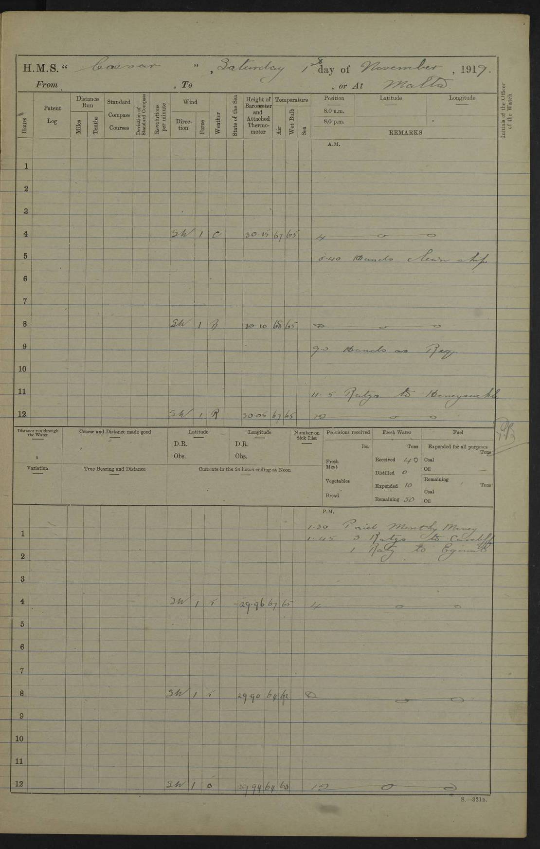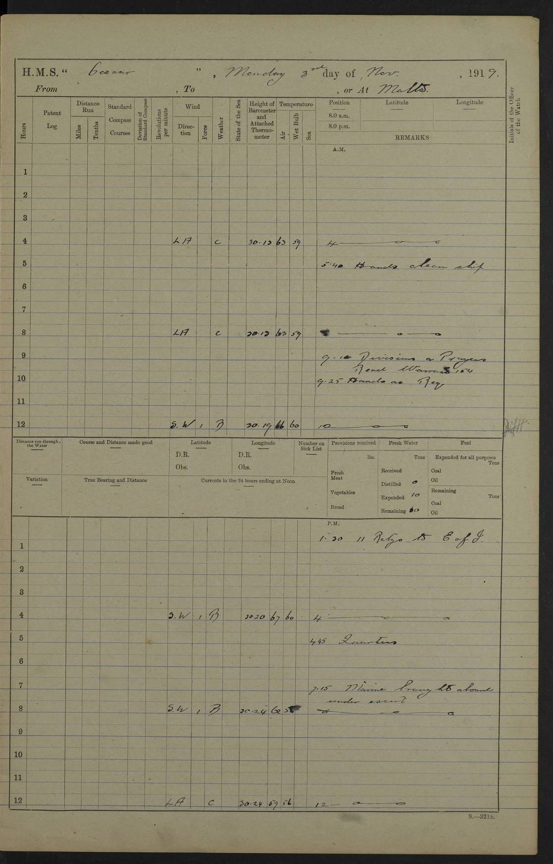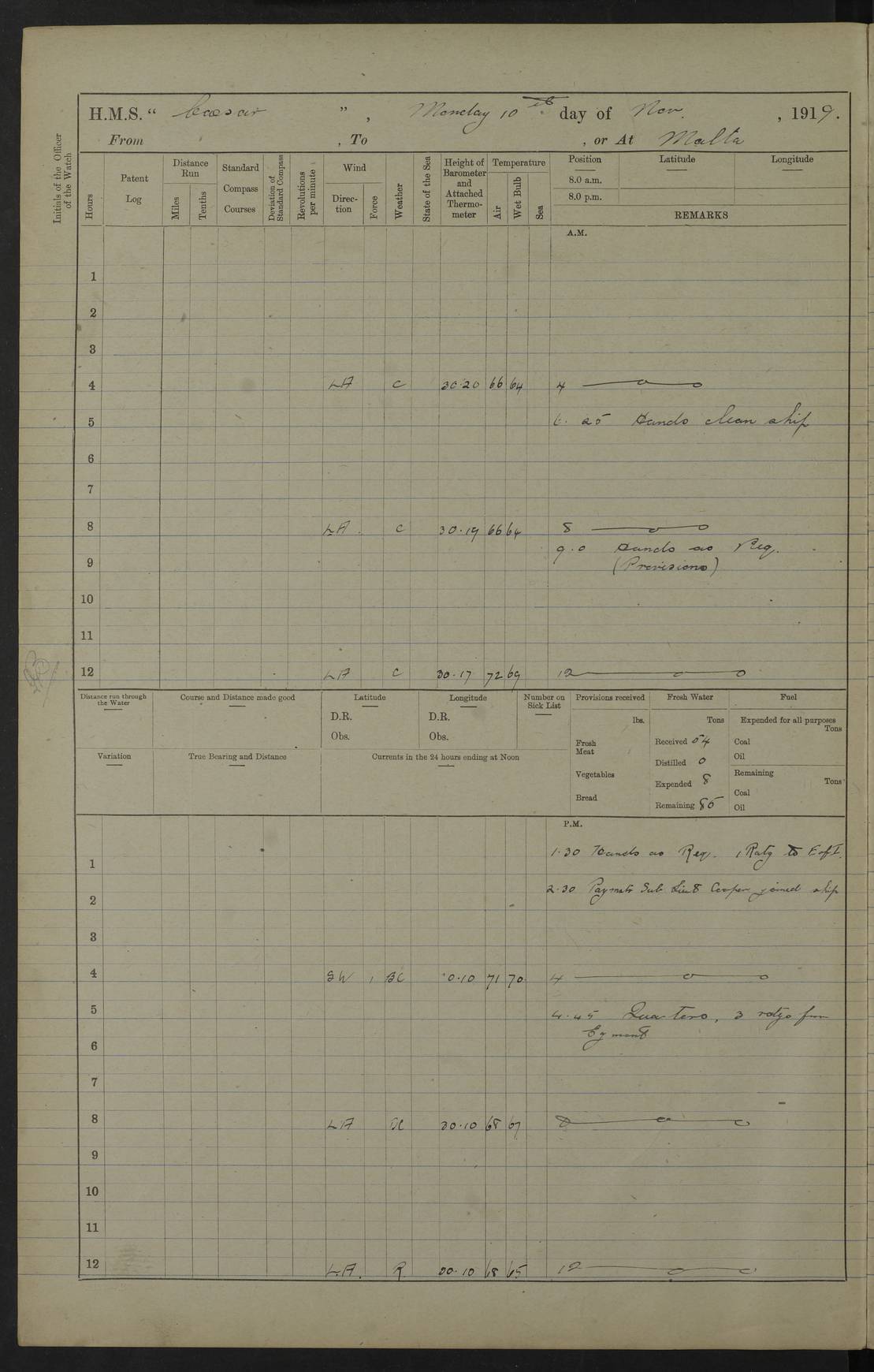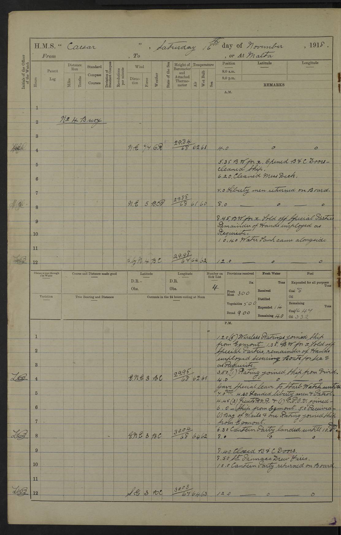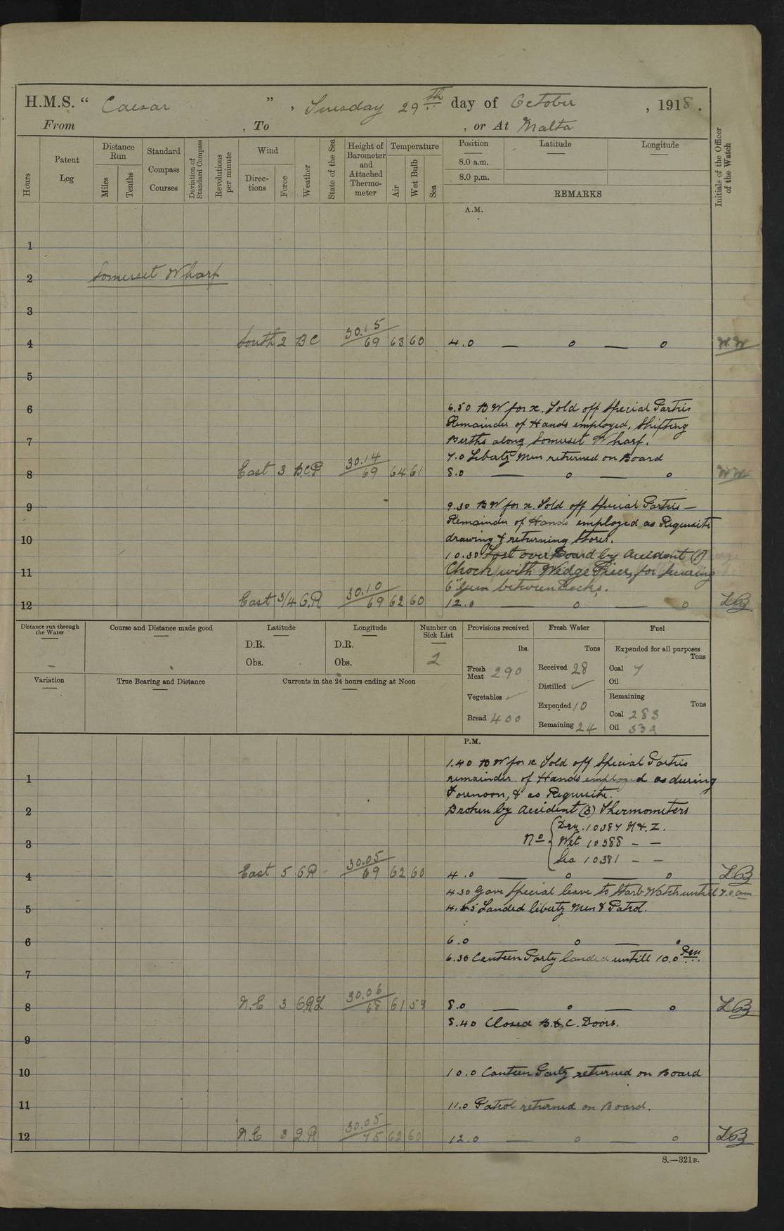 4edebb7b14d0450578000168: (https://s3.amazonaws.com:443/oldweather/ADM53-36589/0003_1.jpg) 1 November 1918 At Malta Lat 35.89, Long 14.52 [Somerset Wharf] 11.15am: Engineers Store Party returned on Board. 0.45pm: Paid Monthly Money. 1.0pm: Mr Goss, Gunner rejoined Ship from RN Hospital. 2.30pm: Gave Special leave to Port Watch untill 7.0am and Port Watch of Boys untill 6.0pm. Hands Made [sic] and Mend Clothes. 2.40pm: Landed liberty Men and Boys. 3.50pm: Provision Boat came alongside. 4.10pm: (4) Recovered Patients rejoined Ship from RN Hospital. 4.30pm: Landed liberty Men and Patrol. 6.0pm: Liberty Boys Returned on Board. 6.30pm: Canteen Party landed untill 10.0pm and Read Warrant No (24). 10.0pm: Canteen Party returned on Board. 11.50pm: Patrol returned on Board. [Provisions received: Fresh Meat 300 lbs, Vegetables 1000 lbs, Bread 450 lbs] 4edebb7c14d0450578000169: (https://s3.amazonaws.com:443/oldweather/ADM53-36589/0004_0.jpg) 2 November 1918 At Malta Lat 35.89, Long 14.52 [Hamilton Wharf] 7.15am: Shifted Berths from Somerset Wharf, to Hamilton Wharf. 8.0am: Tested life Buoys Correct. 8.45am: BW for x Told off Special Parties, Remainder of Hands employed as Requisite, and Landed Picket house Party. 9.10am: Held Court Martial on Board. 10.30am: Court Martial Finished. Noon: Picket House Party returned. 1.20pm: BW for x. Told off Special Parties. Remainder of Hands employed getting in Paymasters Stores and as Requisite. Lost overboard by accident Boat Hooks, Steel, Pattern (345), 2 in Number. 4.20pm: Hands to Fire Stations. 4.35pm: Read Warrant No 25 and gave Special leave to Starboard Watch untill 7.0am. 5.0pm: Landed liberty Men and Victualling Yard Lighter left Ship. 6.30pm: Canteen Party landed untill 10.0pm. [Provisions received: Fresh Meat 260 lbs, Bread 900 lbs] 4edebb7c14d045057800016a: (https://s3.amazonaws.com:443/oldweather/ADM53-36589/0004_1.jpg) 3 November 1918 At Malta Lat 35.89, Long 14.52 [Hamilton Wharf] 9.0am: Landed Church Parties, Wesleyans (14), Presbyterians (10). 9.30am: Divisions. 9.50am: Landed Roman Catholics (15). 10.10am: Discharged (5) Ratings to RN Hospital. 11.35am: All Church Parties returned on Board. 1.0pm: Gave Special leave to Port Watch untill 7.0am and Both Watches of Boys untill 5.30pm. 1.15pm: Landed liberty Men and Boys. 5.30pm: Liberty Boys returned on Board. 6.30pm: Canteen Party landed untill 10.0pm. 8.40pm: Closed B and C Doors. 10.0pm: Canteen Party returned on Board. [Number on sick list: 5] [Provisions received: Fresh Meat 280 lbs] 4edebb7c14d045057800016b: (https://s3.amazonaws.com:443/oldweather/ADM53-36589/0005_0.jpg) 4 November 1918 At Malta Lat 35.89, Long 14.52 [Hamilton Wharf] 6.50am: BW for x Told off Special Parties, remainder of Hands employed as Requisite. 7.0am: Liberty men returned on Board. 8.5am: Provision lighter came alongside. 8.10am: BW for x, Told off Special Parties, remainder of Hands employed Provisioning Ship and as requisite. 8.45am: Landed (1) Carpenter rating for Examination. 3.45pm: (2) Recovered Patients joined Ship from RN Hospital. 4.10pm: Received 8 Bags of Mails from Egmont, and Gave Special leave to Starboard Watch till 7.0am. 5.0pm: Landed Liberty Men and Patrol. 6.0pm: Hands employed getting in and stowing away Provisions. Midnight: Patrol returned on Board. [Weather fine, noon temperature 74F] 4edebb7c14d045057800016c: (https://s3.amazonaws.com:443/oldweather/ADM53-36589/0005_1.jpg) 5 November 1918 At Malta Lat 35.89, Long 14.52 [Hamilton Wharf] 6.45am: BW for x. Told off Special Parties. Remainder of Hands employed getting in and stowing away Provisions. 8.30am: Landed Hospital Party and Picket House Party. 11.0am: Landed (35) Rifles to Naval Ordinance for exchange. Noon: Picket House Party returned. 1.20pm: Landed (2) Ratings for Dental Treatment. 2.25pm: (35) Exchanged Rifles came on Board. 3.40pm: (2) Recovered Patients rejoined Ship from RN Hospital and disinfected Bedding. 4.0pm: Gave Special leave to Port Watch untill 7.0am. Starboard Watch employed stowing Provisions. 4.30pm: Landed Liberty men. Starboard Watch employed stowing away Provisions and Read Warrant No (26). [Provisions received: Fresh Meat 530 lbs, Bread 1000 lbs] 4edebb7c14d045057800016d: (https://s3.amazonaws.com:443/oldweather/ADM53-36589/0006_0.jpg) 6 November 1918 At Malta Lat 35.89, Long 14.52 [Hamilton Wharf] 6.50am: BW for x. Told off Special Parties, Remainder of Port Watch stowing Provisions, Starboard Watch drawing Quarter Deck Awning. 9.0am: Hands employed Provisioning Ship. 4.0pm: Gave Special leave to Starboard Watch untill 7.0am. 4.30pm: Landed liberty Men. Port Watch employed stowing away Provisions. 6.30pm: Canteen Party landed until 10.0pm. 10.0pm: Canteen Party returned on Board. [Number on sick list: 5] [Provisions received: Fresh Meat 250 lbs, Vegetables 1000 lbs, Bread 450 lbs] [Fuel Remaining: Coal 244 tons, Oil 332 tons] 4edebb7c14d045057800016e: (https://s3.amazonaws.com:443/oldweather/ADM53-36589/0006_1.jpg) 7 November 1918 At Malta Lat 35.89, Long 14.52 [No 4 Buoy] 6.30am: BW for x. Told off Special Parties. Remainder of Hands employed prepairing [preparing] Ship to Shift Berths, from Hamilton Wharf to No 4 Buoy. 7.0am: Liberty men returned on Board. 8.50am: Secured Ship to No 4 Buoy and Coal Lighters came alongside. 9.10am: Commenced Coaling Native labour. Hands employed Drawing Stores and as Requisite. 11.50am: Dockyard Parties returned. 1.40pm: BW for x Told off Special Parties, remainder of Hands employed as Requisite. 4.30pm: Gave Special leave to Port Watch untill 7.0am. 4.45pm: Landed liberty men and Patrol and Read Warrant No (27). 7.30pm: Completed Coaling (1481) Tons. 8.40pm: Watch employed sweeping down. 11.50pm: Patrol returned on Board. [Number on sick list: 6] [Provisions received: Fresh Meat 280 lbs, Bread 300 lbs] [Fuel Remaining: Coal 1716 tons, Oil 332 tons] 4edebb7c14d045057800016f: (https://s3.amazonaws.com:443/oldweather/ADM53-36589/0007_0.jpg) 8 November 1918 At Malta Lat 35.89, Long 