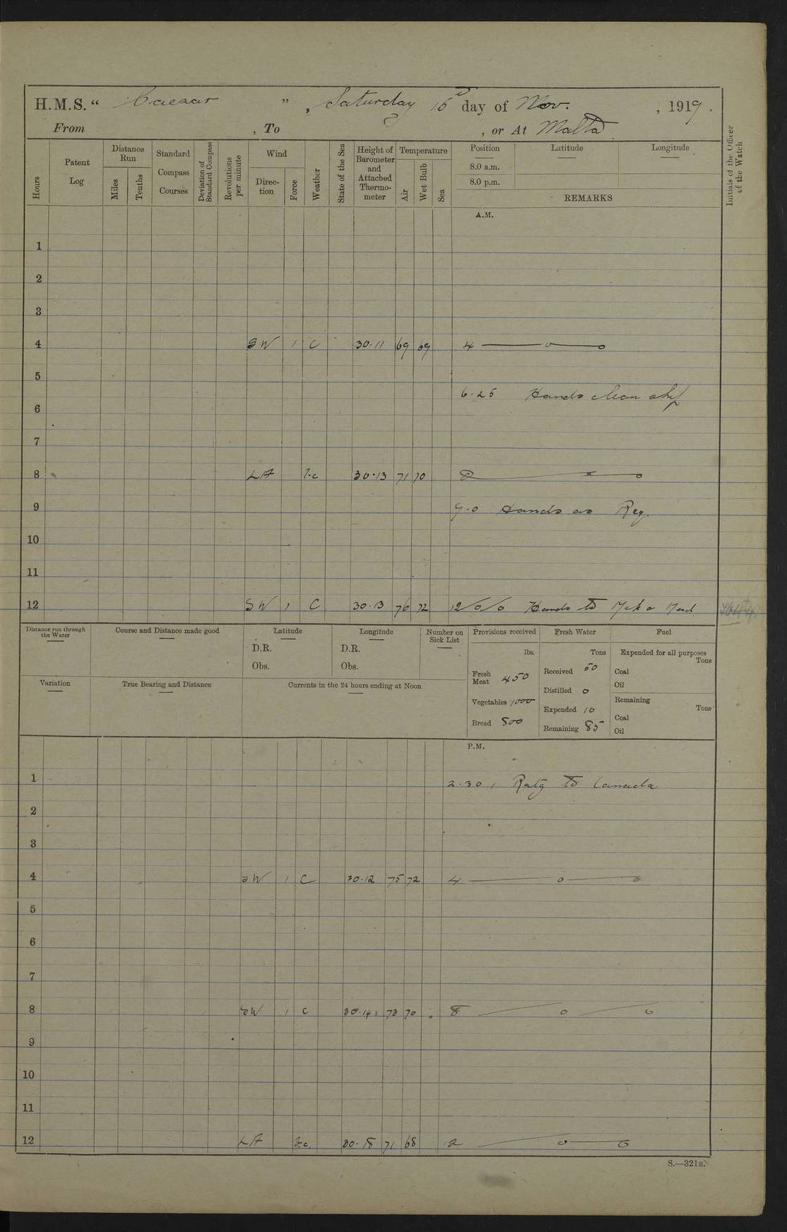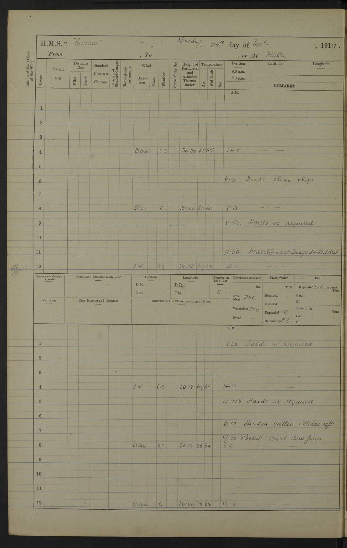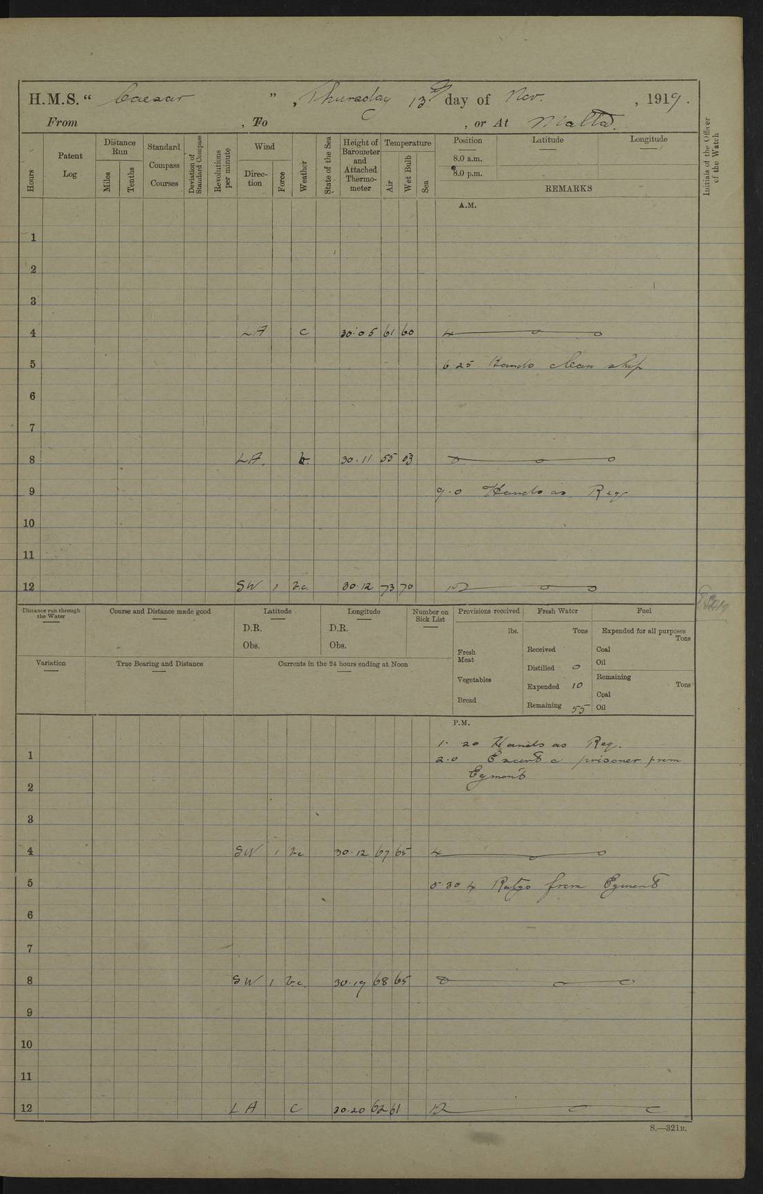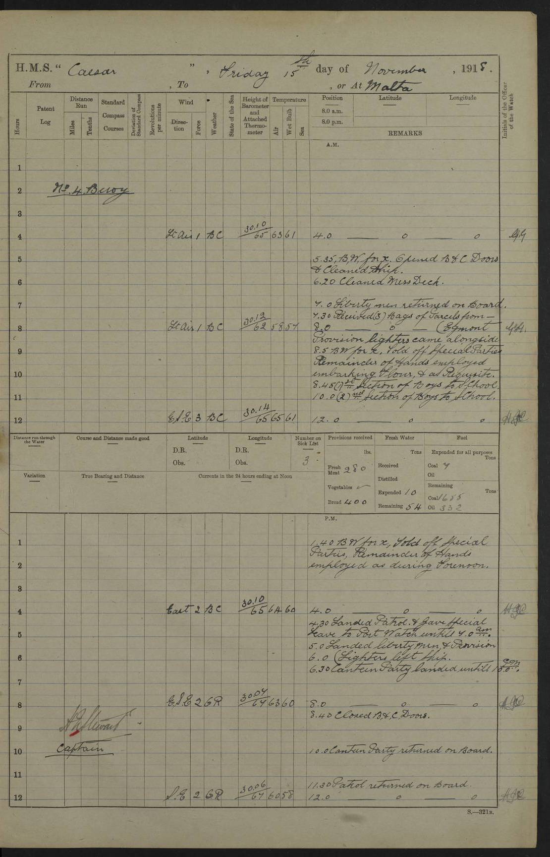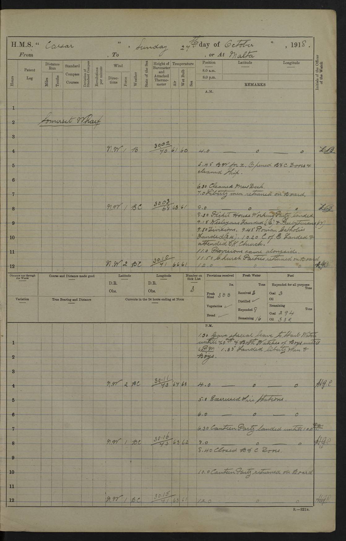 4edebb7b14d0450578000168: (https://s3.amazonaws.com:443/oldweather/ADM53-36589/0003_1.jpg) 1 November 1918 At Malta Lat 35.89, Long 14.52 [Somerset Wharf] 11.15am: Engineers Store Party returned on Board. 0.45pm: Paid Monthly Money. 1.0pm: Mr Goss, Gunner rejoined Ship from RN Hospital. 2.30pm: Gave Special leave to Port Watch untill 7.0am and Port Watch of Boys untill 6.0pm. Hands Made [sic] and Mend Clothes. 2.40pm: Landed liberty Men and Boys. 3.50pm: Provision Boat came alongside. 4.10pm: (4) Recovered Patients rejoined Ship from RN Hospital. 4.30pm: Landed liberty Men and Patrol. 6.0pm: Liberty Boys Returned on Board. 6.30pm: Canteen Party landed untill 10.0pm and Read Warrant No (24). 10.0pm: Canteen Party returned on Board. 11.50pm: Patrol returned on Board. [Provisions received: Fresh Meat 300 lbs, Vegetables 1000 lbs, Bread 450 lbs] 4edebb7c14d0450578000169: (https://s3.amazonaws.com:443/oldweather/ADM53-36589/0004_0.jpg) 2 November 1918 At Malta Lat 35.89, Long 14.52 [Hamilton Wharf] 7.15am: Shifted Berths from Somerset Wharf, to Hamilton Wharf. 8.0am: Tested life Buoys Correct. 8.45am: BW for x Told off Special Parties, Remainder of Hands employed as Requisite, and Landed Picket house Party. 9.10am: Held Court Martial on Board. 10.30am: Court Martial Finished. Noon: Picket House Party returned. 1.20pm: BW for x. Told off Special Parties. Remainder of Hands employed getting in Paymasters Stores and as Requisite. Lost overboard by accident Boat Hooks, Steel, Pattern (345), 2 in Number. 4.20pm: Hands to Fire Stations. 4.35pm: Read Warrant No 25 and gave Special leave to Starboard Watch untill 7.0am. 5.0pm: Landed liberty Men and Victualling Yard Lighter left Ship. 6.30pm: Canteen Party landed untill 10.0pm. [Provisions received: Fresh Meat 260 lbs, Bread 900 lbs] 4edebb7c14d045057800016a: (https://s3.amazonaws.com:443/oldweather/ADM53-36589/0004_1.jpg) 3 November 1918 At Malta Lat 35.89, Long 14.52 [Hamilton Wharf] 9.0am: Landed Church Parties, Wesleyans (14), Presbyterians (10). 9.30am: Divisions. 9.50am: Landed Roman Catholics (15). 10.10am: Discharged (5) Ratings to RN Hospital. 11.35am: All Church Parties returned on Board. 1.0pm: Gave Special leave to Port Watch untill 7.0am and Both Watches of Boys untill 5.30pm. 1.15pm: Landed liberty Men and Boys. 5.30pm: Liberty Boys returned on Board. 6.30pm: Canteen Party landed untill 10.0pm. 8.40pm: Closed B and C Doors. 10.0pm: Canteen Party returned on Board. [Number on sick list: 5] [Provisions received: Fresh Meat 280 lbs] 4edebb7c14d045057800016b: (https://s3.amazonaws.com:443/oldweather/ADM53-36589/0005_0.jpg) 4 November 1918 At Malta Lat 35.89, Long 14.52 [Hamilton Wharf] 6.50am: BW for x Told off Special Parties, remainder of Hands employed as Requisite. 7.0am: Liberty men returned on Board. 8.5am: Provision lighter came alongside. 8.10am: BW for x, Told off Special Parties, remainder of Hands employed Provisioning Ship and as requisite. 8.45am: Landed (1) Carpenter rating for Examination. 3.45pm: (2) Recovered Patients joined Ship from RN Hospital. 4.10pm: Received 8 Bags of Mails from Egmont, and Gave Special leave to Starboard Watch till 7.0am. 5.0pm: Landed Liberty Men and Patrol. 6.0pm: Hands employed getting in and stowing away Provisions. Midnight: Patrol returned on Board. [Weather fine, noon temperature 74F] 4edebb7c14d045057800016c: (https://s3.amazonaws.com:443/oldweather/ADM53-36589/0005_1.jpg) 5 November 1918 At Malta Lat 35.89, Long 14.52 [Hamilton Wharf] 6.45am: BW for x. Told off Special Parties. Remainder of Hands employed getting in and stowing away Provisions. 8.30am: Landed Hospital Party and Picket House Party. 11.0am: Landed (35) Rifles to Naval Ordinance for exchange. Noon: Picket House Party returned. 1.20pm: Landed (2) Ratings for Dental Treatment. 2.25pm: (35) Exchanged Rifles came on Board. 3.40pm: (2) Recovered Patients rejoined Ship from RN Hospital and disinfected Bedding. 4.0pm: Gave Special leave to Port Watch untill 7.0am. Starboard Watch employed stowing Provisions. 4.30pm: Landed Liberty men. Starboard Watch employed stowing away Provisions and Read Warrant No (26). [Provisions received: Fresh Meat 530 lbs, Bread 1000 lbs] 4edebb7c14d045057800016d: (https://s3.amazonaws.com:443/oldweather/ADM53-36589/0006_0.jpg) 6 November 1918 At Malta Lat 35.89, Long 14.52 [Hamilton Wharf] 6.50am: BW for x. Told off Special Parties, Remainder of Port Watch stowing Provisions, Starboard Watch drawing Quarter Deck Awning. 9.0am: Hands employed Provisioning Ship. 4.0pm: Gave Special leave to Starboard Watch untill 7.0am. 4.30pm: Landed liberty Men. Port Watch employed stowing away Provisions. 6.30pm: Canteen Party landed until 10.0pm. 10.0pm: Canteen Party returned on Board. [Number on sick list: 5] [Provisions received: Fresh Meat 250 lbs, Vegetables 1000 lbs, Bread 450 lbs] [Fuel Remaining: Coal 244 tons, Oil 332 tons] 4edebb7c14d045057800016e: (https://s3.amazonaws.com:443/oldweather/ADM53-36589/0006_1.jpg) 7 November 1918 At Malta Lat 35.89, Long 14.52 [No 4 Buoy] 6.30am: BW for x. Told off Special Parties. Remainder of Hands employed prepairing [preparing] Ship to Shift Berths, from Hamilton Wharf to No 4 Buoy. 7.0am: Liberty men returned on Board. 8.50am: Secured Ship to No 4 Buoy and Coal Lighters came alongside. 9.10am: Commenced Coaling Native labour. Hands employed Drawing Stores and as Requisite. 11.50am: Dockyard Parties returned. 1.40pm: BW for x Told off Special Parties, remainder of Hands employed as Requisite. 4.30pm: Gave Special leave to Port Watch untill 7.0am. 4.45pm: Landed liberty men and Patrol and Read Warrant No (27). 7.30pm: Completed Coaling (1481) Tons. 8.40pm: Watch employed sweeping down. 11.50pm: Patrol returned on Board. [Number on sick list: 6] [Provisions received: Fresh Meat 280 lbs, Bread 300 lbs] [Fuel Remaining: Coal 1716 tons, Oil 332 tons] 4edebb7c14d045057800016f: (https://s3.amazonaws.com:443/oldweather/ADM53-36589/0007_0.jpg) 8 November 1918 At Malta Lat 35.89, Long 