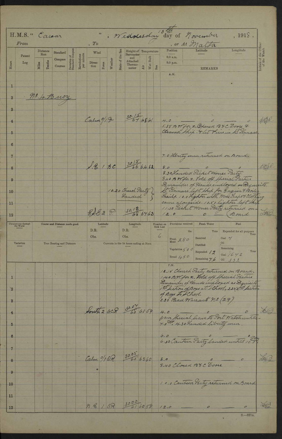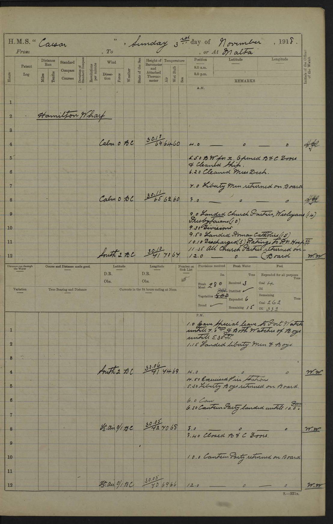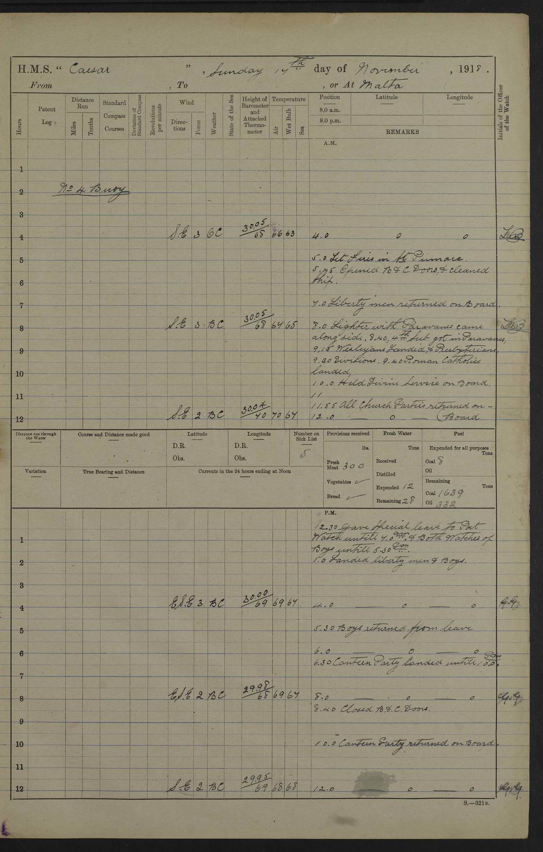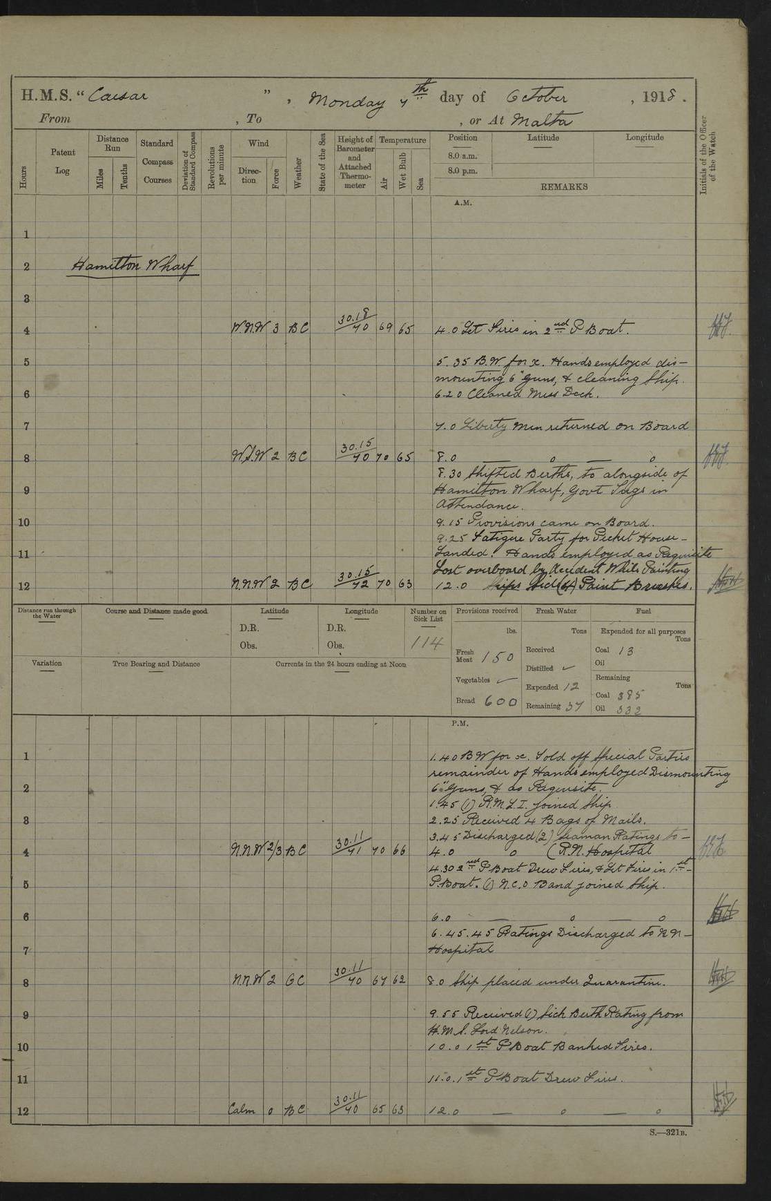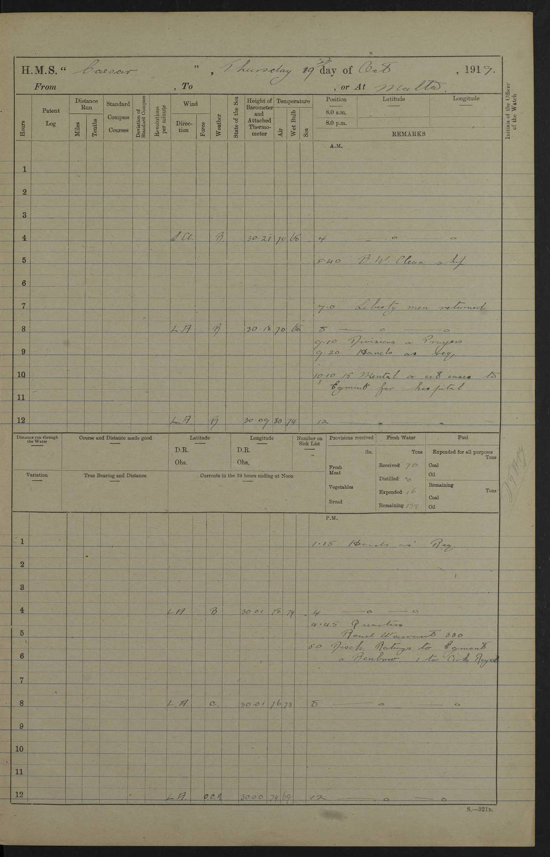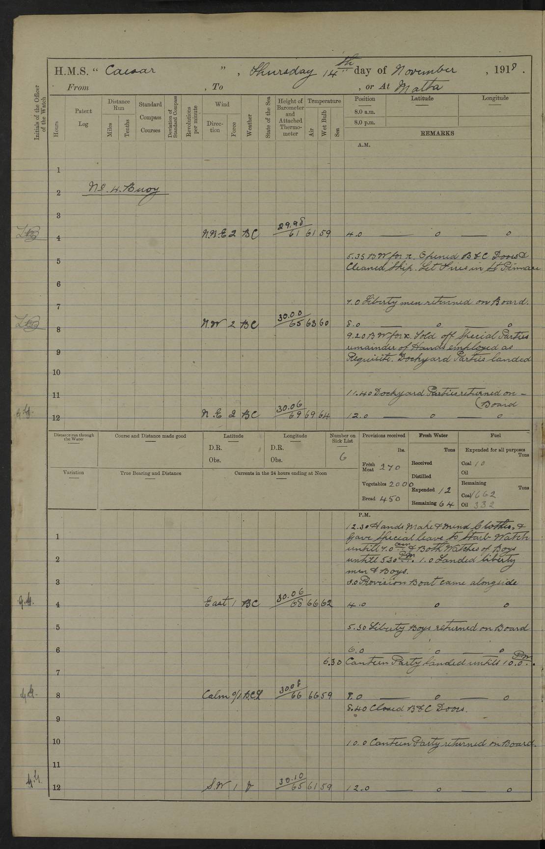 4edebb7b14d0450578000168: (https://s3.amazonaws.com:443/oldweather/ADM53-36589/0003_1.jpg) 1 November 1918 At Malta Lat 35.89, Long 14.52 [Somerset Wharf] 11.15am: Engineers Store Party returned on Board. 0.45pm: Paid Monthly Money. 1.0pm: Mr Goss, Gunner rejoined Ship from RN Hospital. 2.30pm: Gave Special leave to Port Watch untill 7.0am and Port Watch of Boys untill 6.0pm. Hands Made [sic] and Mend Clothes. 2.40pm: Landed liberty Men and Boys. 3.50pm: Provision Boat came alongside. 4.10pm: (4) Recovered Patients rejoined Ship from RN Hospital. 4.30pm: Landed liberty Men and Patrol. 6.0pm: Liberty Boys Returned on Board. 6.30pm: Canteen Party landed untill 10.0pm and Read Warrant No (24). 10.0pm: Canteen Party returned on Board. 11.50pm: Patrol returned on Board. [Provisions received: Fresh Meat 300 lbs, Vegetables 1000 lbs, Bread 450 lbs] 4edebb7c14d0450578000169: (https://s3.amazonaws.com:443/oldweather/ADM53-36589/0004_0.jpg) 2 November 1918 At Malta Lat 35.89, Long 14.52 [Hamilton Wharf] 7.15am: Shifted Berths from Somerset Wharf, to Hamilton Wharf. 8.0am: Tested life Buoys Correct. 8.45am: BW for x Told off Special Parties, Remainder of Hands employed as Requisite, and Landed Picket house Party. 9.10am: Held Court Martial on Board. 10.30am: Court Martial Finished. Noon: Picket House Party returned. 1.20pm: BW for x. Told off Special Parties. Remainder of Hands employed getting in Paymasters Stores and as Requisite. Lost overboard by accident Boat Hooks, Steel, Pattern (345), 2 in Number. 4.20pm: Hands to Fire Stations. 4.35pm: Read Warrant No 25 and gave Special leave to Starboard Watch untill 7.0am. 5.0pm: Landed liberty Men and Victualling Yard Lighter left Ship. 6.30pm: Canteen Party landed untill 10.0pm. [Provisions received: Fresh Meat 260 lbs, Bread 900 lbs] 4edebb7c14d045057800016a: (https://s3.amazonaws.com:443/oldweather/ADM53-36589/0004_1.jpg) 3 November 1918 At Malta Lat 35.89, Long 14.52 [Hamilton Wharf] 9.0am: Landed Church Parties, Wesleyans (14), Presbyterians (10). 9.30am: Divisions. 9.50am: Landed Roman Catholics (15). 10.10am: Discharged (5) Ratings to RN Hospital. 11.35am: All Church Parties returned on Board. 1.0pm: Gave Special leave to Port Watch untill 7.0am and Both Watches of Boys untill 5.30pm. 1.15pm: Landed liberty Men and Boys. 5.30pm: Liberty Boys returned on Board. 6.30pm: Canteen Party landed untill 10.0pm. 8.40pm: Closed B and C Doors. 10.0pm: Canteen Party returned on Board. [Number on sick list: 5] [Provisions received: Fresh Meat 280 lbs] 4edebb7c14d045057800016b: (https://s3.amazonaws.com:443/oldweather/ADM53-36589/0005_0.jpg) 4 November 1918 At Malta Lat 35.89, Long 14.52 [Hamilton Wharf] 6.50am: BW for x Told off Special Parties, remainder of Hands employed as Requisite. 7.0am: Liberty men returned on Board. 8.5am: Provision lighter came alongside. 8.10am: BW for x, Told off Special Parties, remainder of Hands employed Provisioning Ship and as requisite. 8.45am: Landed (1) Carpenter rating for Examination. 3.45pm: (2) Recovered Patients joined Ship from RN Hospital. 4.10pm: Received 8 Bags of Mails from Egmont, and Gave Special leave to Starboard Watch till 7.0am. 5.0pm: Landed Liberty Men and Patrol. 6.0pm: Hands employed getting in and stowing away Provisions. Midnight: Patrol returned on Board. [Weather fine, noon temperature 74F] 4edebb7c14d045057800016c: (https://s3.amazonaws.com:443/oldweather/ADM53-36589/0005_1.jpg) 5 November 1918 At Malta Lat 35.89, Long 14.52 [Hamilton Wharf] 6.45am: BW for x. Told off Special Parties. Remainder of Hands employed getting in and stowing away Provisions. 8.30am: Landed Hospital Party and Picket House Party. 11.0am: Landed (35) Rifles to Naval Ordinance for exchange. Noon: Picket House Party returned. 1.20pm: Landed (2) Ratings for Dental Treatment. 2.25pm: (35) Exchanged Rifles came on Board. 3.40pm: (2) Recovered Patients rejoined Ship from RN Hospital and disinfected Bedding. 4.0pm: Gave Special leave to Port Watch untill 7.0am. Starboard Watch employed stowing Provisions. 4.30pm: Landed Liberty men. Starboard Watch employed stowing away Provisions and Read Warrant No (26). [Provisions received: Fresh Meat 530 lbs, Bread 1000 lbs] 4edebb7c14d045057800016d: (https://s3.amazonaws.com:443/oldweather/ADM53-36589/0006_0.jpg) 6 November 1918 At Malta Lat 35.89, Long 14.52 [Hamilton Wharf] 6.50am: BW for x. Told off Special Parties, Remainder of Port Watch stowing Provisions, Starboard Watch drawing Quarter Deck Awning. 9.0am: Hands employed Provisioning Ship. 4.0pm: Gave Special leave to Starboard Watch untill 7.0am. 4.30pm: Landed liberty Men. Port Watch employed stowing away Provisions. 6.30pm: Canteen Party landed until 10.0pm. 10.0pm: Canteen Party returned on Board. [Number on sick list: 5] [Provisions received: Fresh Meat 250 lbs, Vegetables 1000 lbs, Bread 450 lbs] [Fuel Remaining: Coal 244 tons, Oil 332 tons] 4edebb7c14d045057800016e: (https://s3.amazonaws.com:443/oldweather/ADM53-36589/0006_1.jpg) 7 November 1918 At Malta Lat 35.89, Long 14.52 [No 4 Buoy] 6.30am: BW for x. Told off Special Parties. Remainder of Hands employed prepairing [preparing] Ship to Shift Berths, from Hamilton Wharf to No 4 Buoy. 7.0am: Liberty men returned on Board. 8.50am: Secured Ship to No 4 Buoy and Coal Lighters came alongside. 9.10am: Commenced Coaling Native labour. Hands employed Drawing Stores and as Requisite. 11.50am: Dockyard Parties returned. 1.40pm: BW for x Told off Special Parties, remainder of Hands employed as Requisite. 4.30pm: Gave Special leave to Port Watch untill 7.0am. 4.45pm: Landed liberty men and Patrol and Read Warrant No (27). 7.30pm: Completed Coaling (1481) Tons. 8.40pm: Watch employed sweeping down. 11.50pm: Patrol returned on Board. [Number on sick list: 6] [Provisions received: Fresh Meat 280 lbs, Bread 300 lbs] [Fuel Remaining: Coal 1716 tons, Oil 332 tons] 4edebb7c14d045057800016f: (https://s3.amazonaws.com:443/oldweather/ADM53-36589/0007_0.jpg) 8 November 1918 At Malta Lat 35.89, Long 